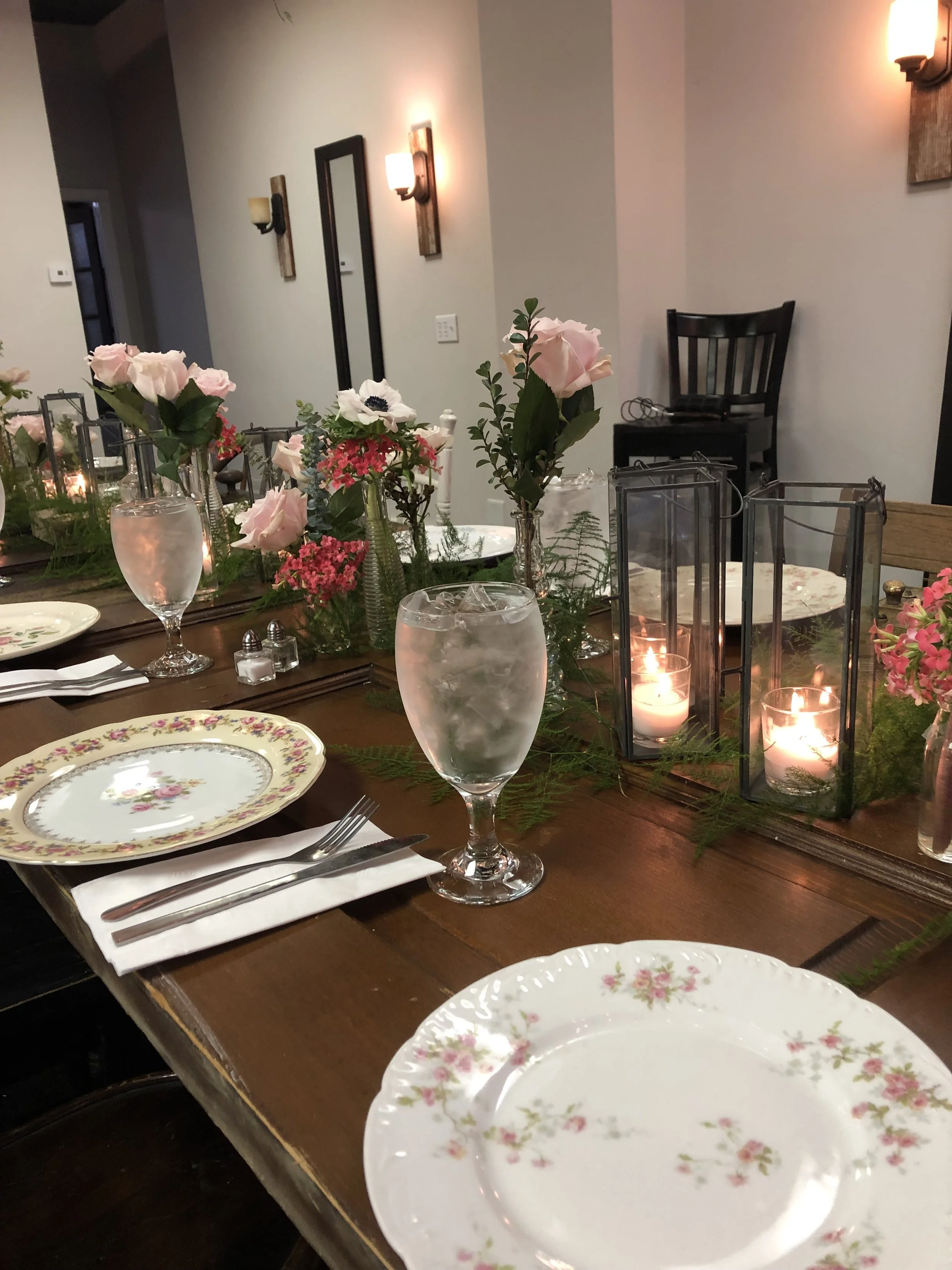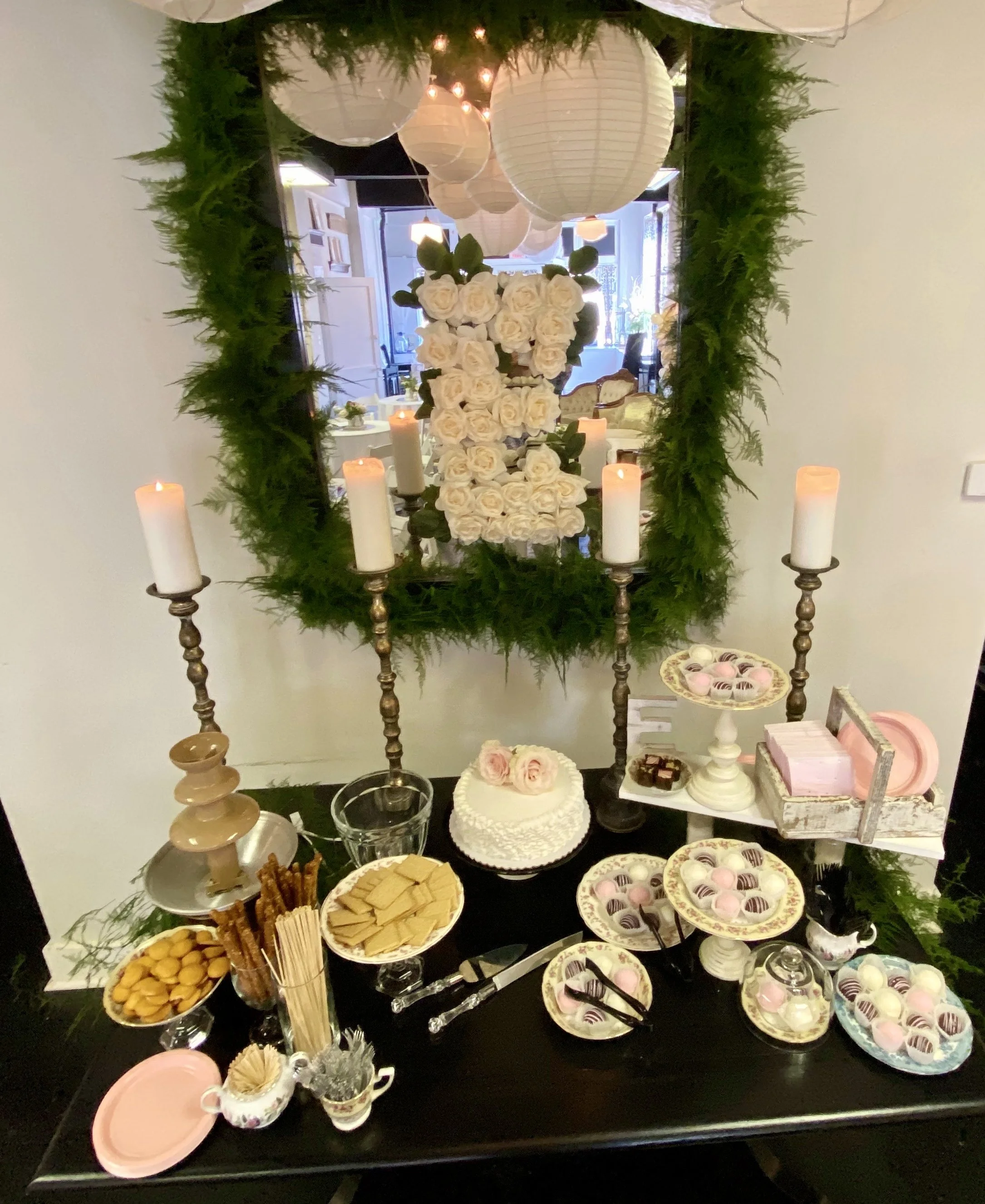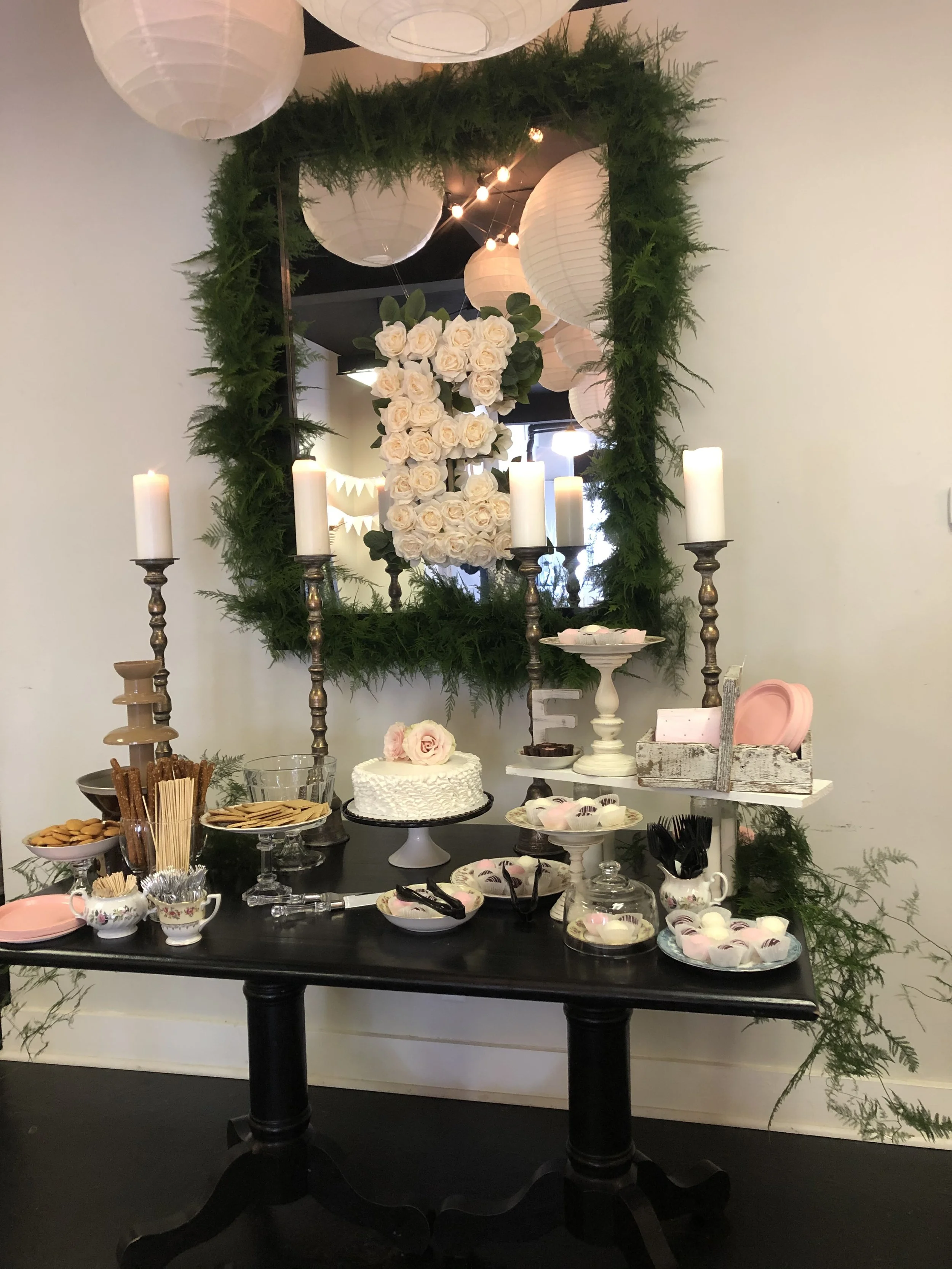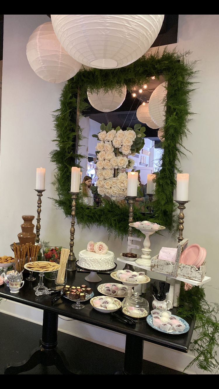 Decorative dessert table with pink and white sweets, surrounded by candles, greenery, and paper lanterns, with a mirror reflecting roses and candles.