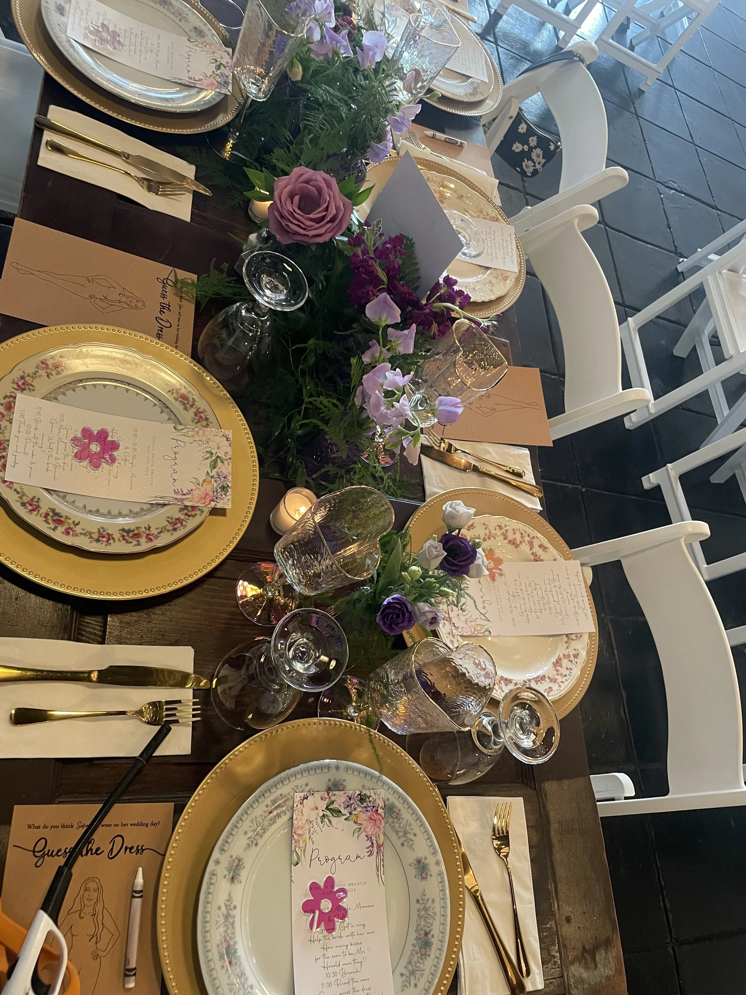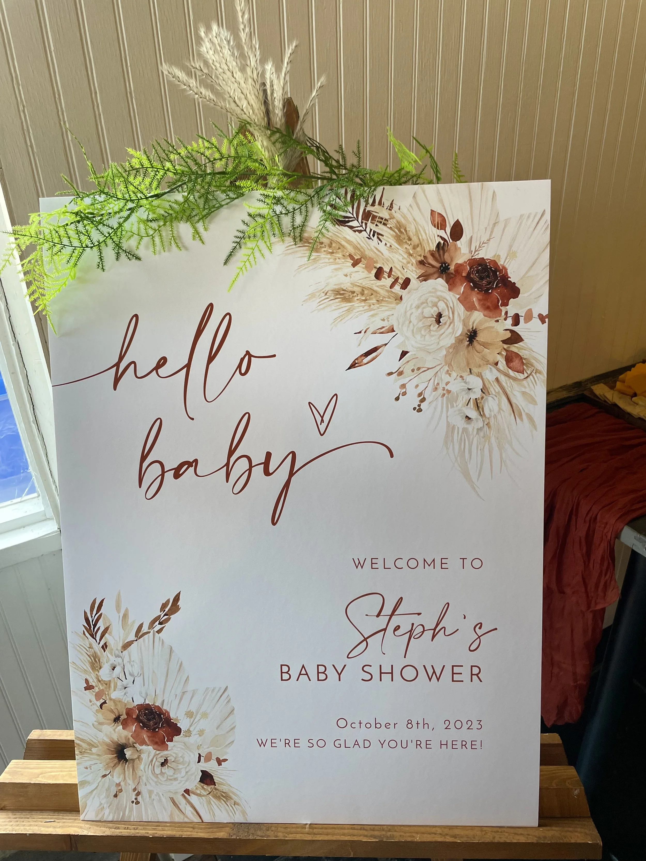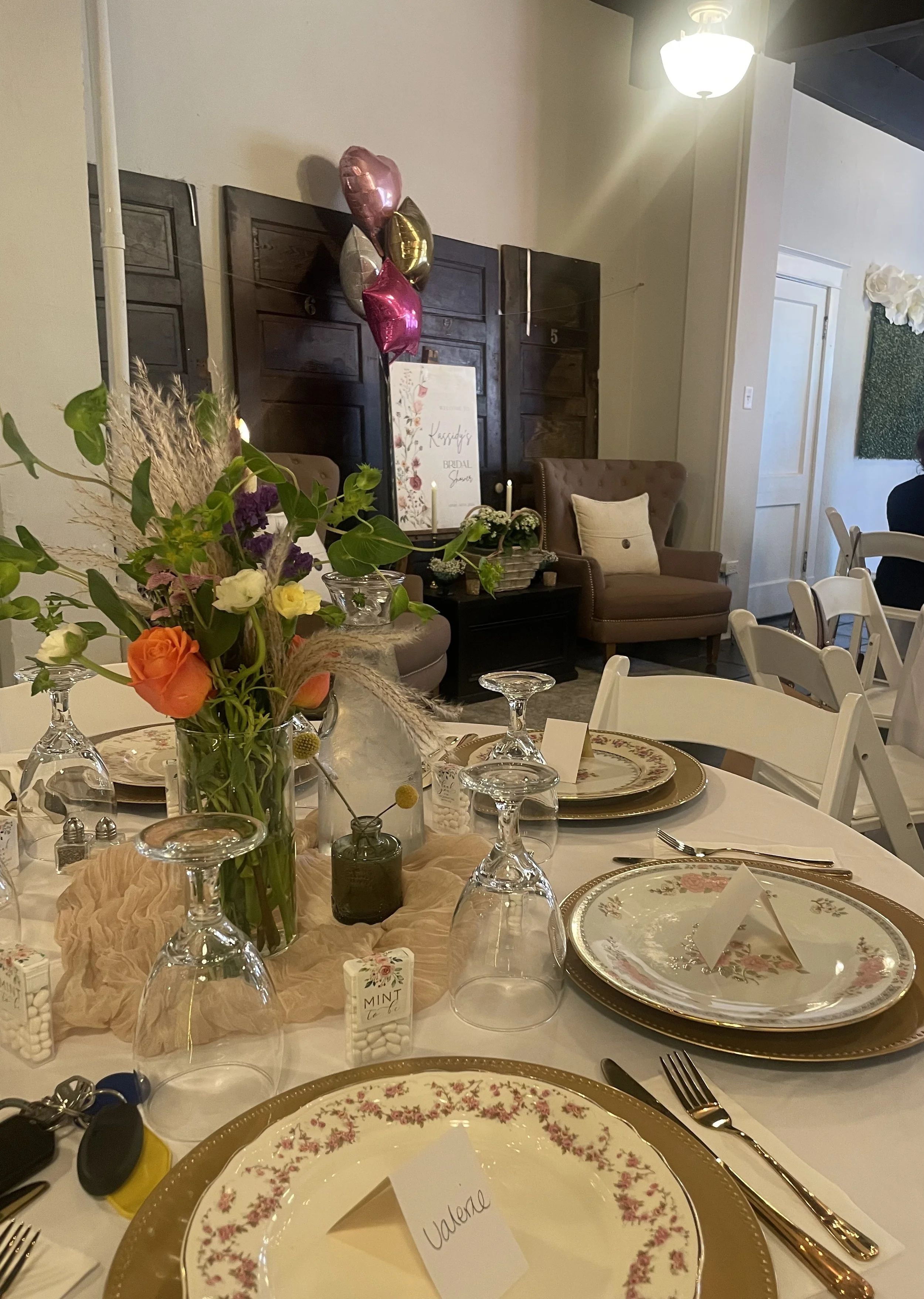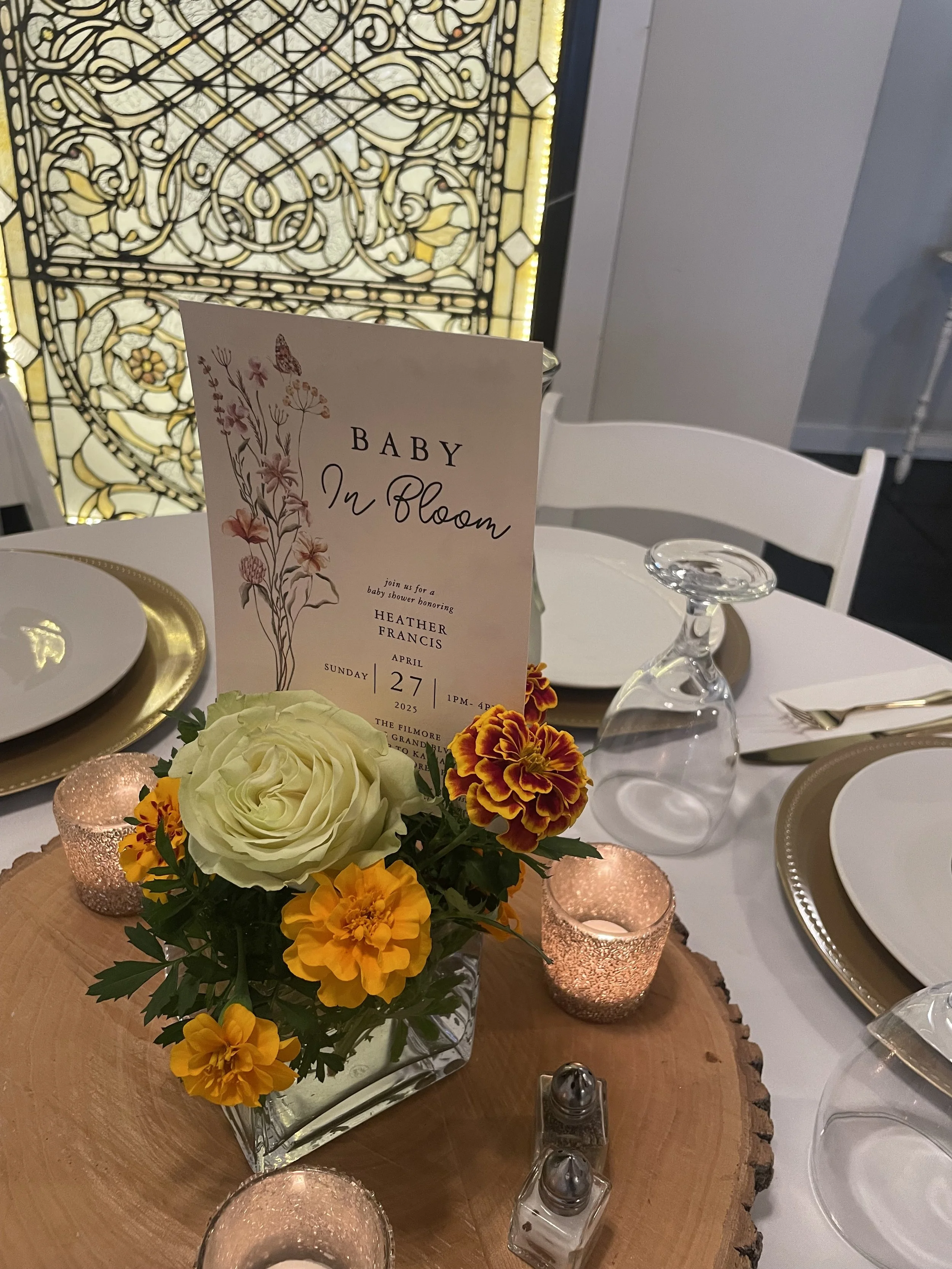 A floral centerpiece with white and orange flowers on a table set for a baby shower, with a sign that reads "Baby In Bloom" and event details. The table has gold and white plates, wine glasses, and small pink candles, with a wooden slab as the table