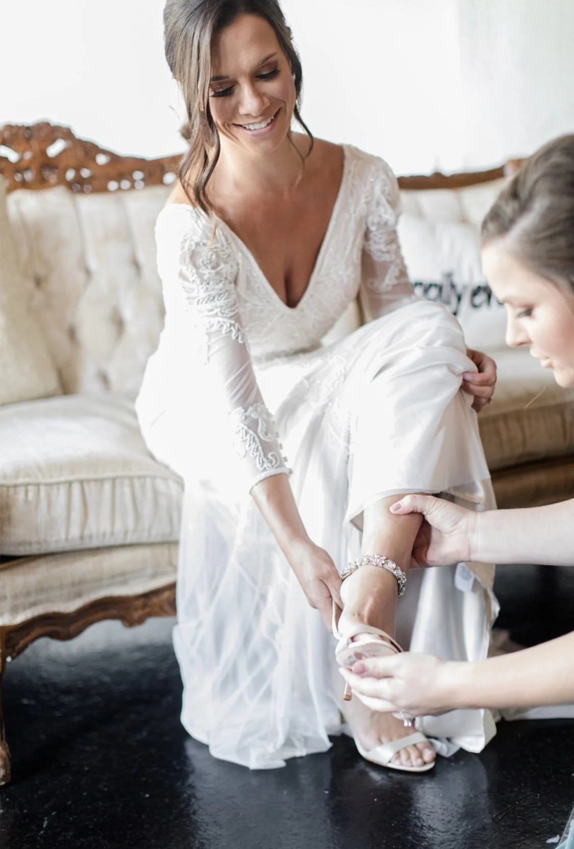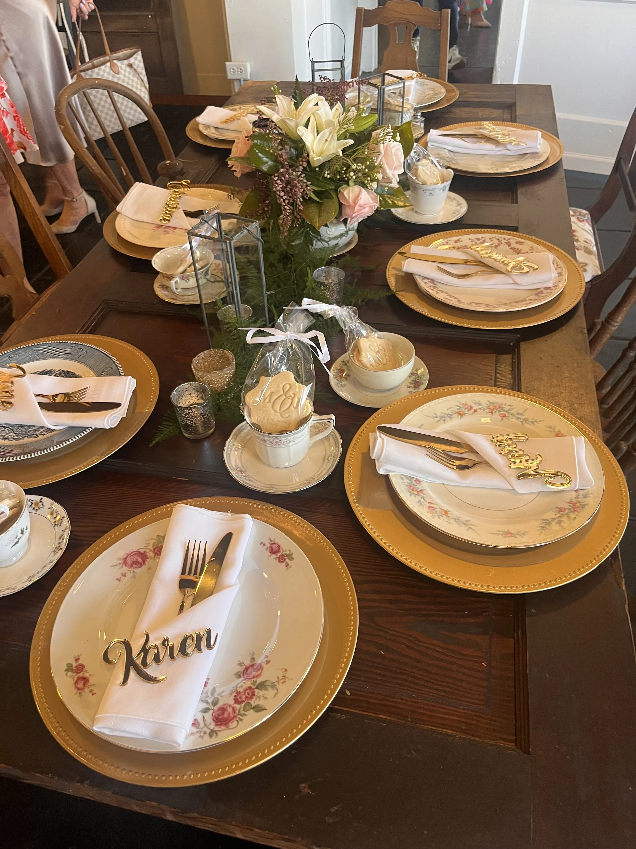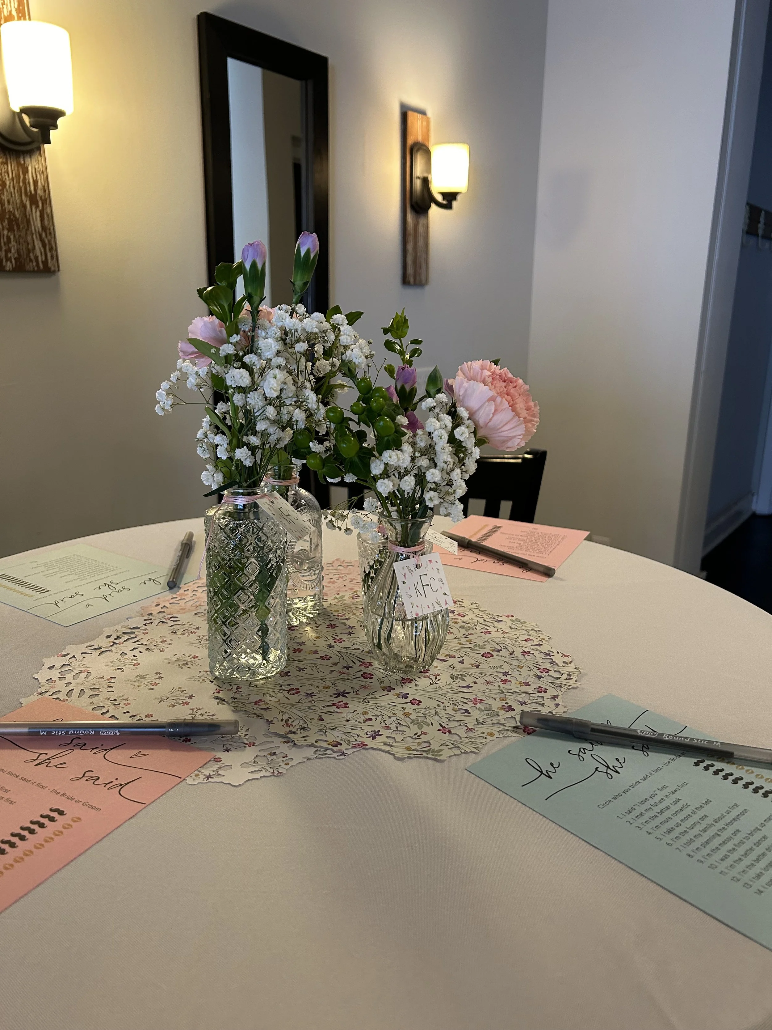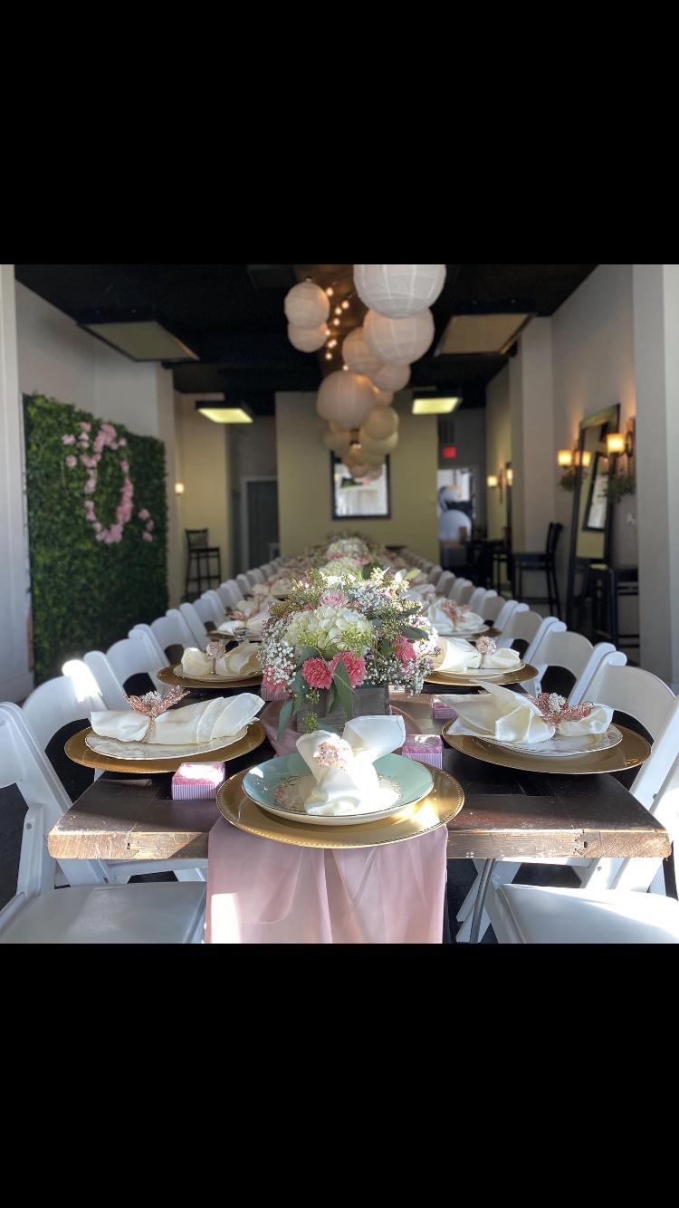 A floral centerpiece with white and orange flowers on a table set for a baby shower, with a sign that reads "Baby In Bloom" and event details. The table has gold and white plates, wine glasses, and small pink candles, with a wooden slab as the table