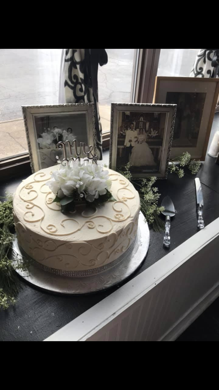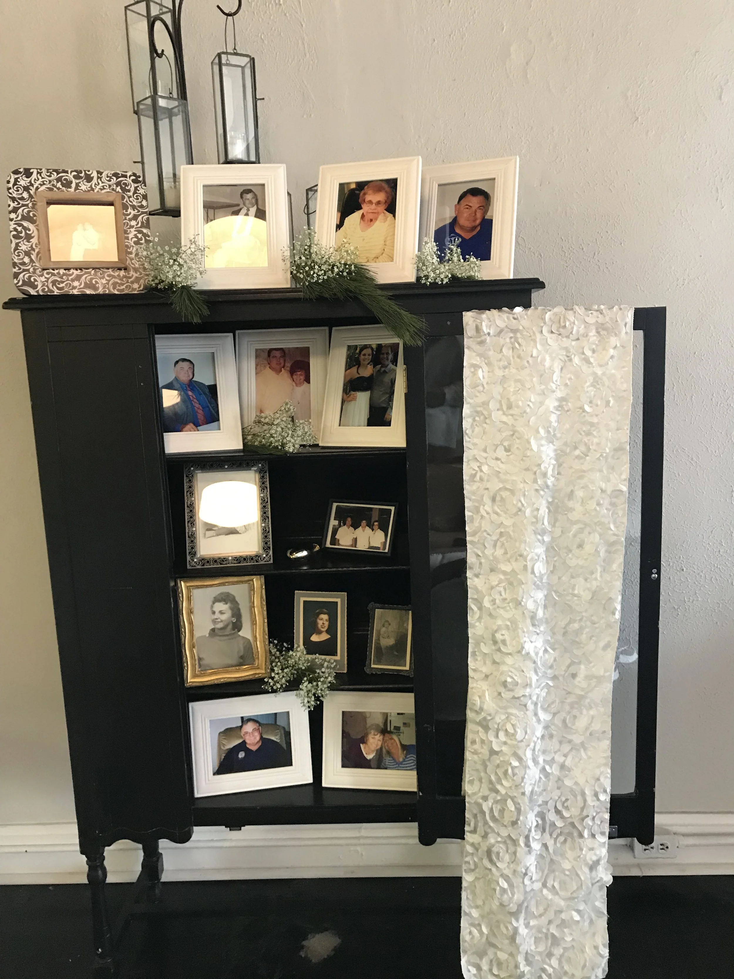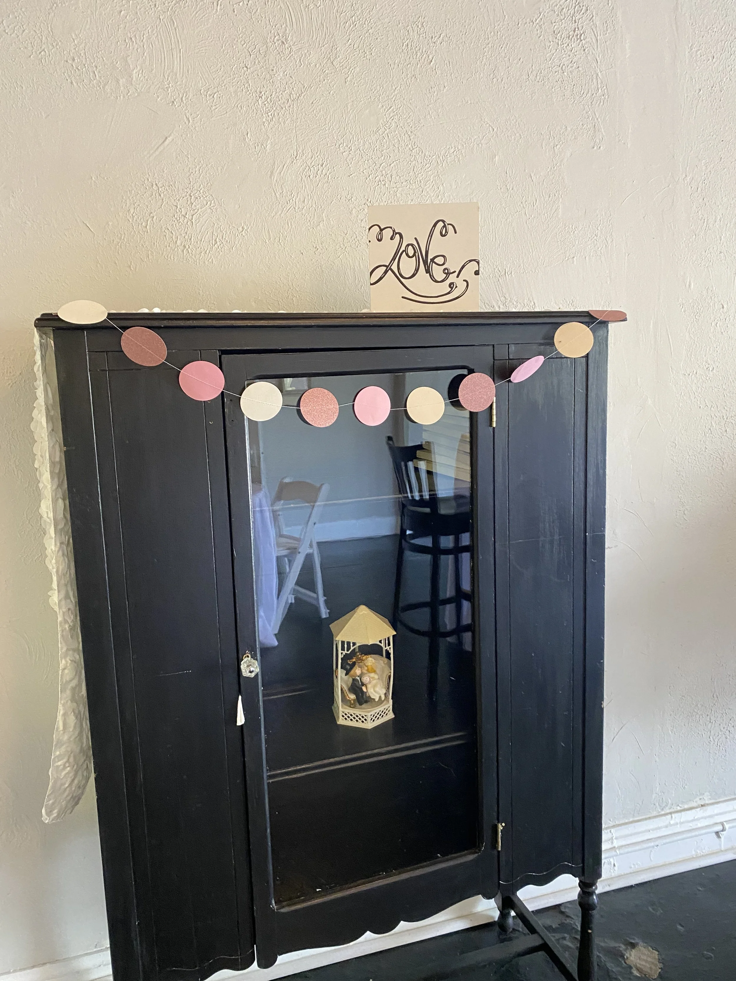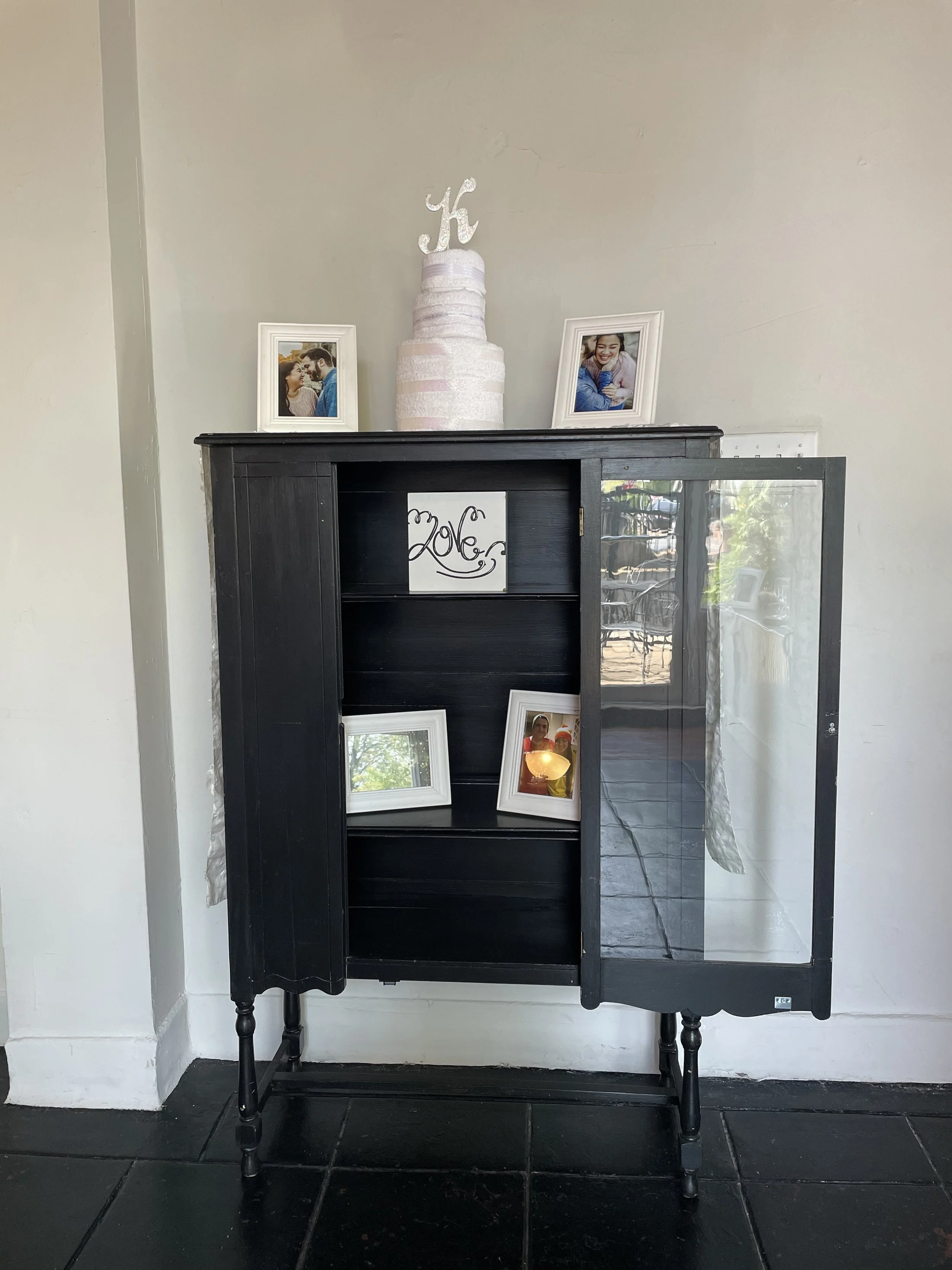 A black wooden cabinet with glass doors and some bookshelves. On top, there are two framed photos, a three-tier pink cake with a glitter letter 'K' on top, and a decorative sign that reads 'Love' inside the cabinet.