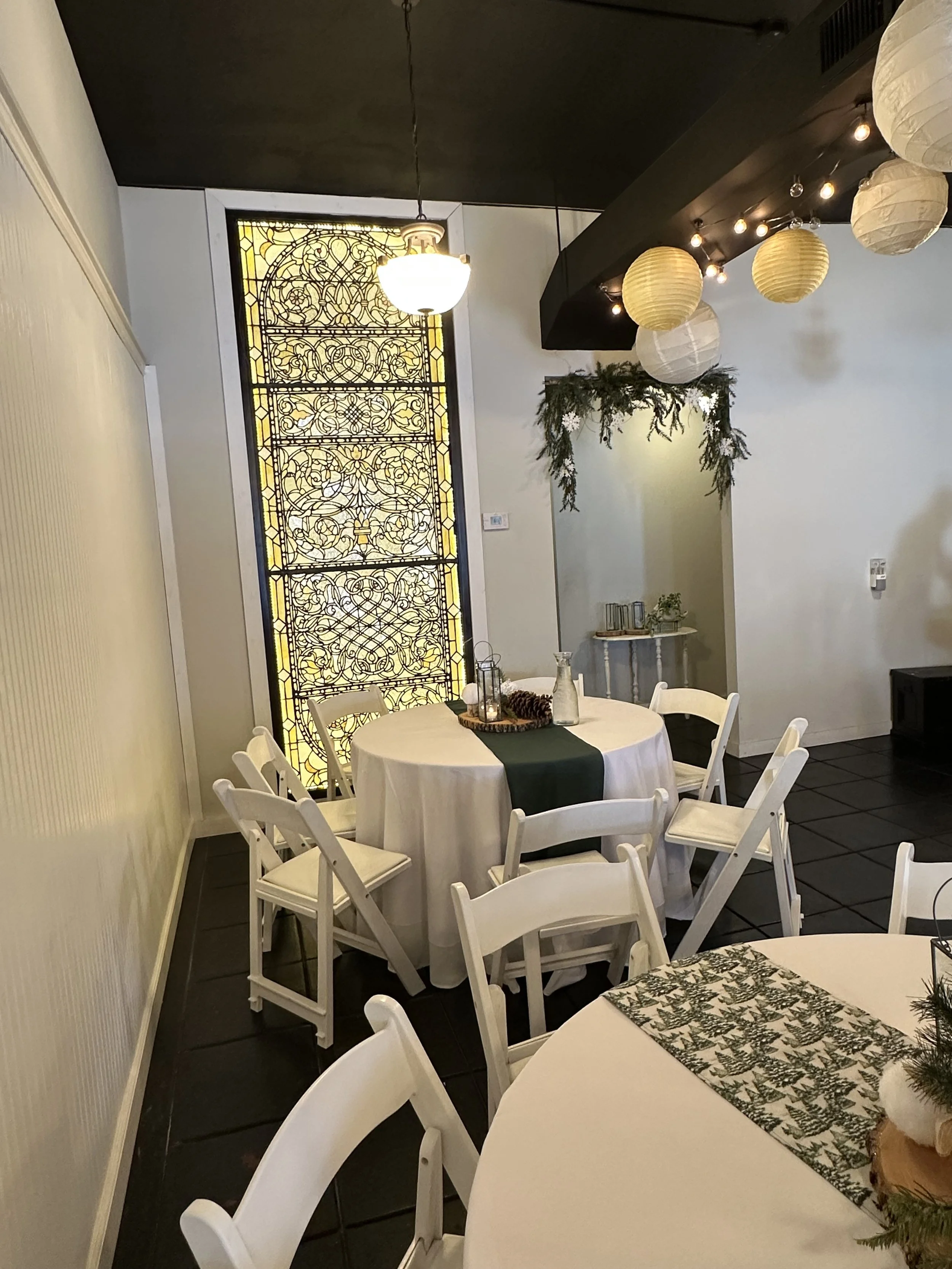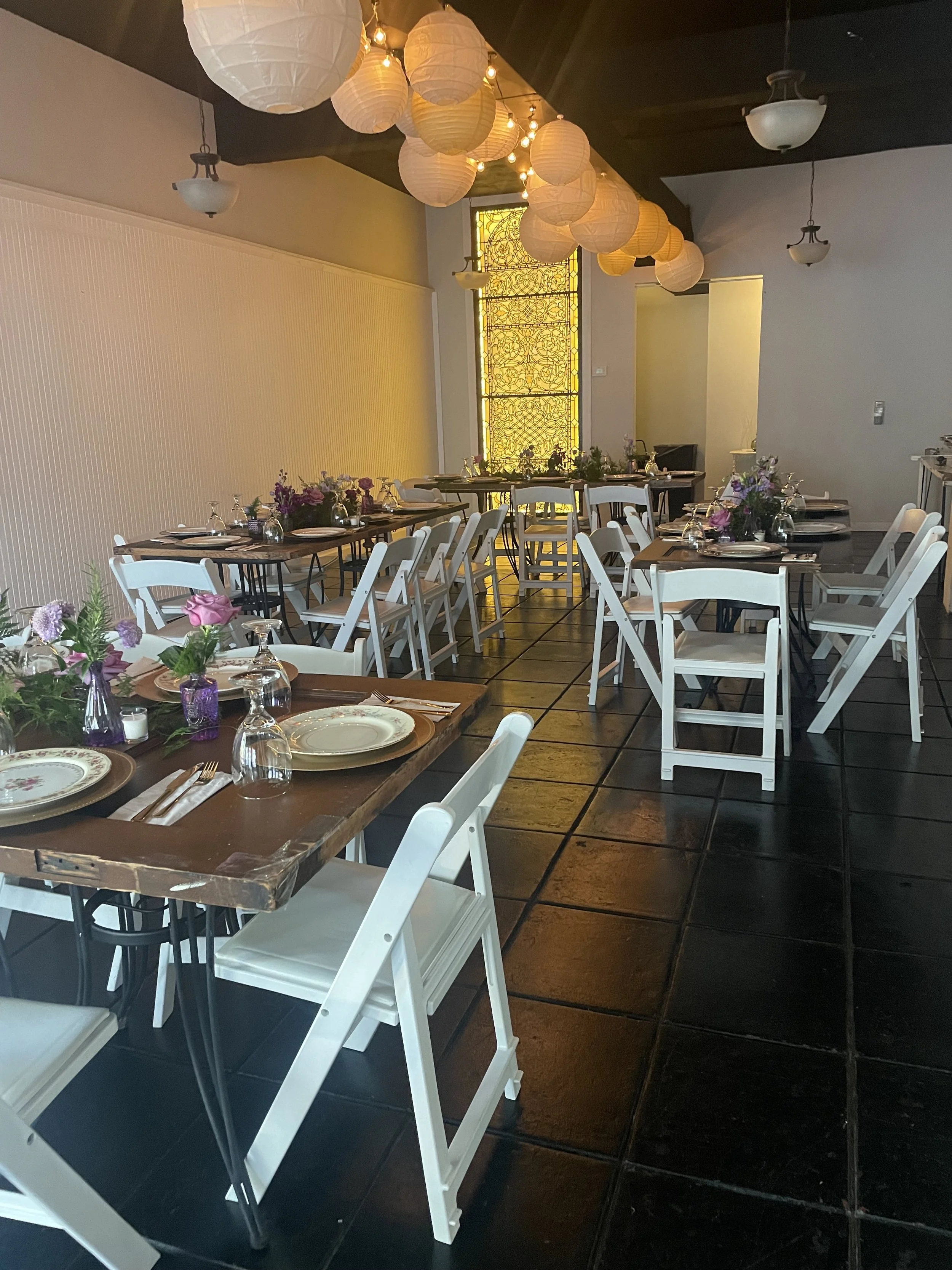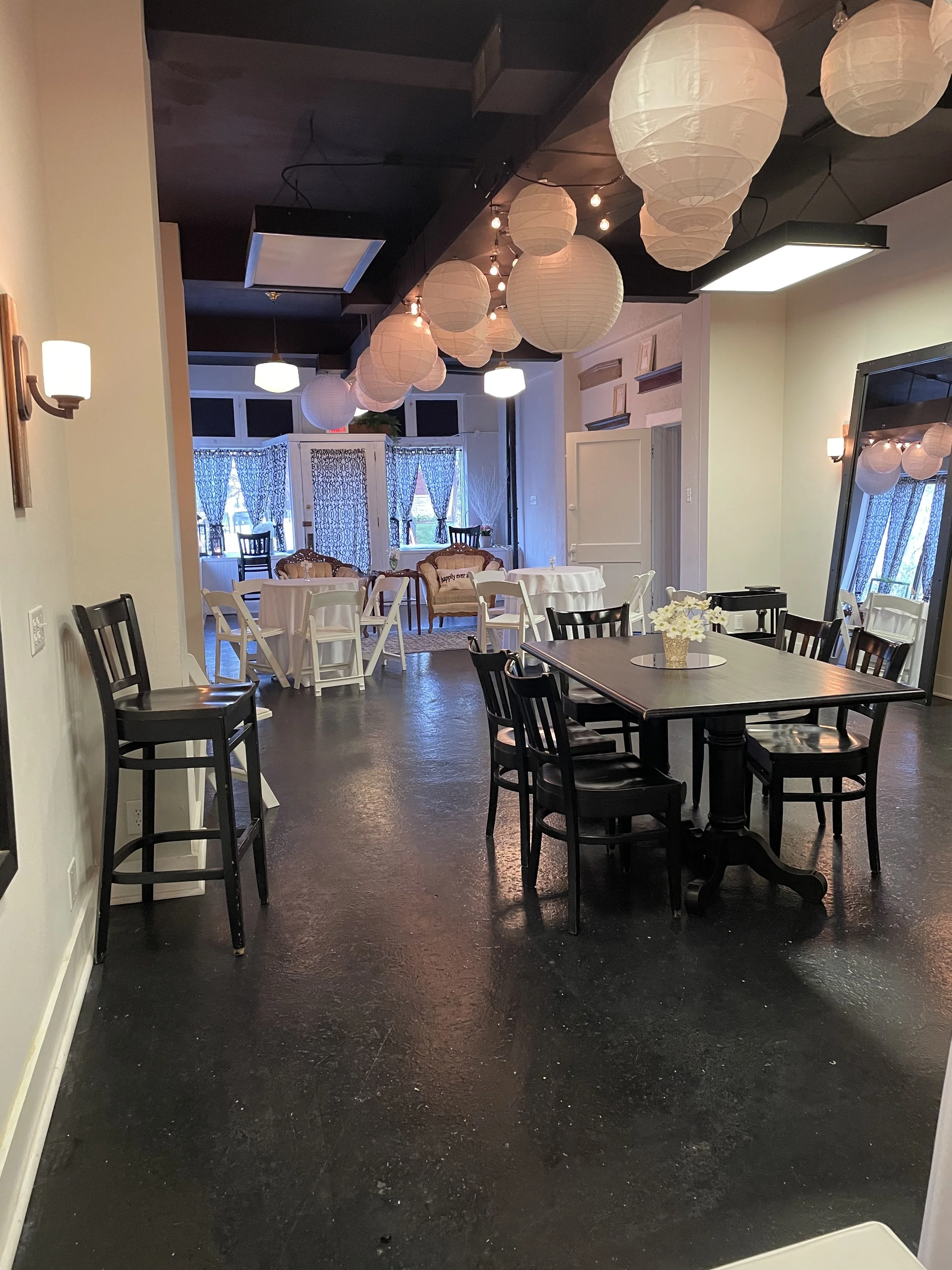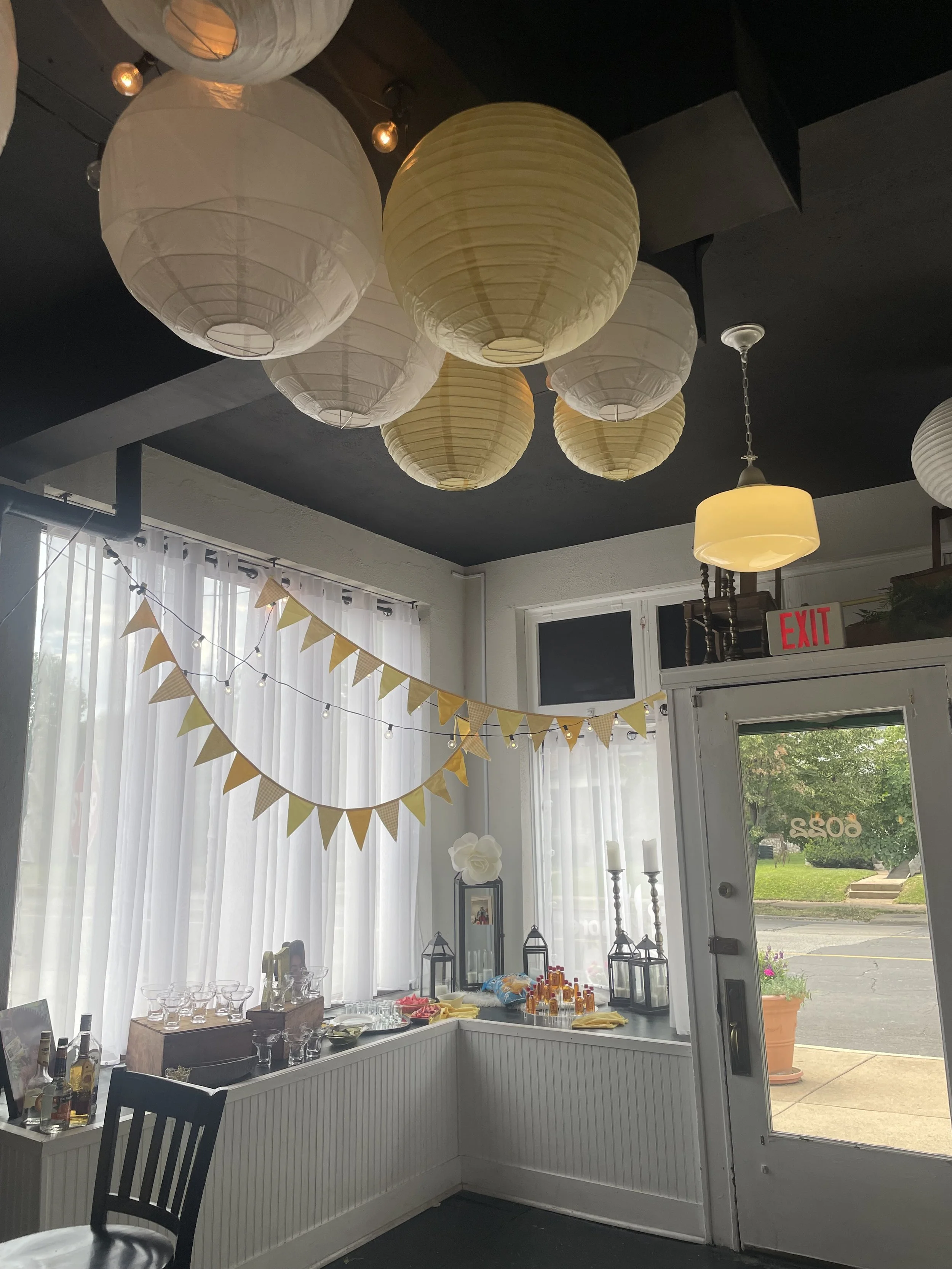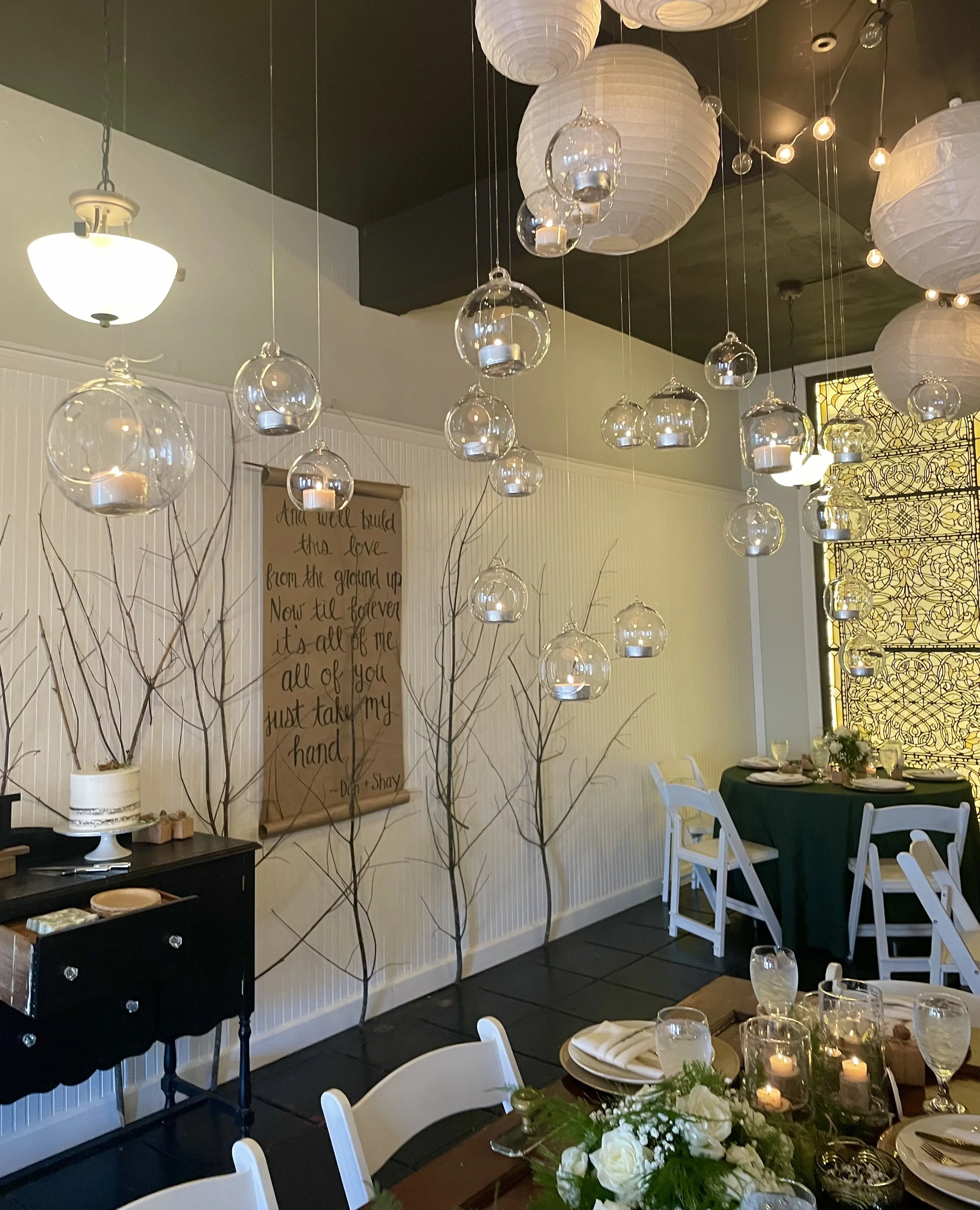 Interior of a decorated event space with round tables, black and white chairs, paper lanterns hanging from the ceiling, and lace curtains at the windows.