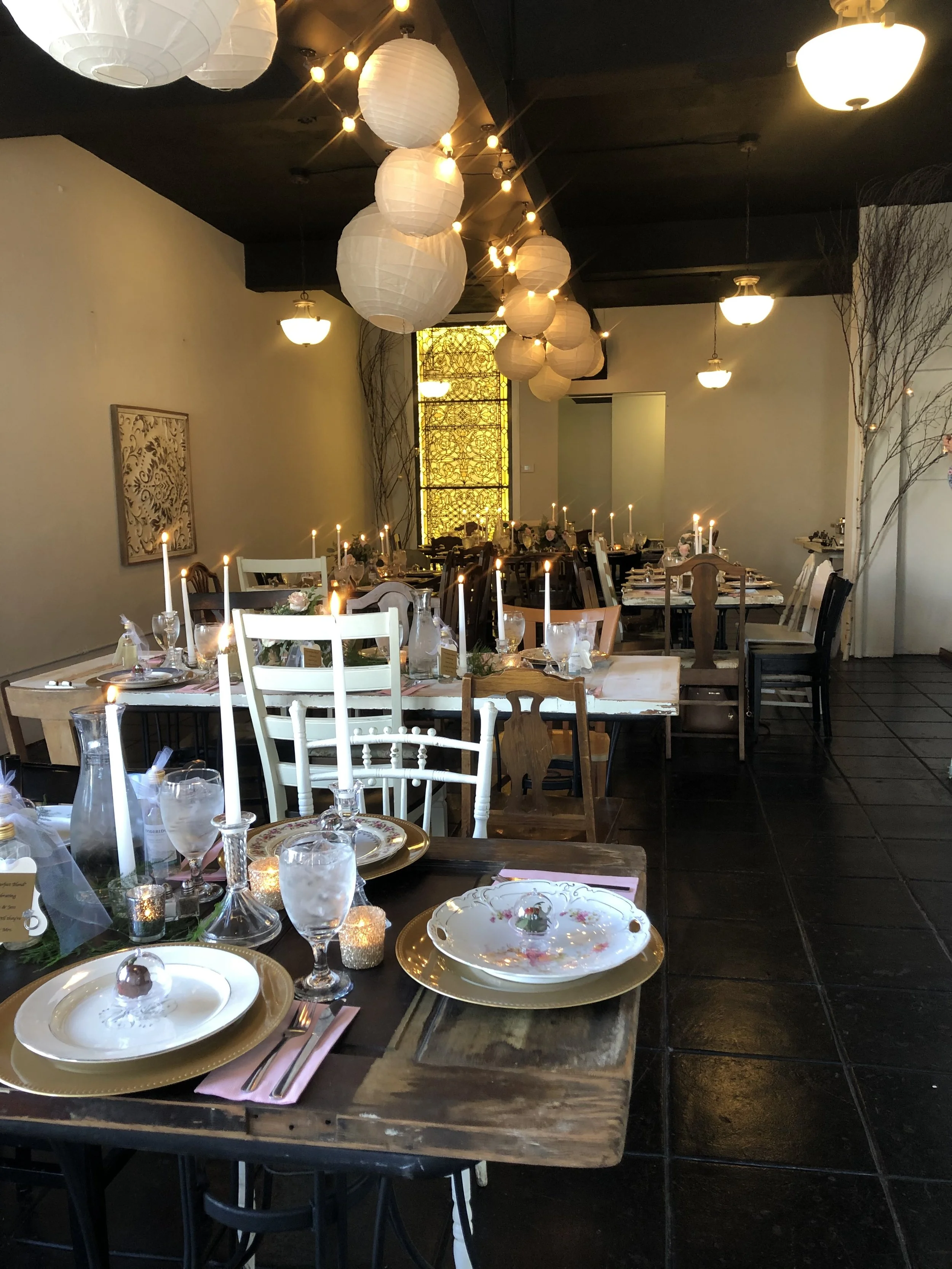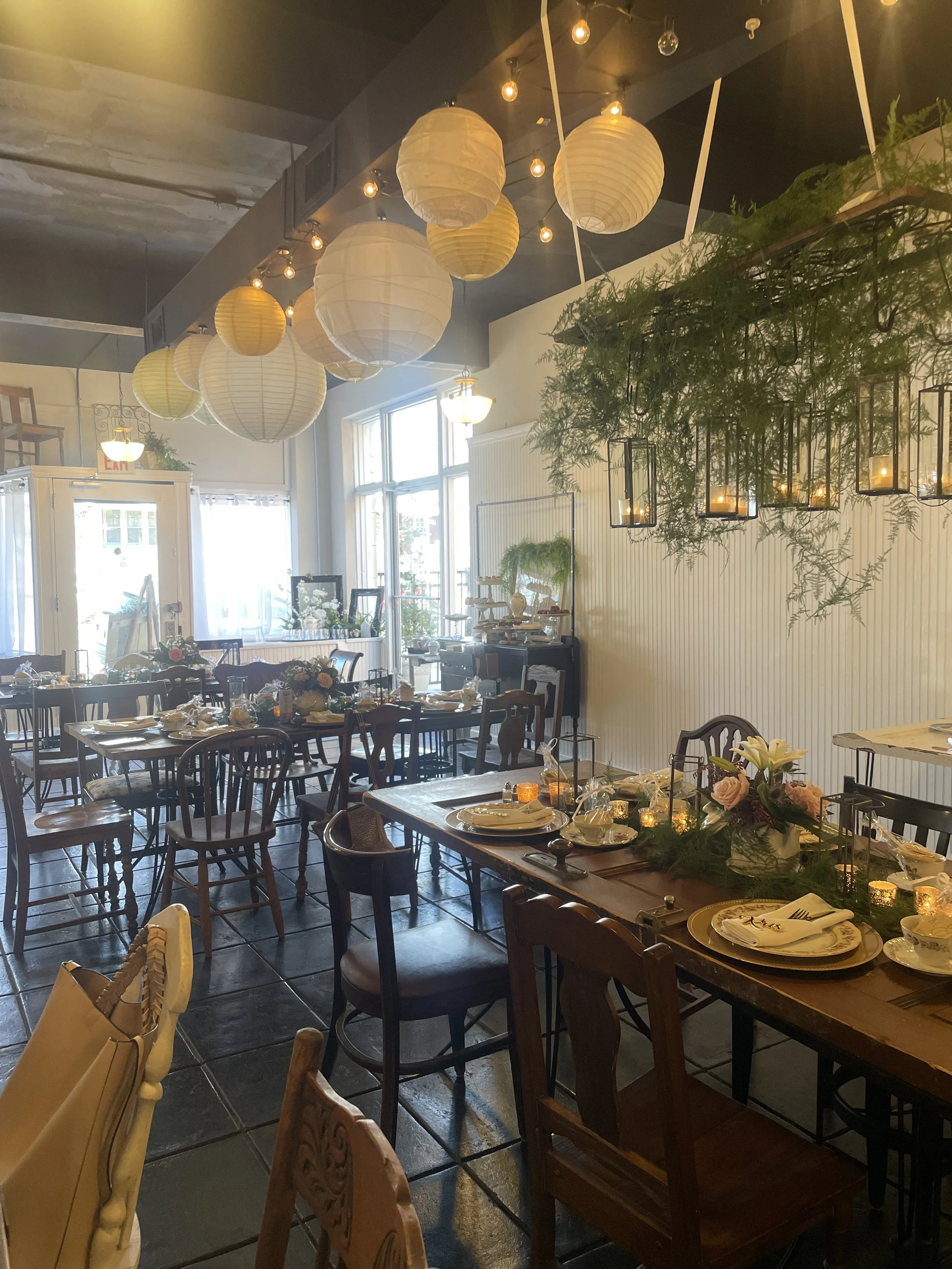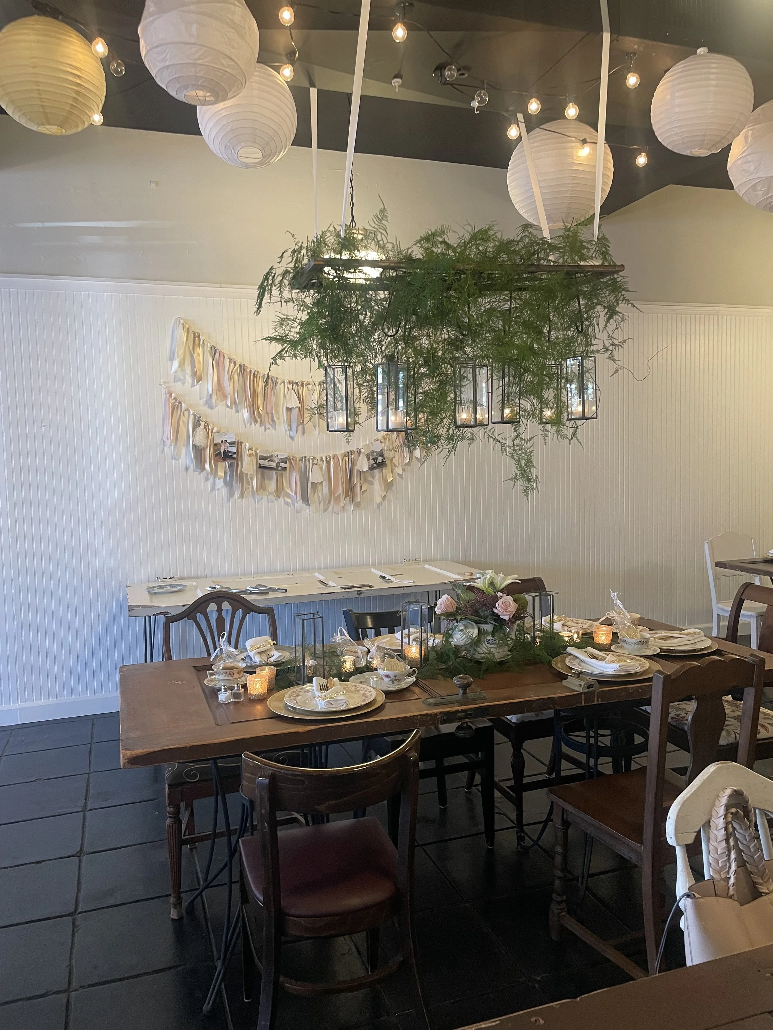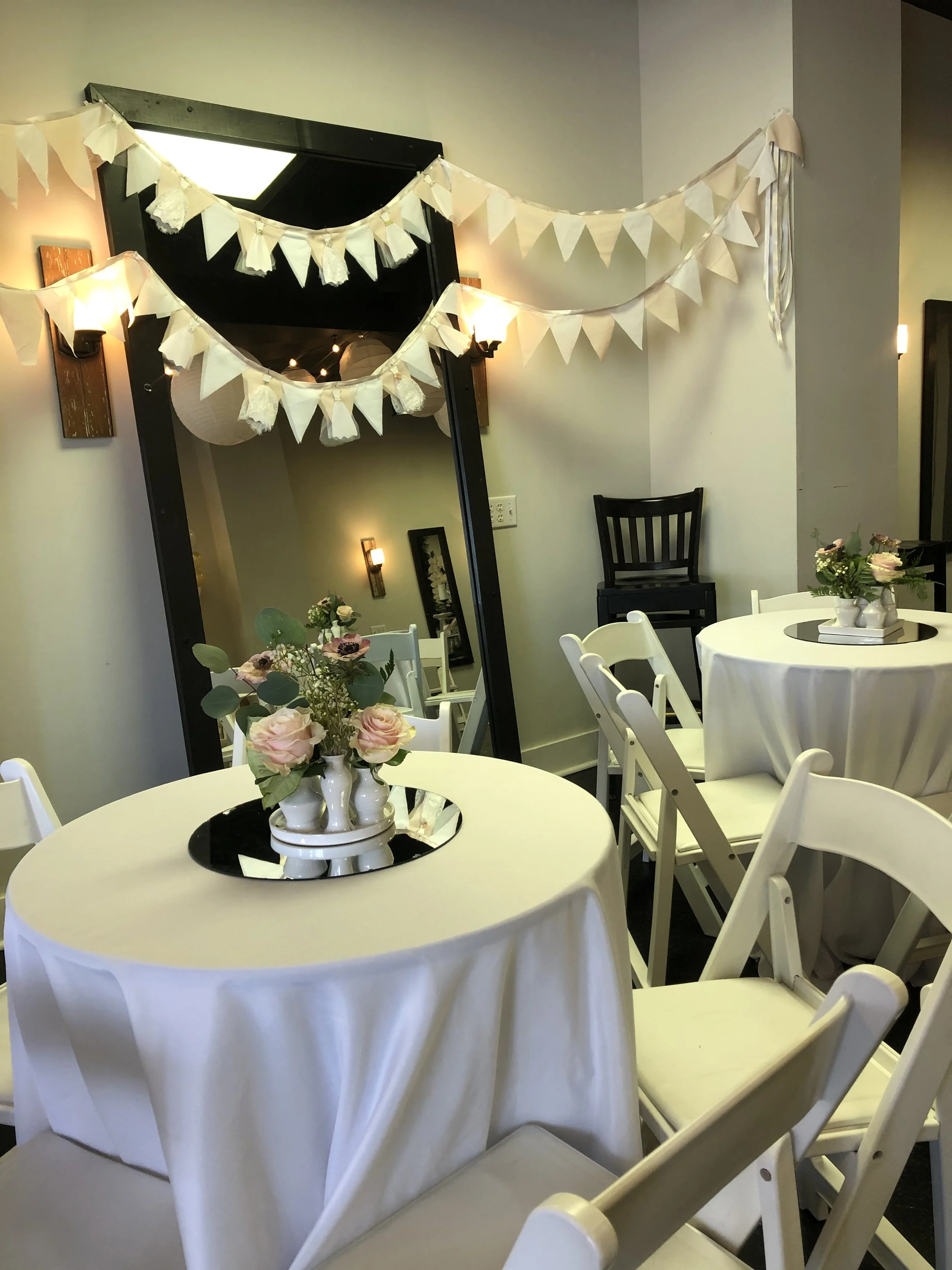 Interior of a decorated event space with round tables, black and white chairs, paper lanterns hanging from the ceiling, and lace curtains at the windows.
