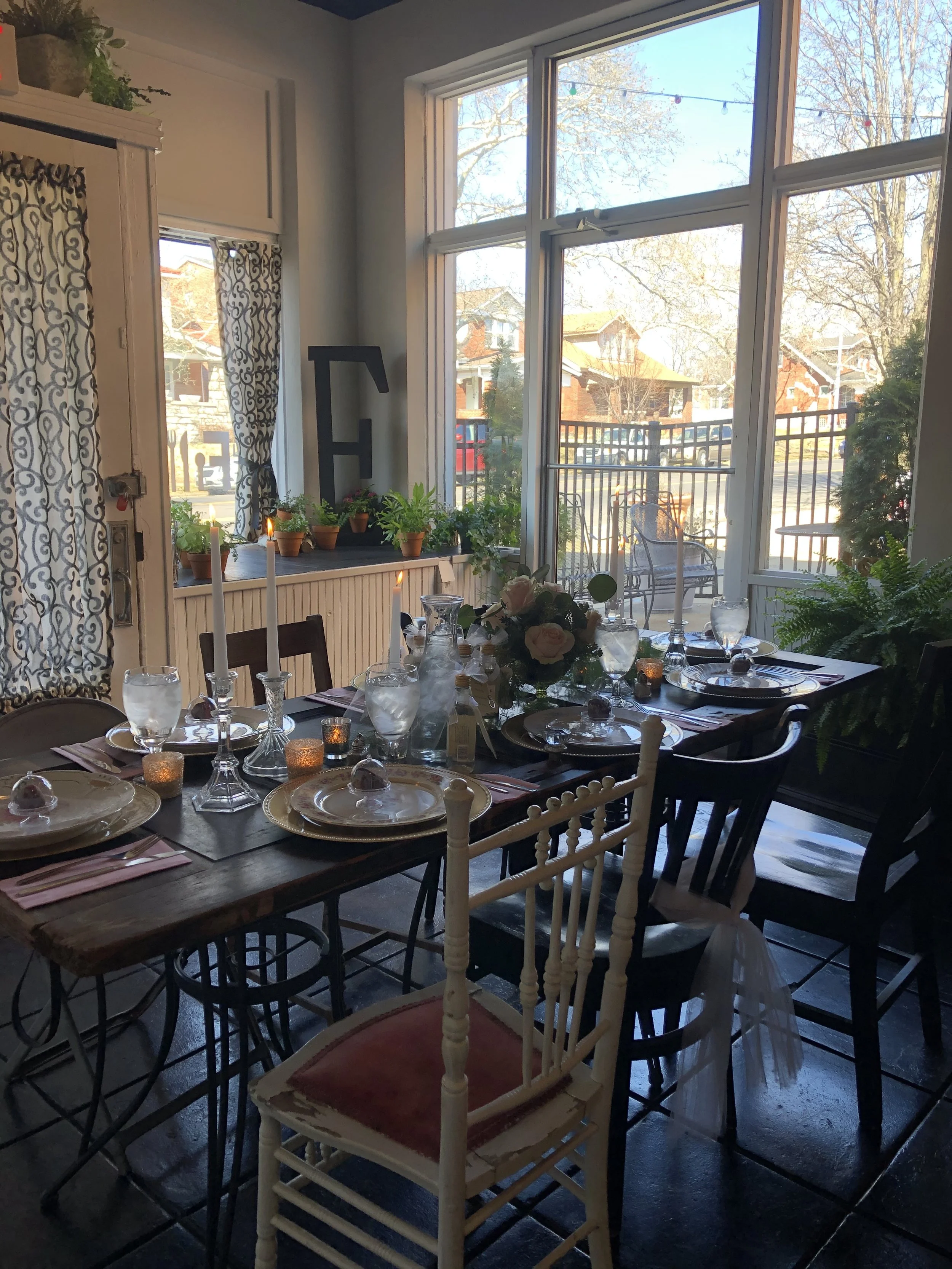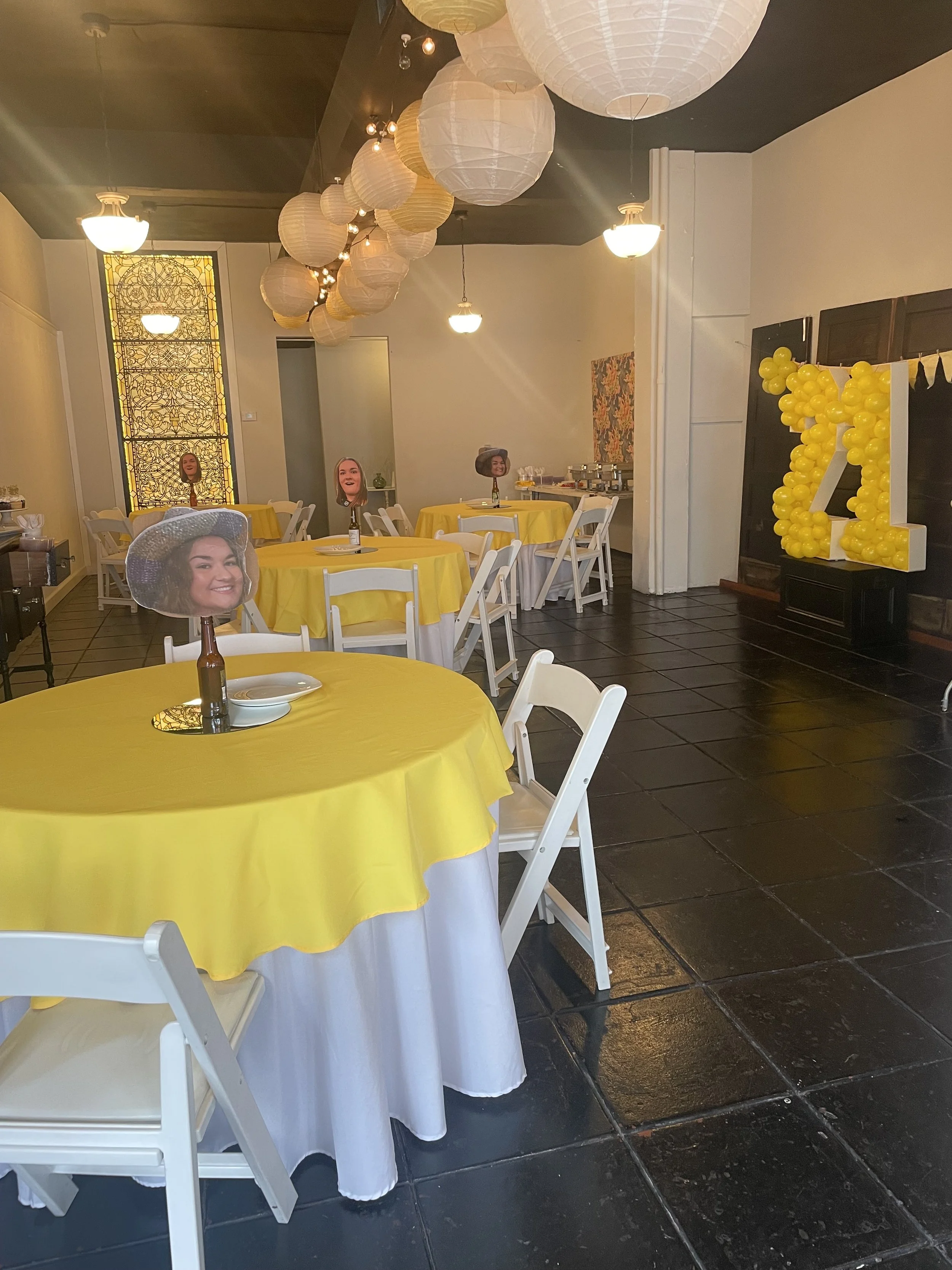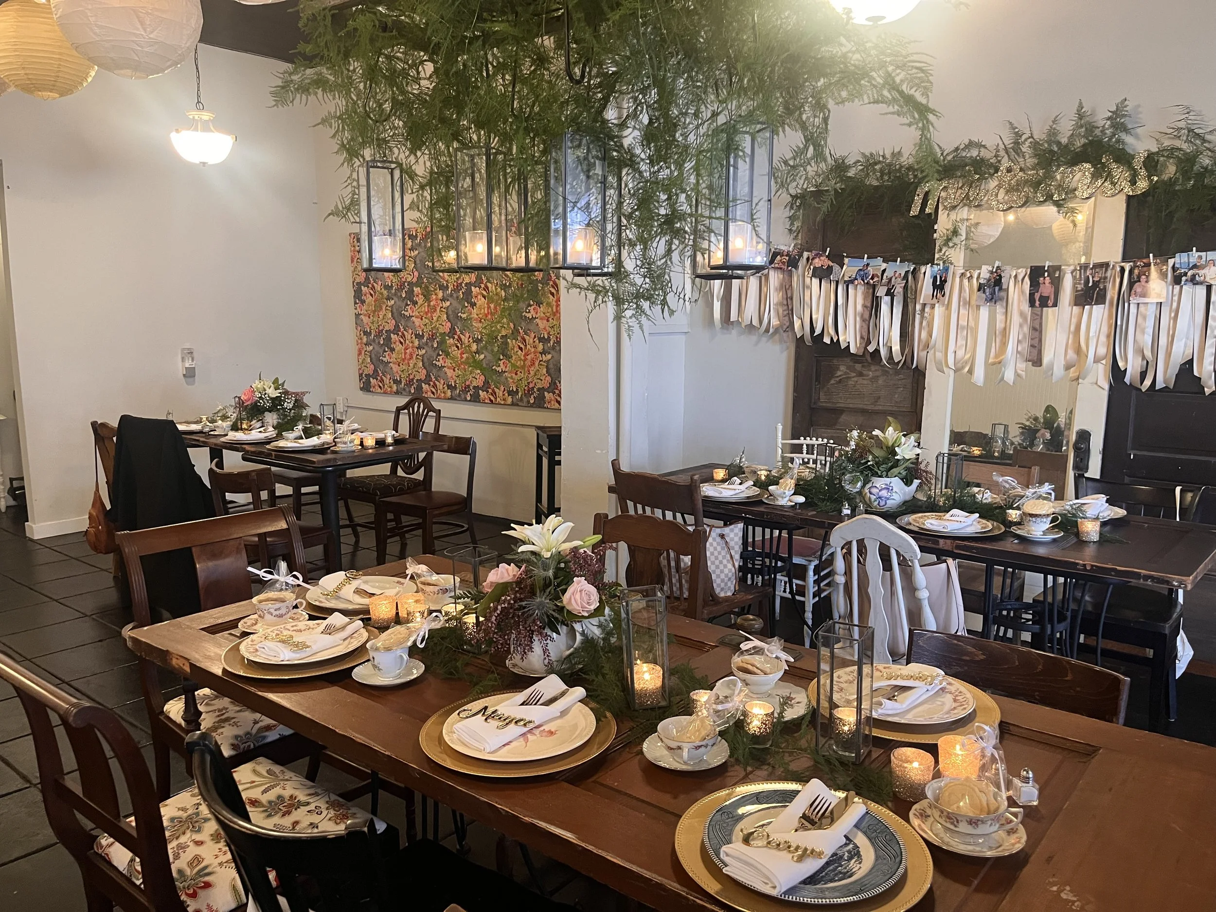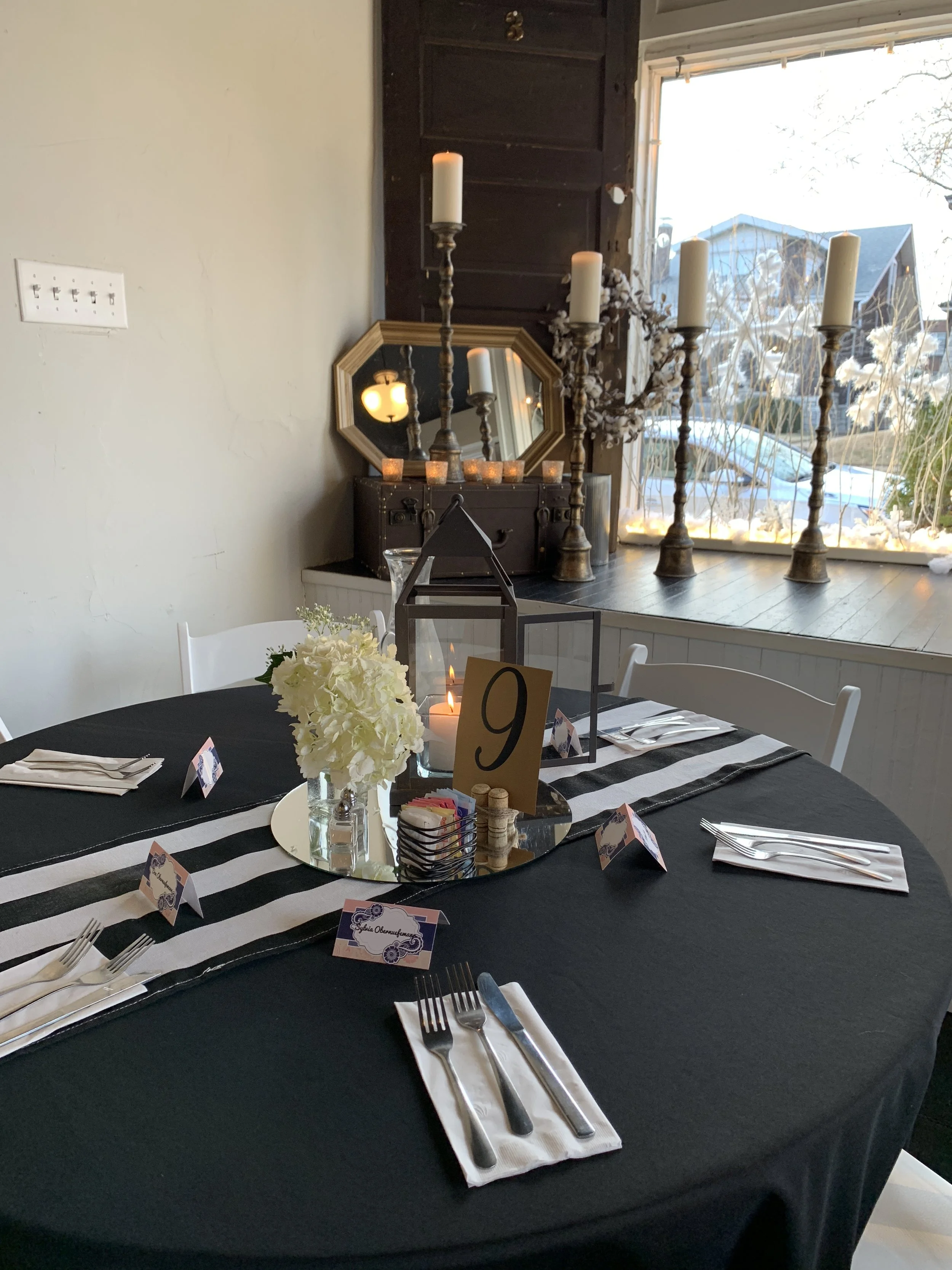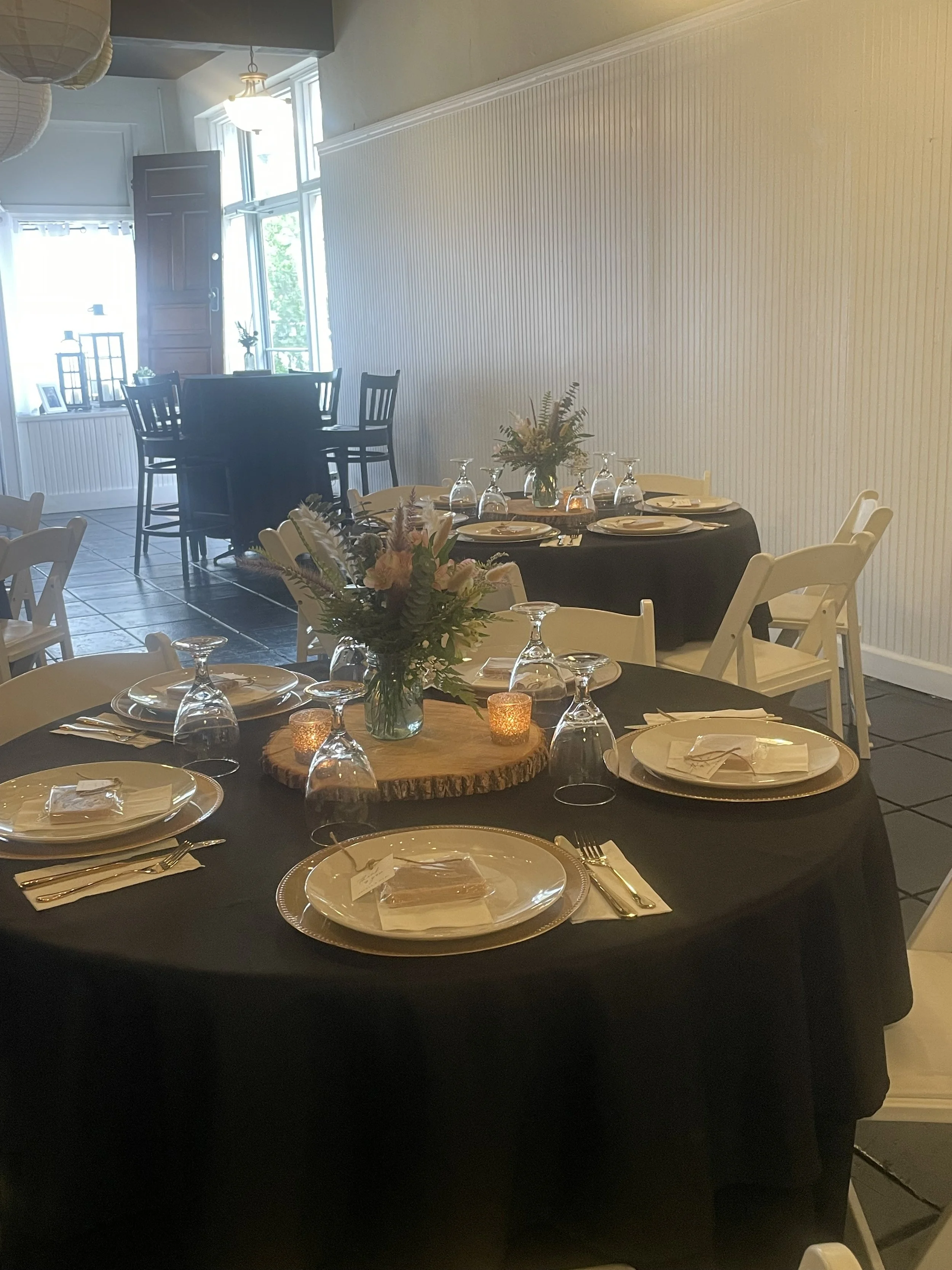 Interior of a decorated event space with round tables, black and white chairs, paper lanterns hanging from the ceiling, and lace curtains at the windows.