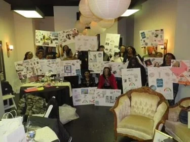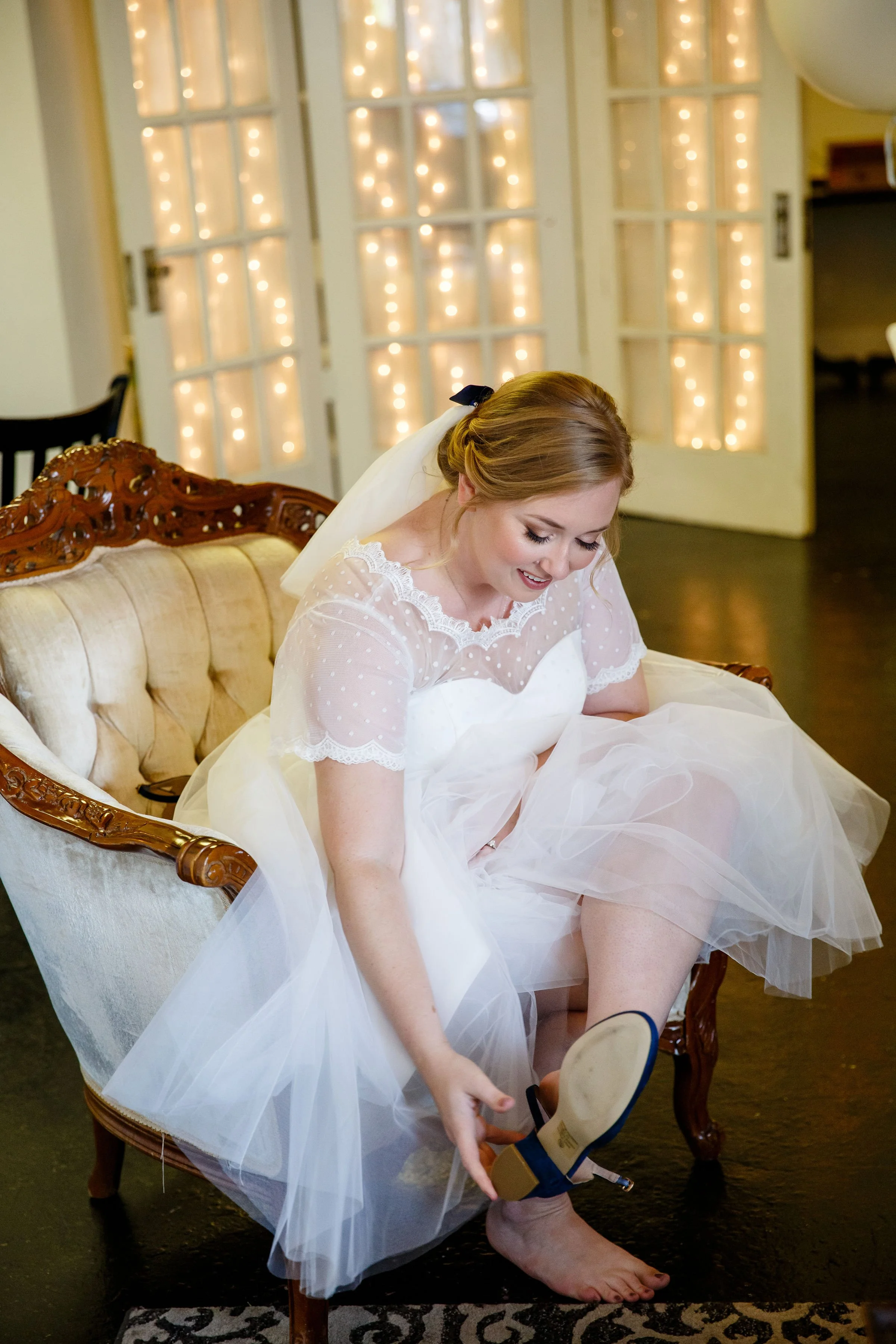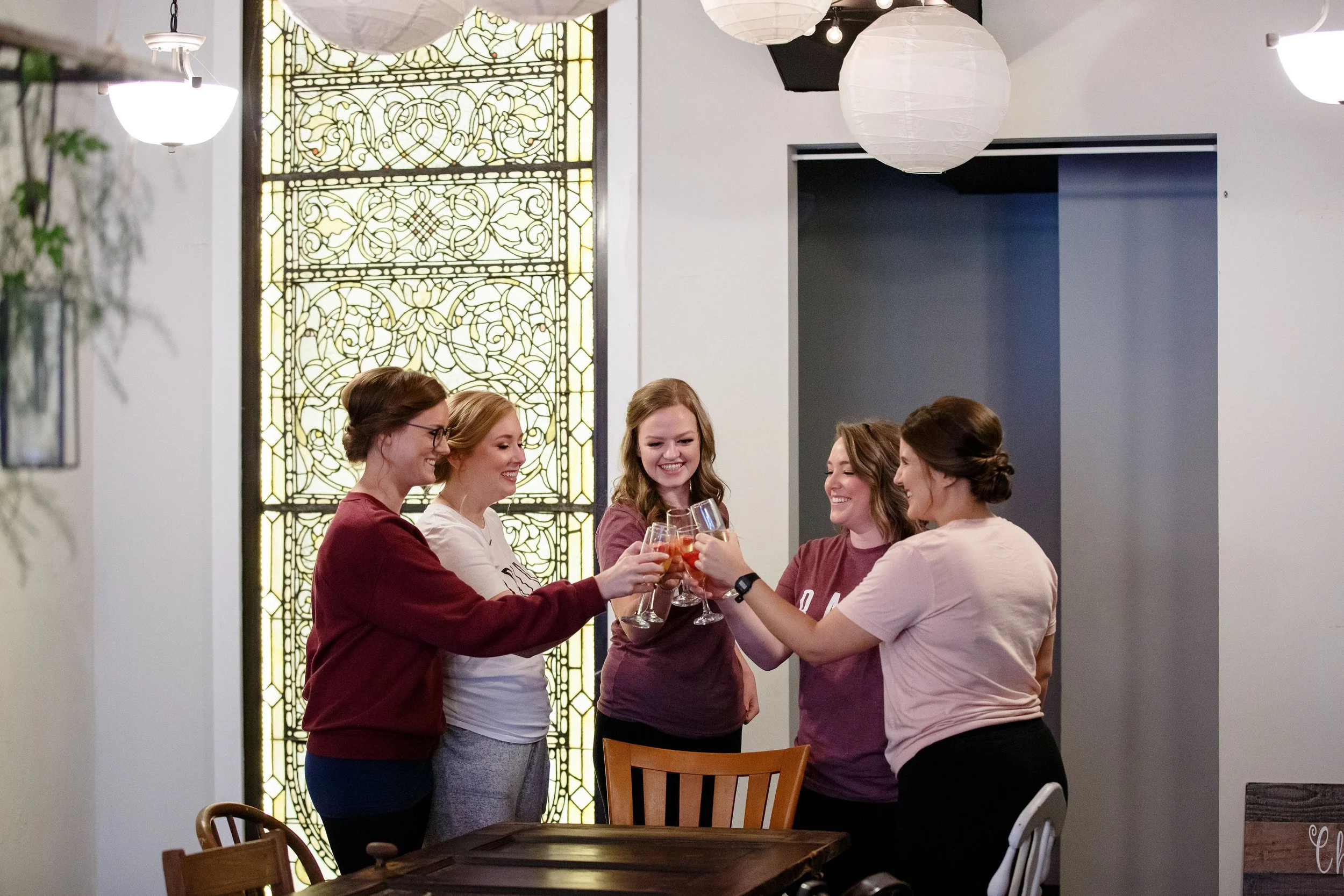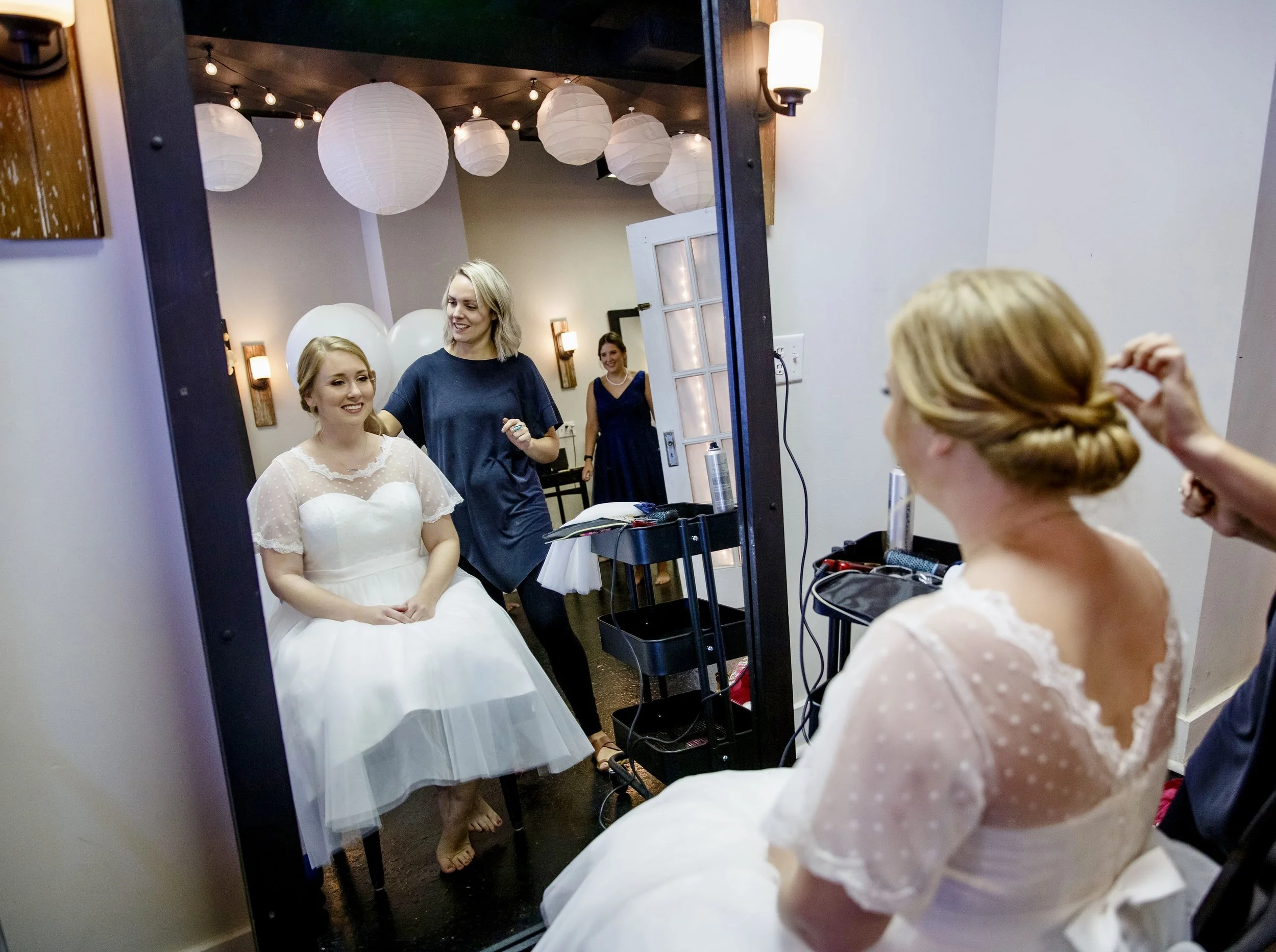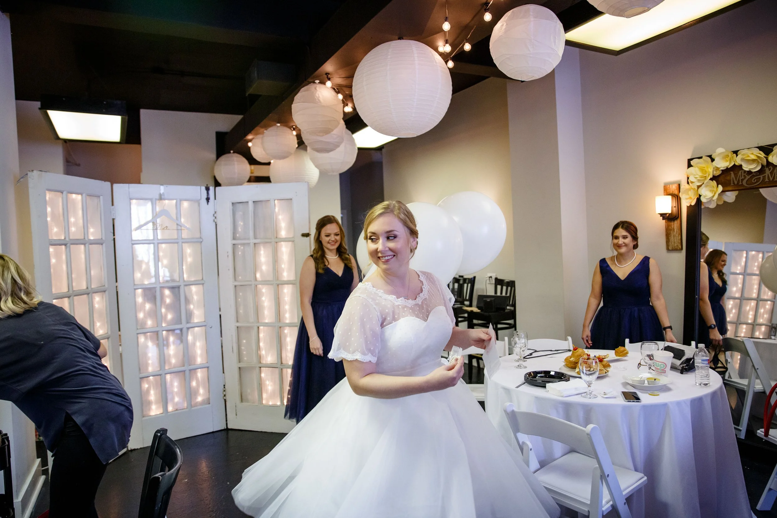 Interior of a decorated event space with round tables, black and white chairs, paper lanterns hanging from the ceiling, and lace curtains at the windows.