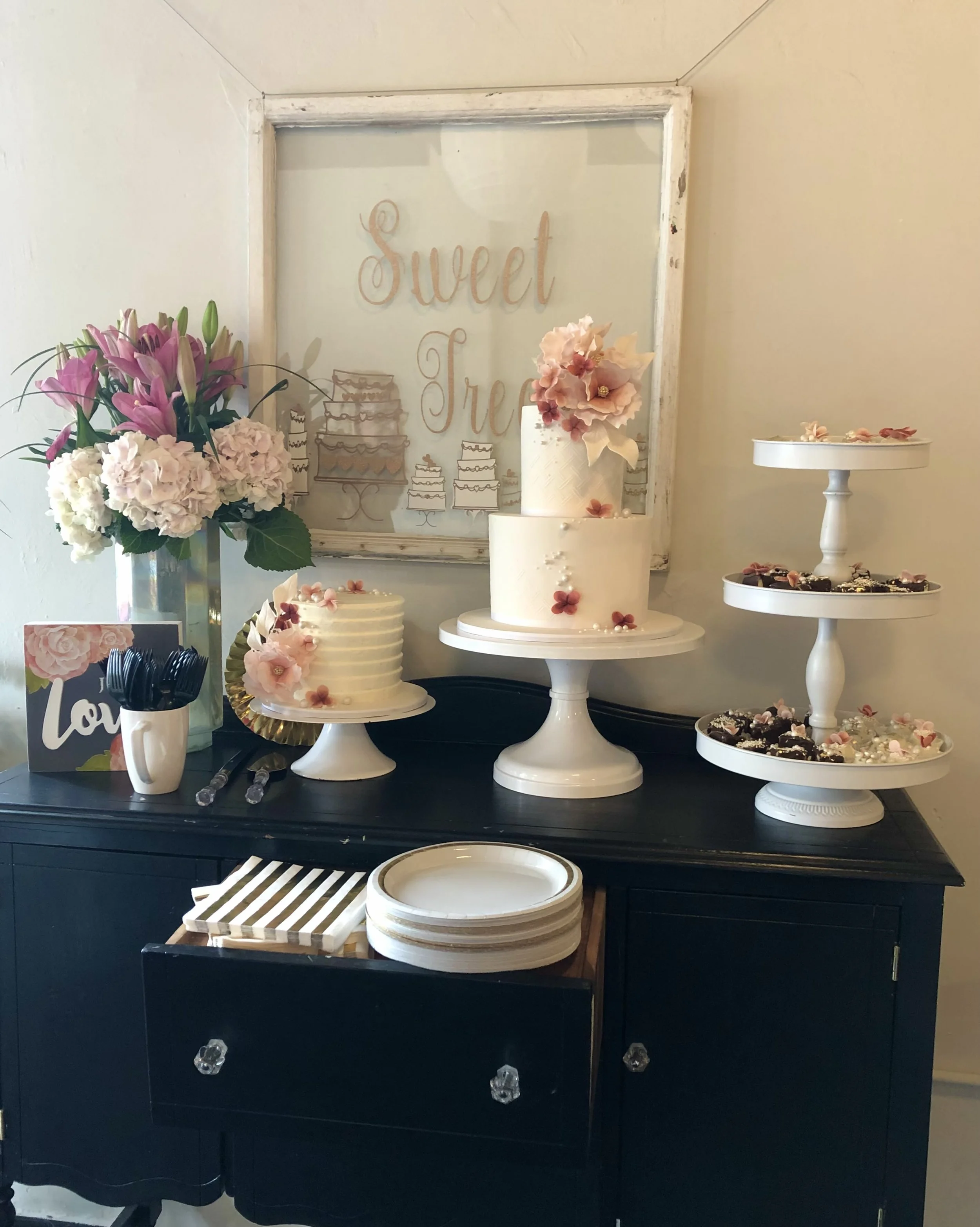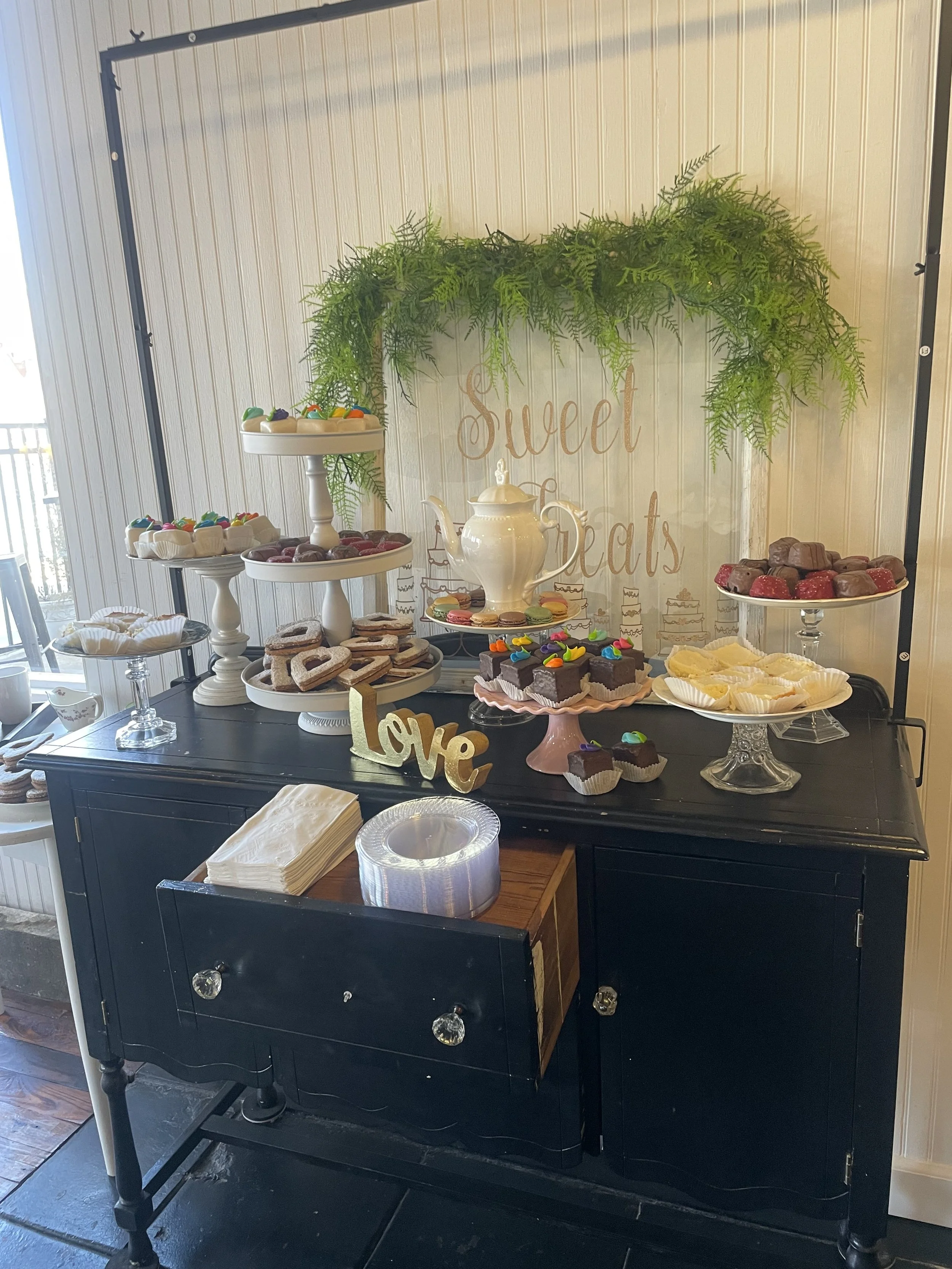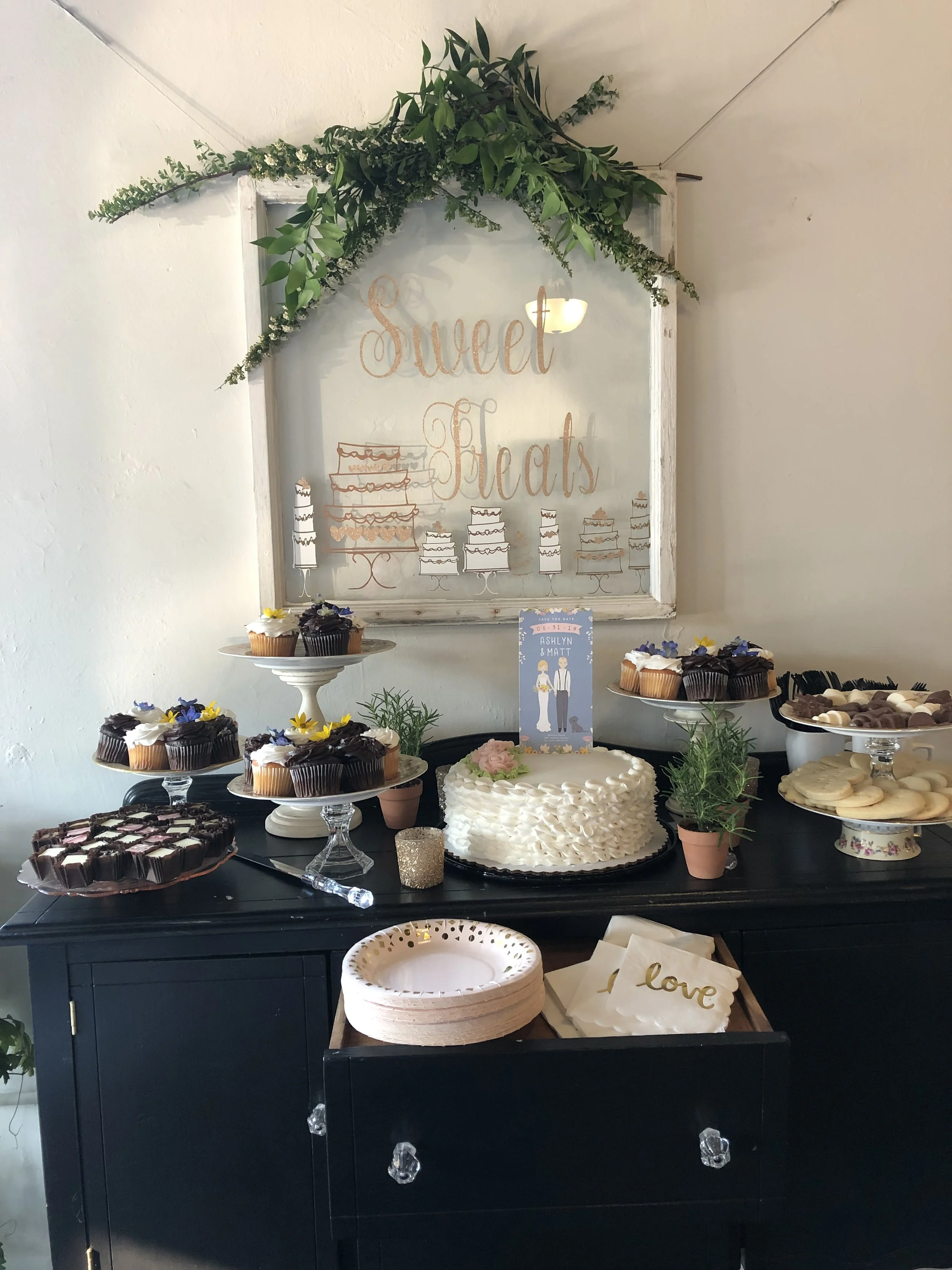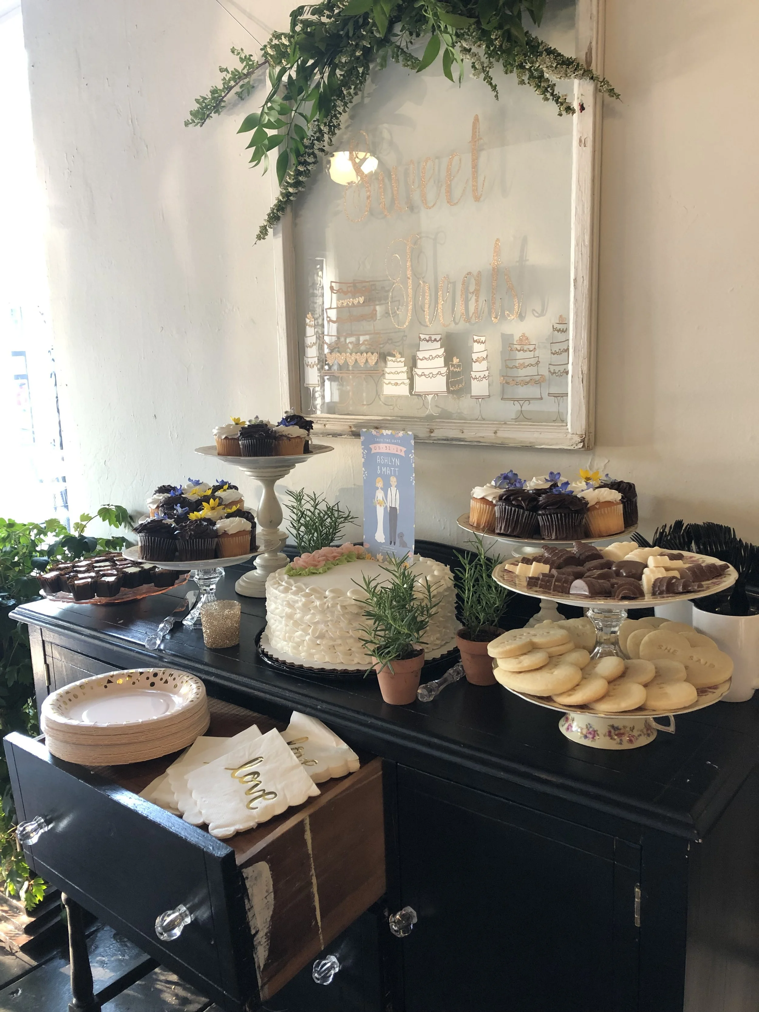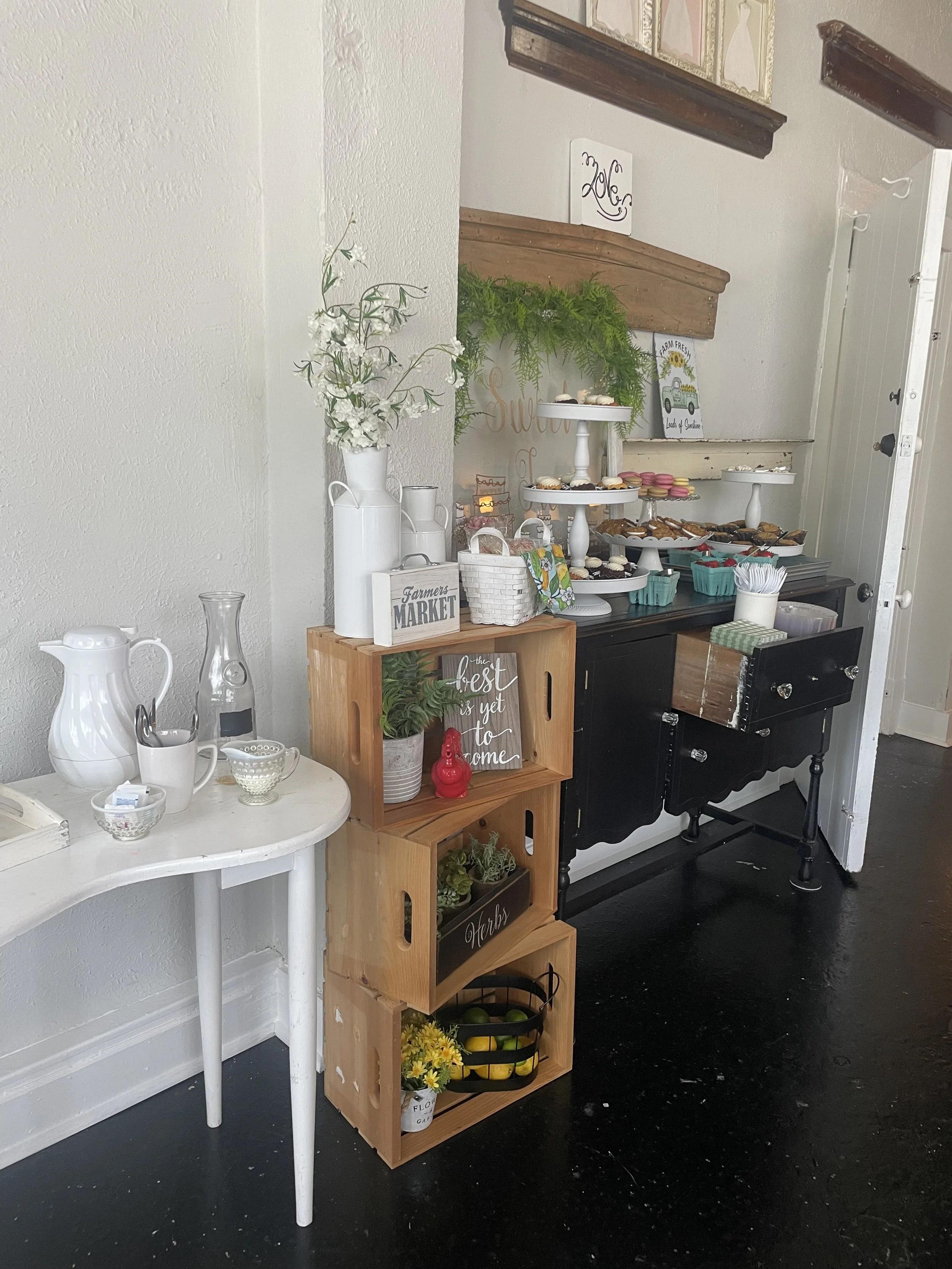 A dessert table with various baked goods on white pedestals, decorated with green foliage, and surrounded by wooden crates filled with flowers, plants, and decorative signs, set against a white wall.