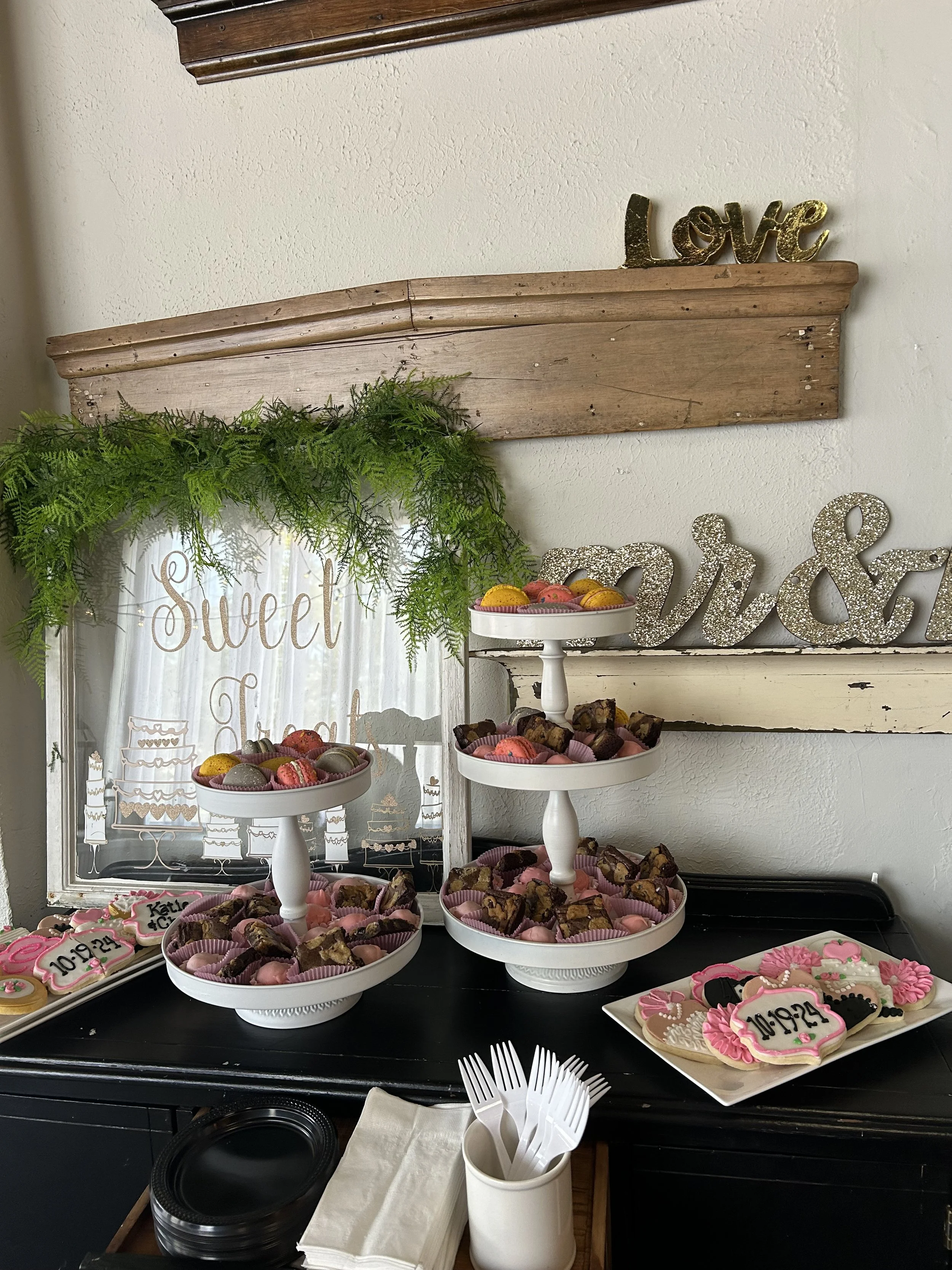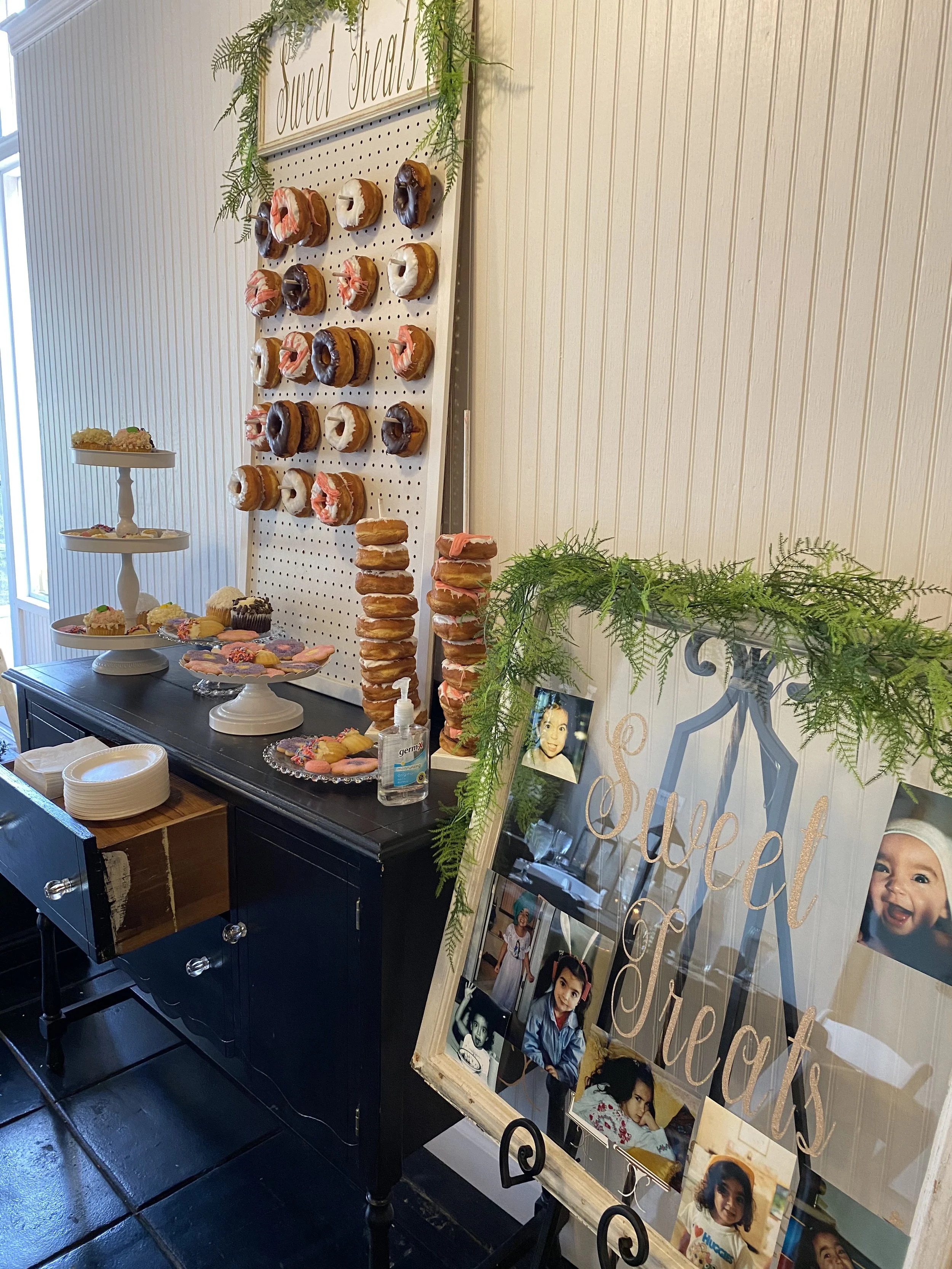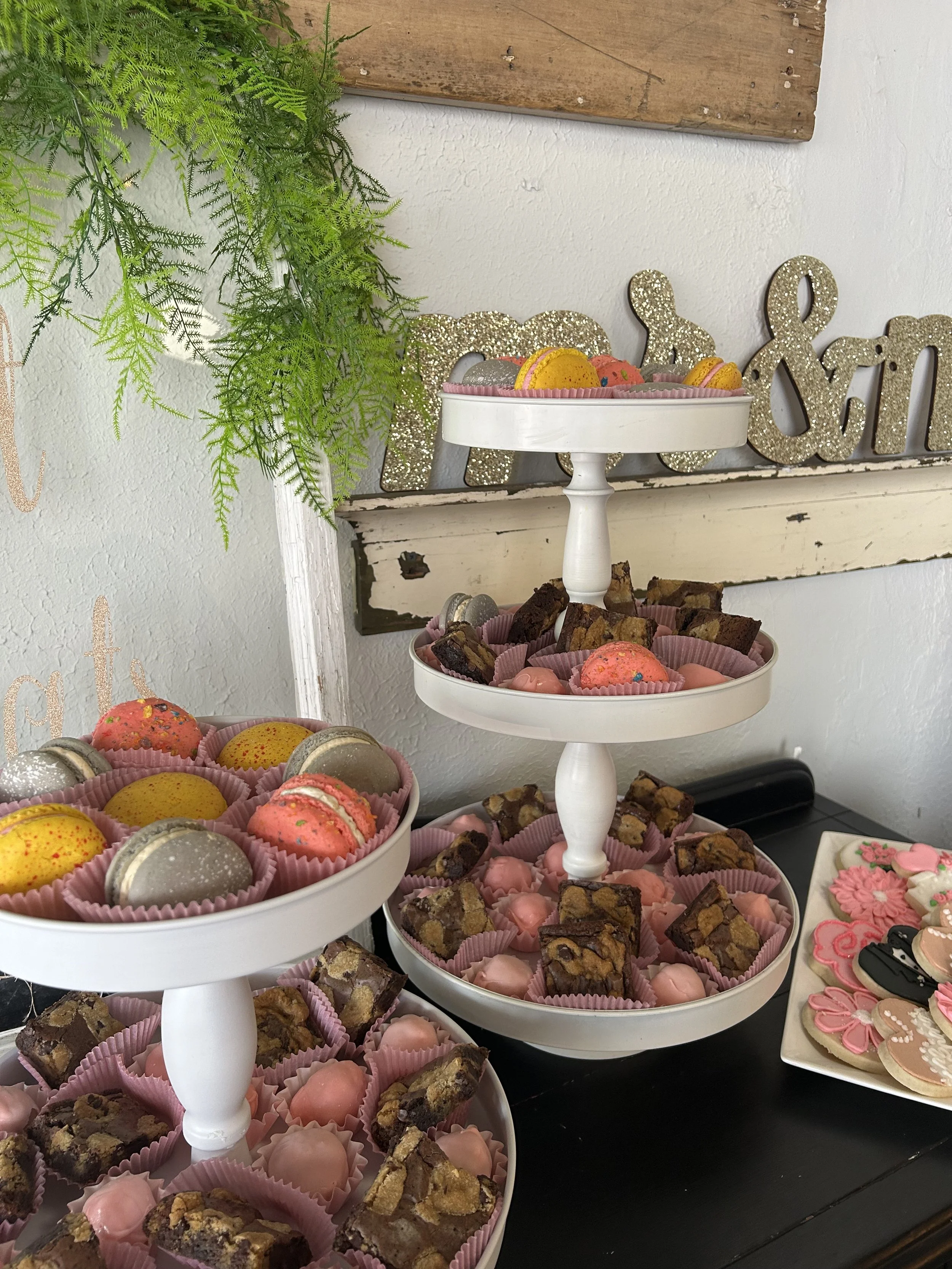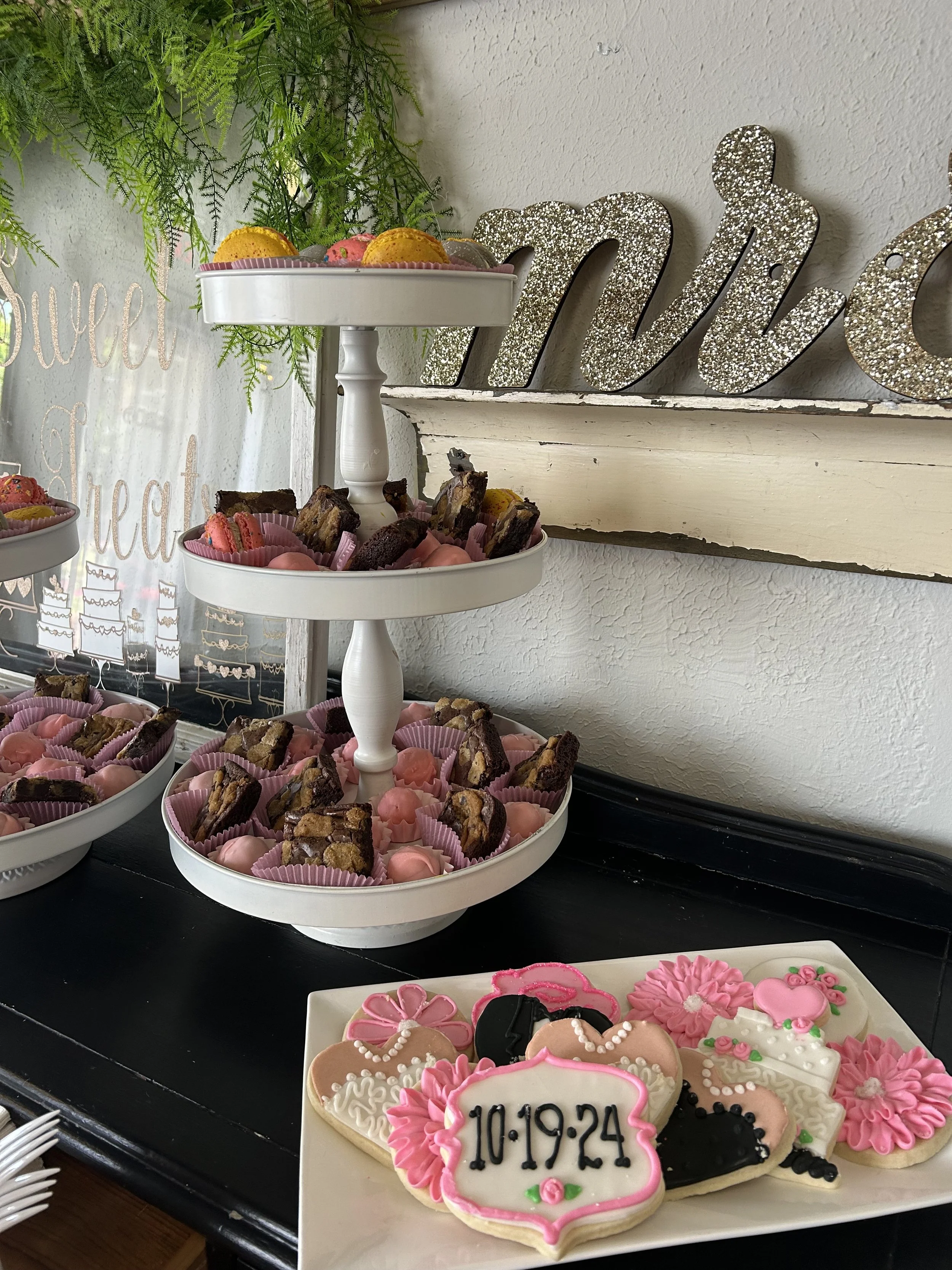A dessert table with various baked goods on white pedestals, decorated with green foliage, and surrounded by wooden crates filled with flowers, plants, and decorative signs, set against a white wall.
