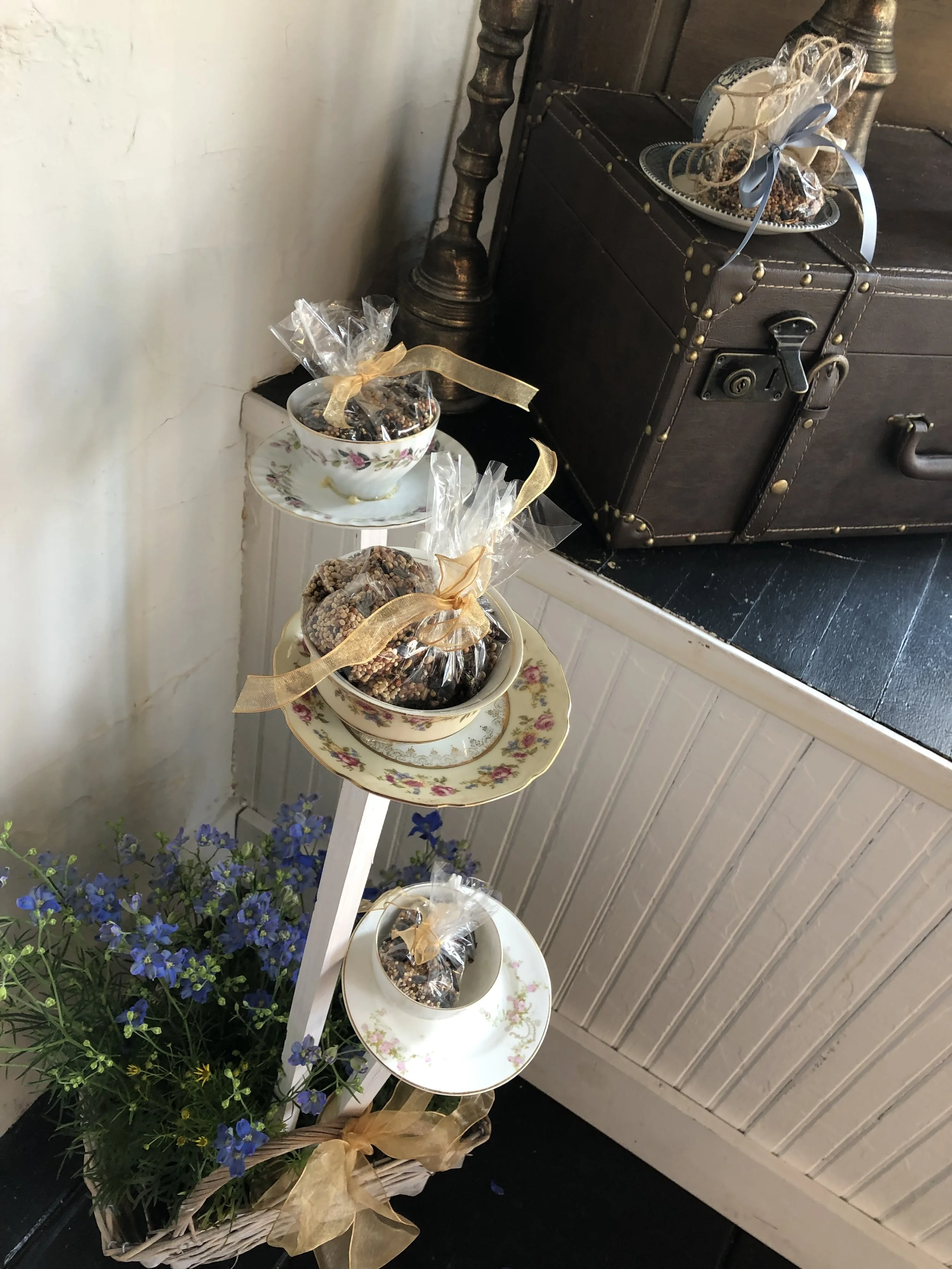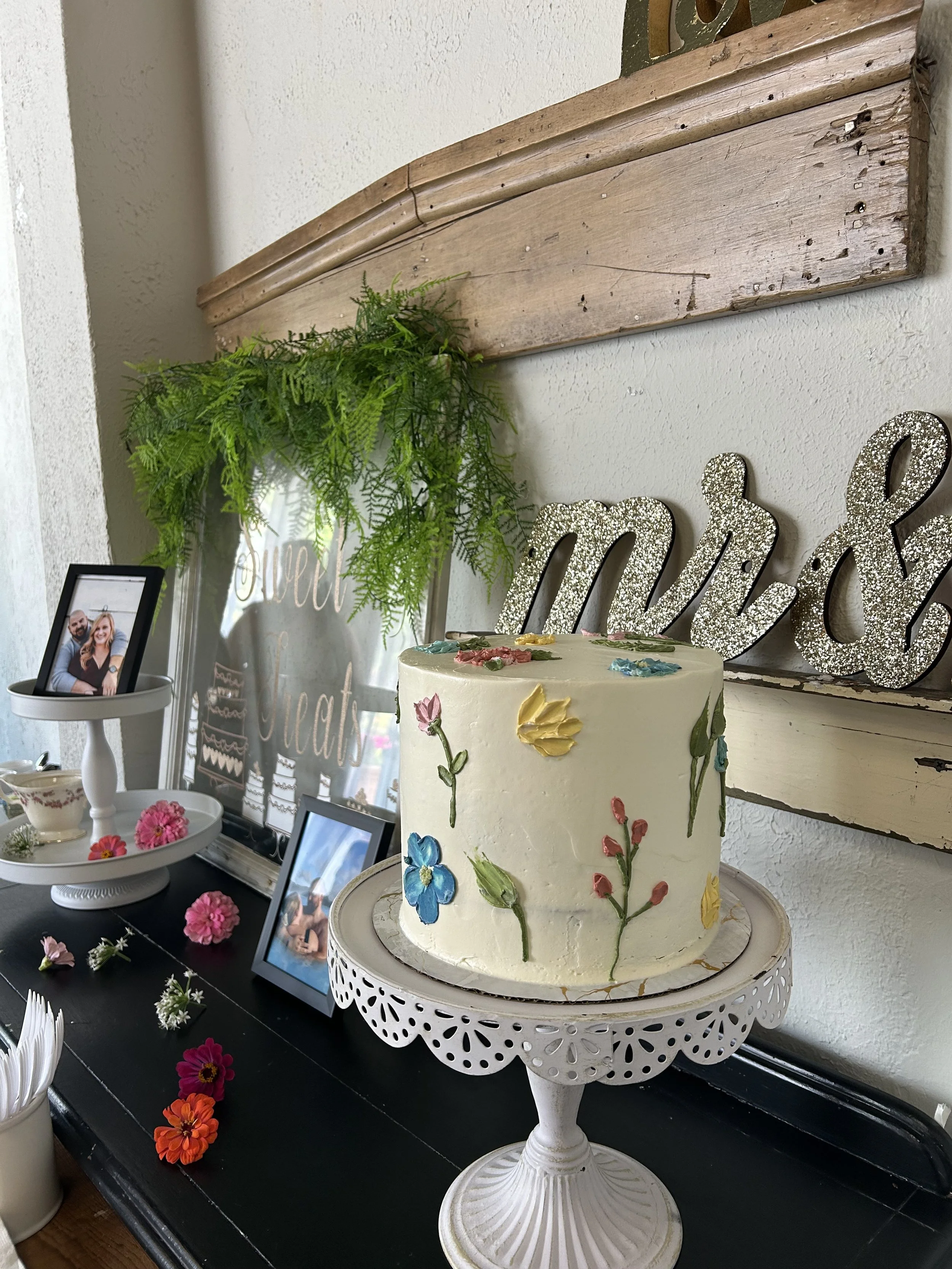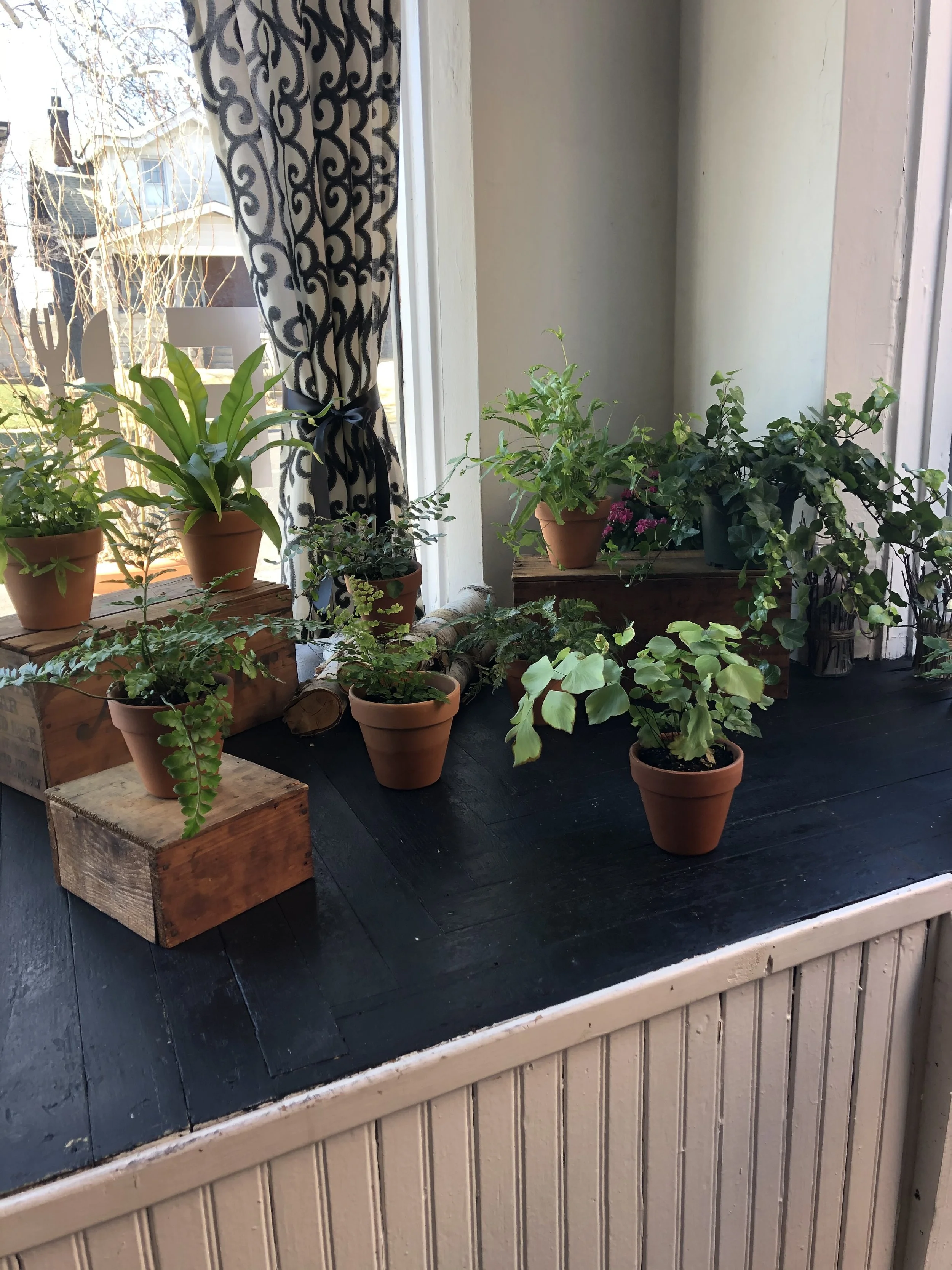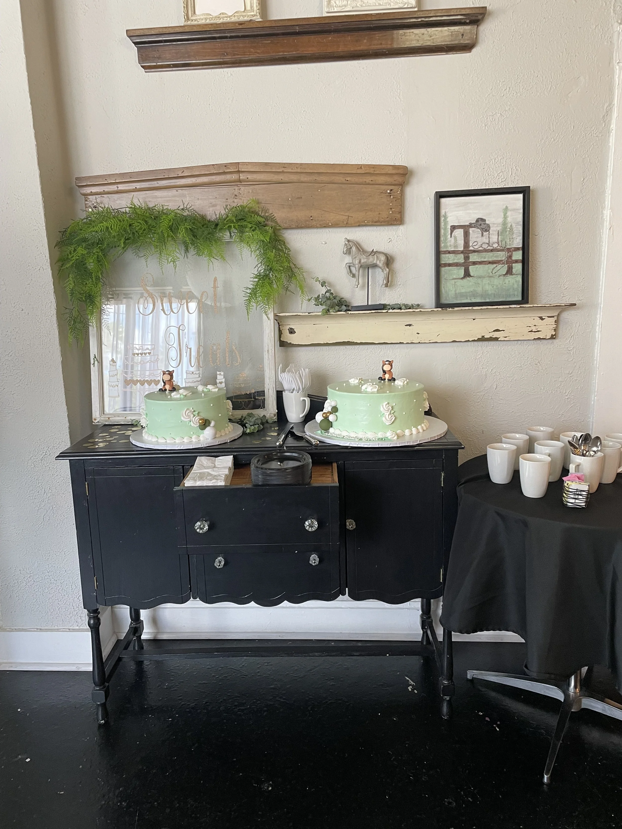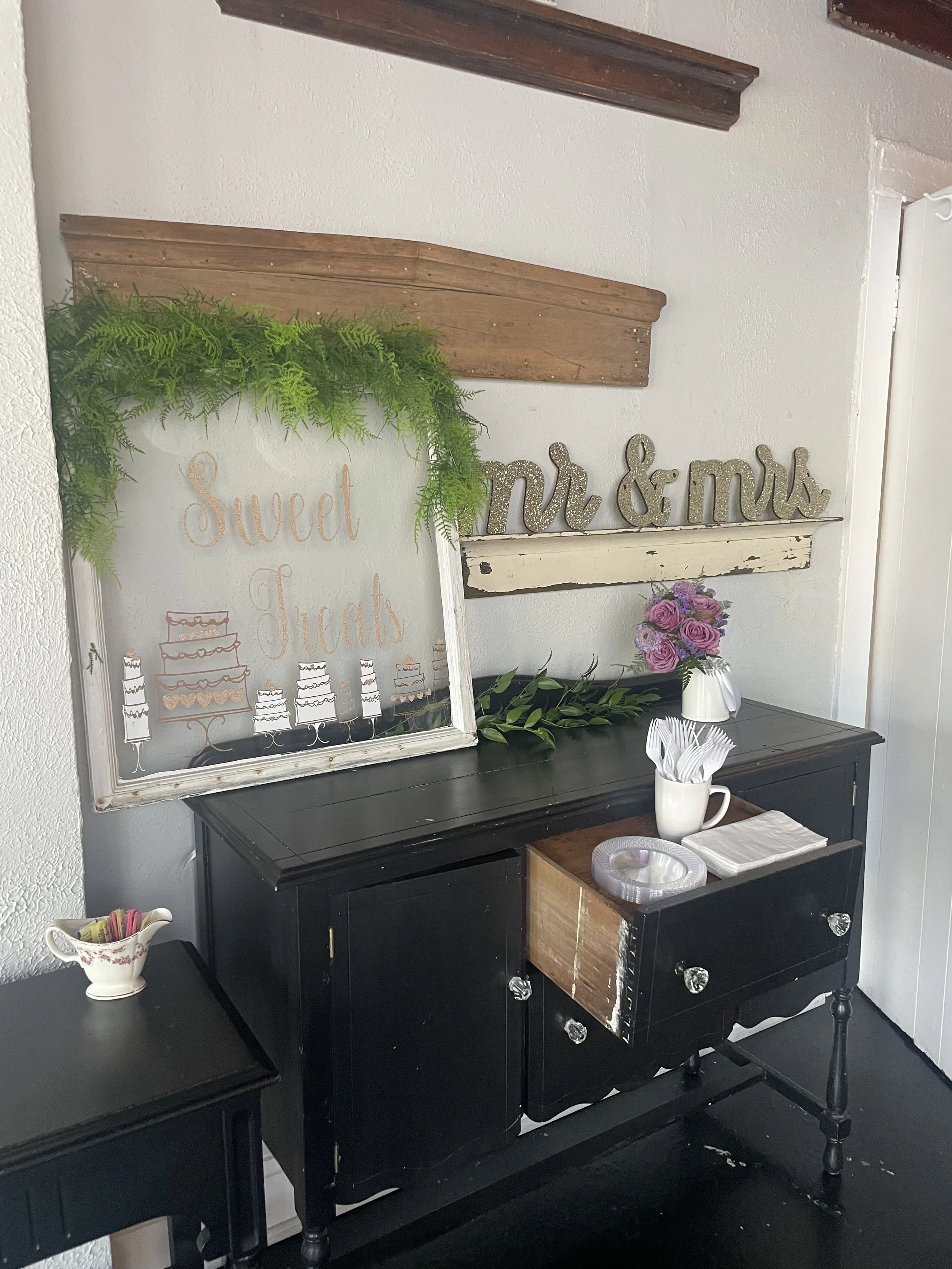 A dessert table with various baked goods on white pedestals, decorated with green foliage, and surrounded by wooden crates filled with flowers, plants, and decorative signs, set against a white wall.