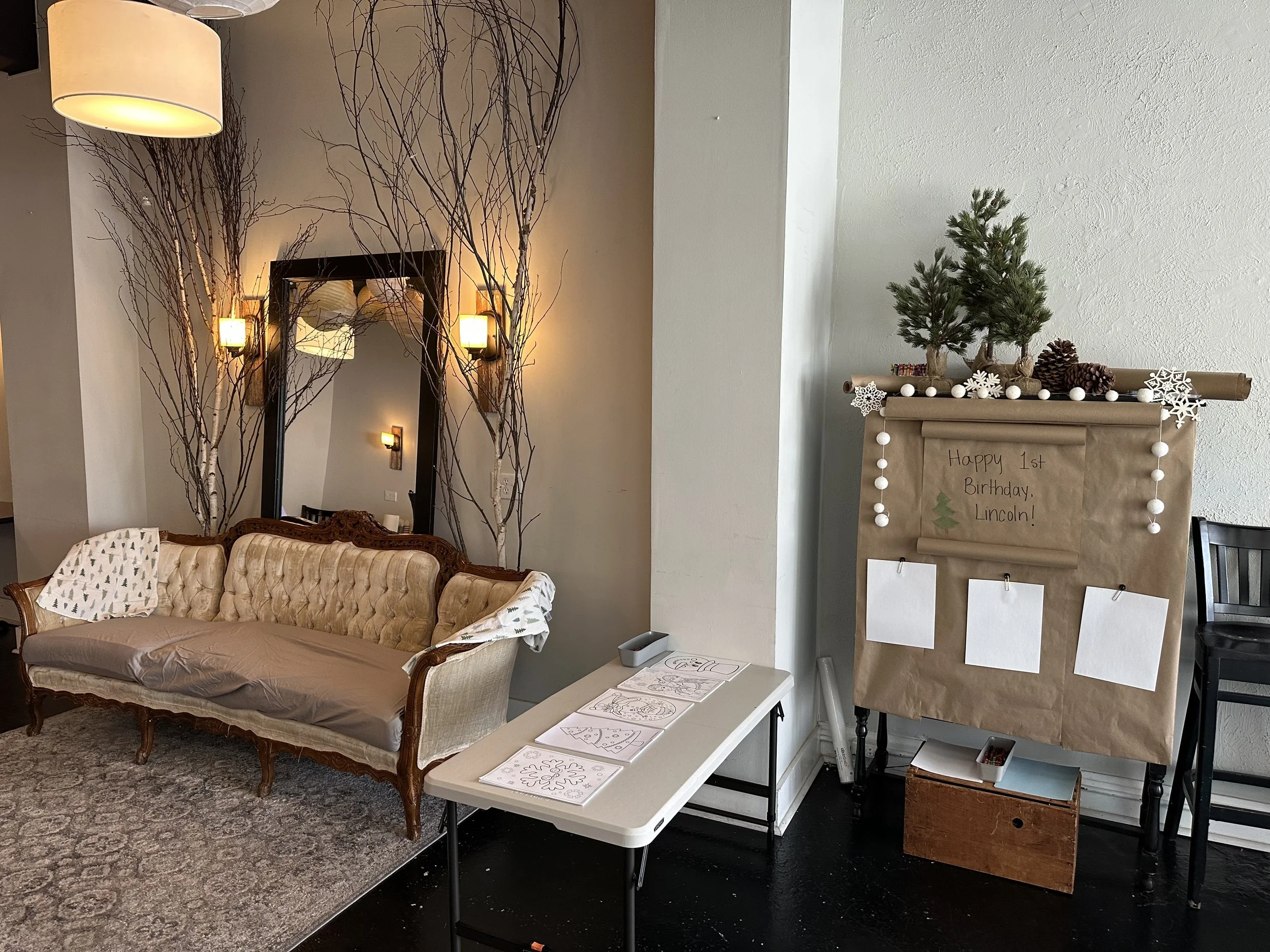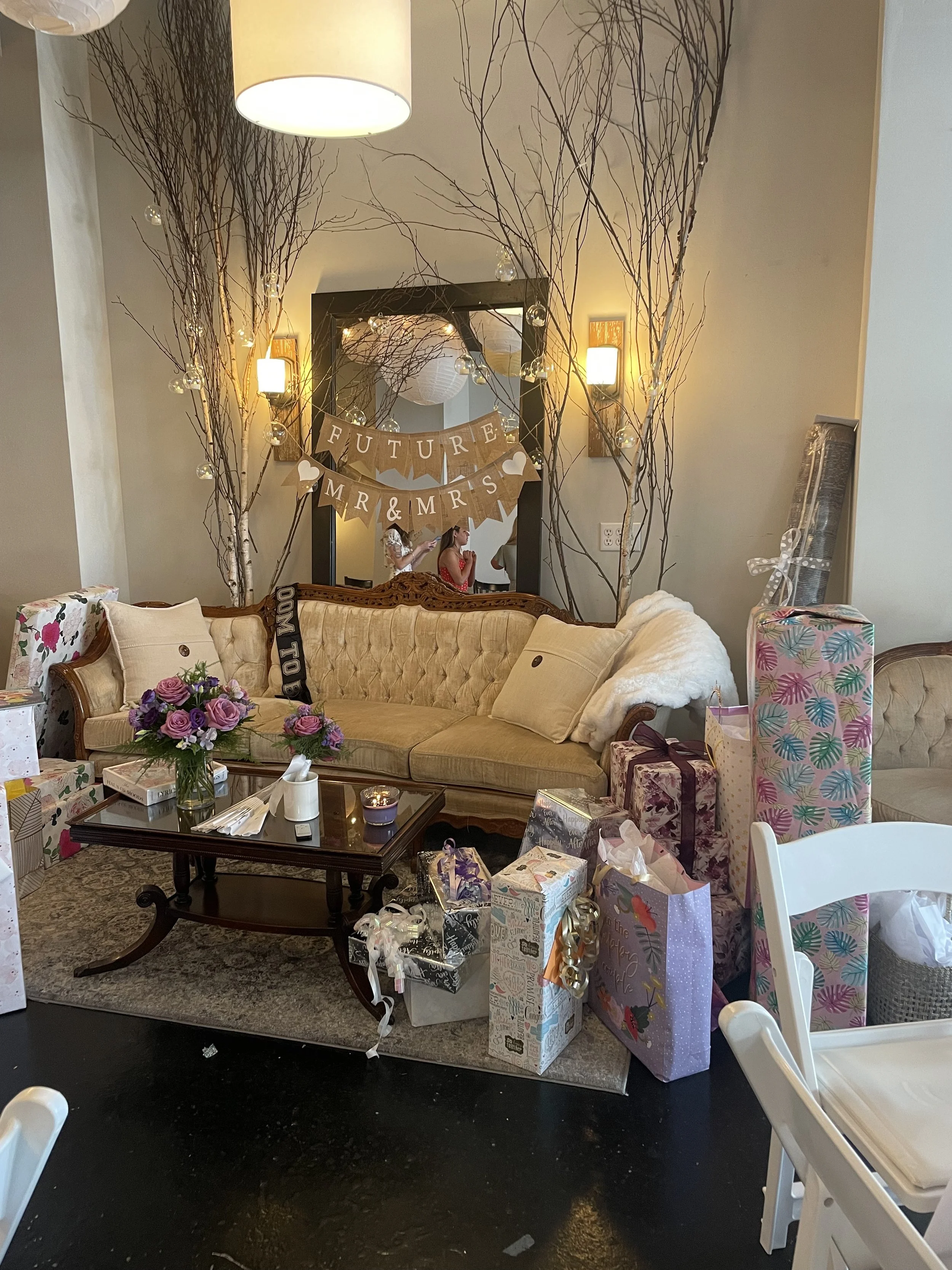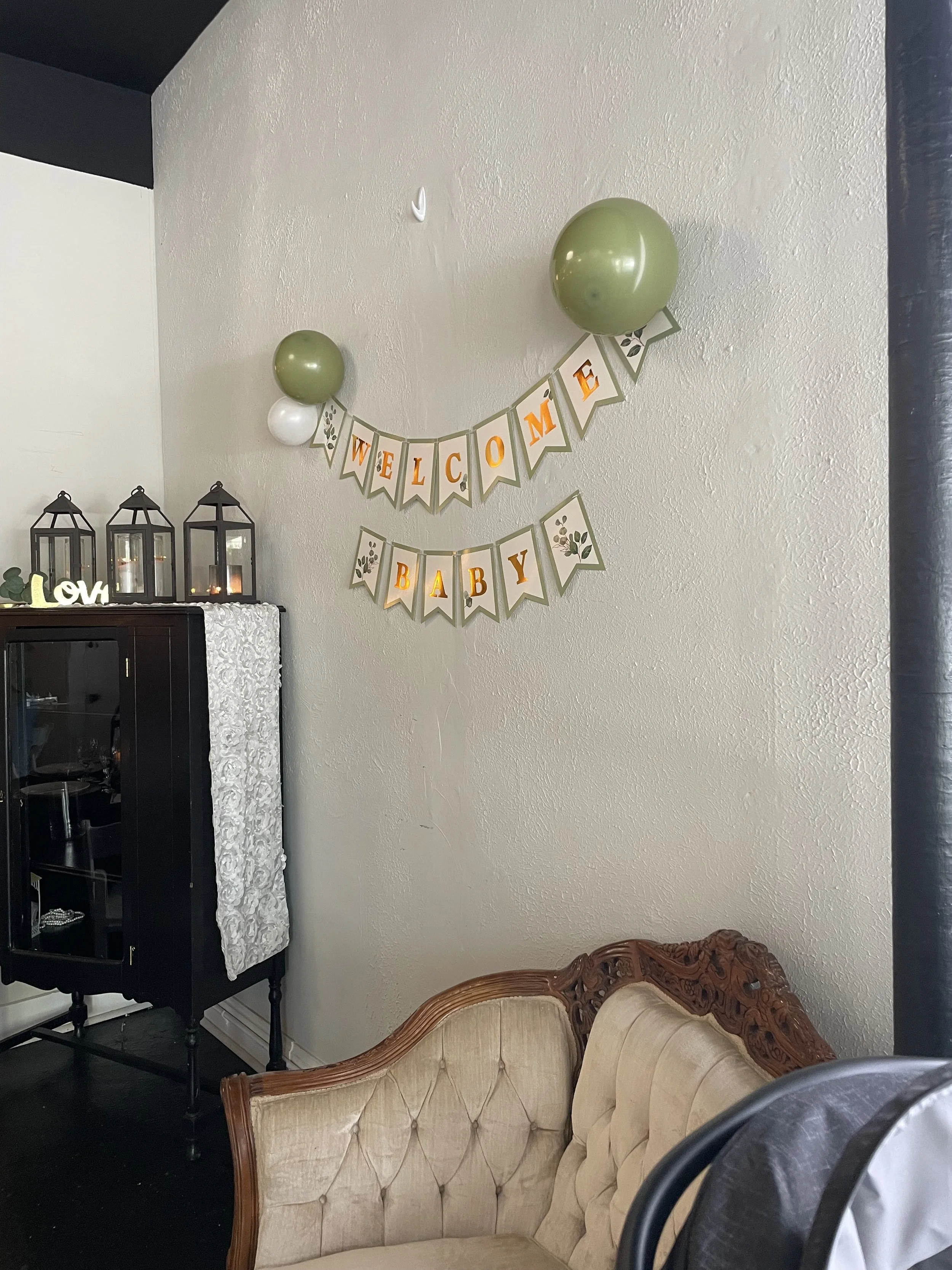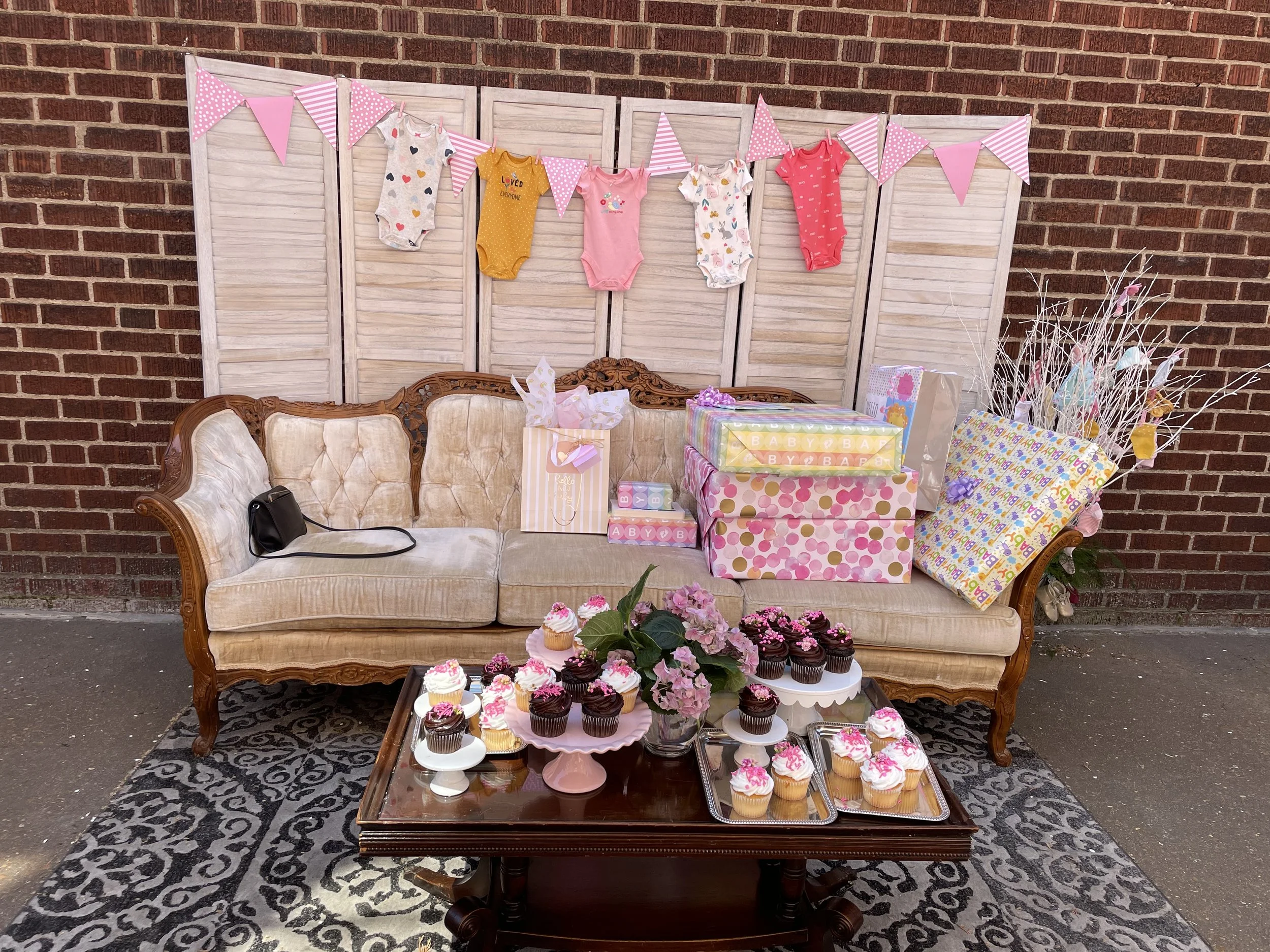 Decorative setup for a baby celebration, featuring a vintage beige sofa with a black purse on it, a coffee table with cupcakes and pink flowers, a backdrop with baby clothes and pink bunting, and wrapped gifts on the sofa and beside a white decorativ