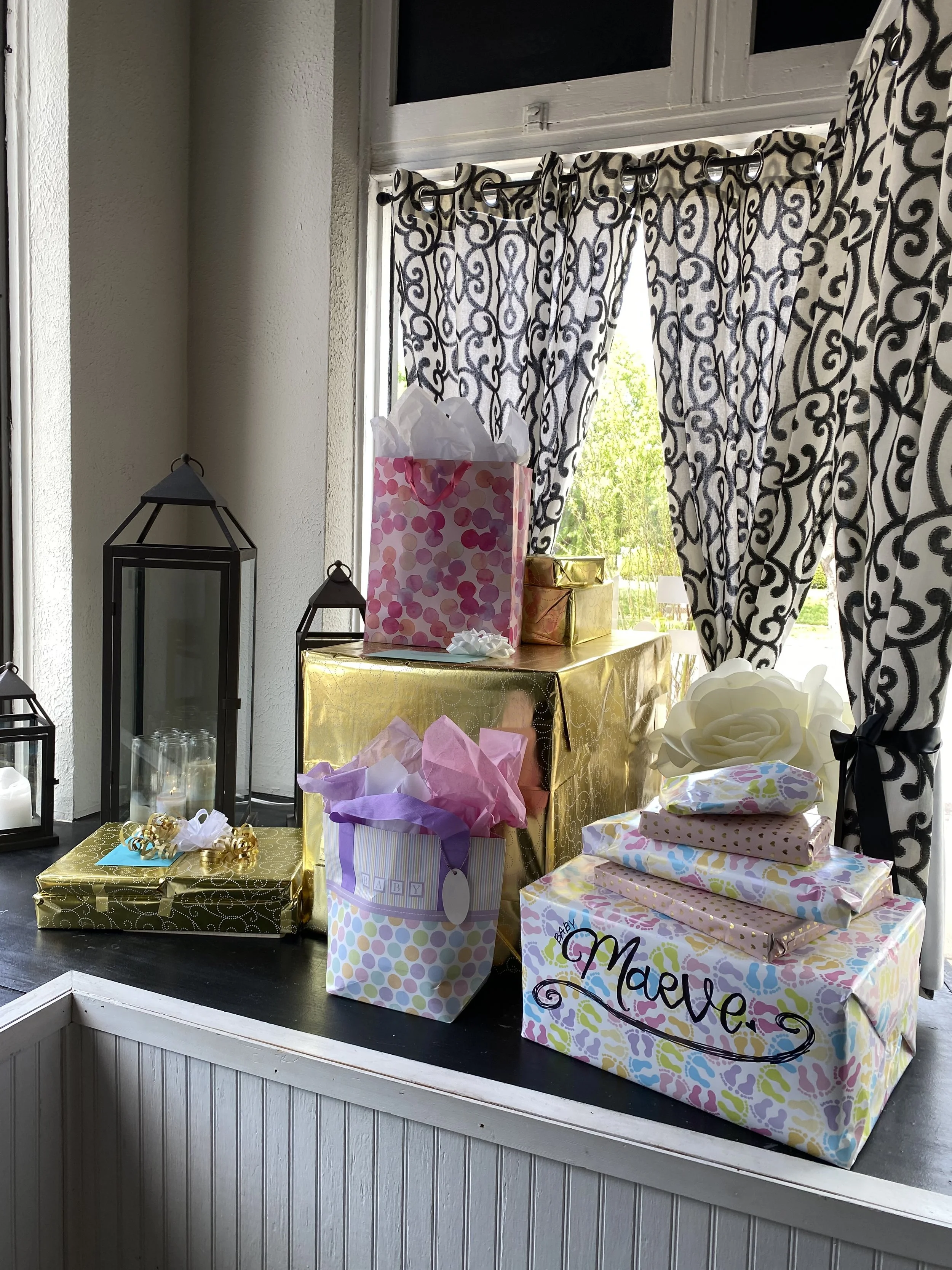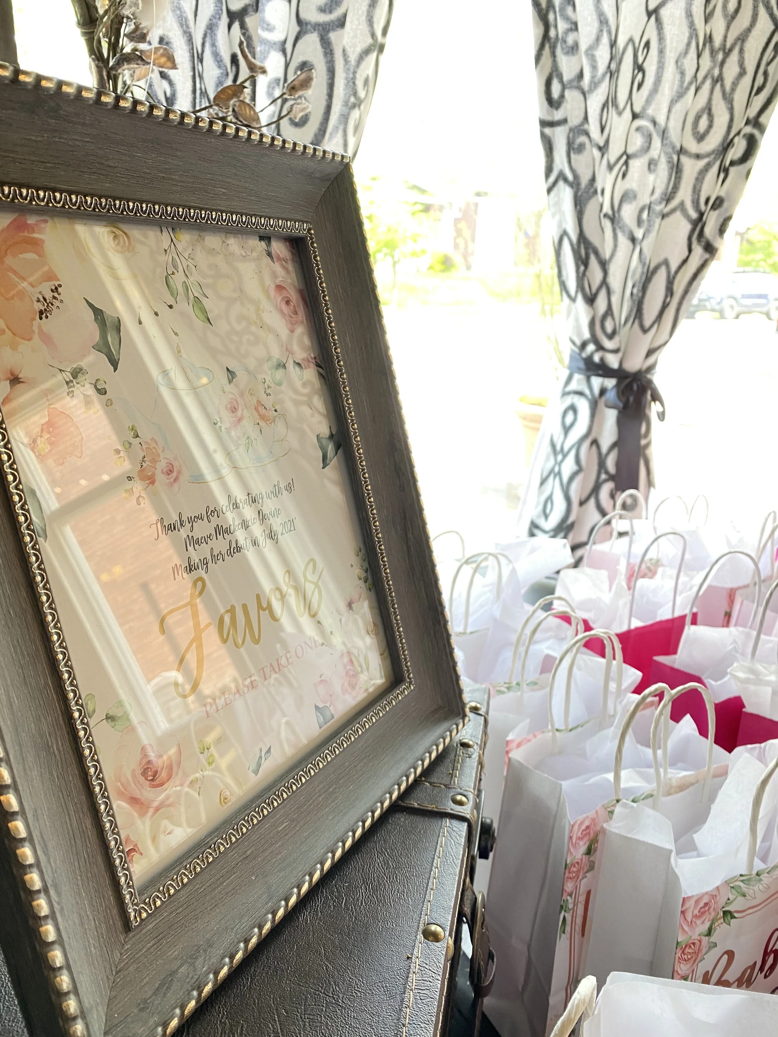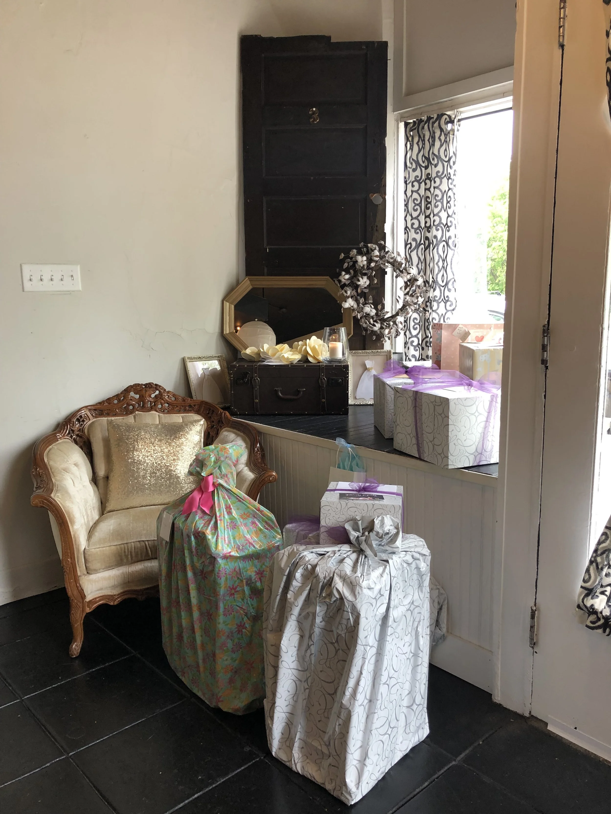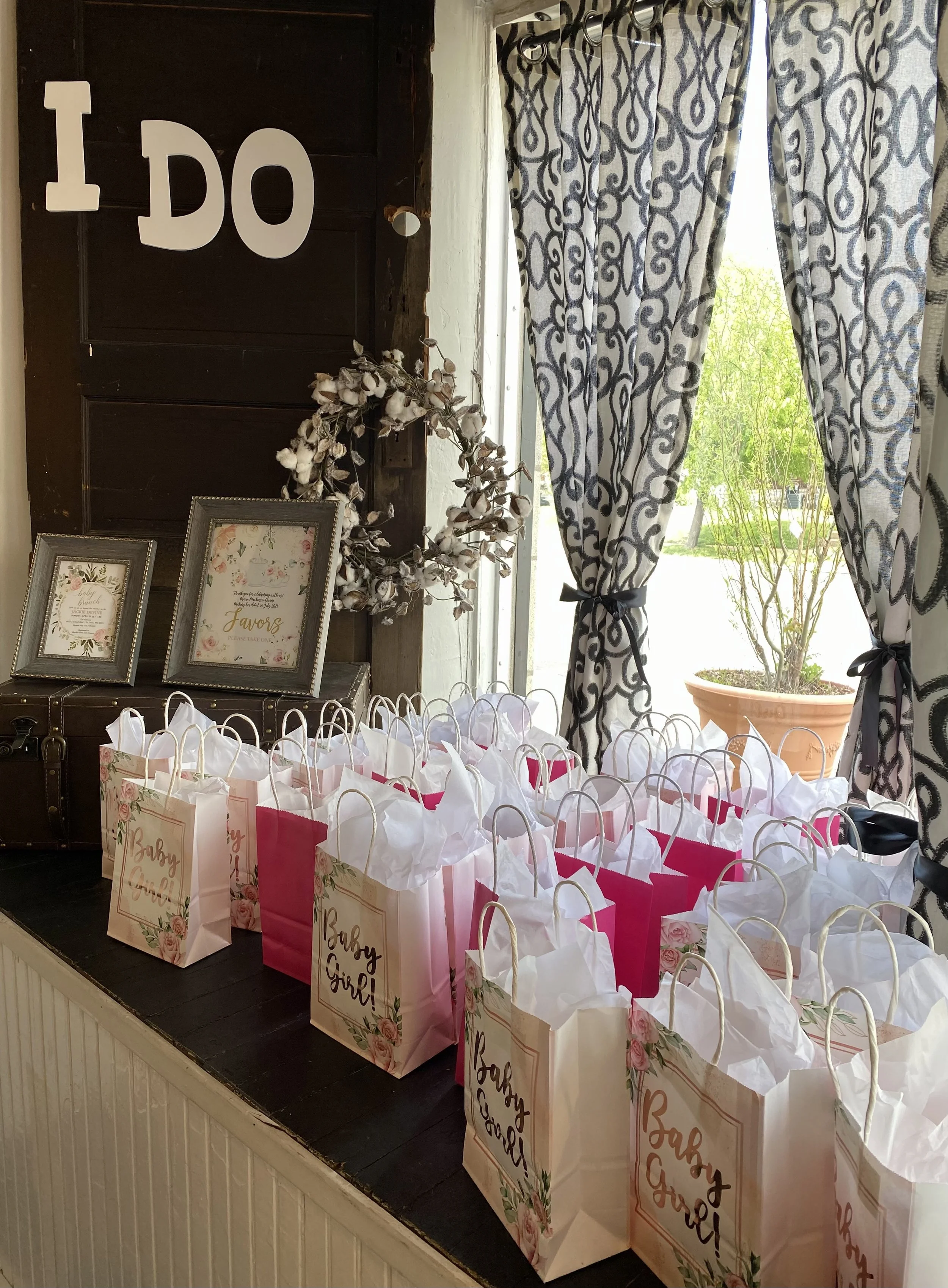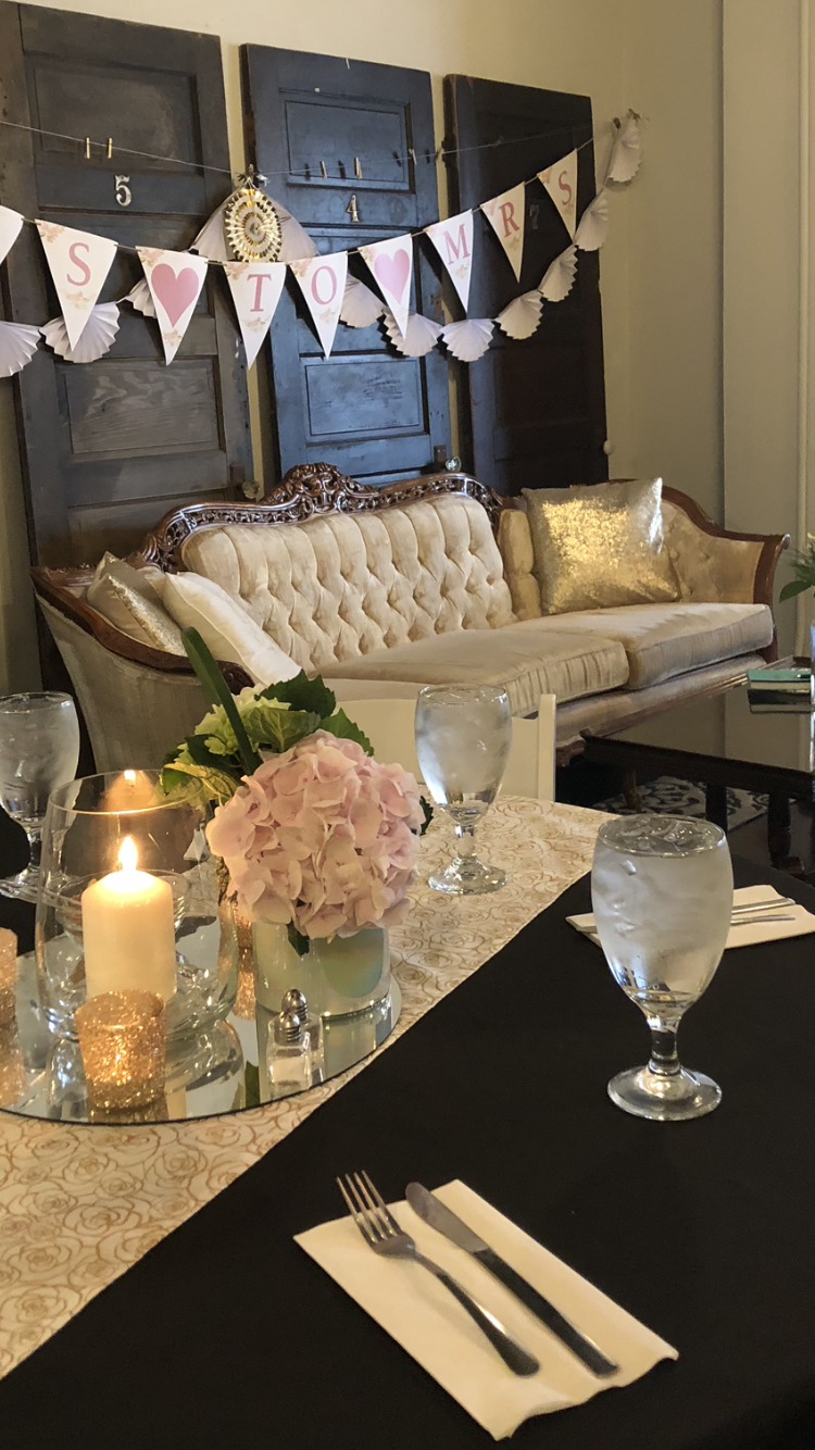 Decorative setup for a baby celebration, featuring a vintage beige sofa with a black purse on it, a coffee table with cupcakes and pink flowers, a backdrop with baby clothes and pink bunting, and wrapped gifts on the sofa and beside a white decorativ