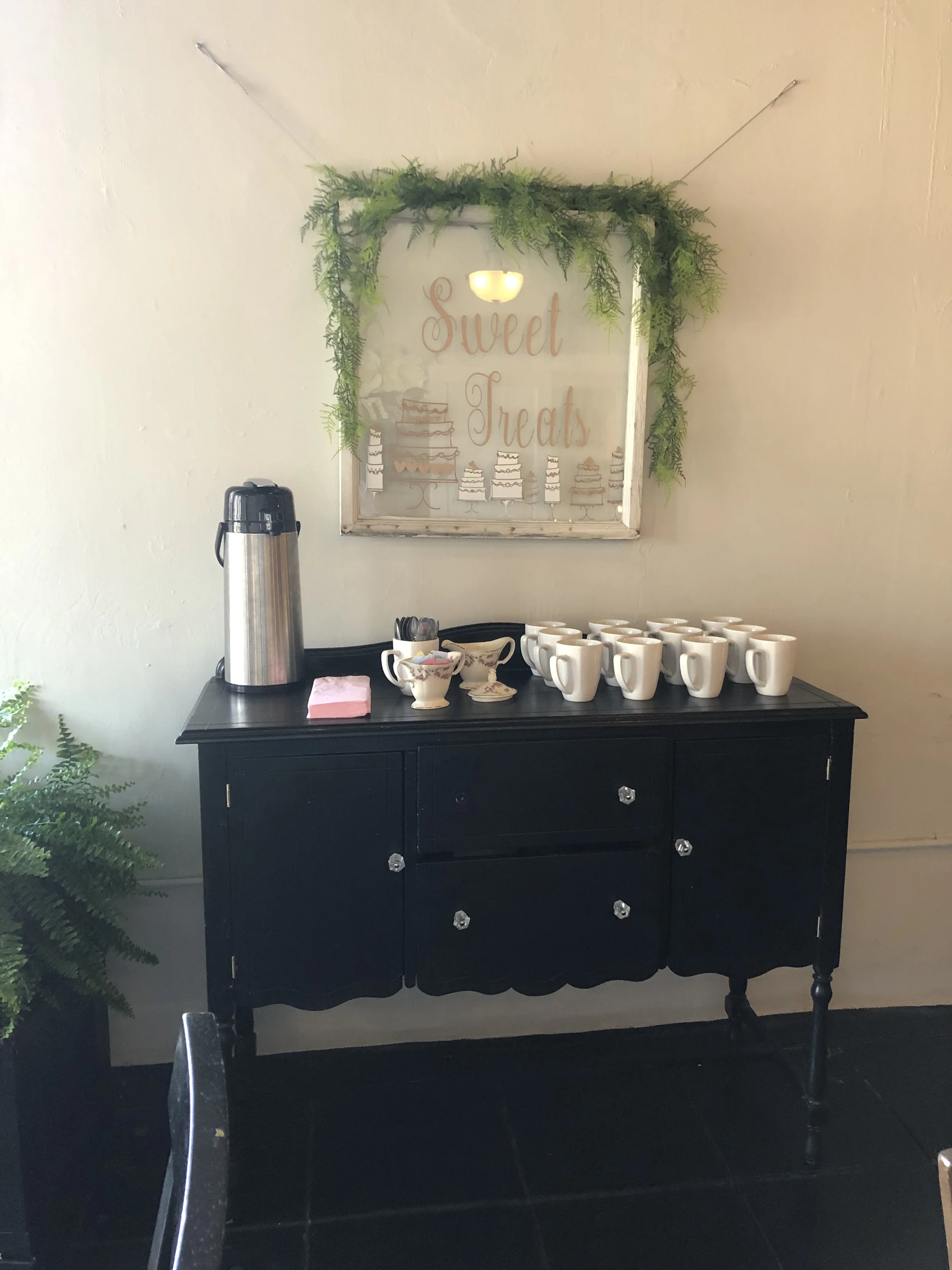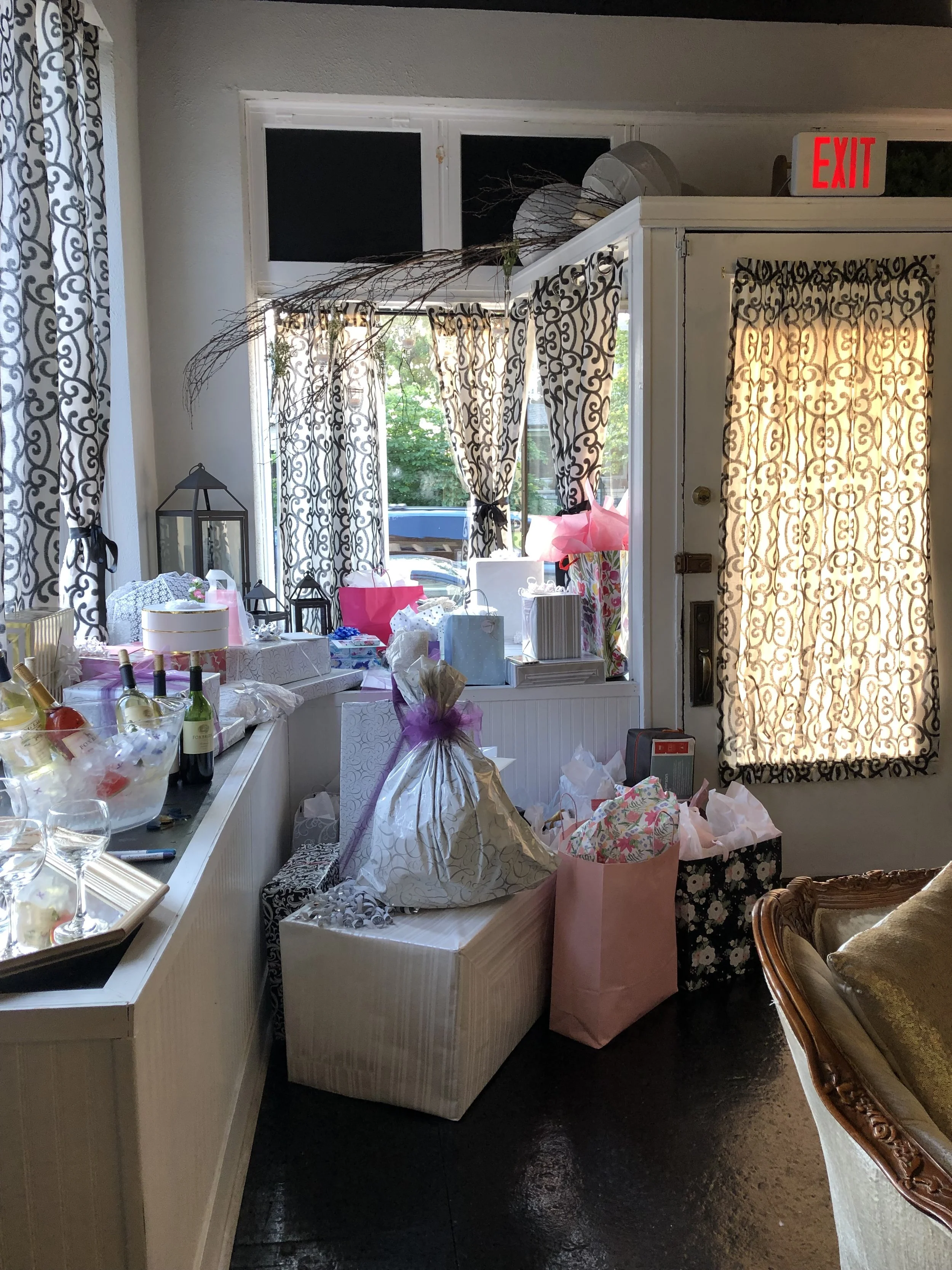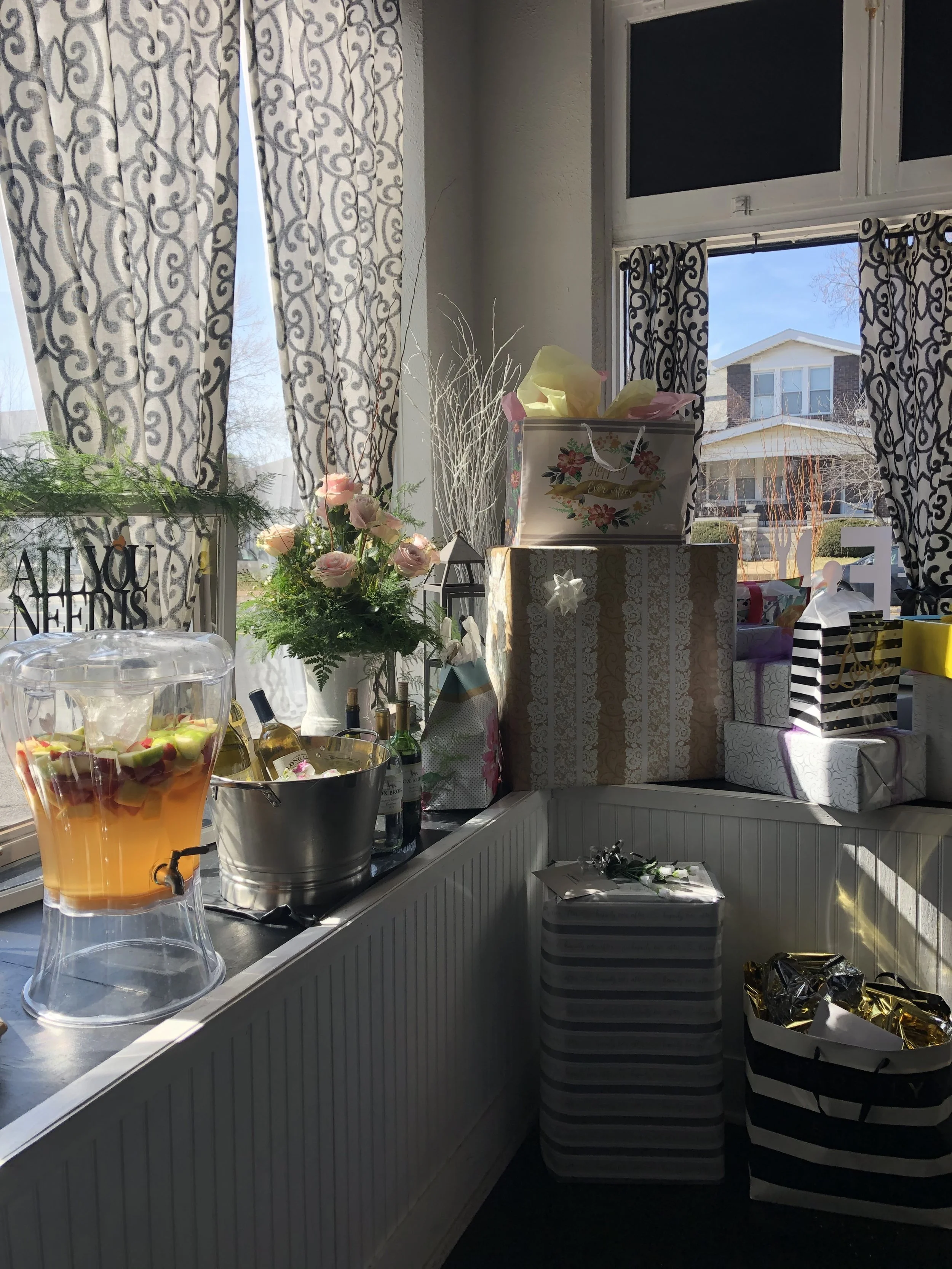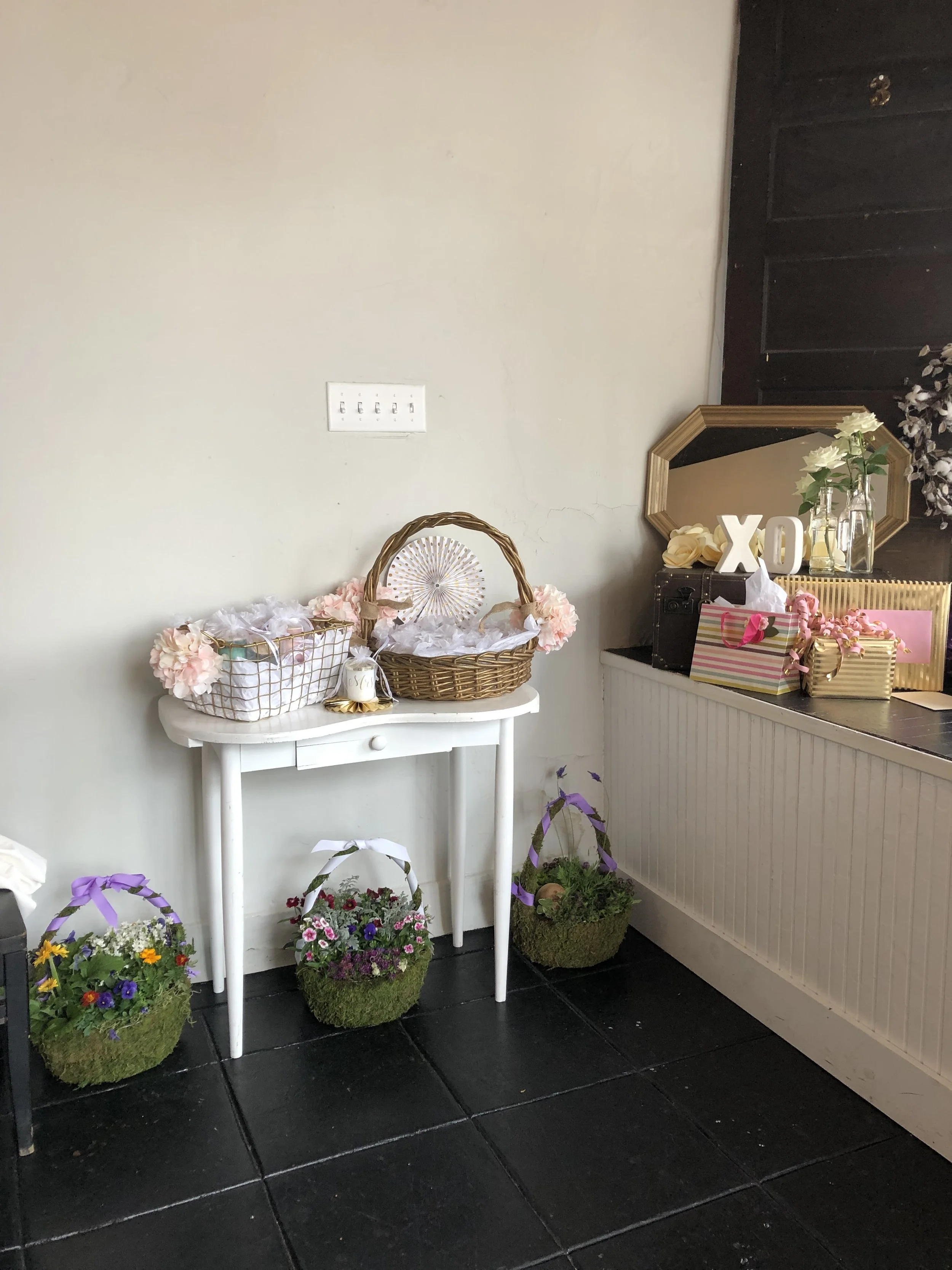 Decorative setup for a baby celebration, featuring a vintage beige sofa with a black purse on it, a coffee table with cupcakes and pink flowers, a backdrop with baby clothes and pink bunting, and wrapped gifts on the sofa and beside a white decorativ