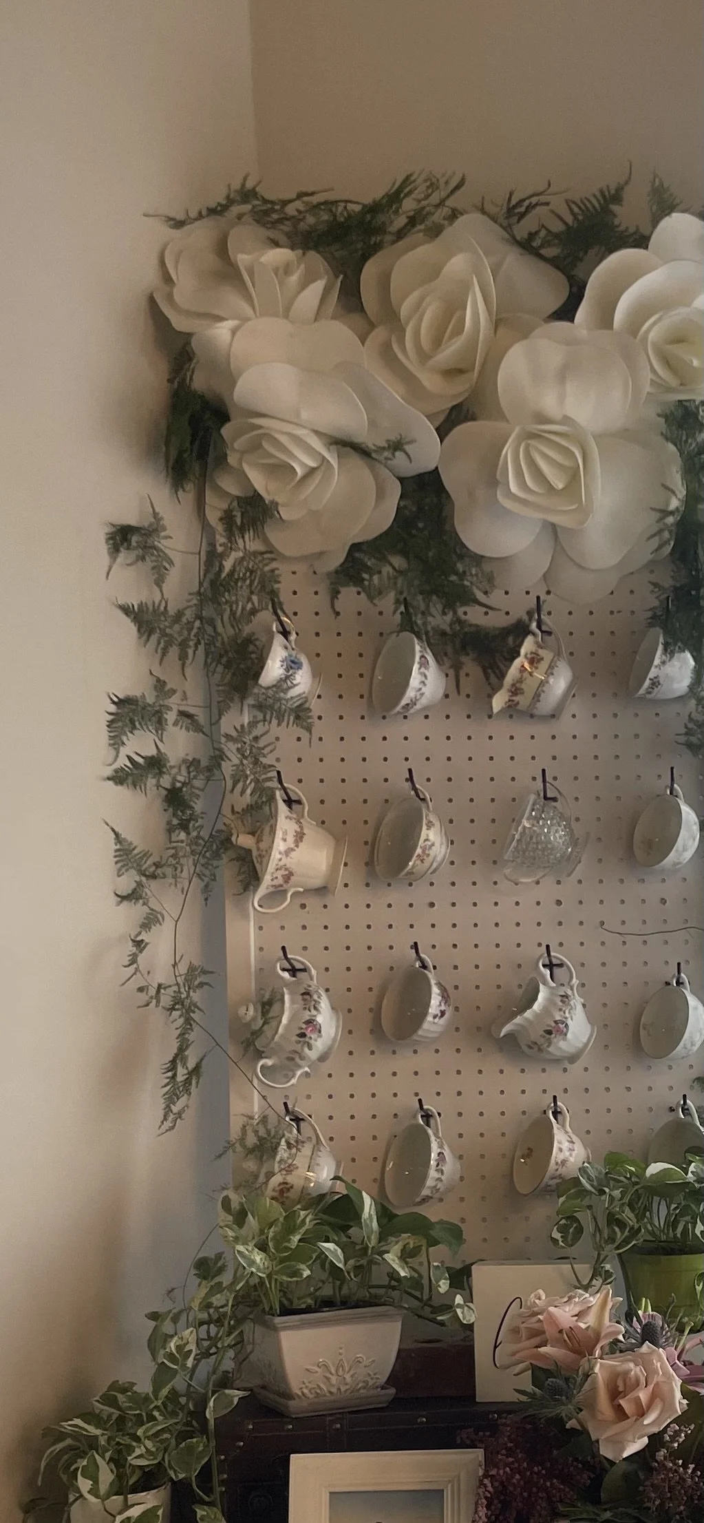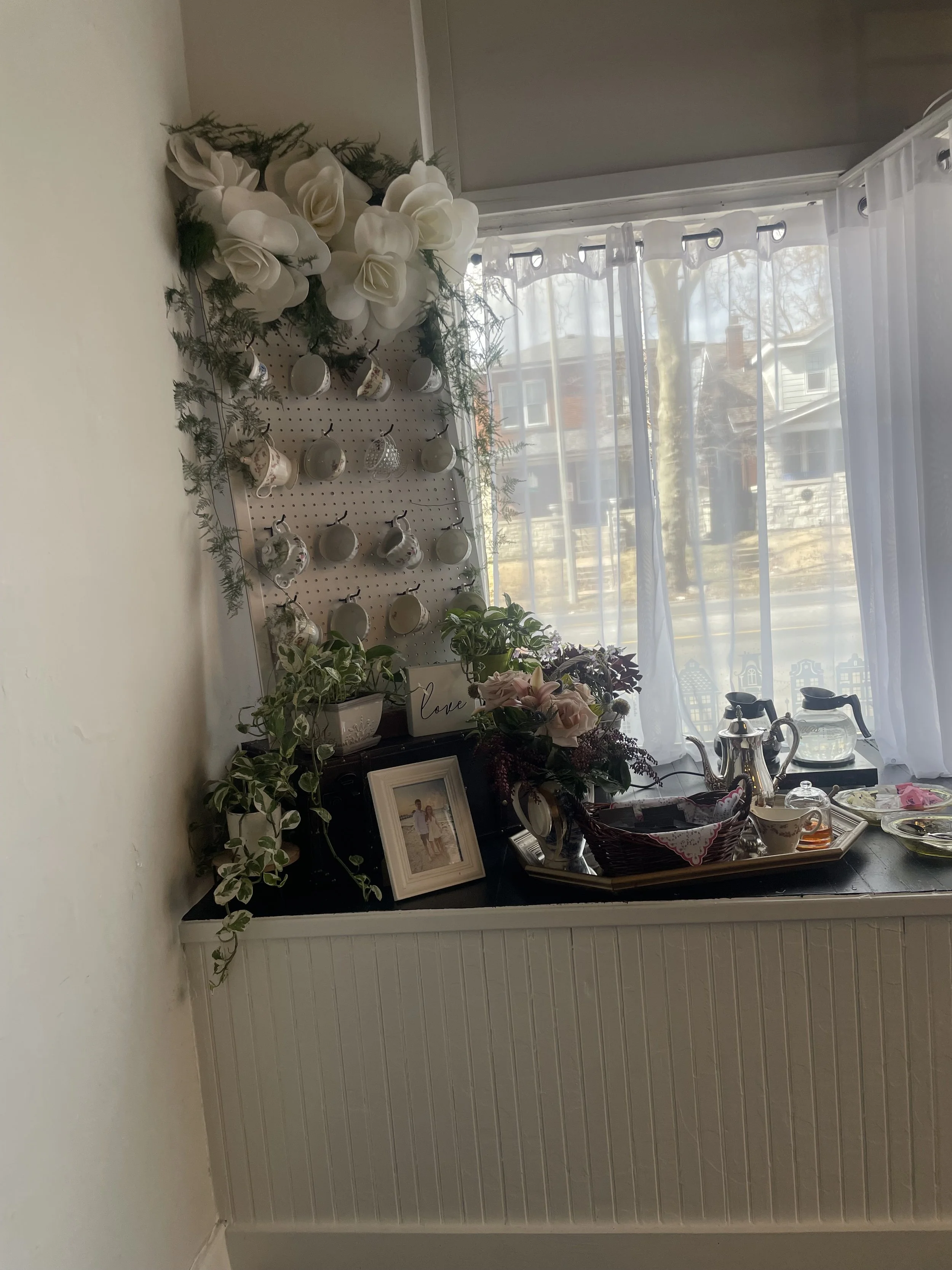 A cozy corner with white curtains and string lights, decorated with various vases and frames of colorful flowers on a white paneled window sill, with potted plants and greenery in the background.