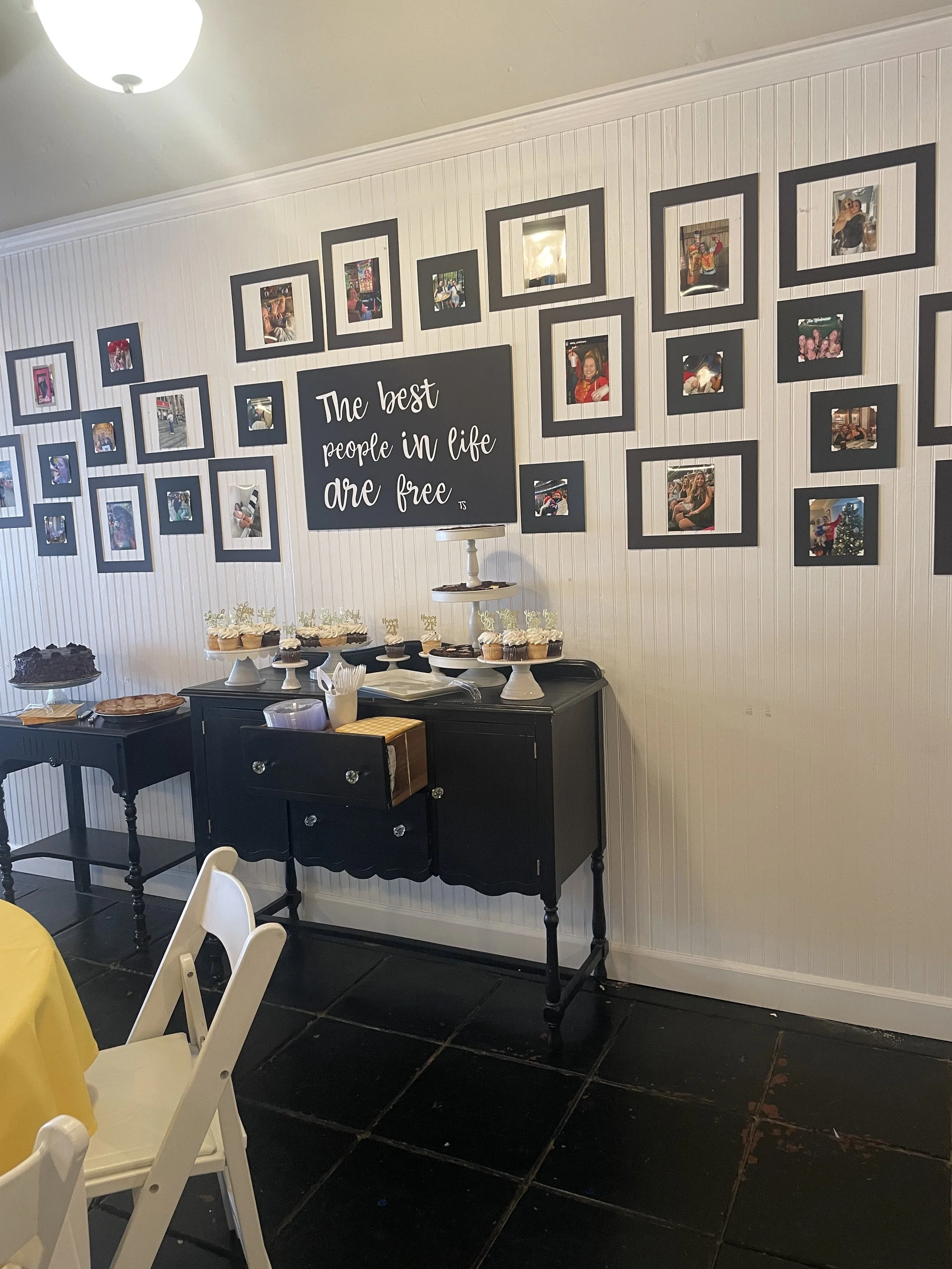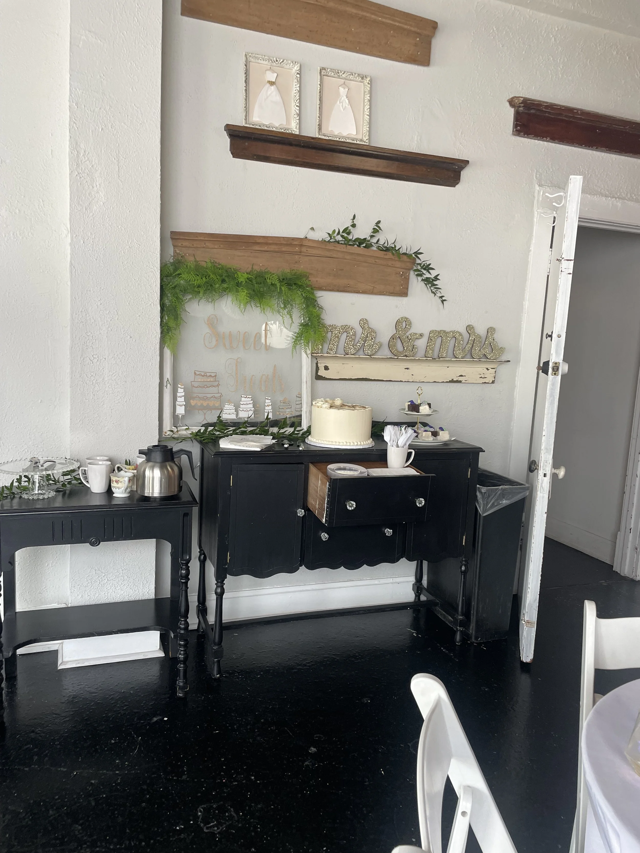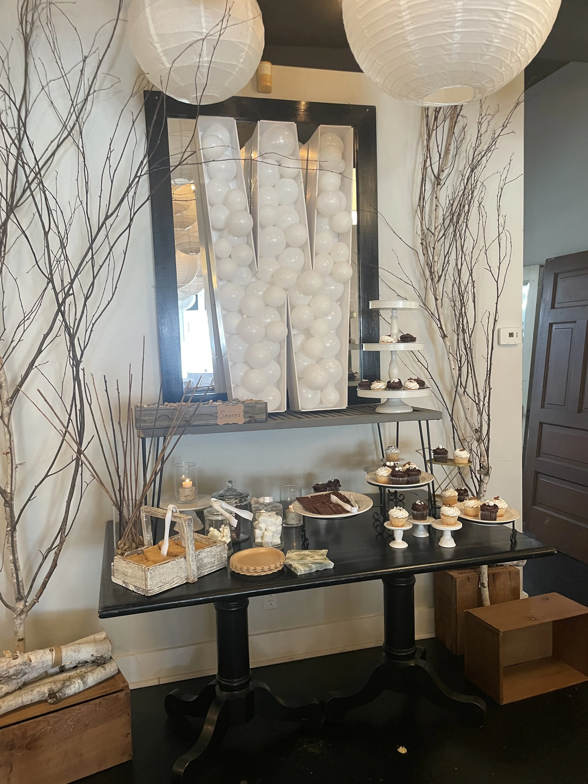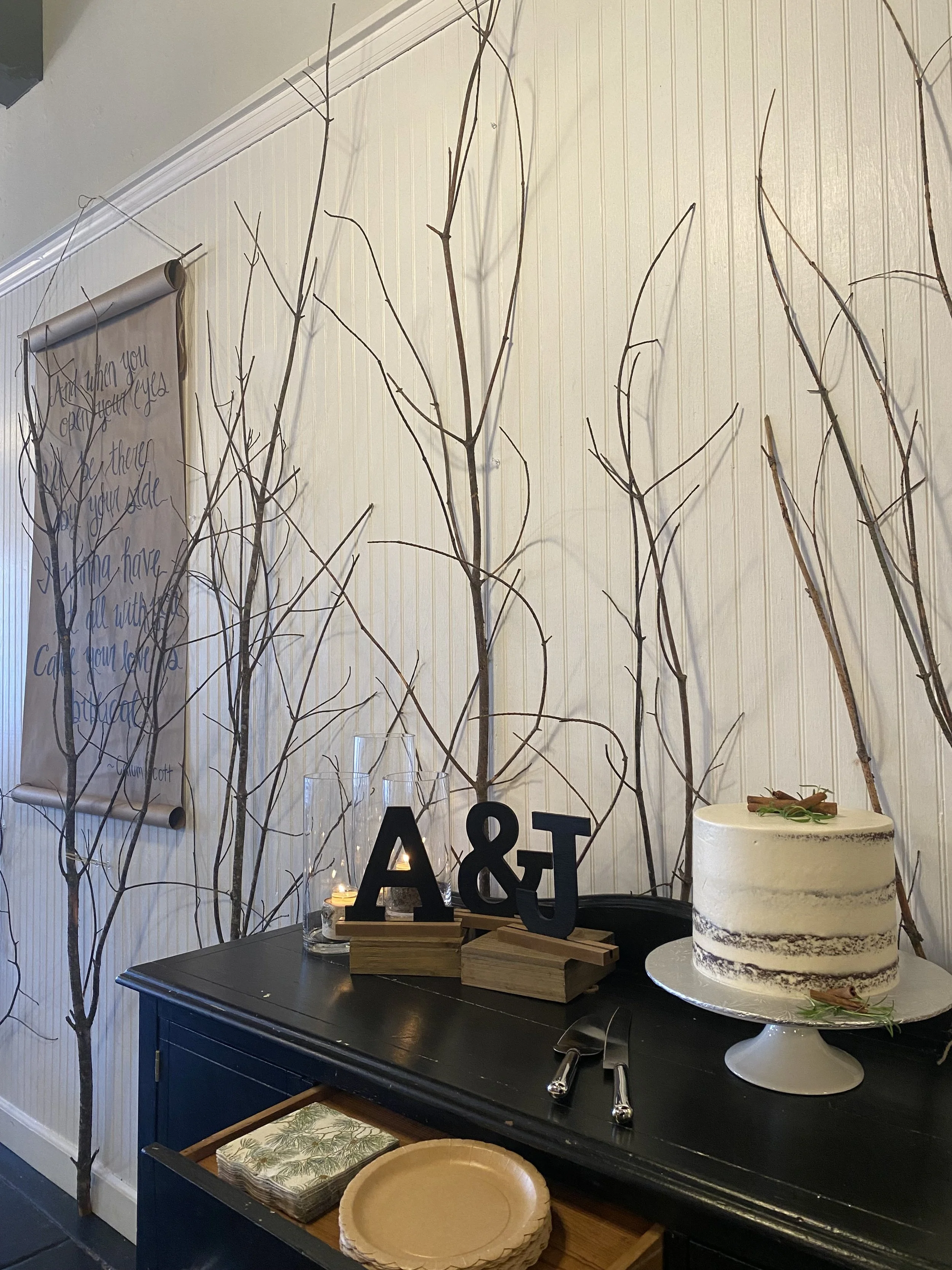 A decorated table featuring a white semi-naked cake, black and wooden table decor with the letters A and J, and bare decorative branches against a white paneled wall.