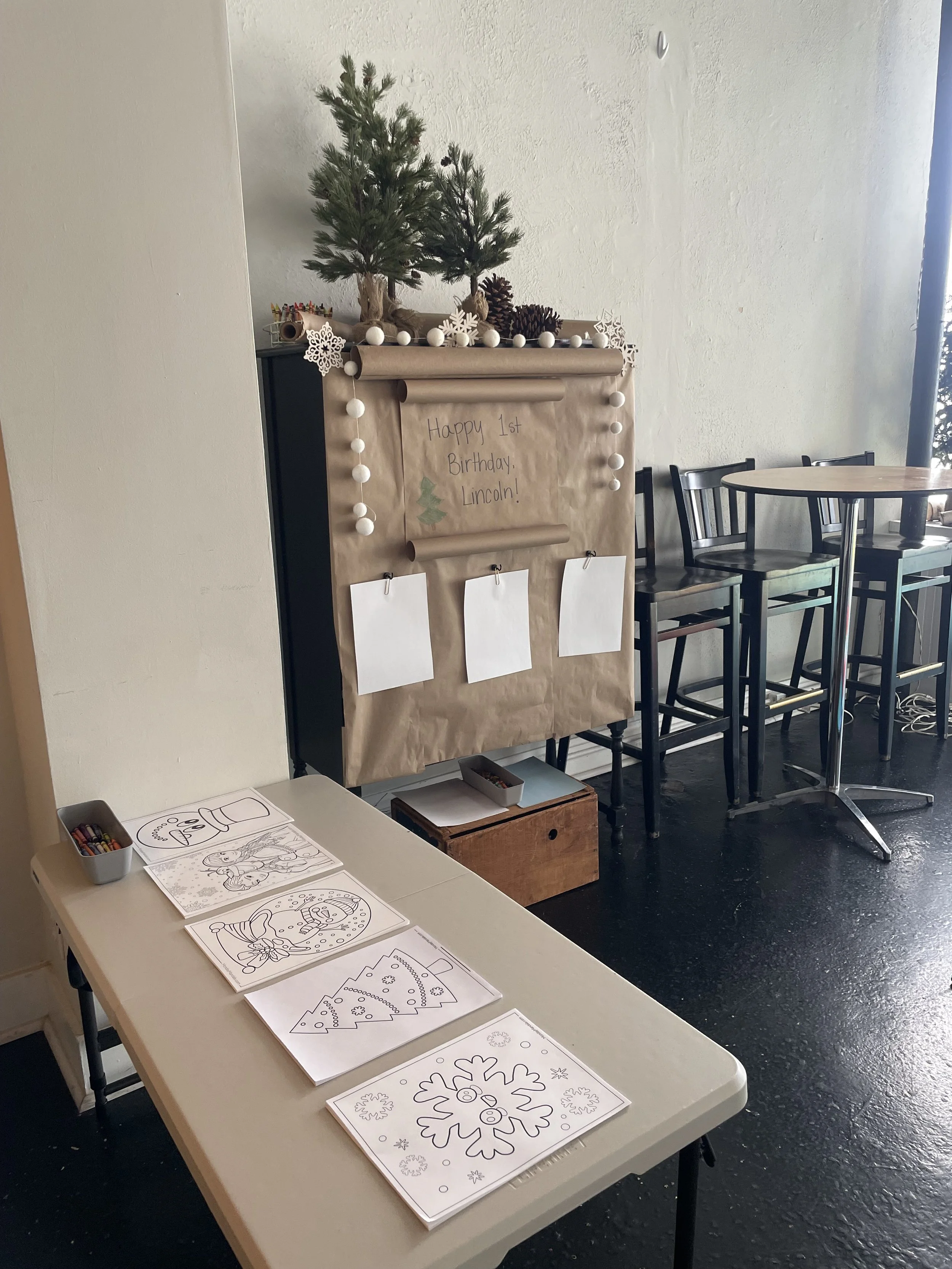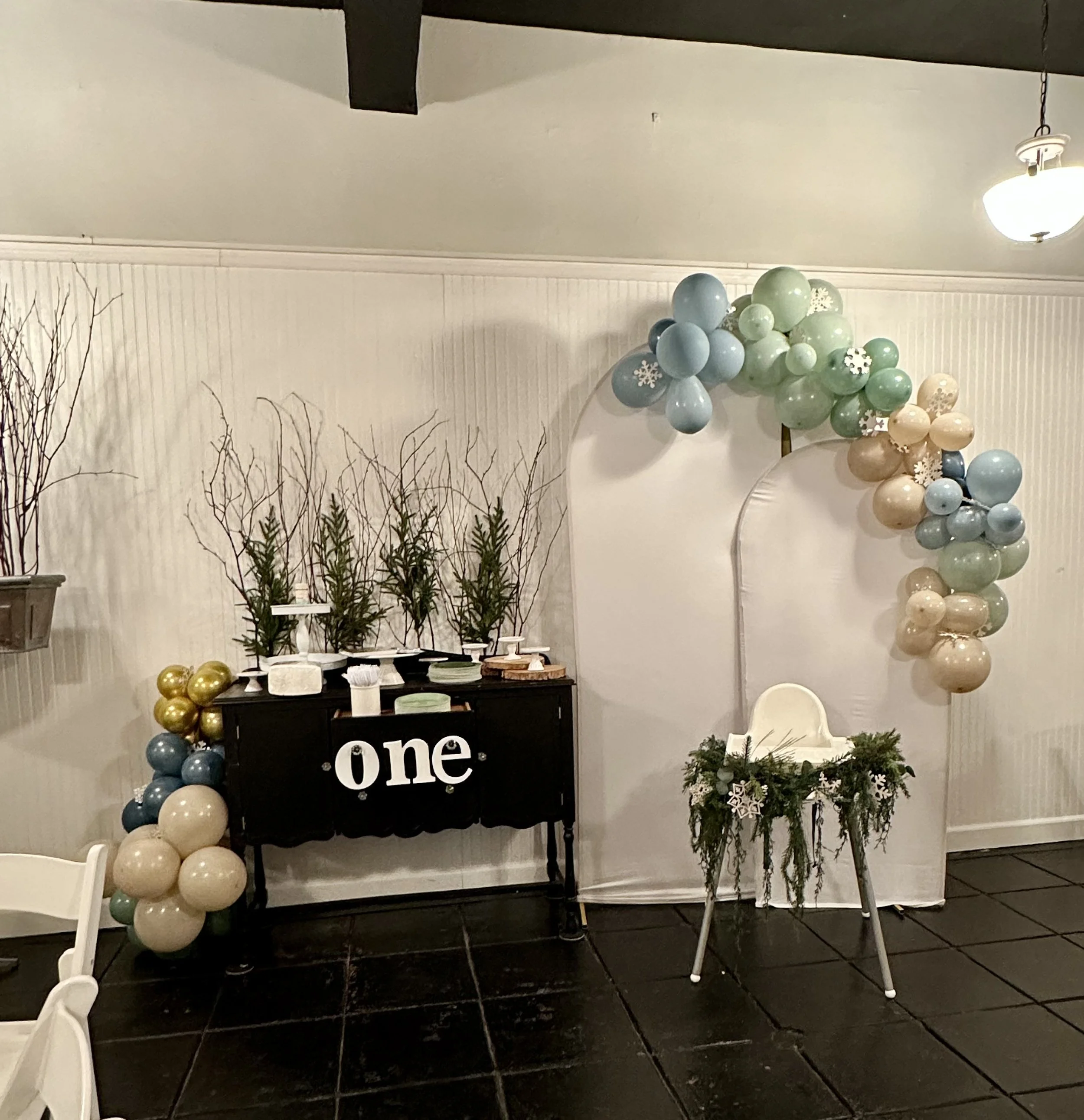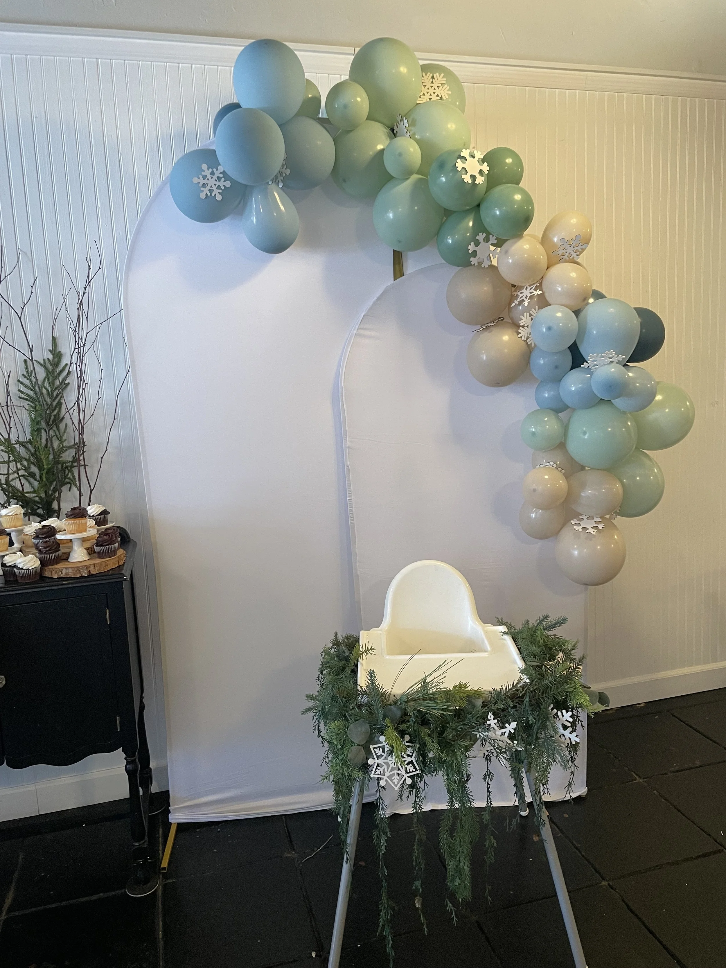 Decorative setup with a white backdrop, balloon garland in pastel colors, and a high chair with greenery and snowflake ornaments for a child's first birthday celebration.