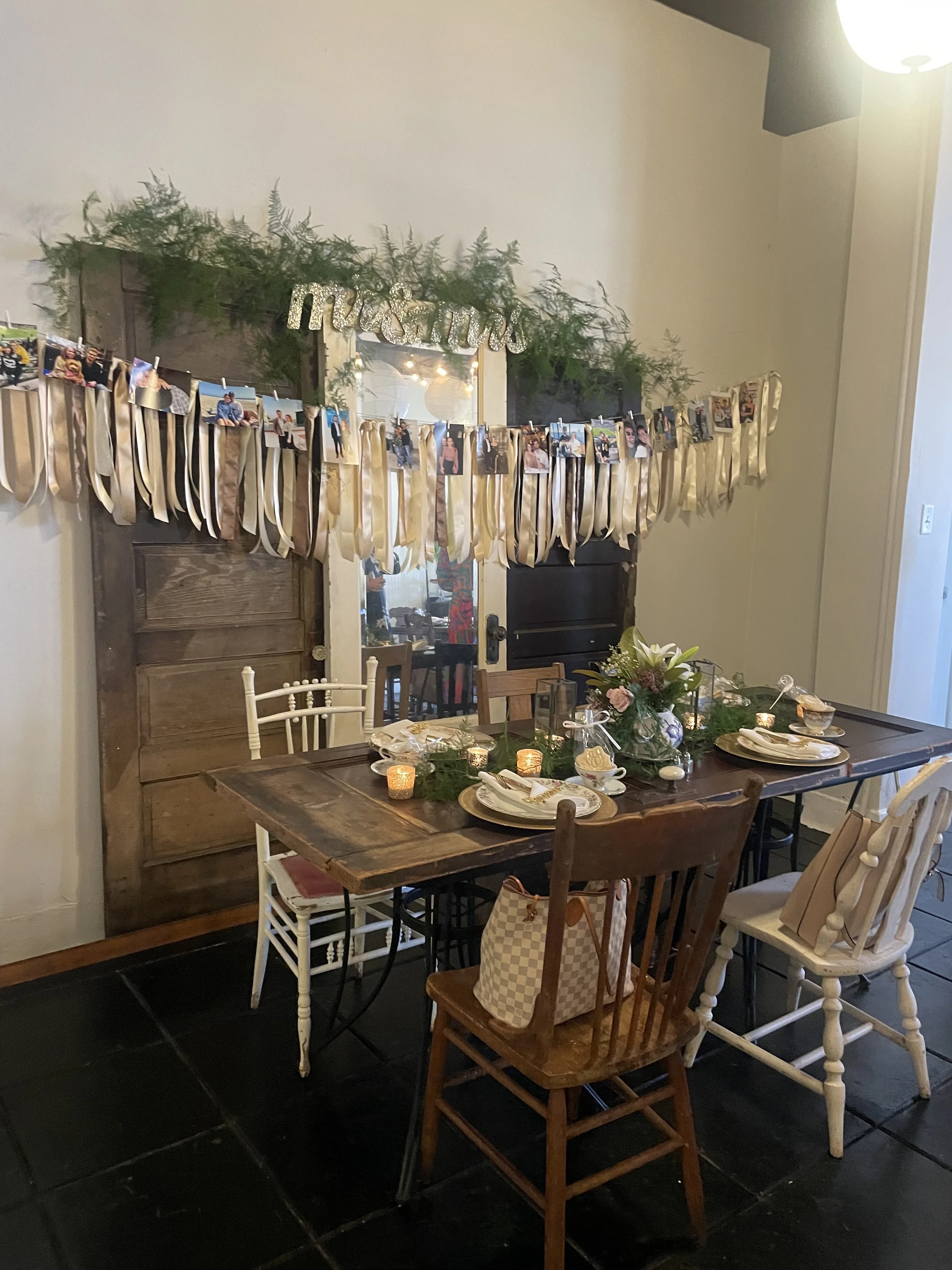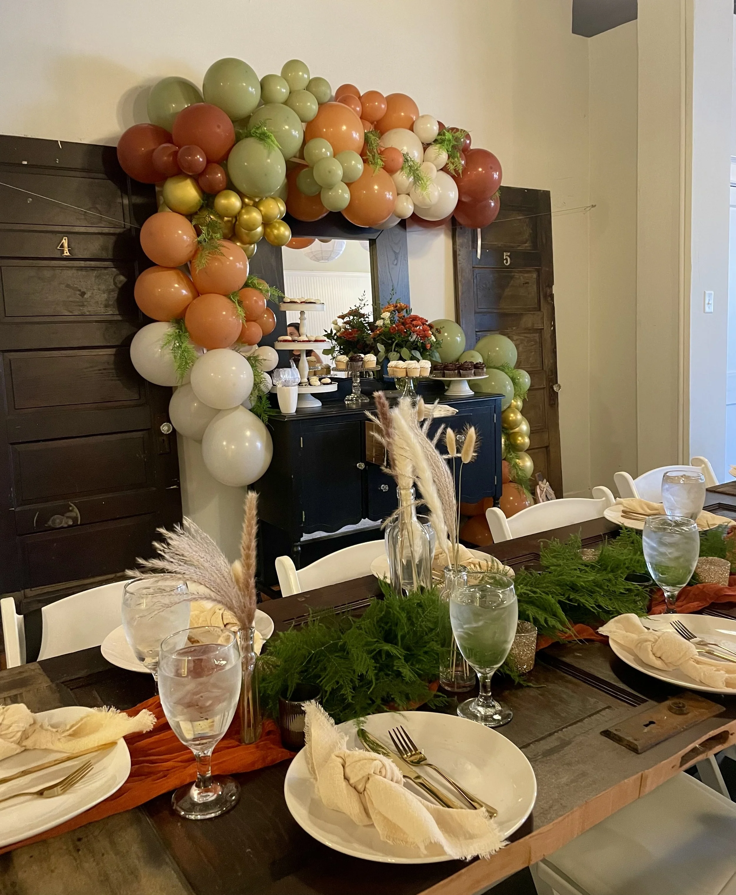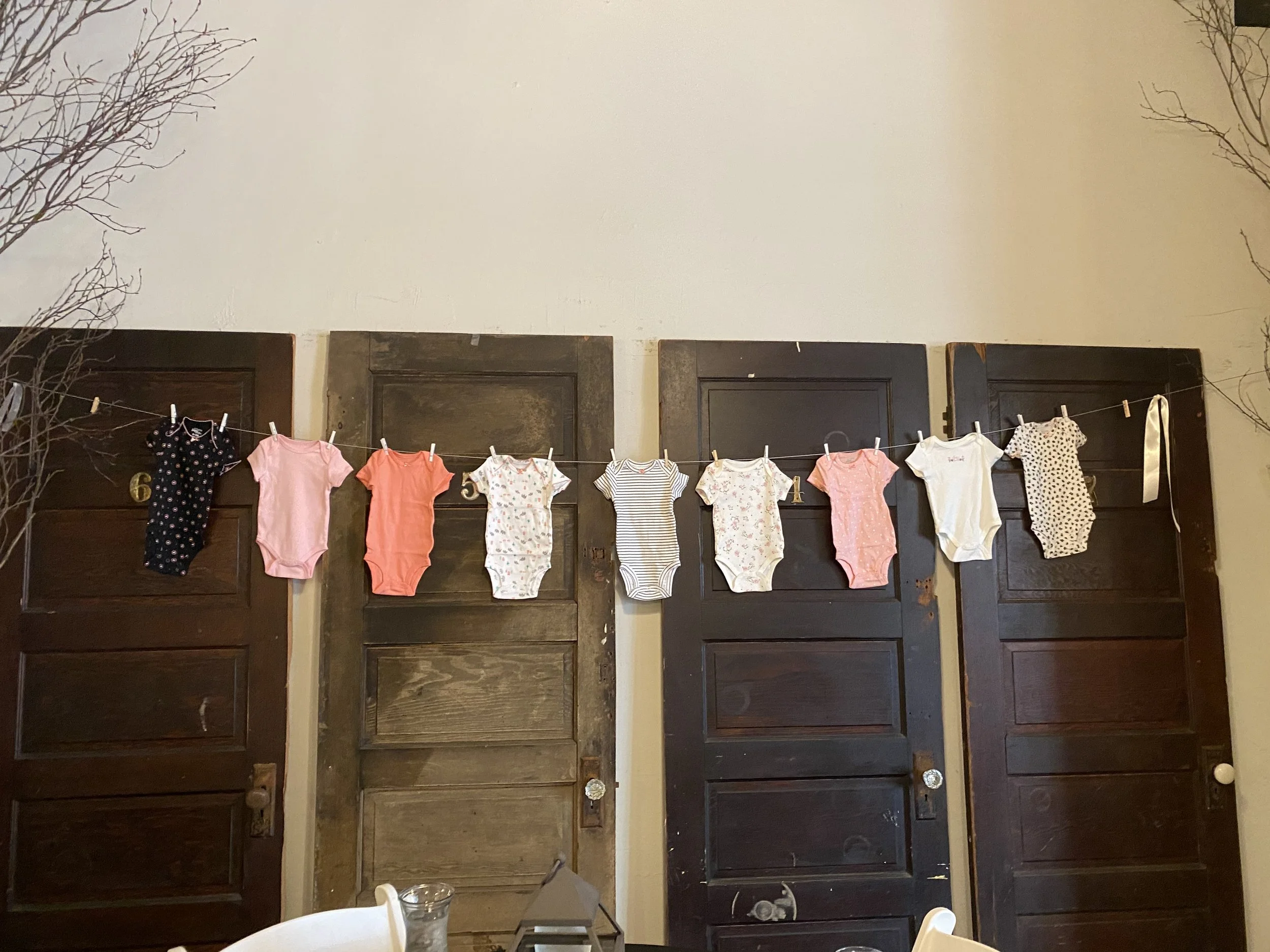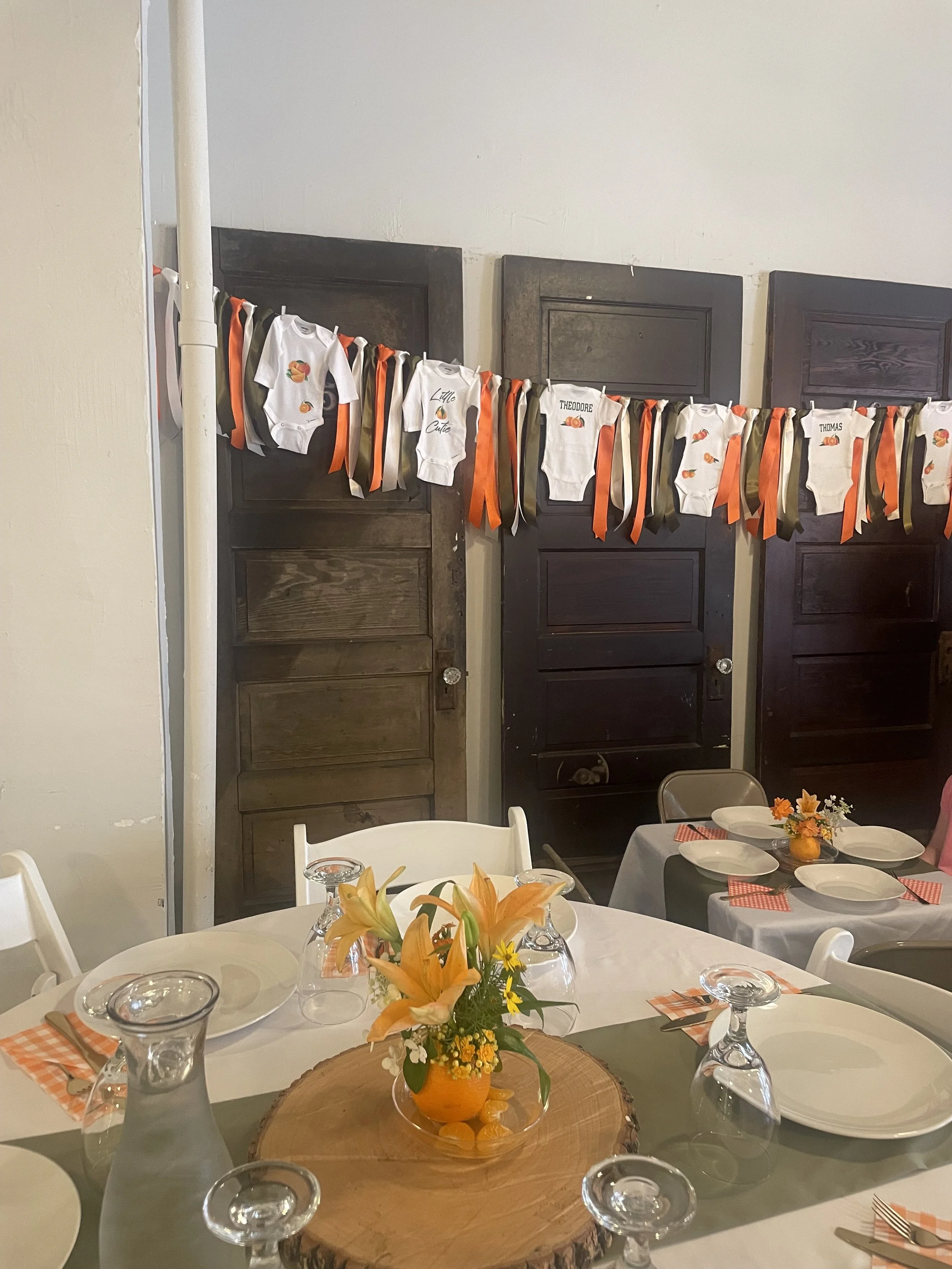Decorative orange and white baby onesies with ribbons hanging on a string in front of dark wooden doors, with a table set for a celebration featuring a flower arrangement, plates, and glasses.