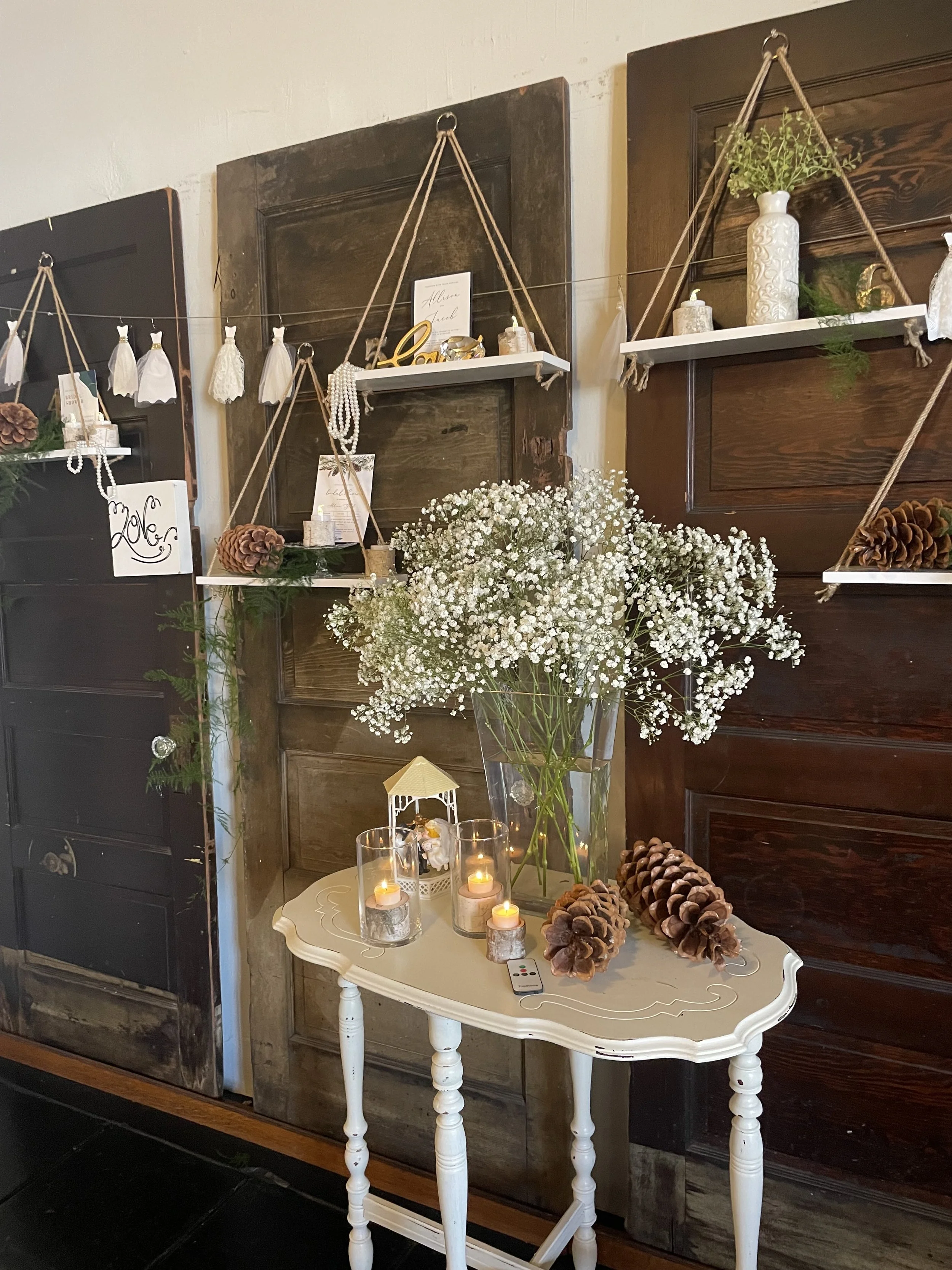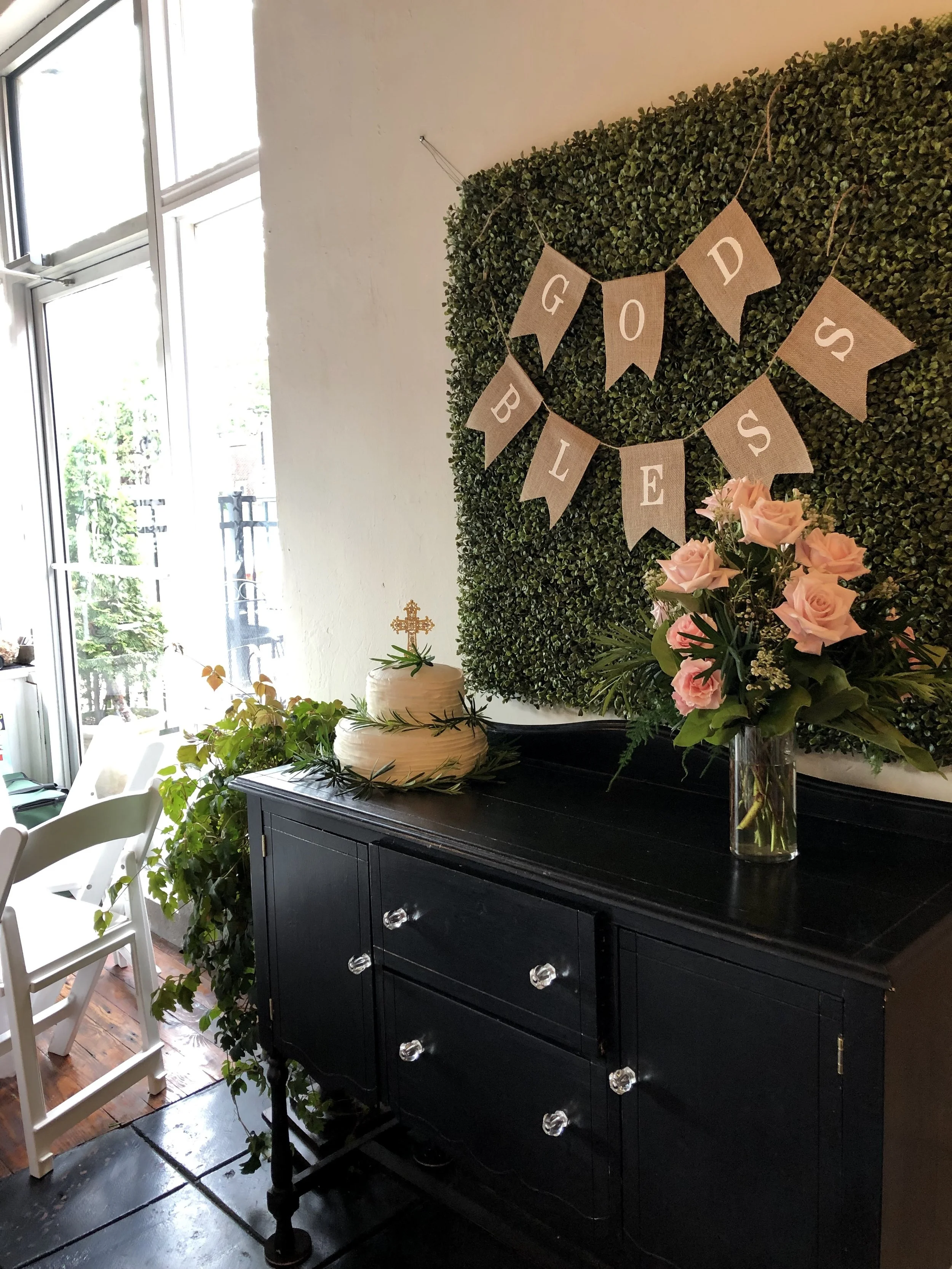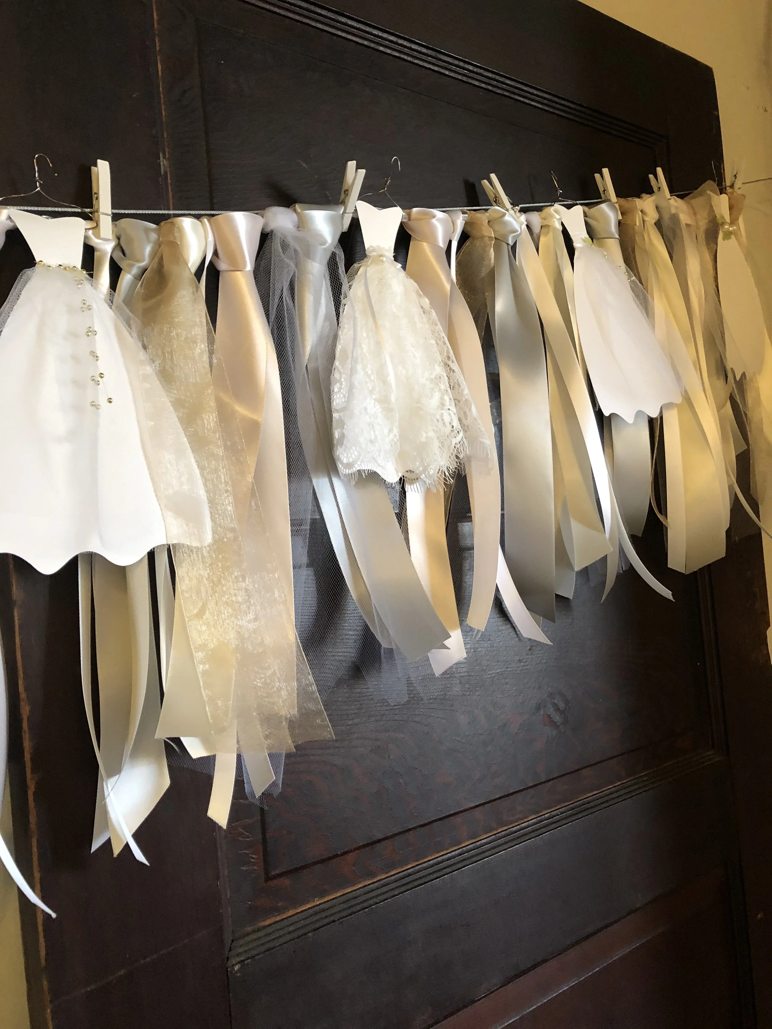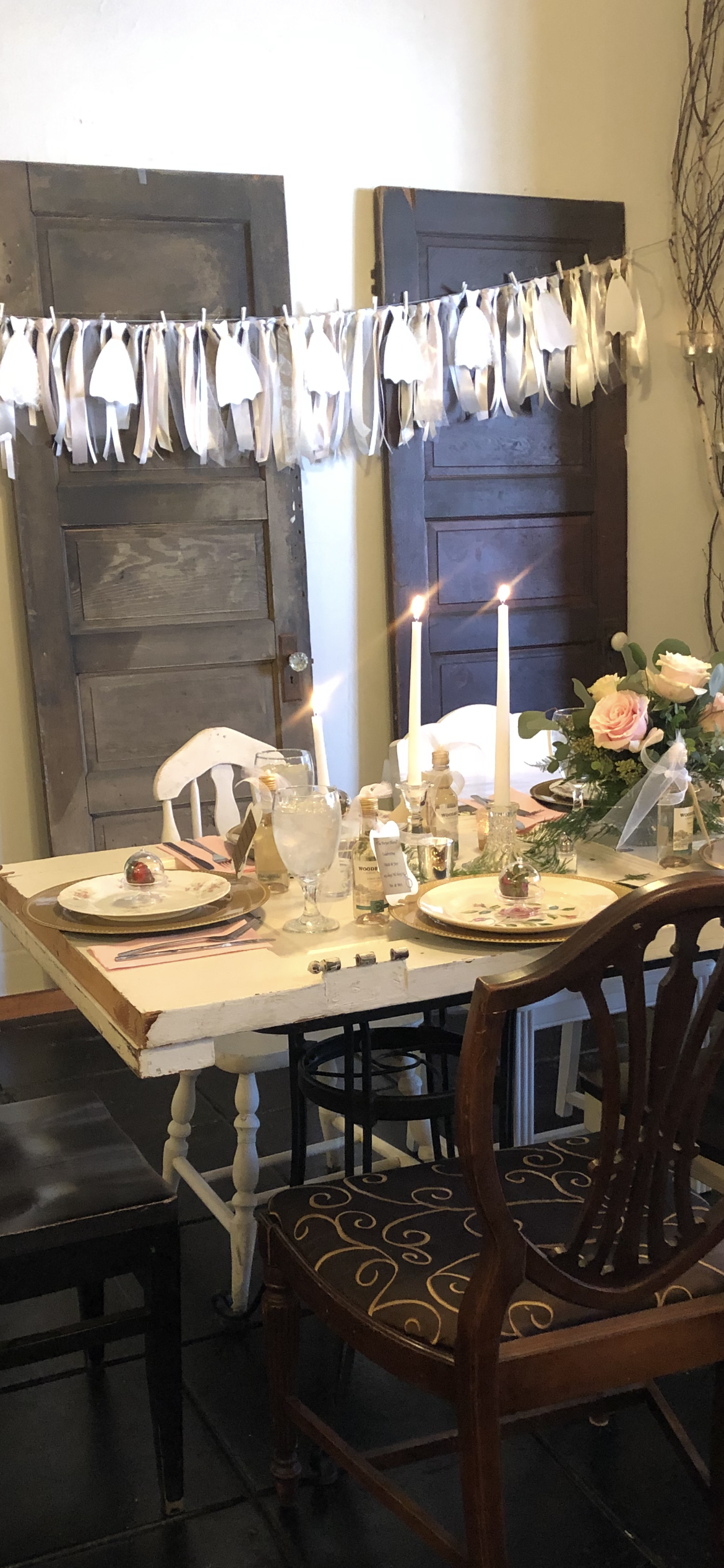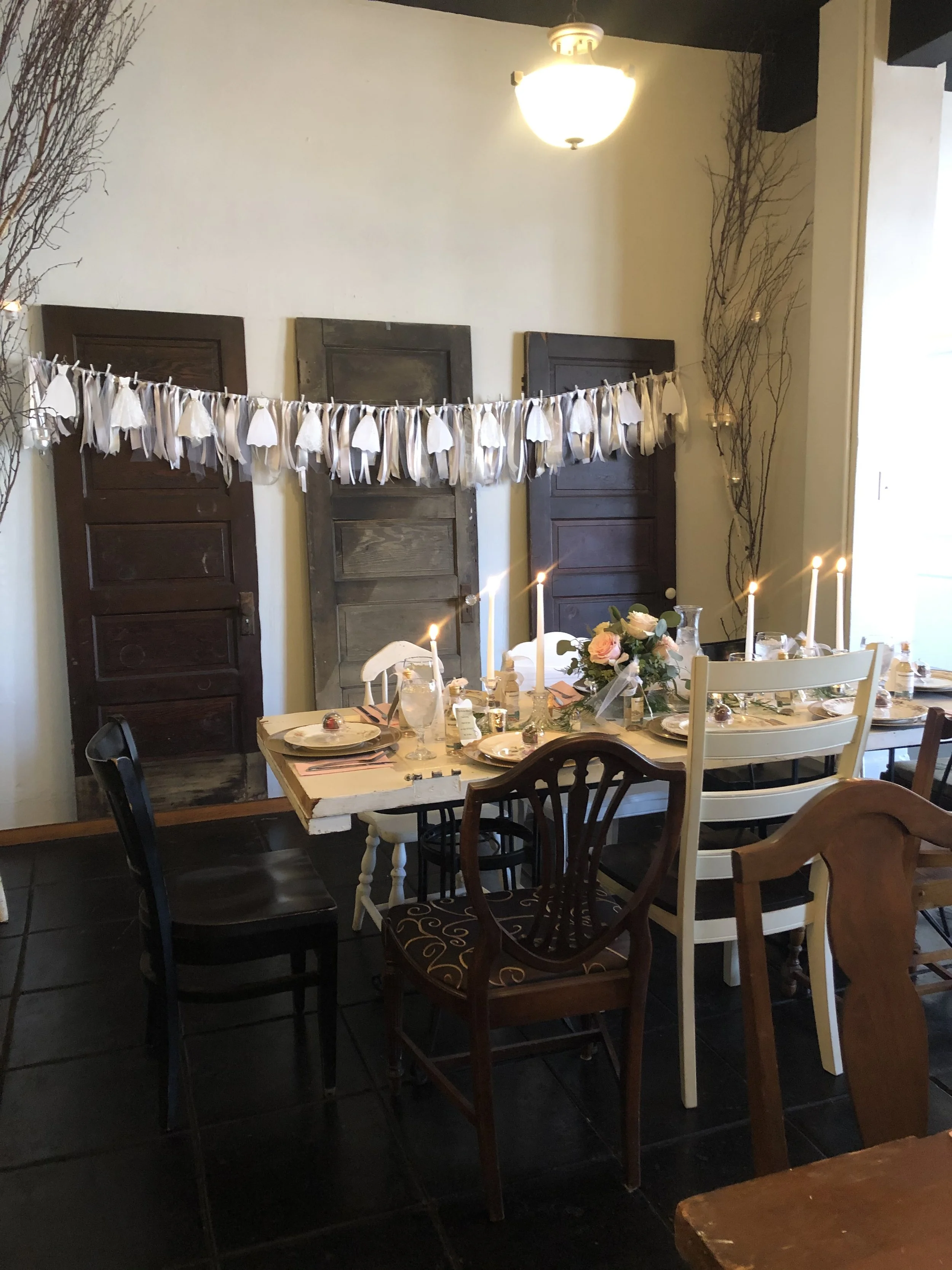 Decorative orange and white baby onesies with ribbons hanging on a string in front of dark wooden doors, with a table set for a celebration featuring a flower arrangement, plates, and glasses.