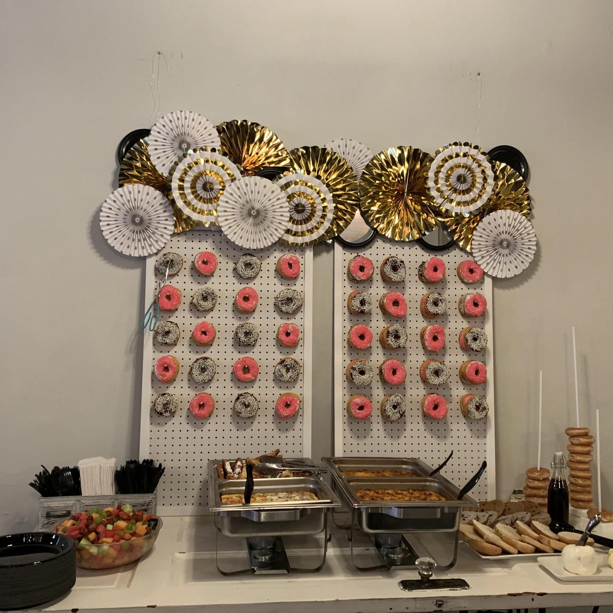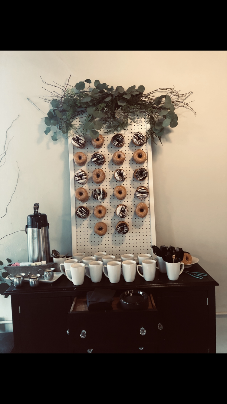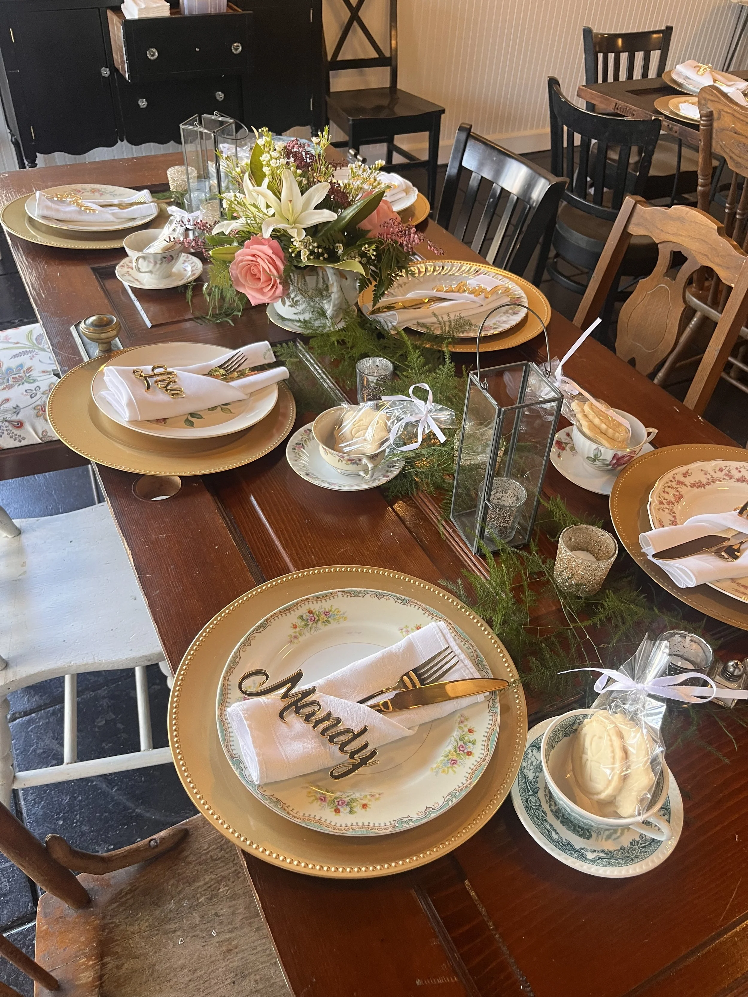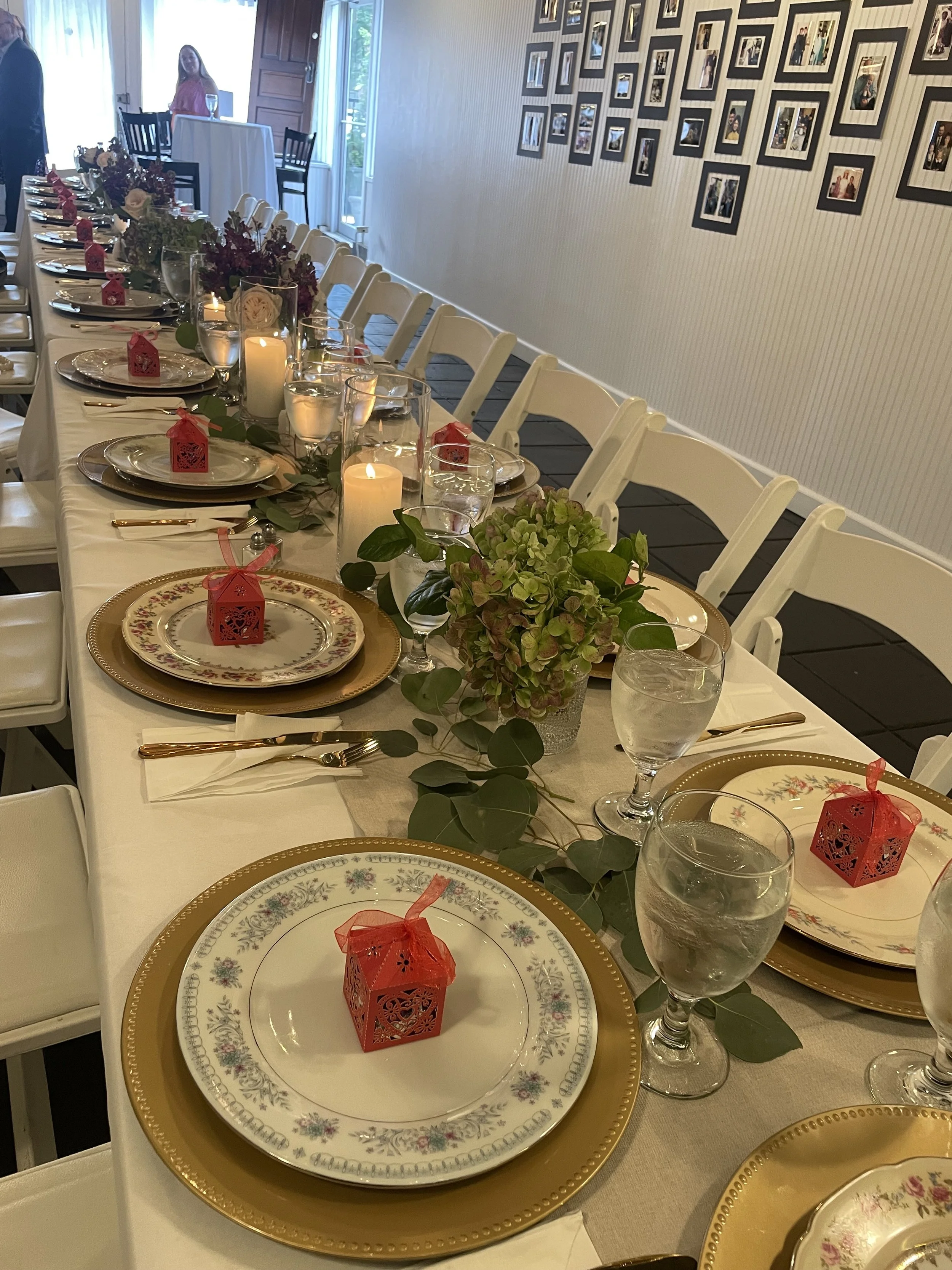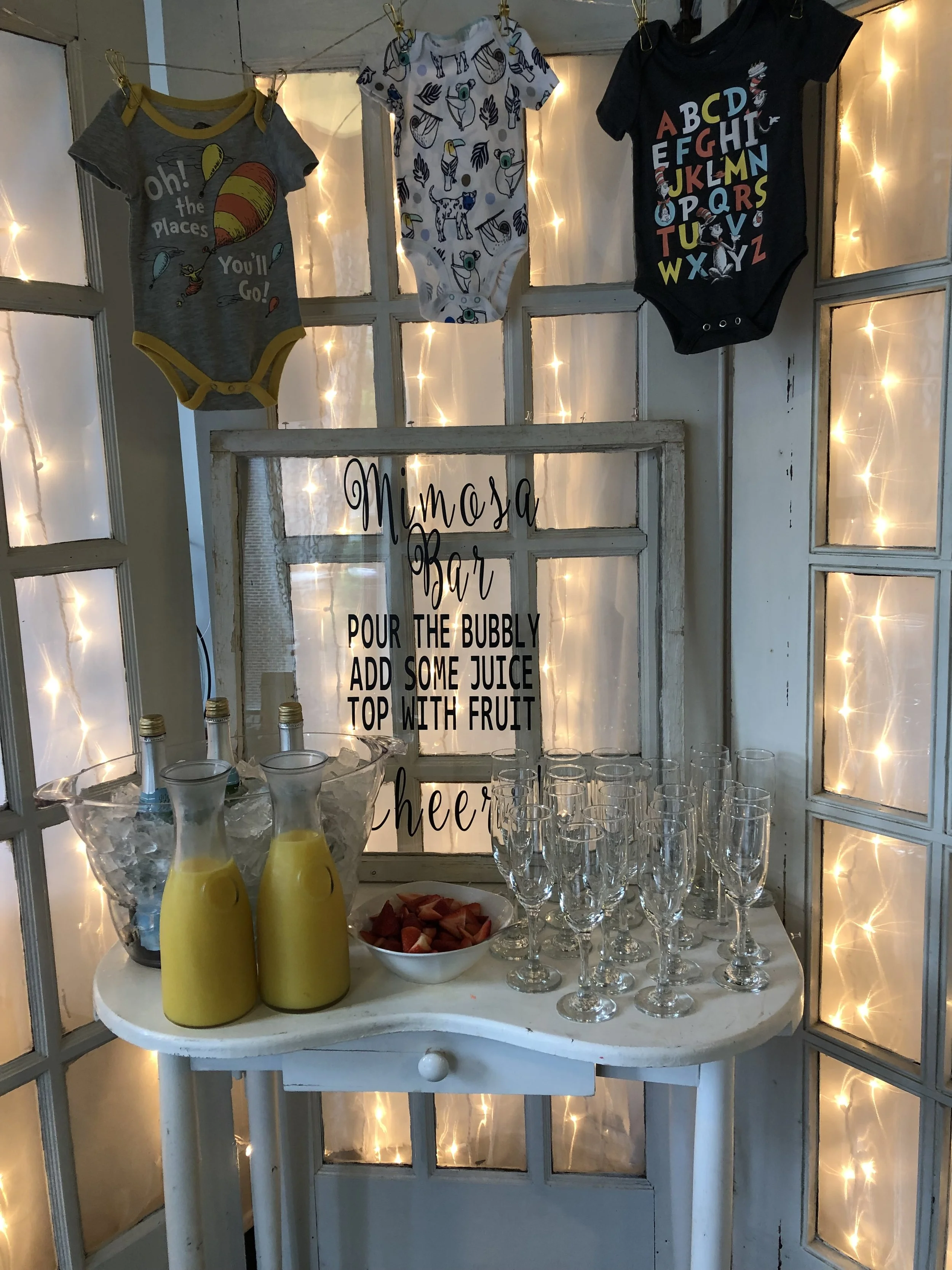 Decorative orange and white baby onesies with ribbons hanging on a string in front of dark wooden doors, with a table set for a celebration featuring a flower arrangement, plates, and glasses.