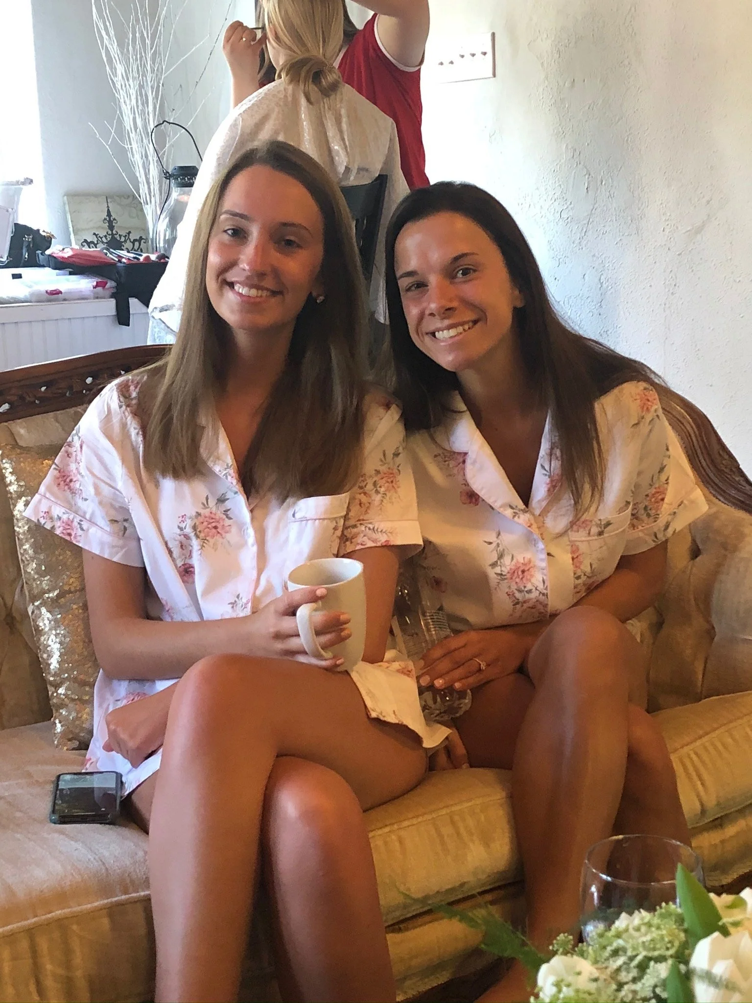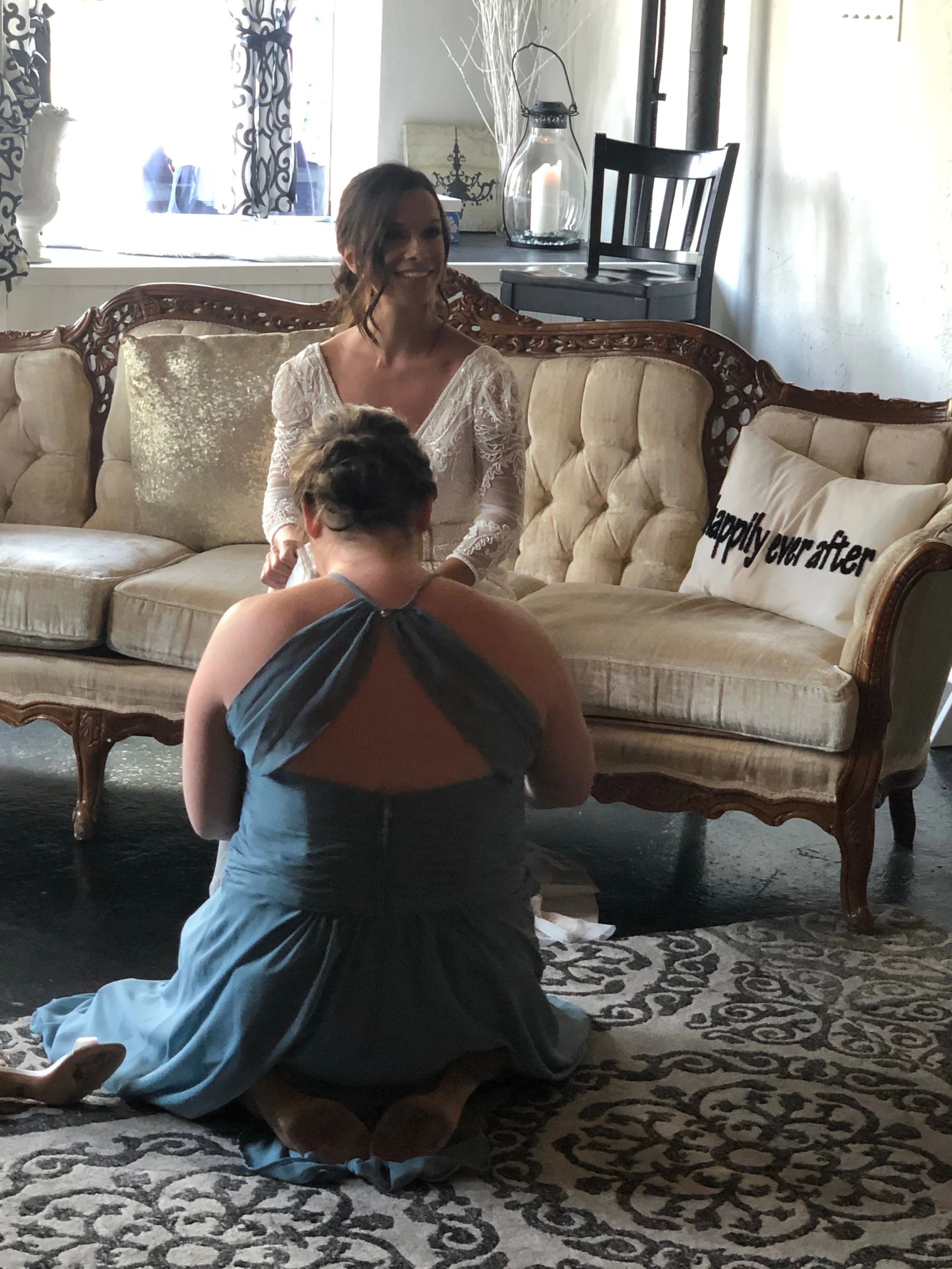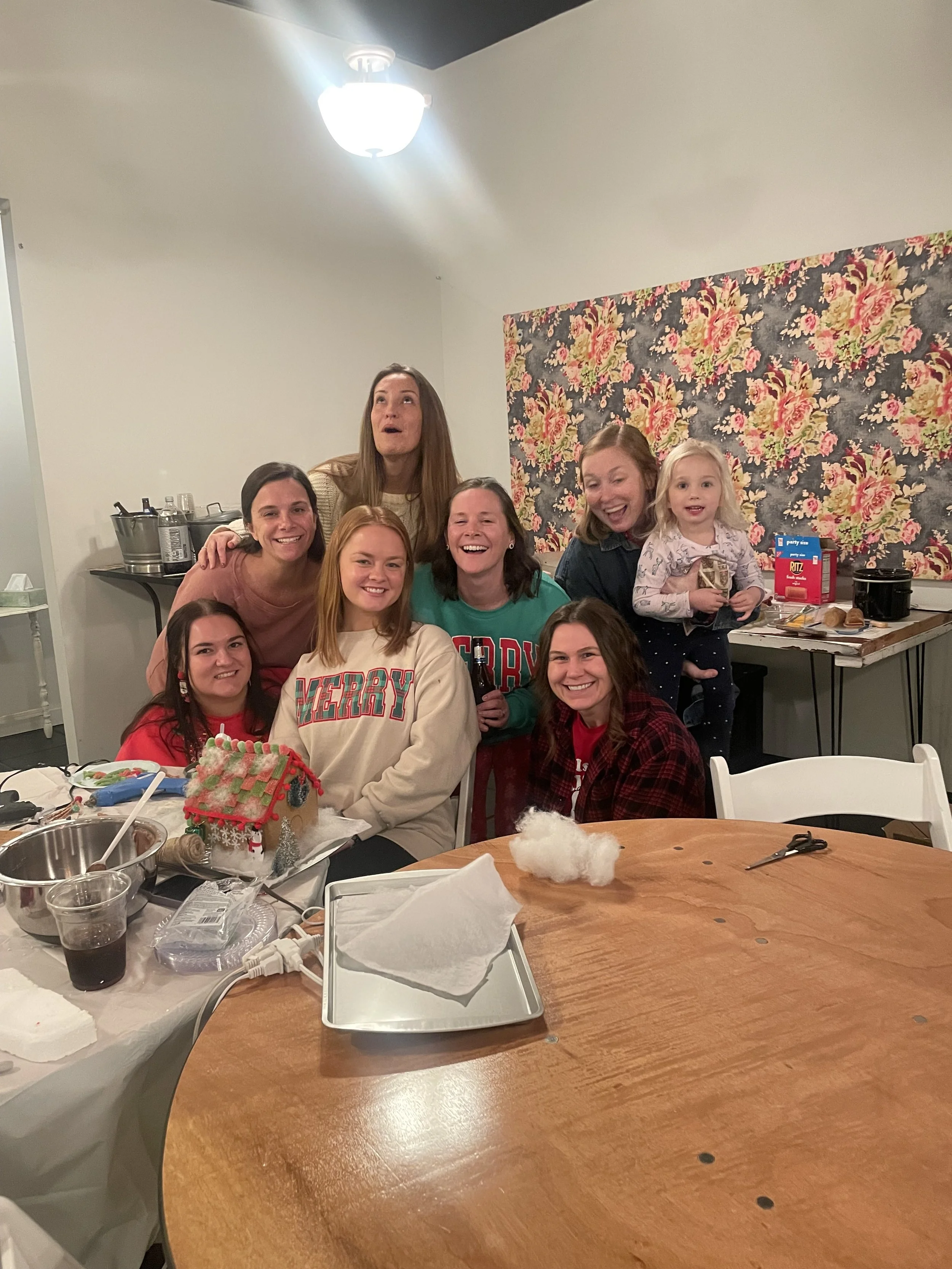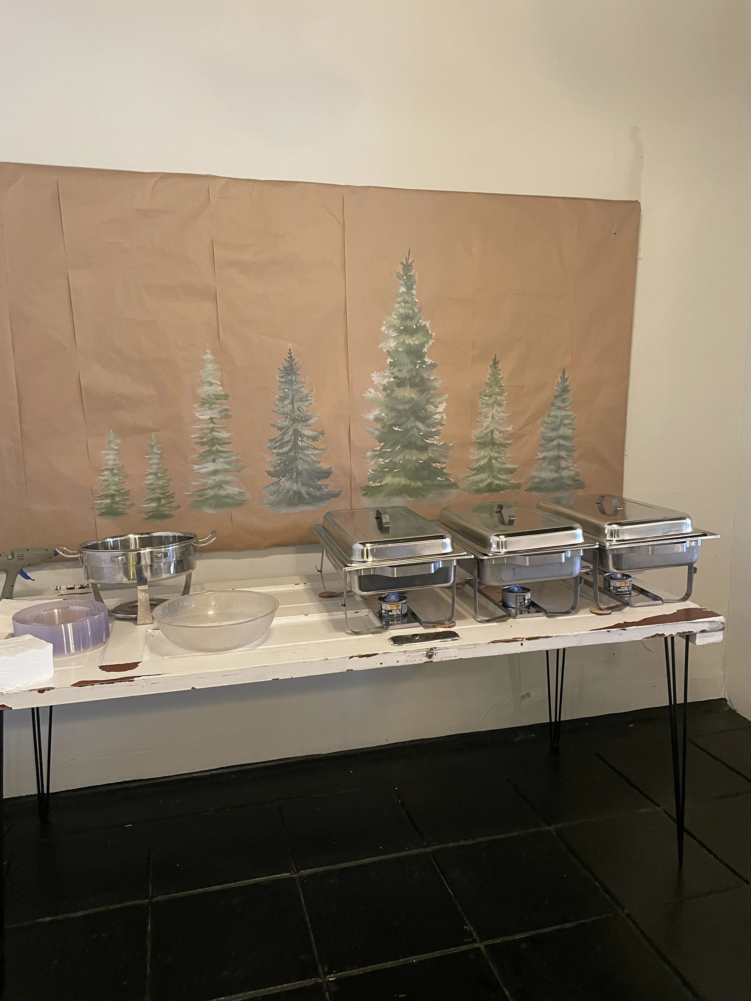 Decorative orange and white baby onesies with ribbons hanging on a string in front of dark wooden doors, with a table set for a celebration featuring a flower arrangement, plates, and glasses.