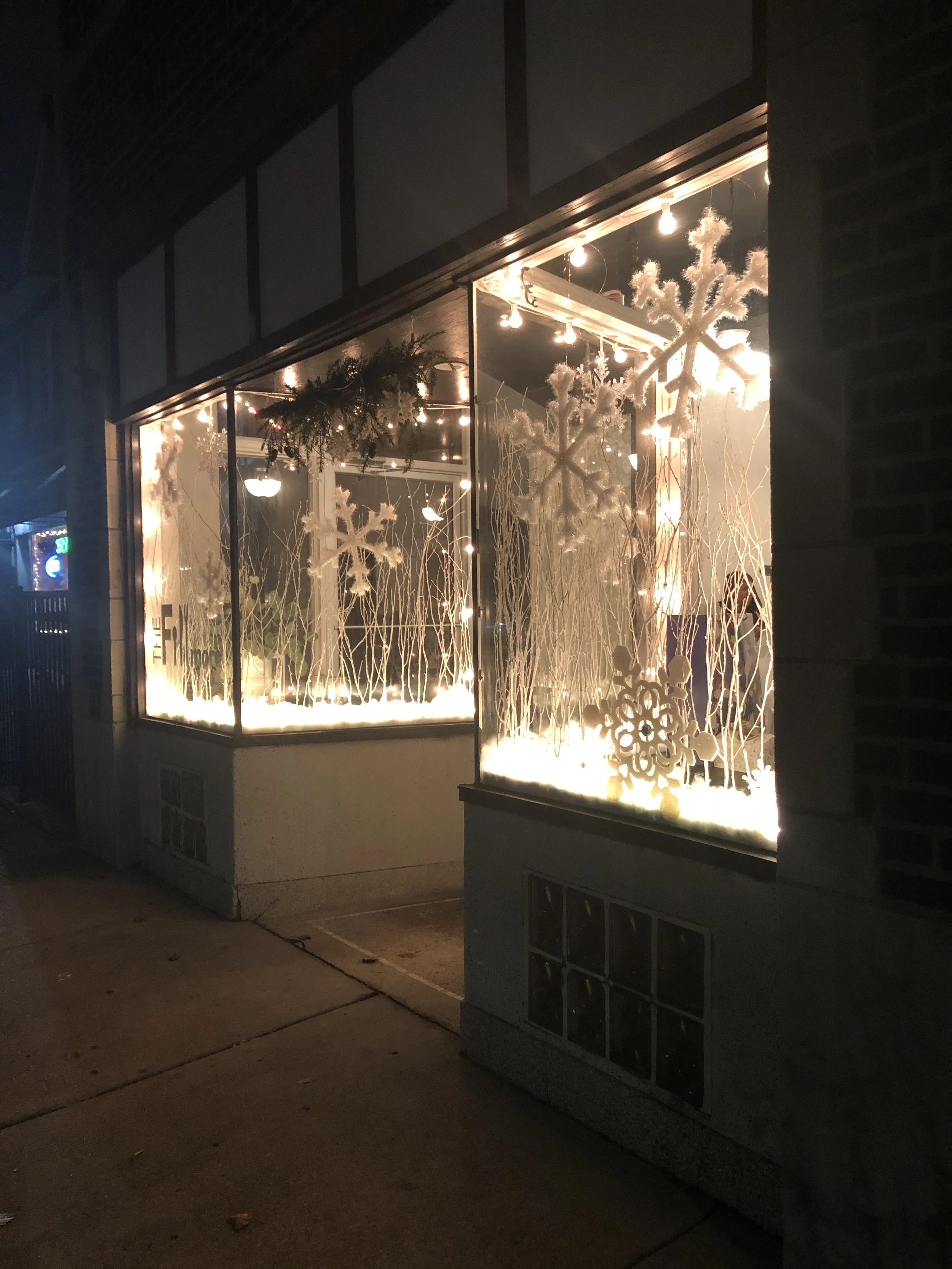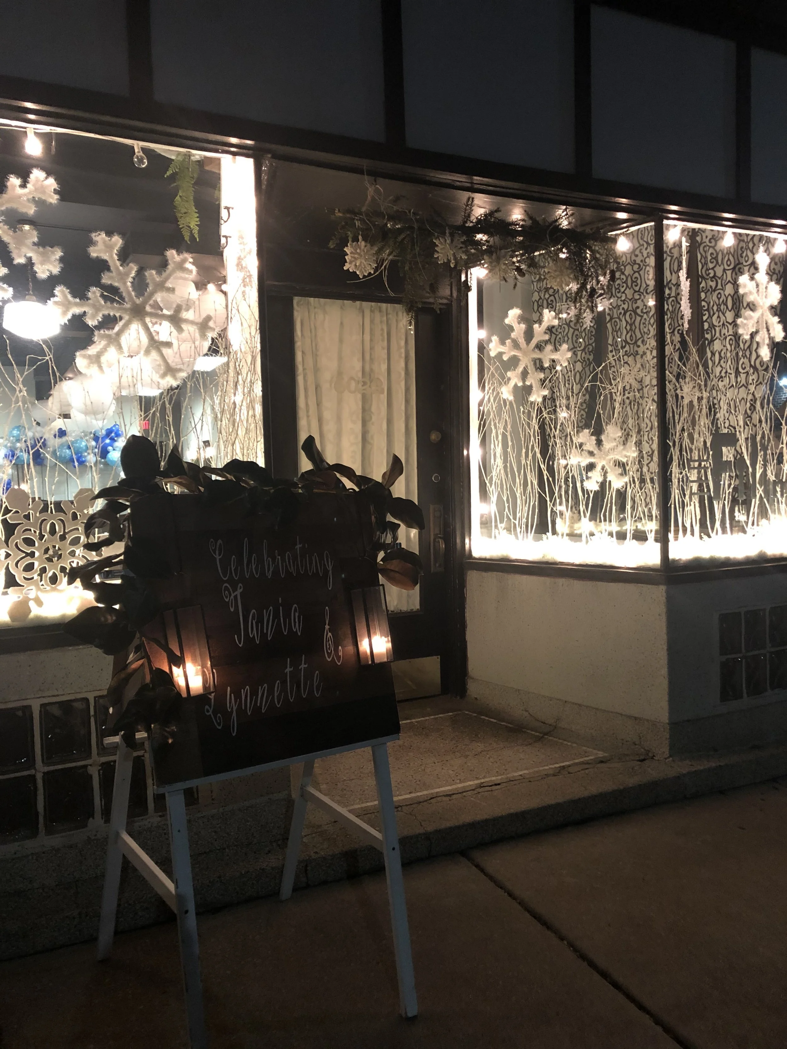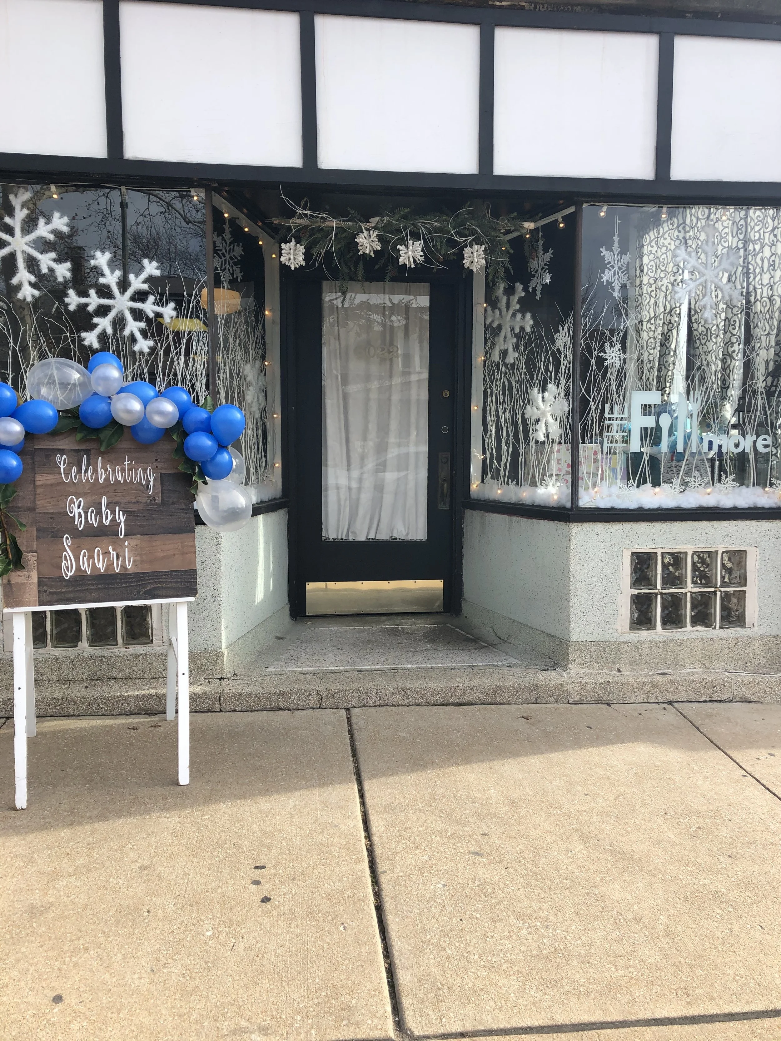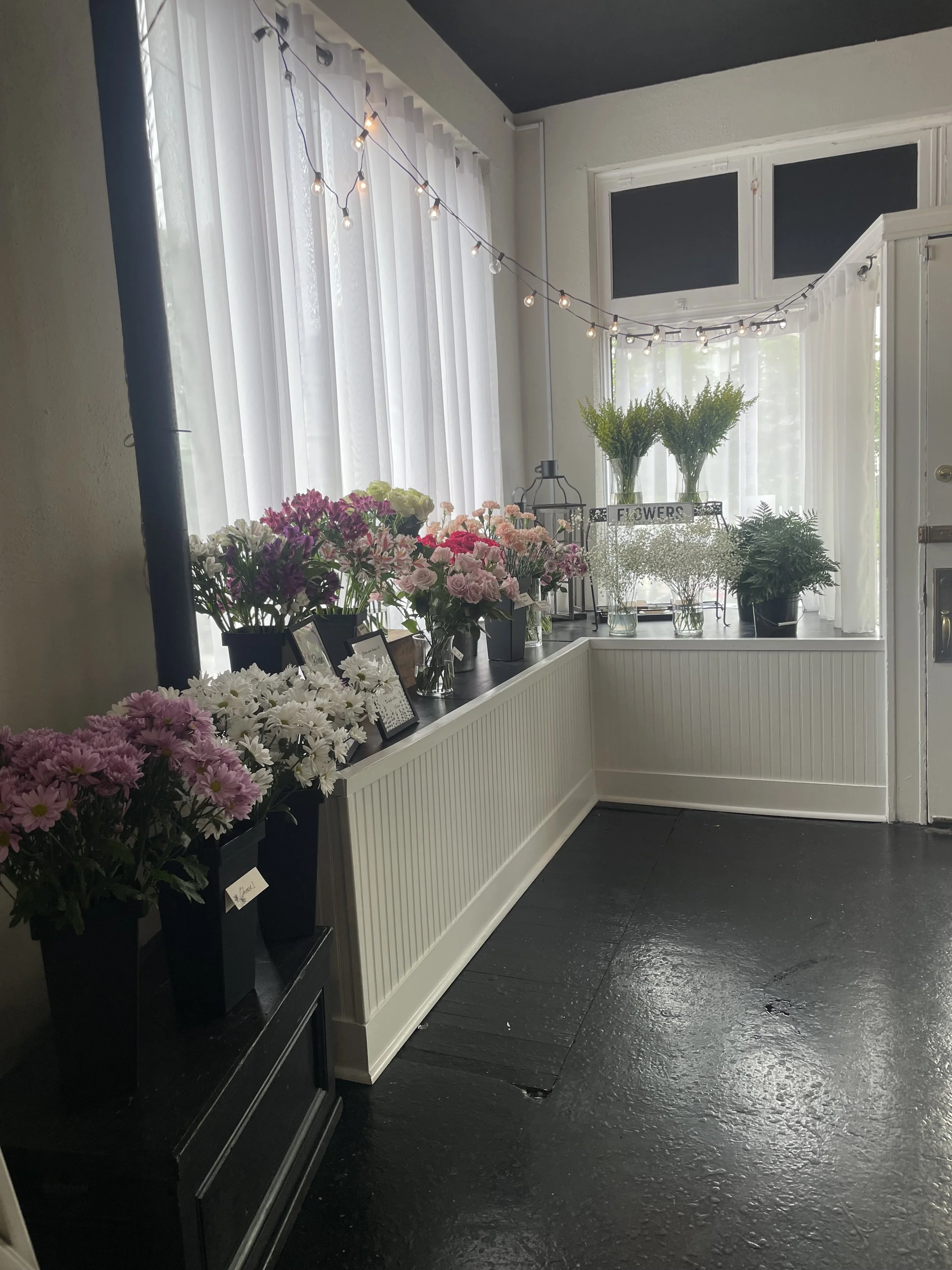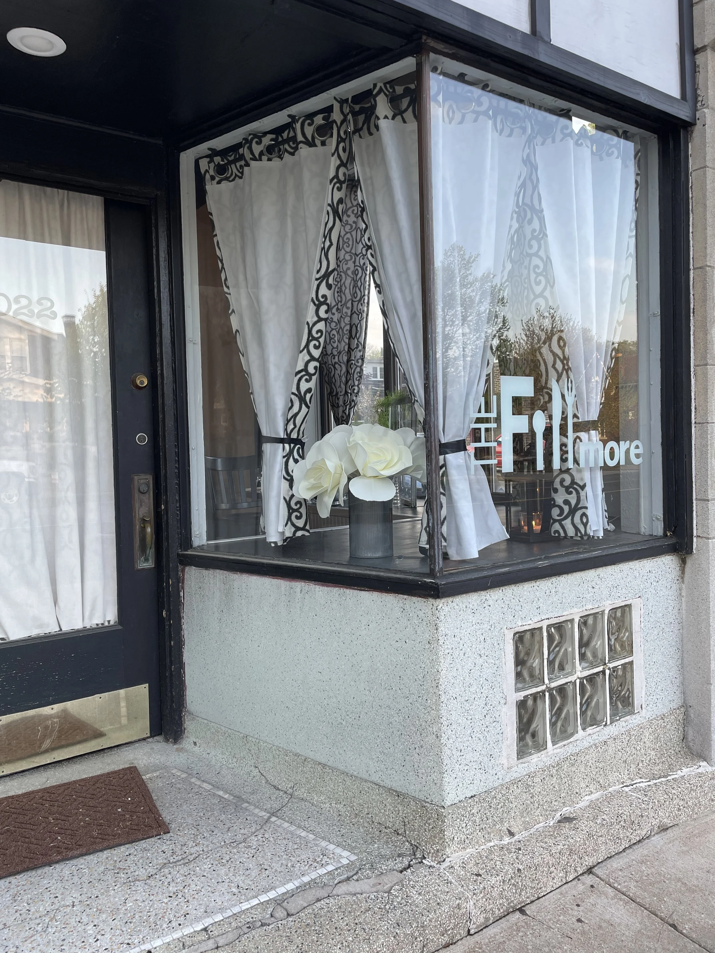 Exterior view of a storefront with large glass windows and curtains, a vase with white flowers on the window sill, and the words 'The Fillmore' on the window.