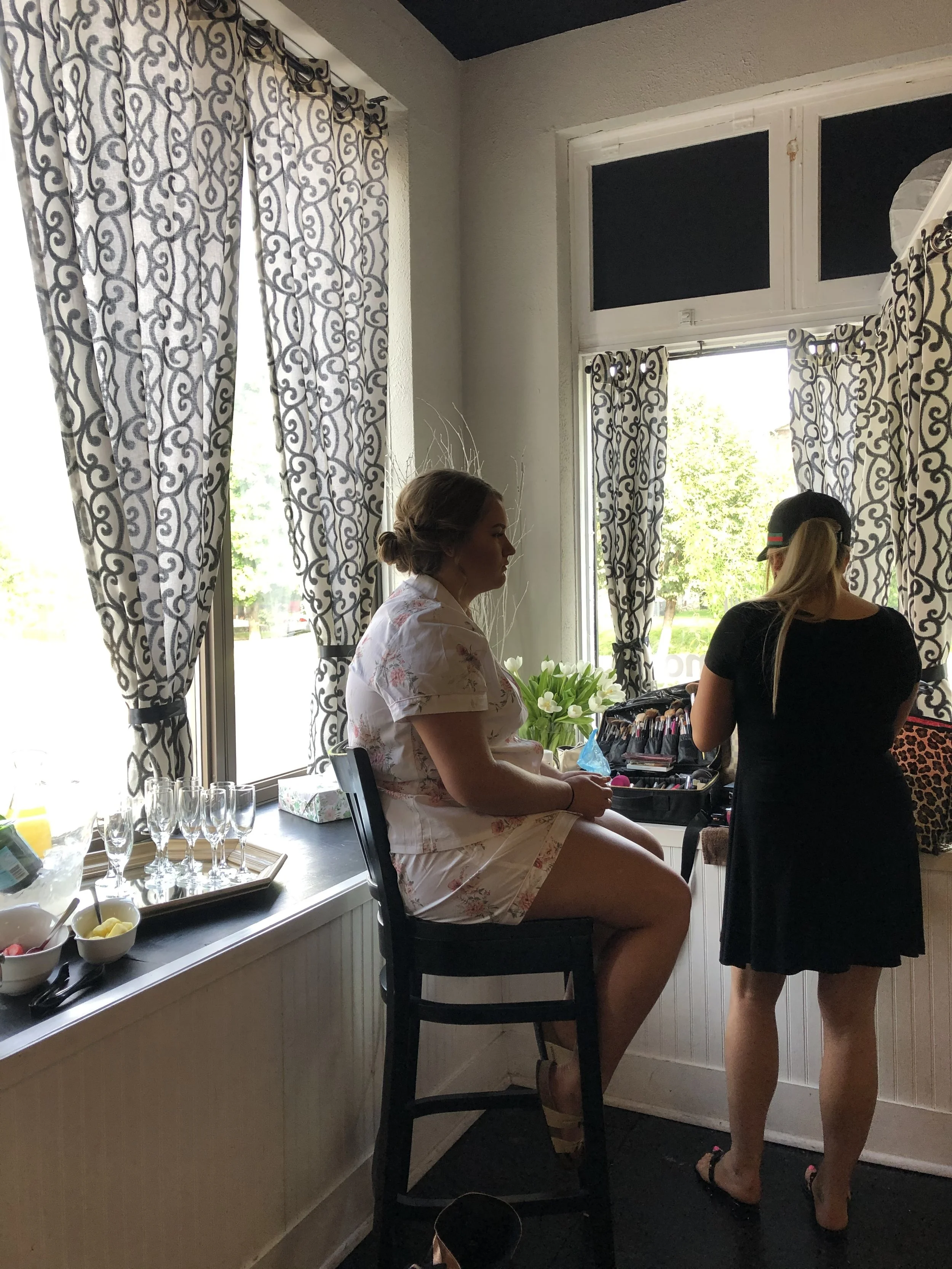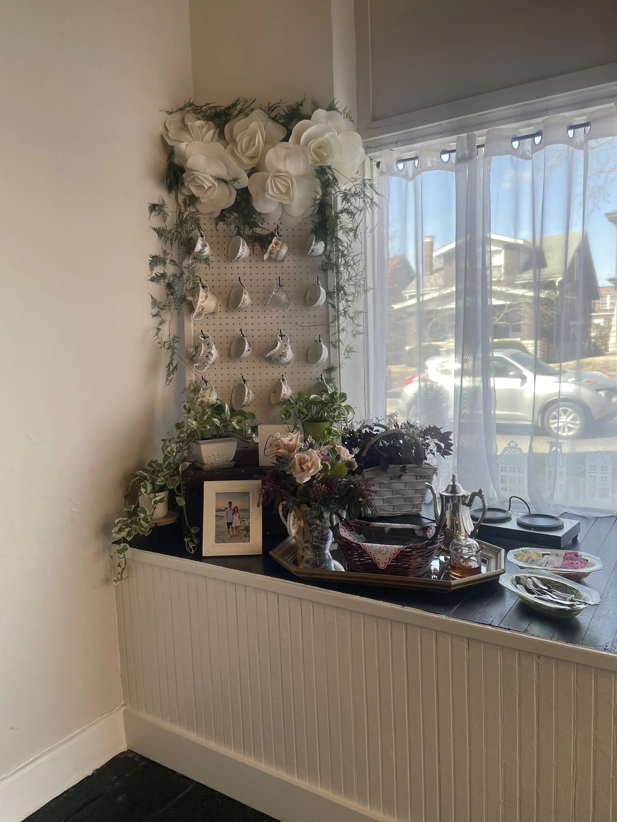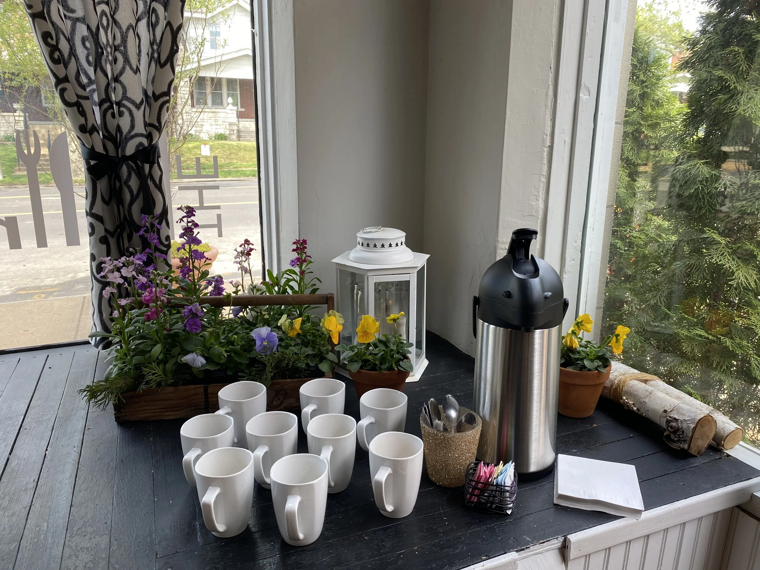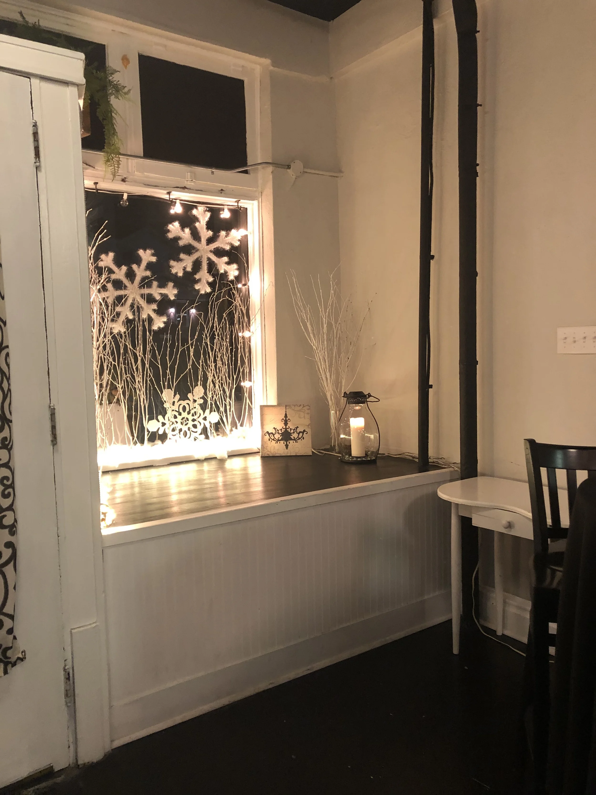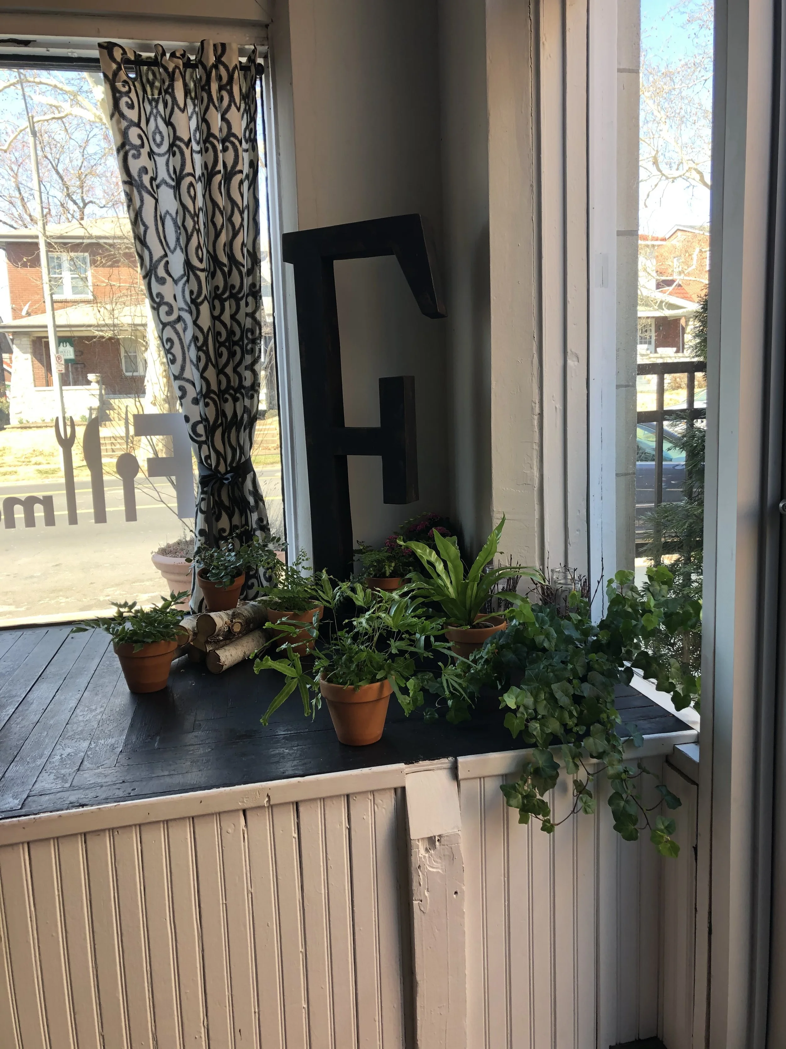 Exterior view of a storefront with large glass windows and curtains, a vase with white flowers on the window sill, and the words 'The Fillmore' on the window.
