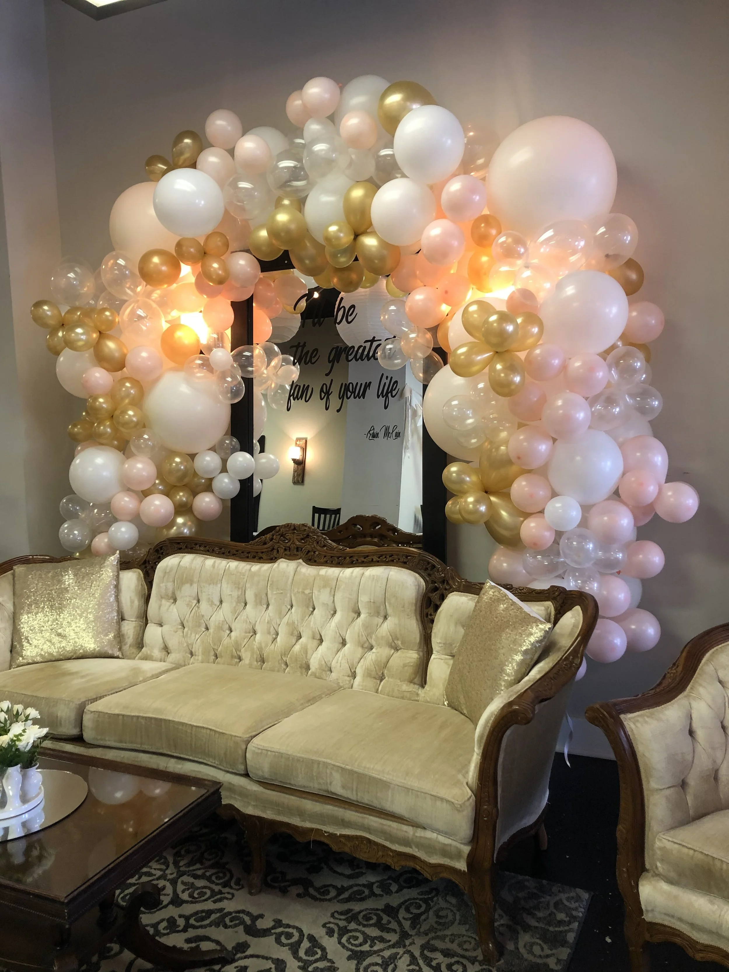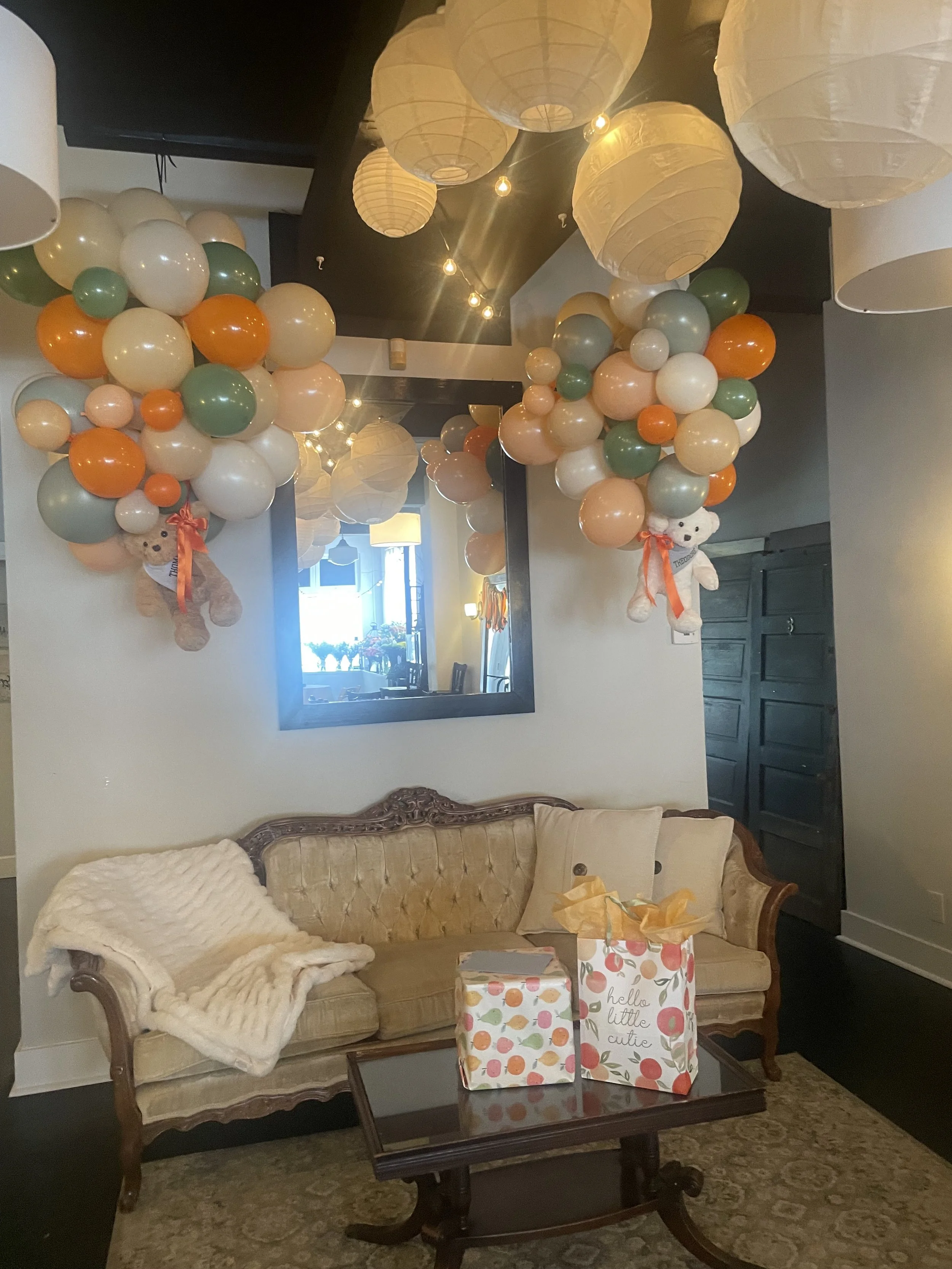Living room decorated with balloon arrangements in pastel colors and teddy bear plush toys, likely for a celebration or party, with wrapped gifts on a coffee table.