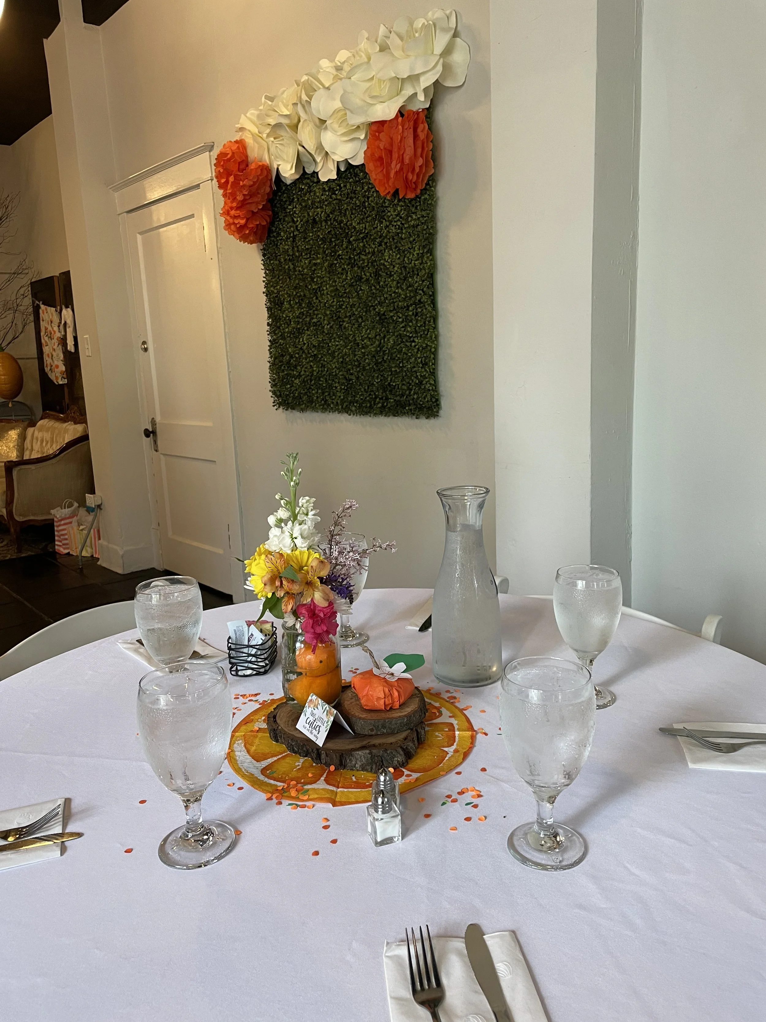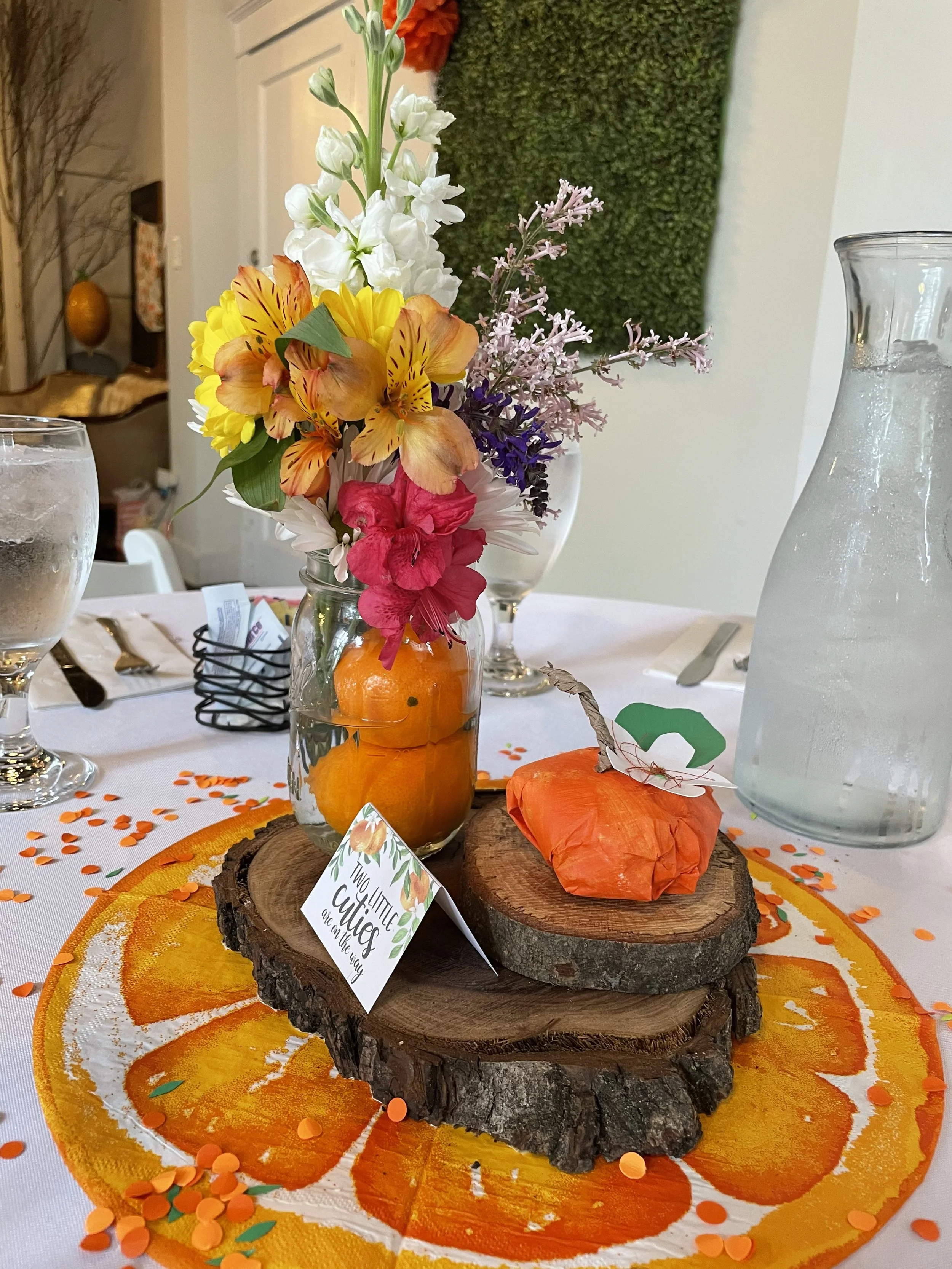 A tablescape with a floral centerpiece in a glass jar, placed on two stacked wooden slices, surrounded by orange confetti, a small paper pumpkin decoration, and a colorful, orange and yellow citrus-themed tablecloth. There are water glasses and a gla