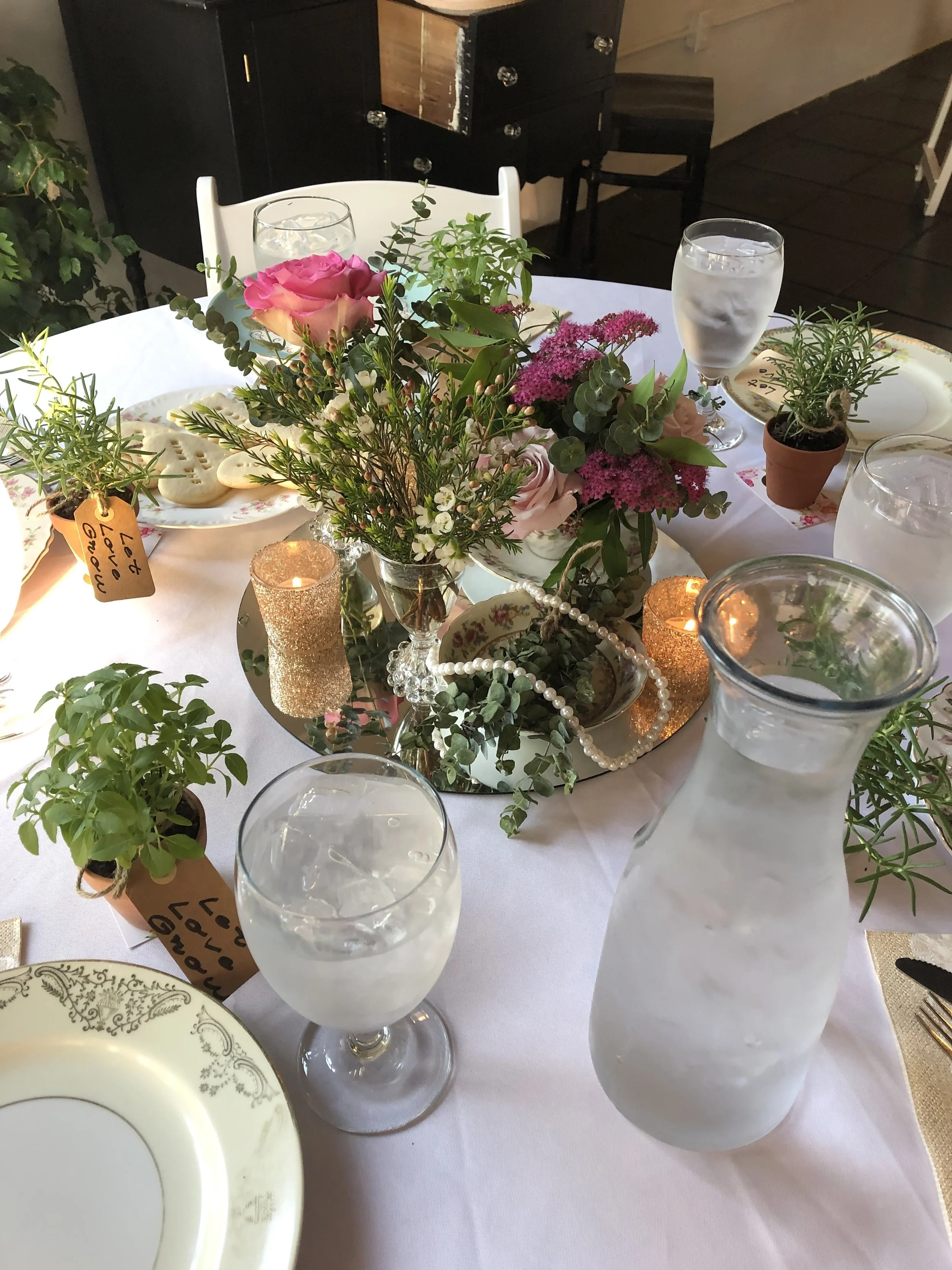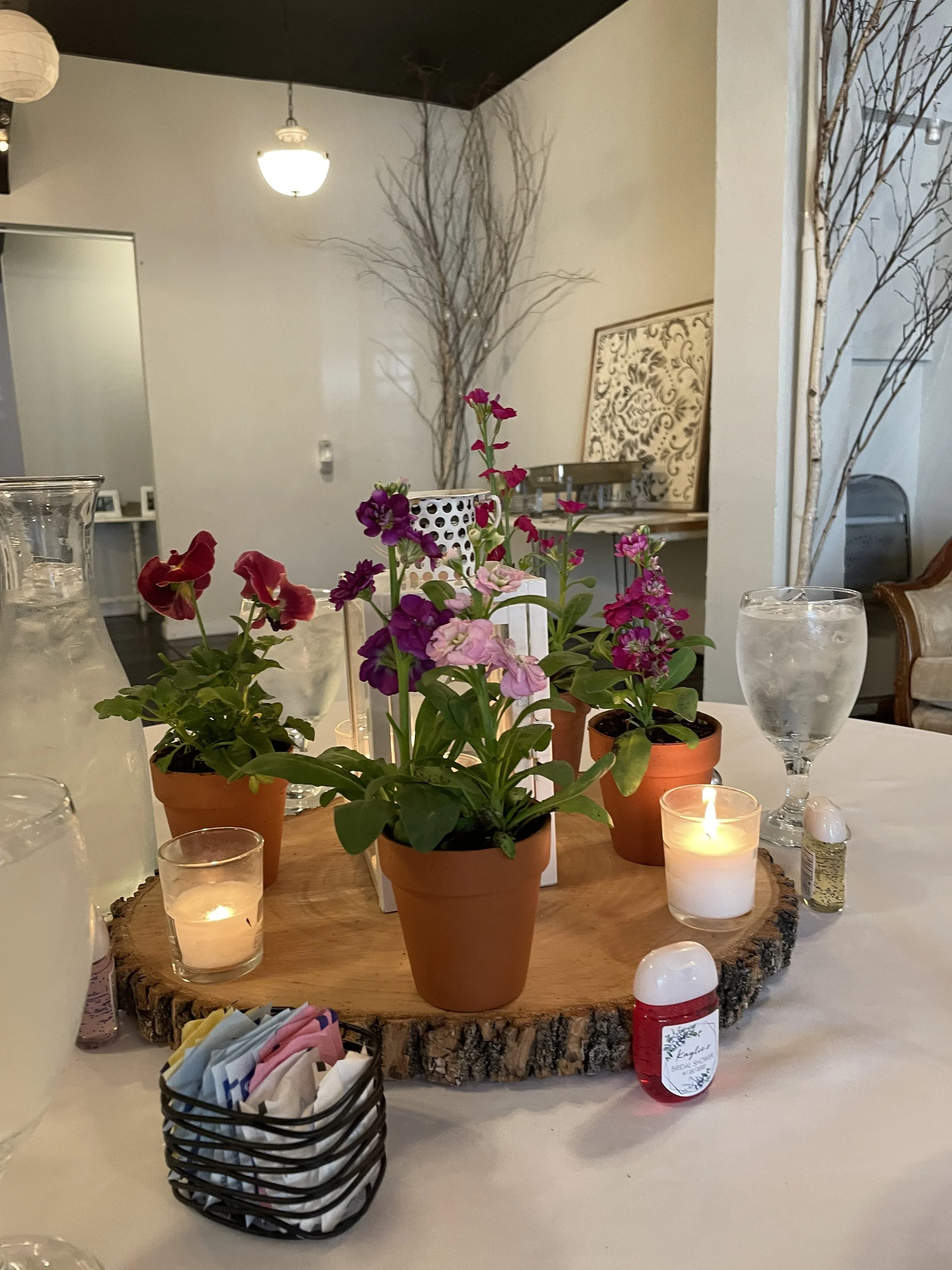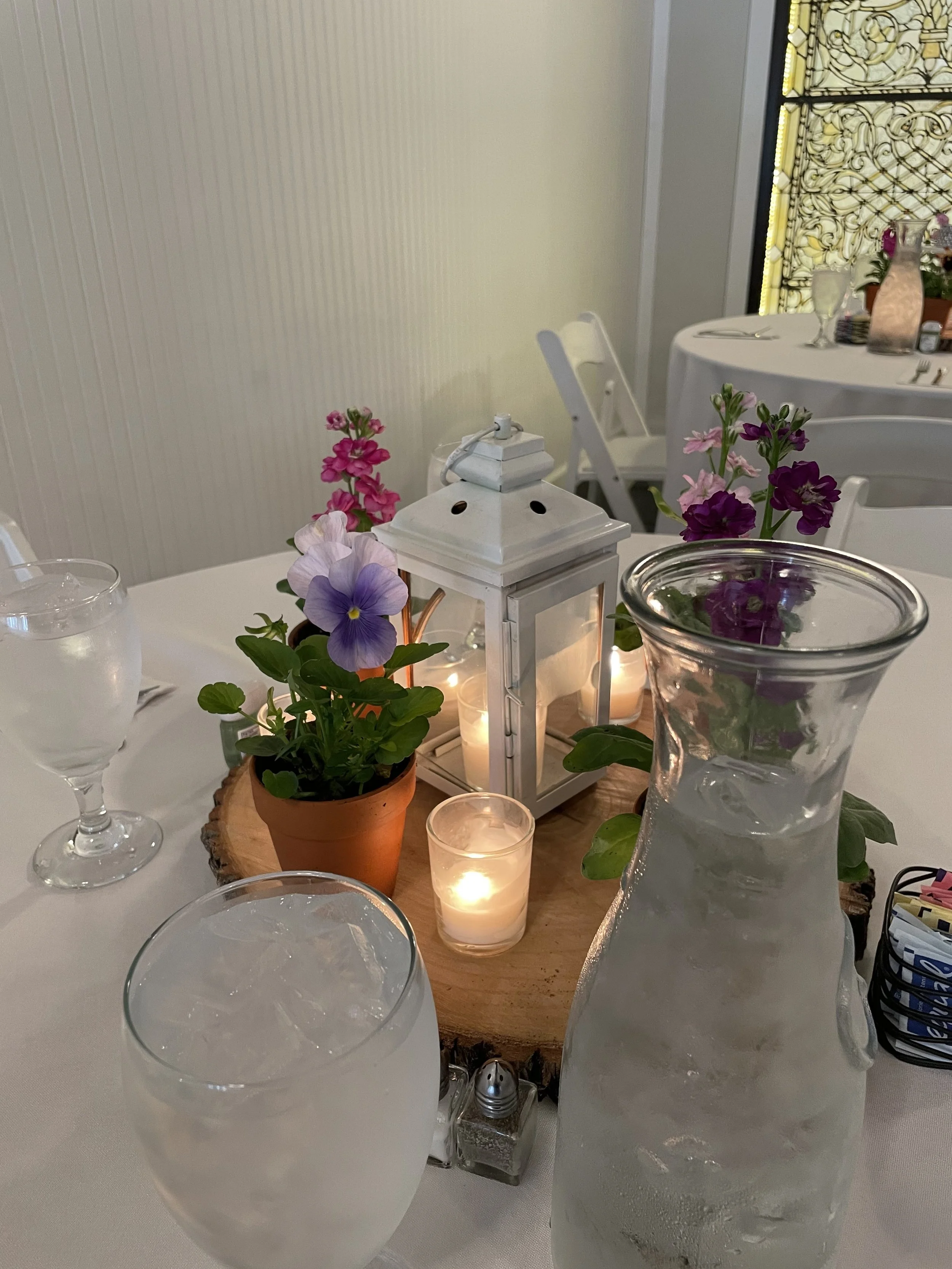 A table centerpiece with potted purple and pink flowers, a white lantern, and candles on a round wooden slab. Water glasses and a glass pitcher of ice water are also present on the table.