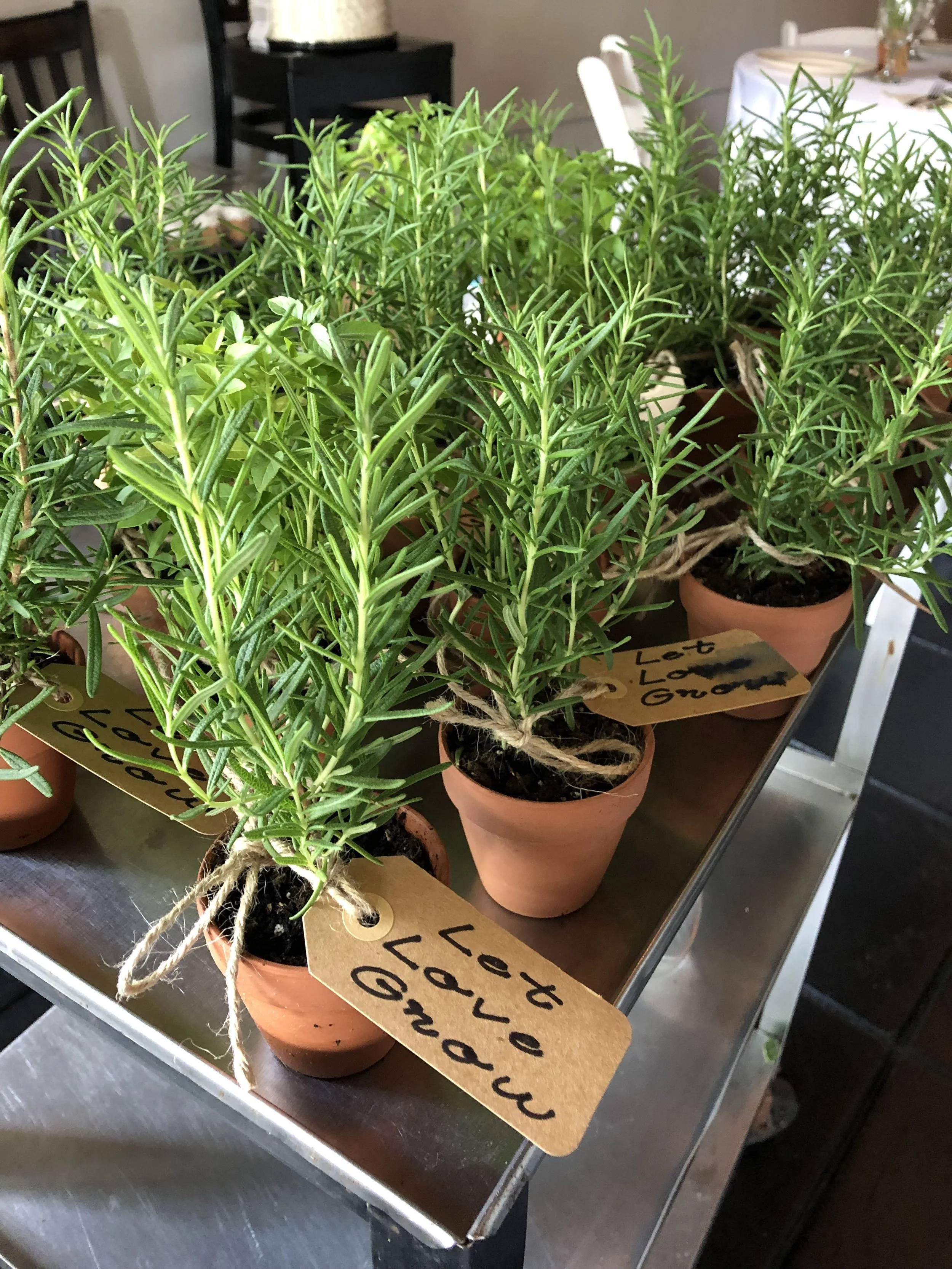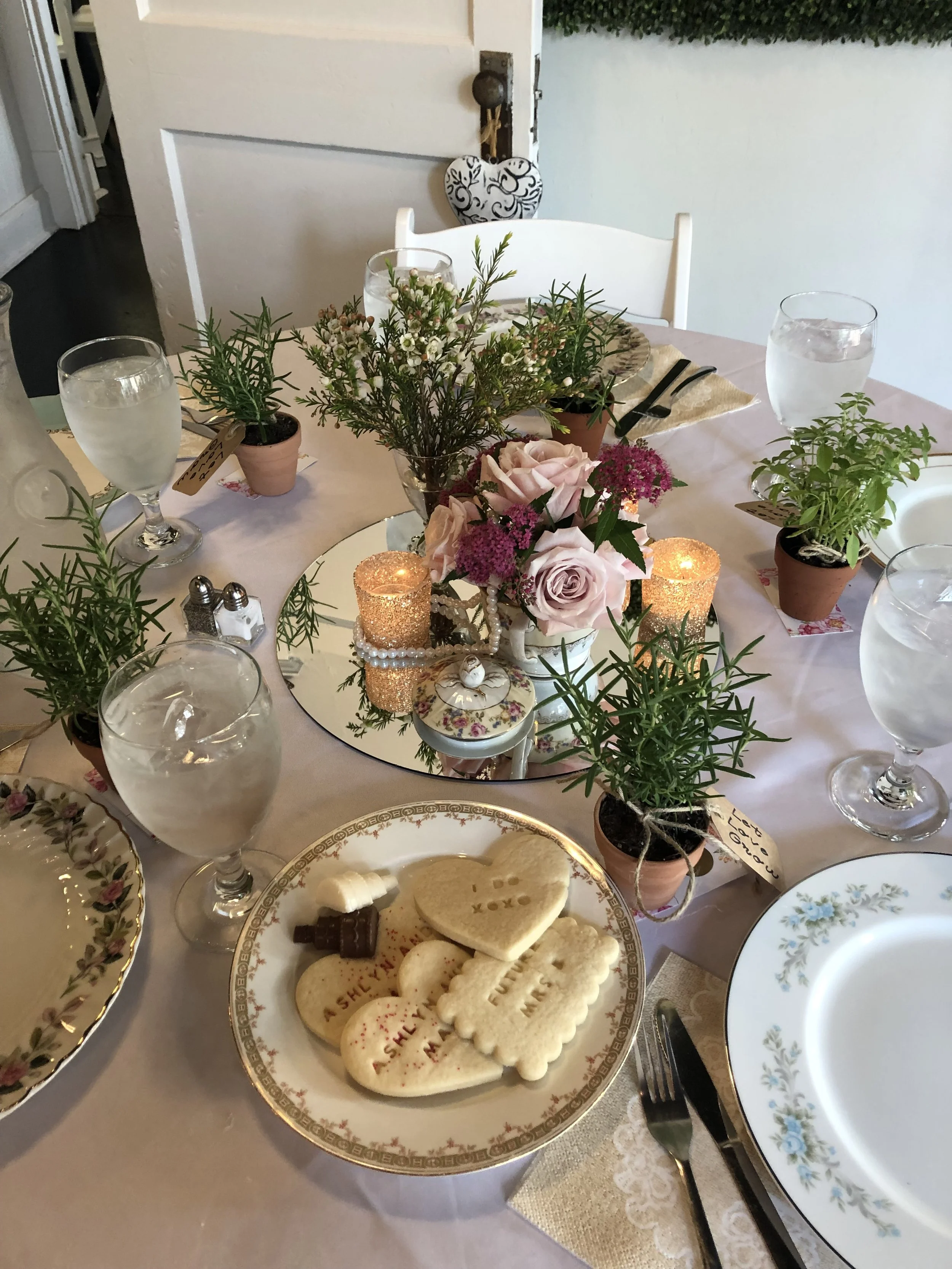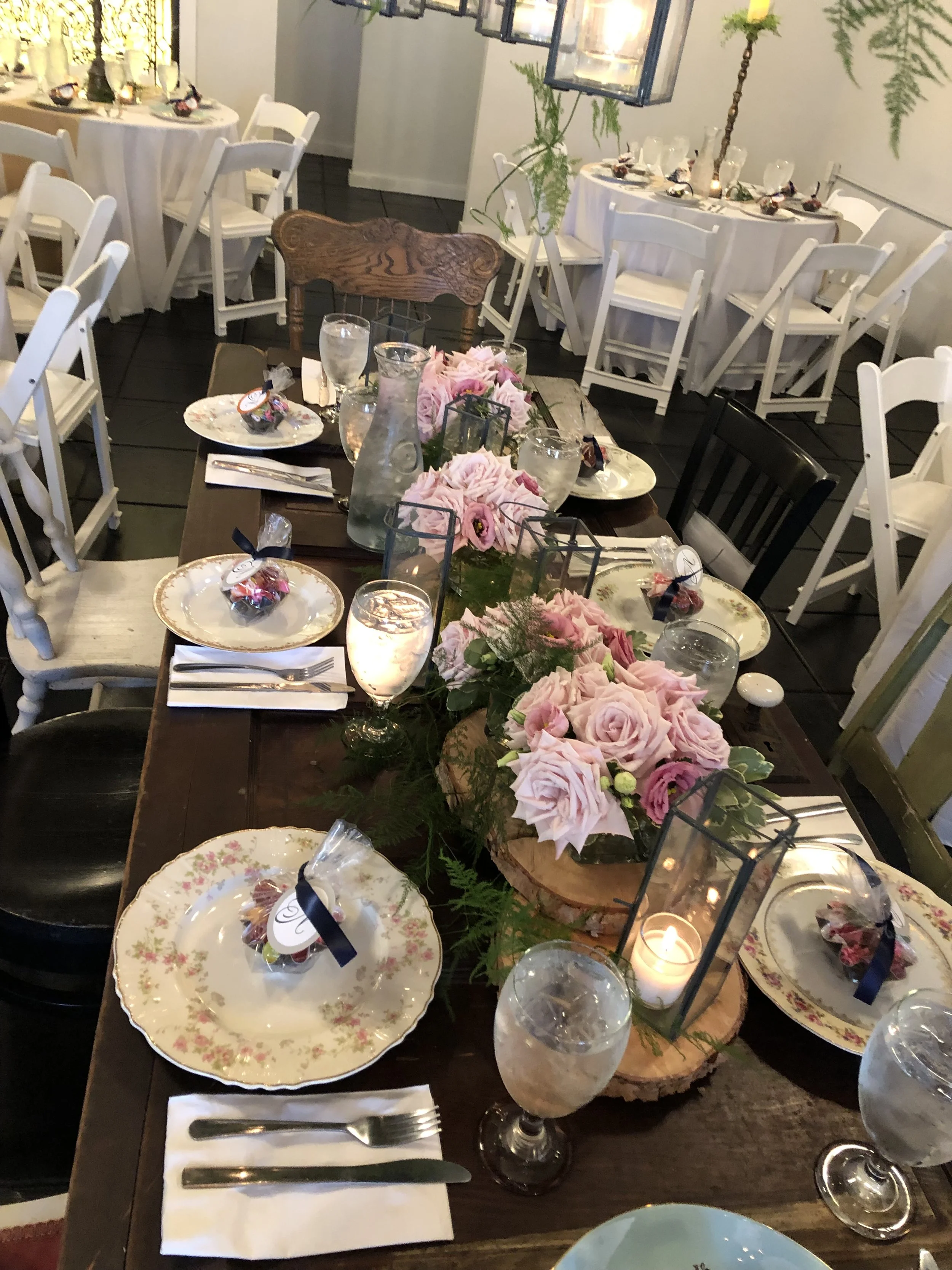 A table centerpiece with potted purple and pink flowers, a white lantern, and candles on a round wooden slab. Water glasses and a glass pitcher of ice water are also present on the table.