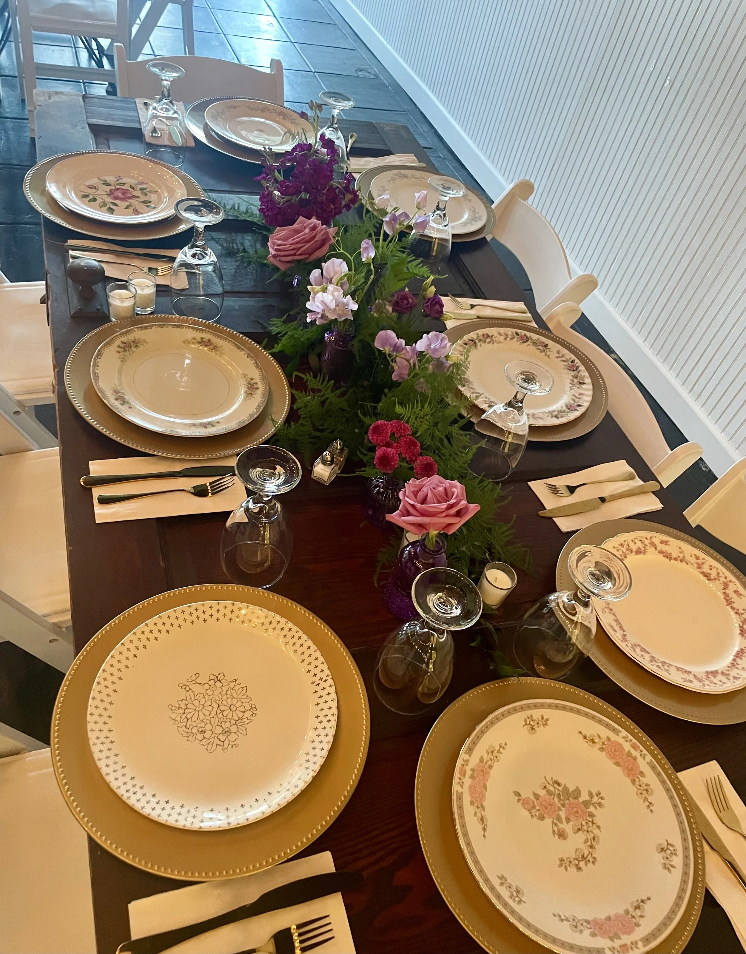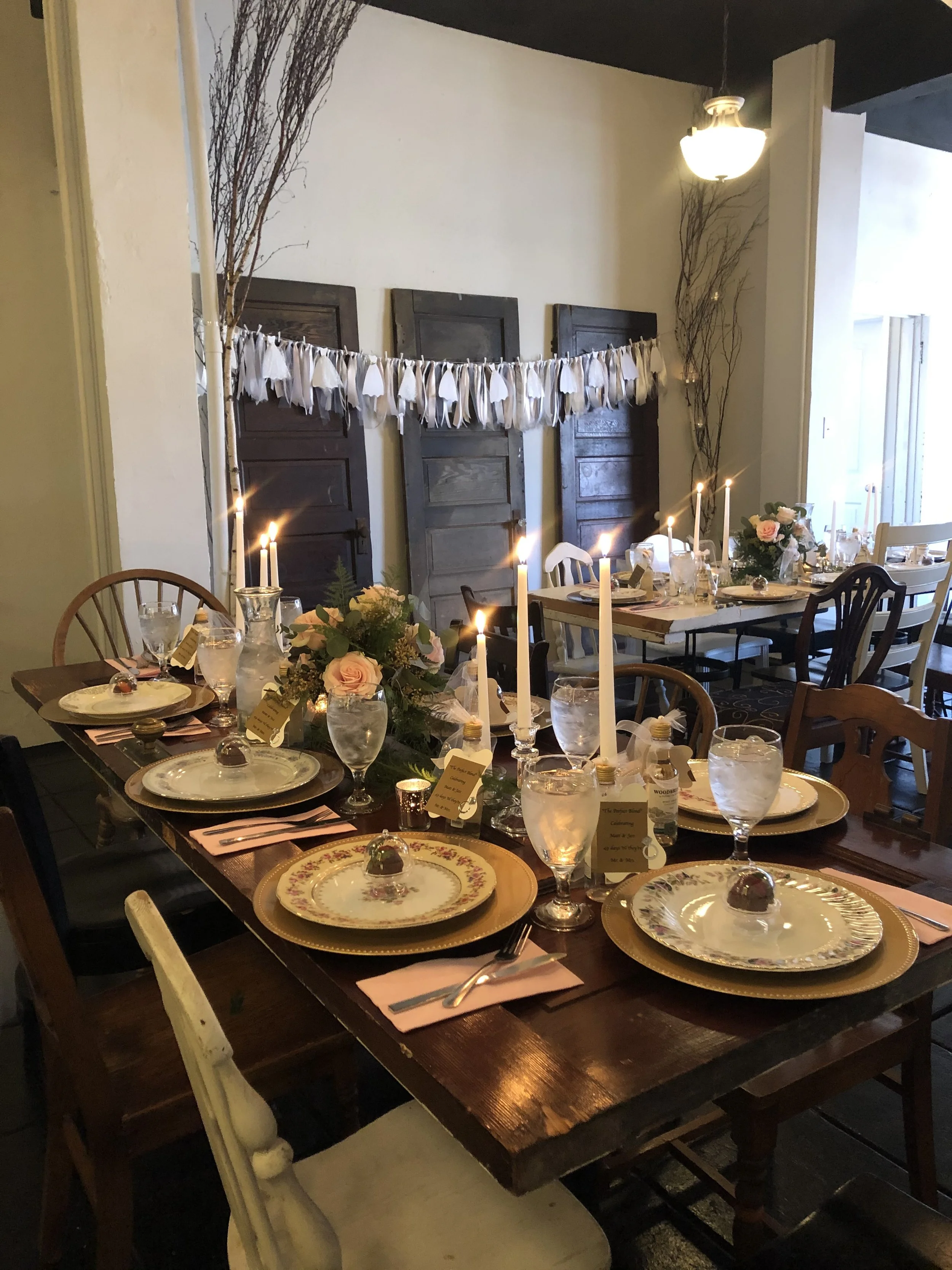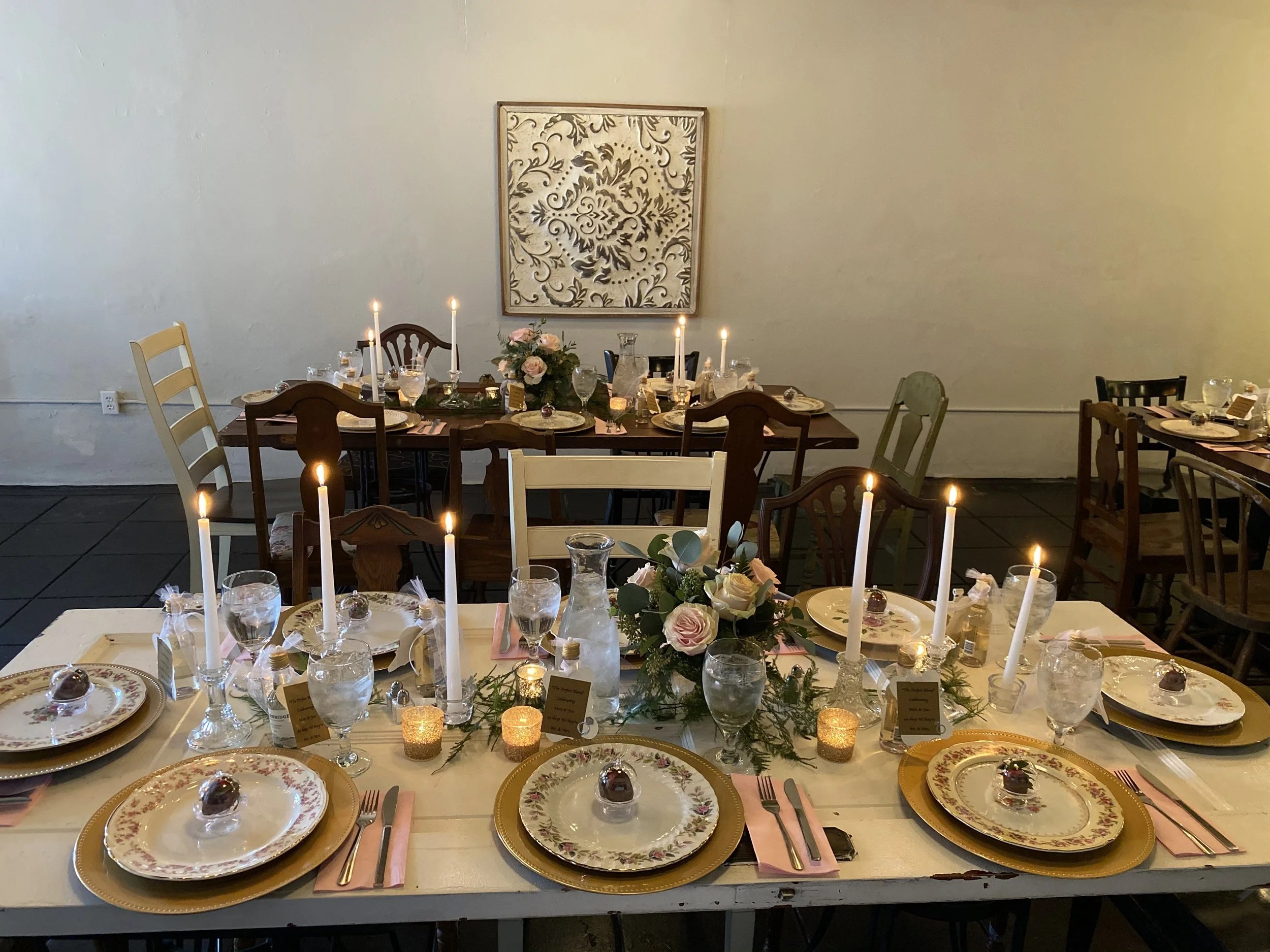 A dining table set for a formal event with candles, floral arrangements, china plates, glasses, and cutlery in a decorated room.
