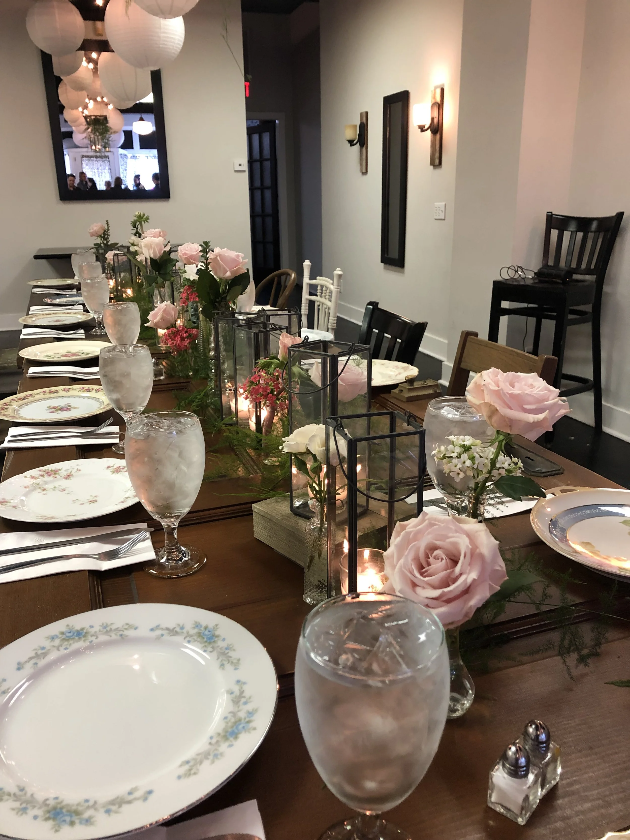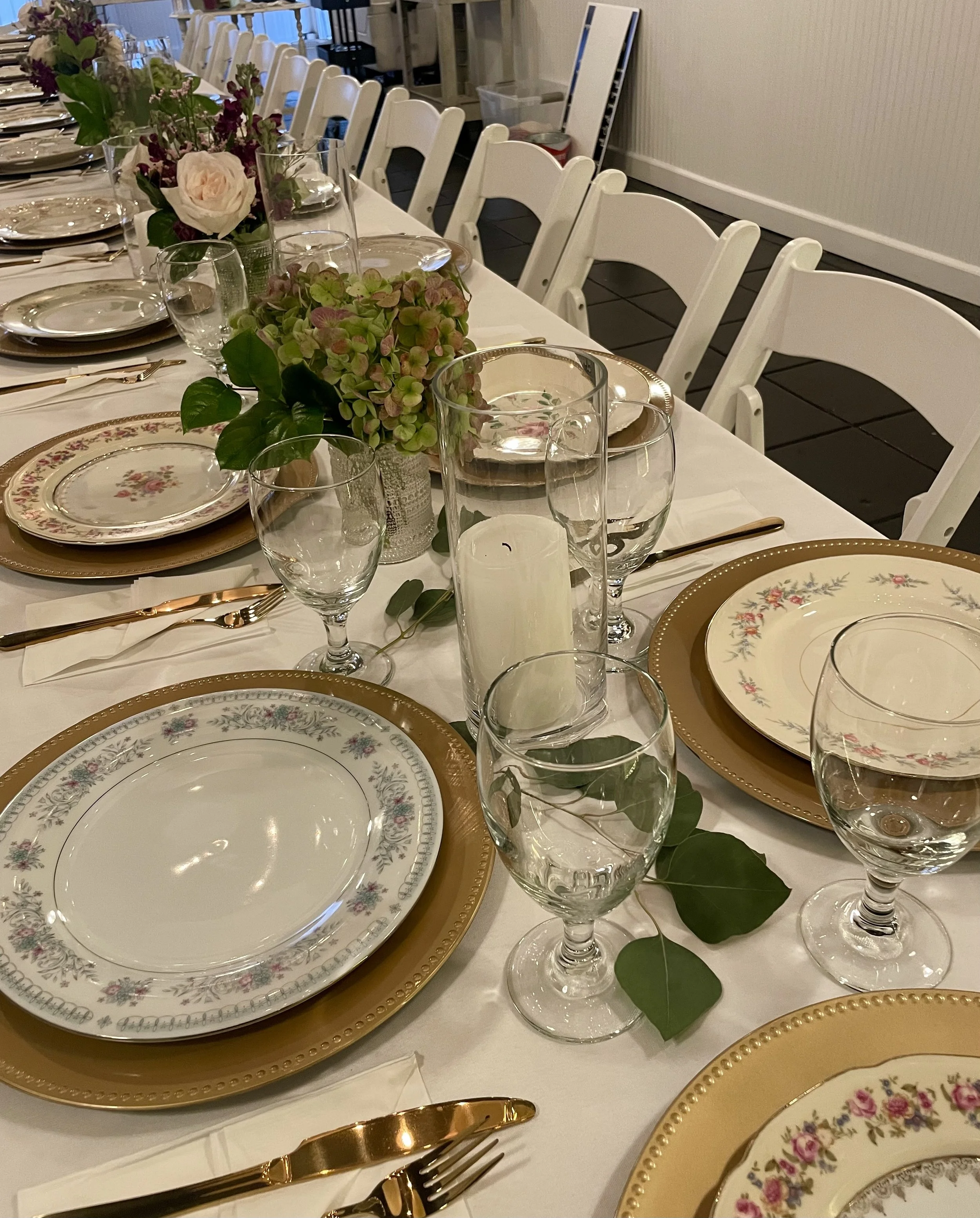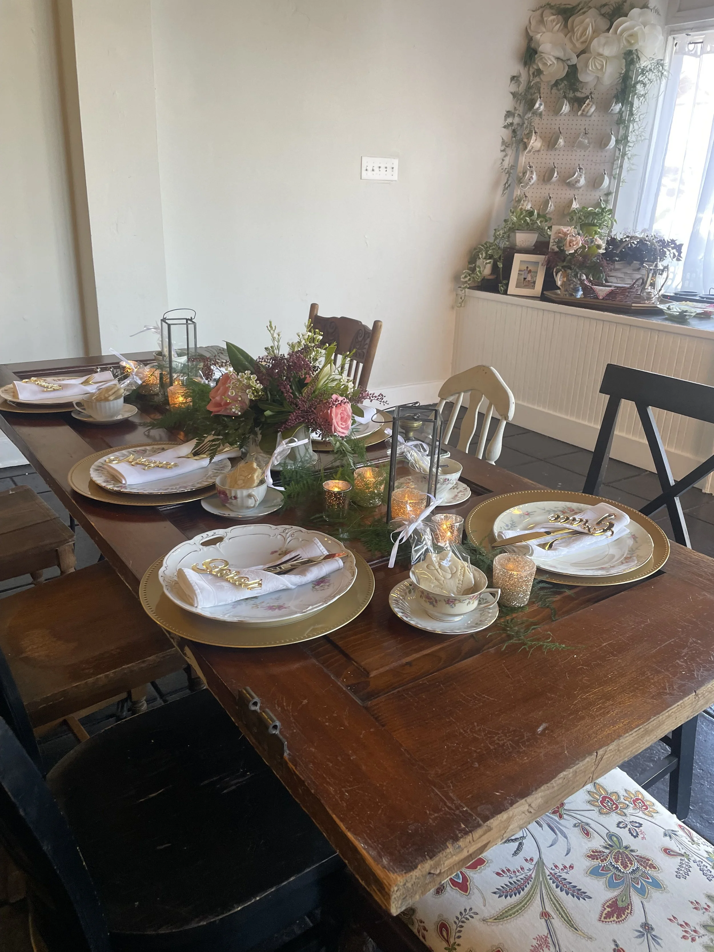 A dining table set for a formal event with candles, floral arrangements, china plates, glasses, and cutlery in a decorated room.