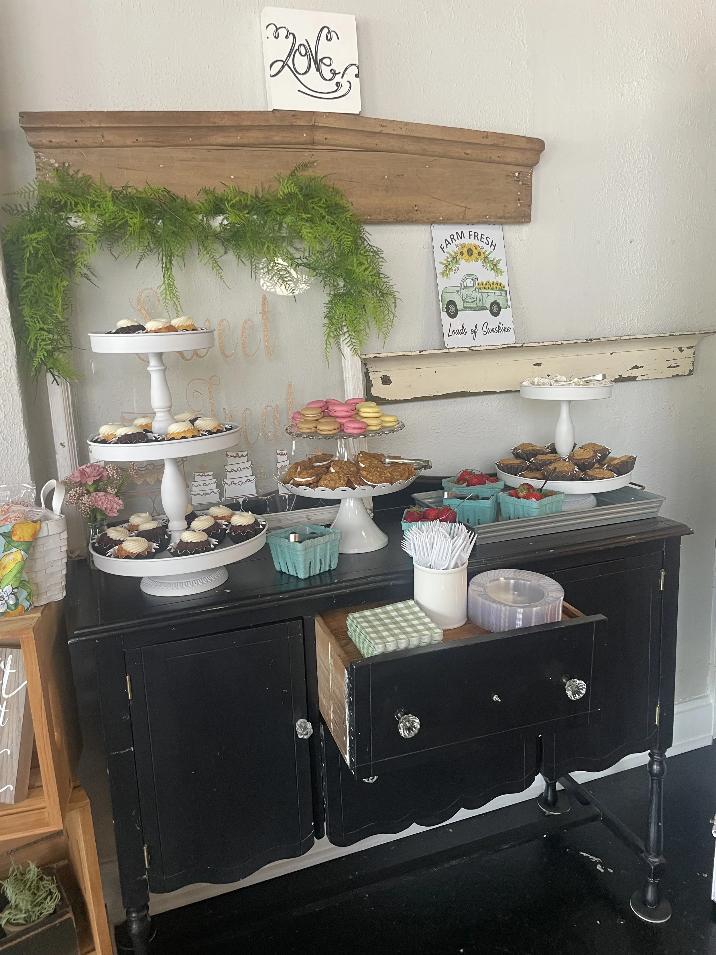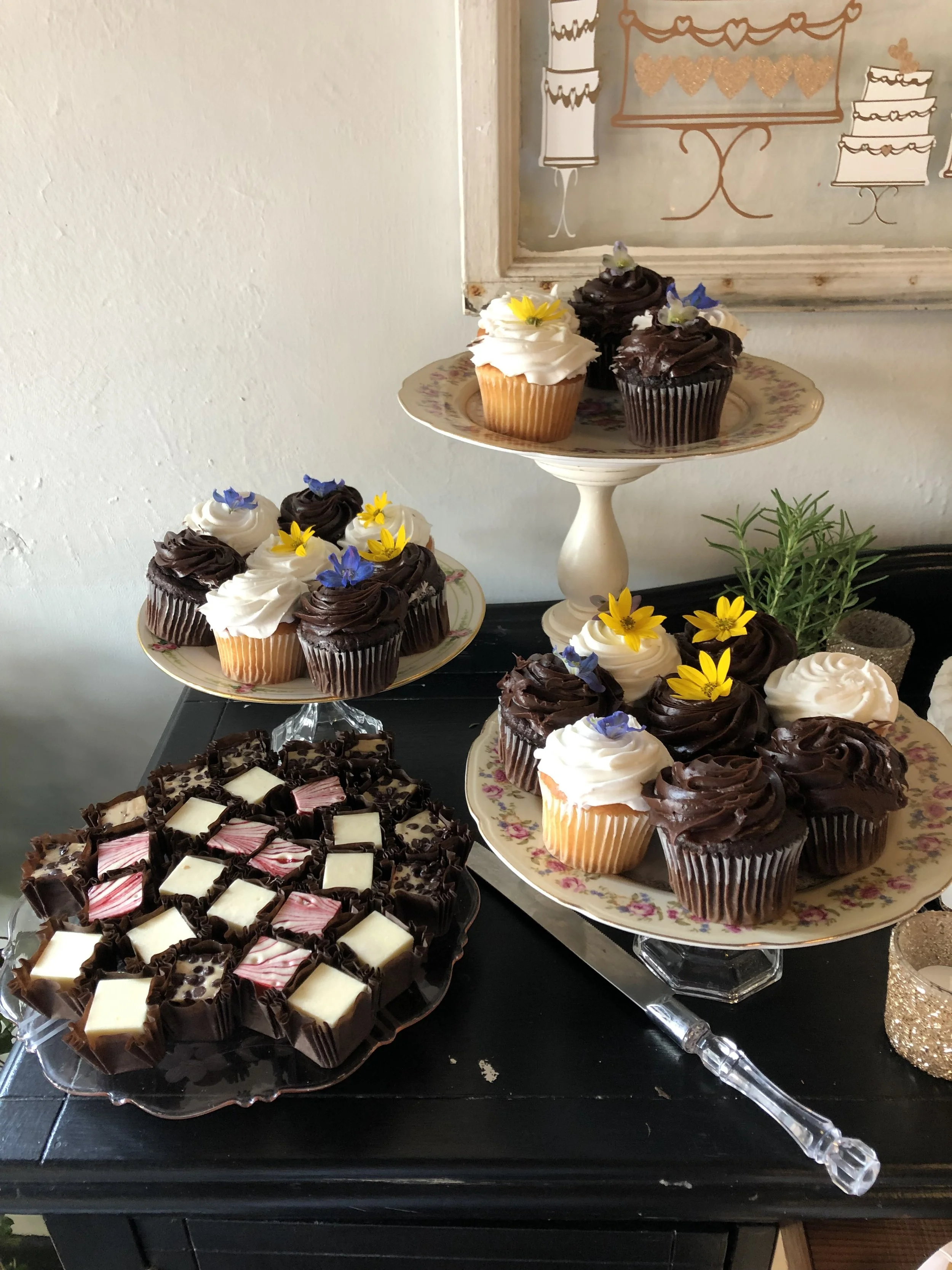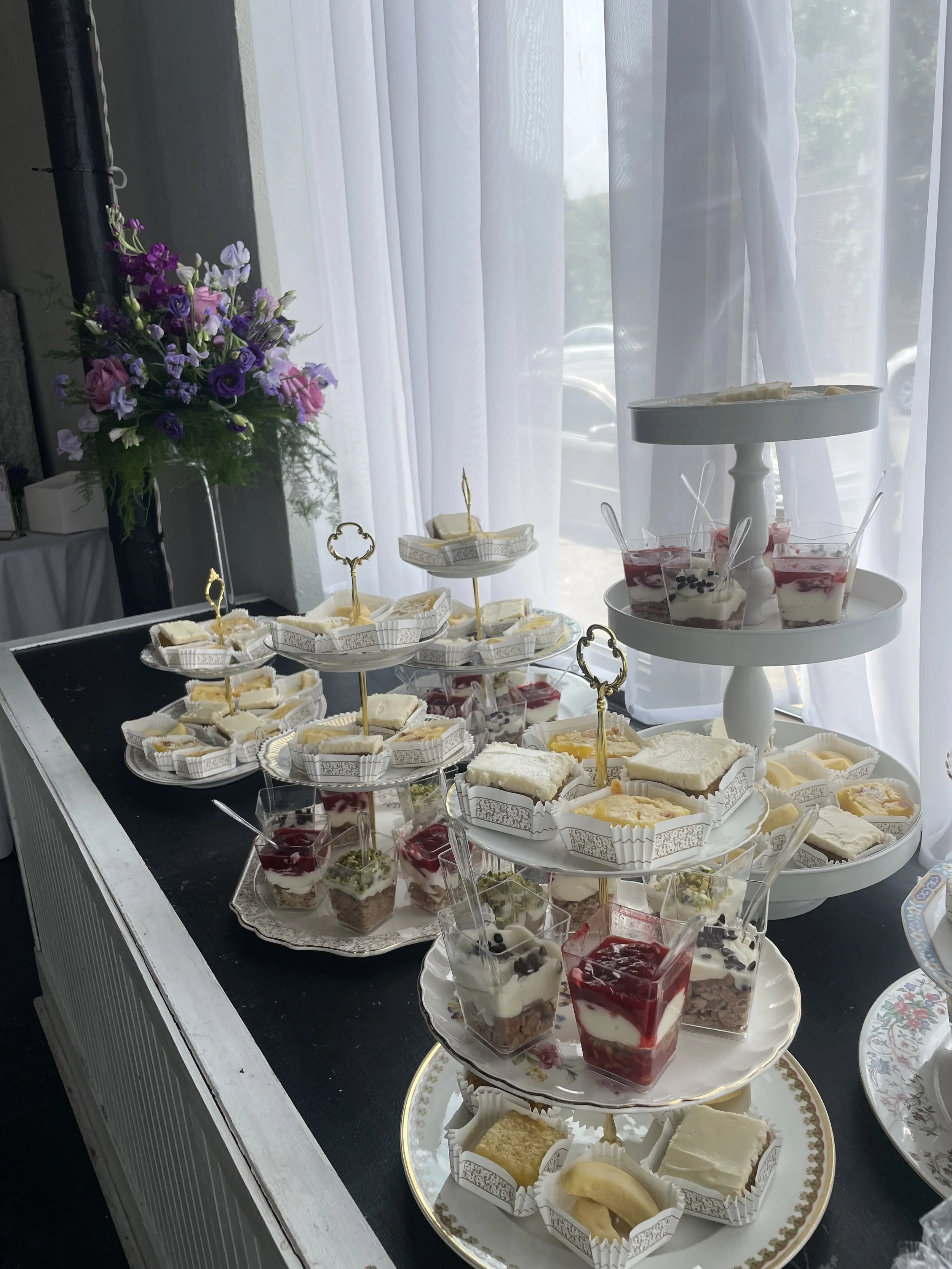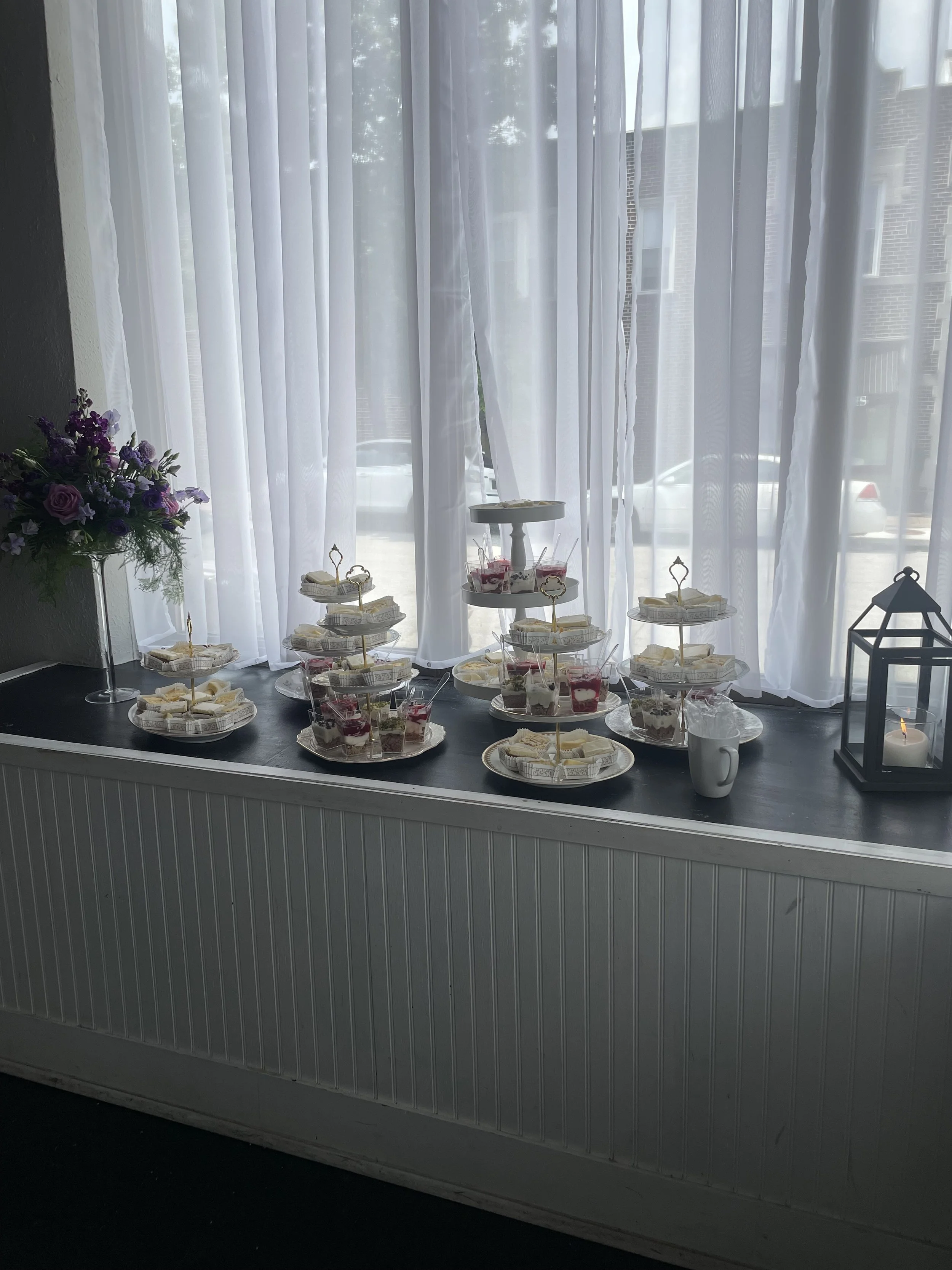 A dessert table with various cupcakes, parfaits, cookies, and small flower arrangements near a window with white curtains, set up for a celebration.