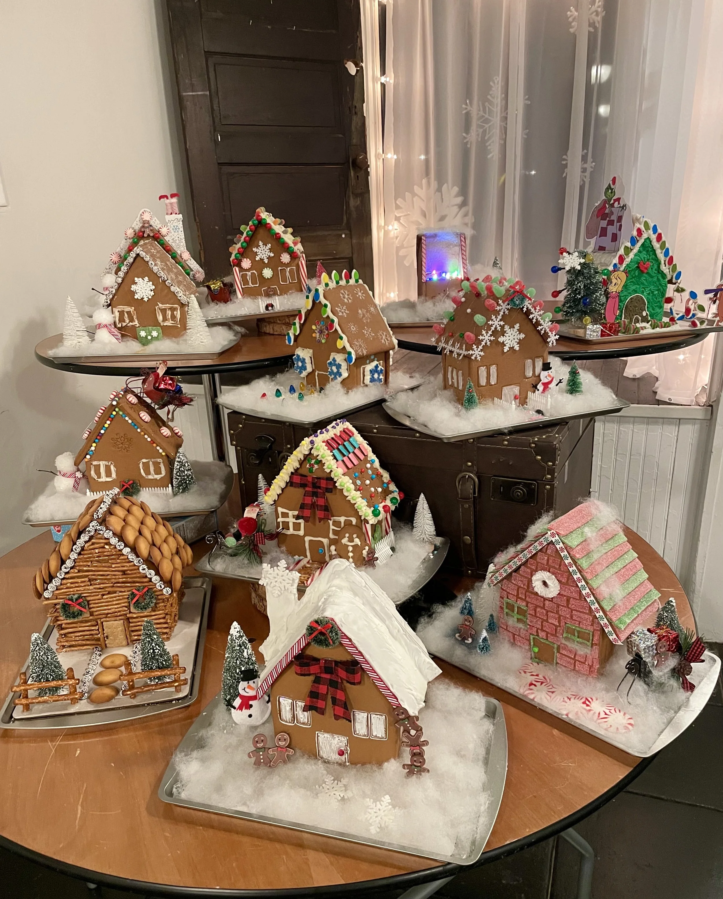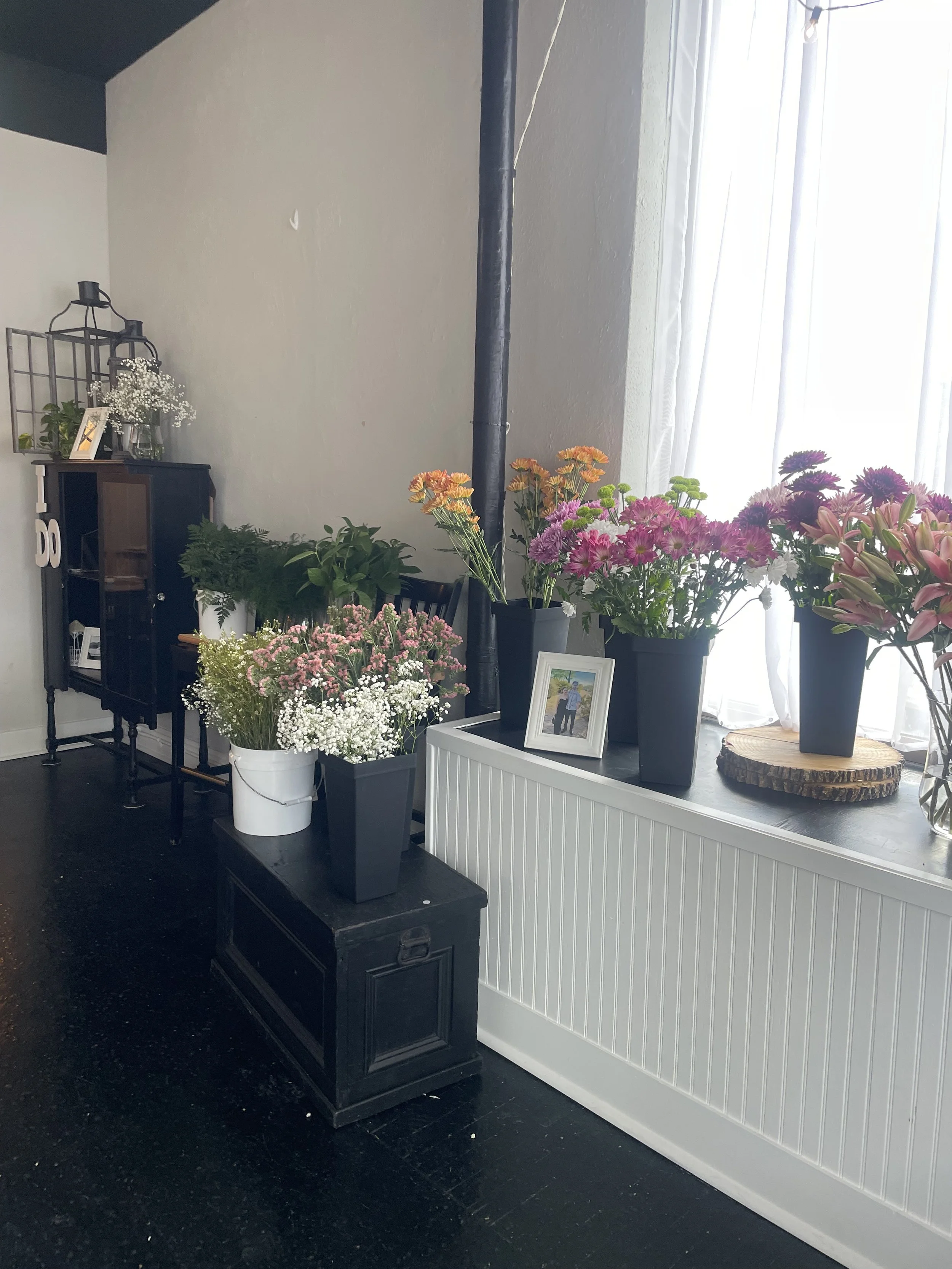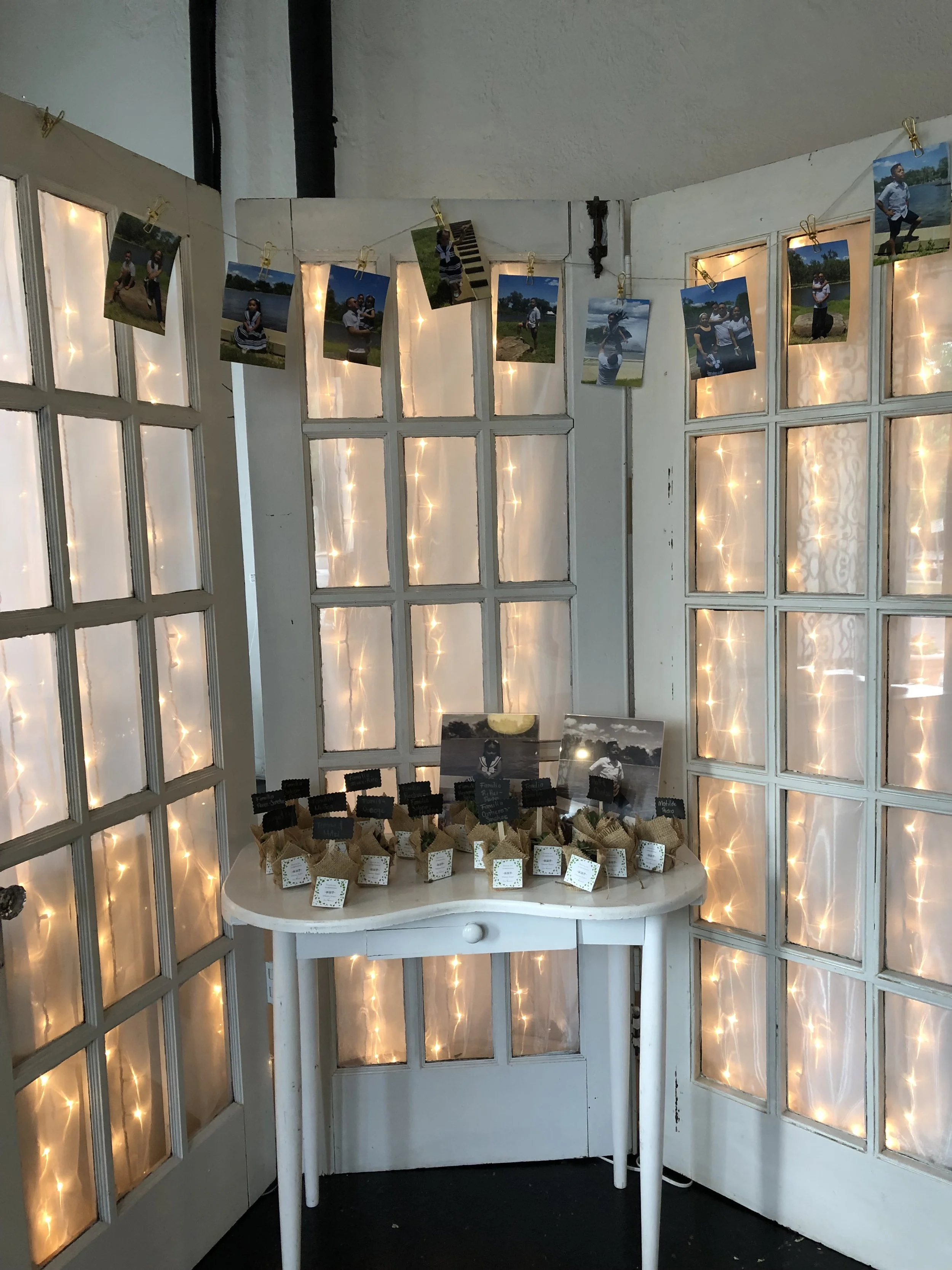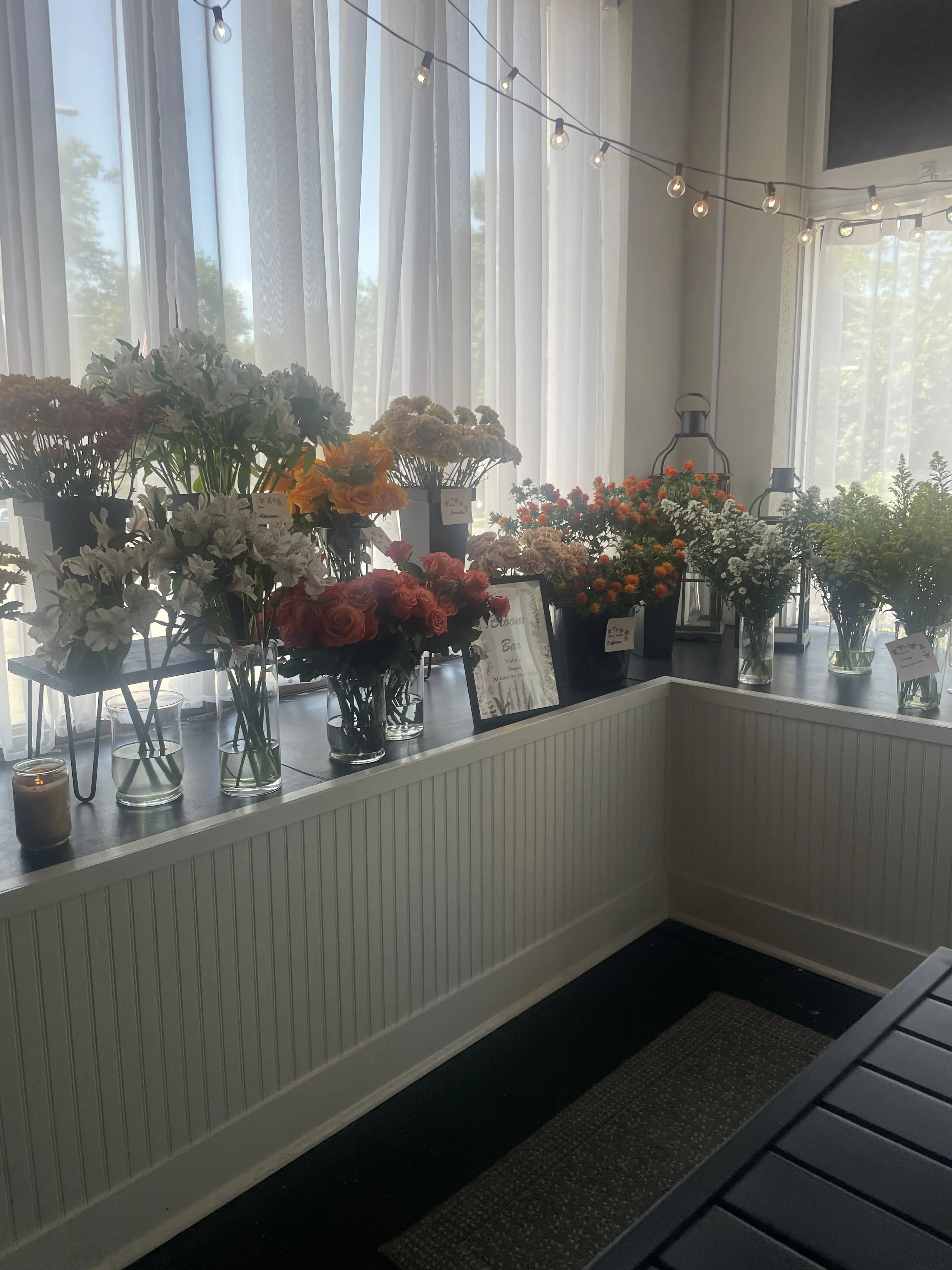 Flower display with various colorful flowers in glass vases on a dark table near a window with white curtains, decorated with string lights.
