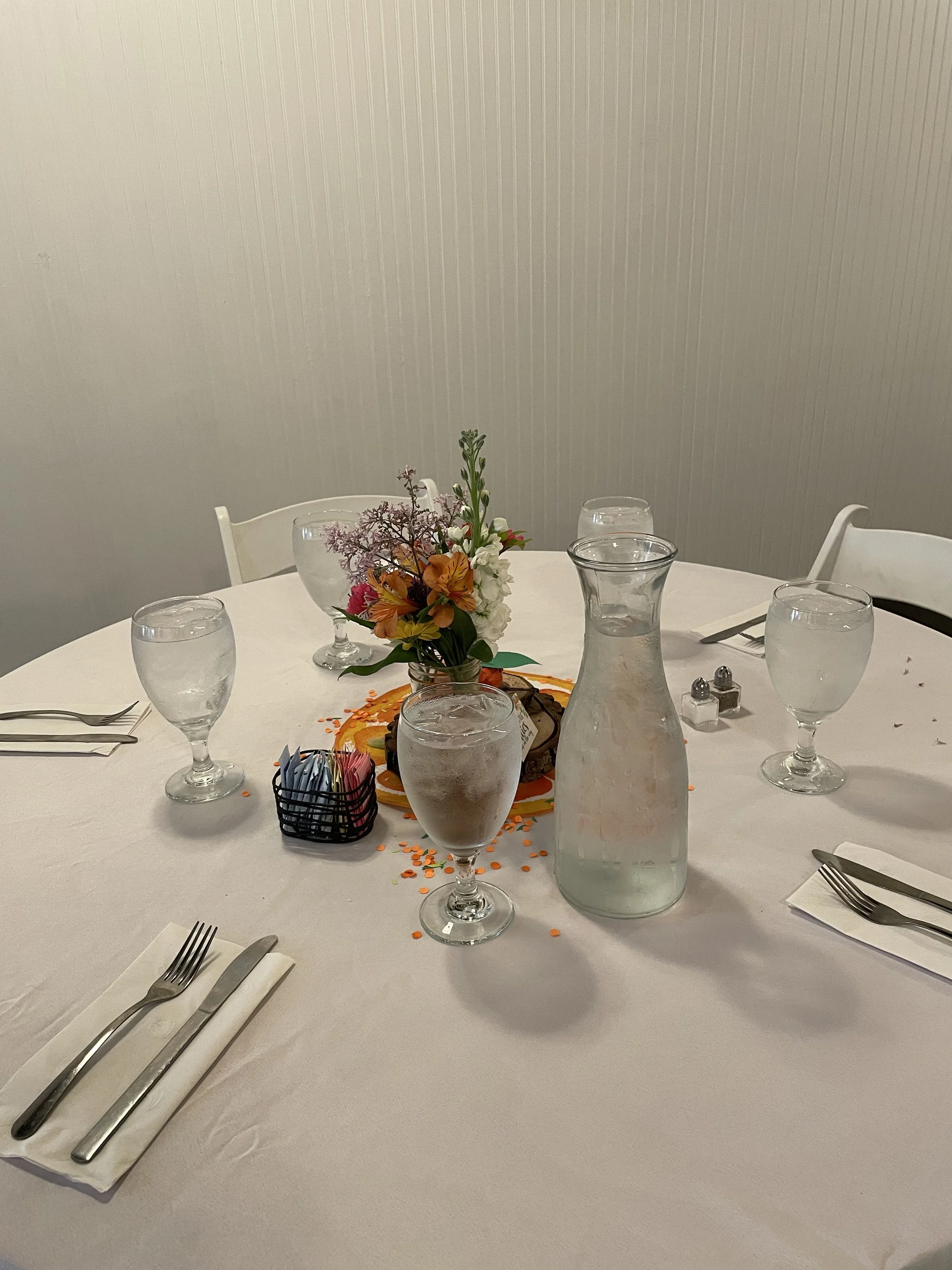 Round dining table set with water glasses, a water pitcher, a floral centerpiece, salt and pepper shakers, and silverware on a white tablecloth.
