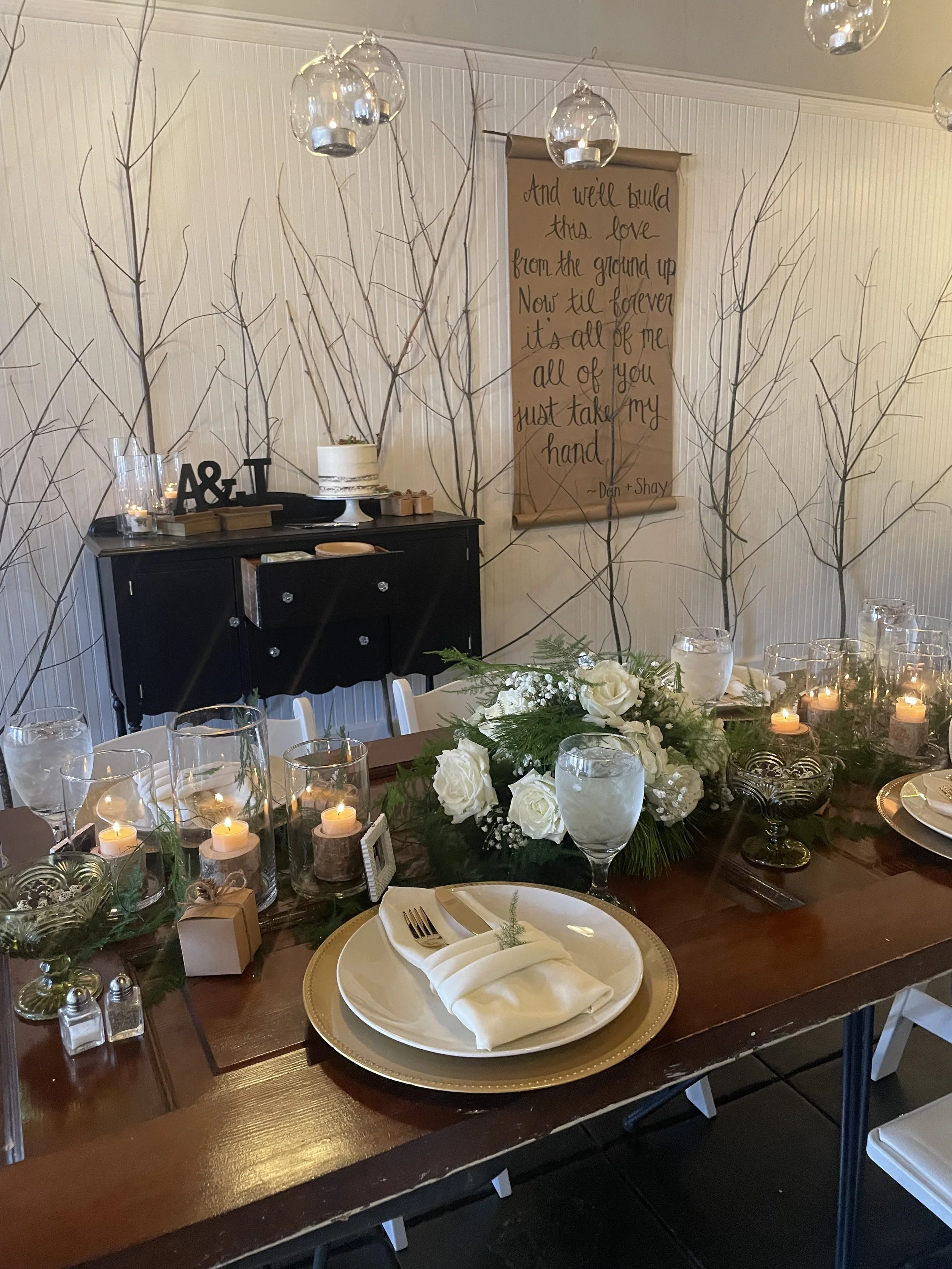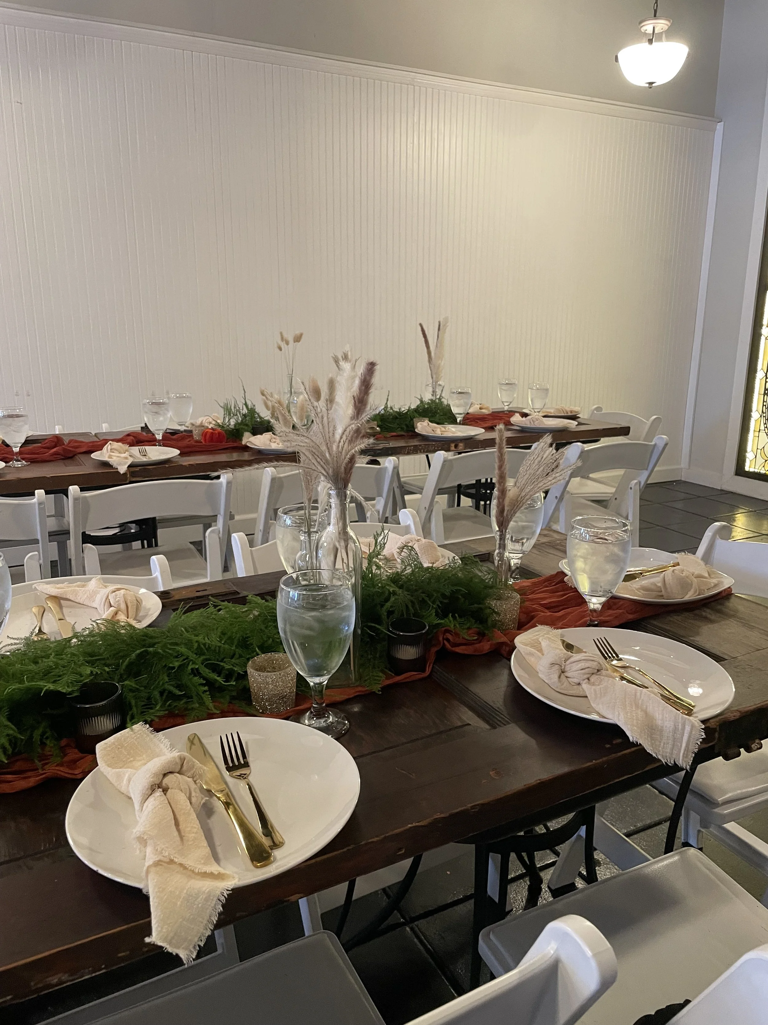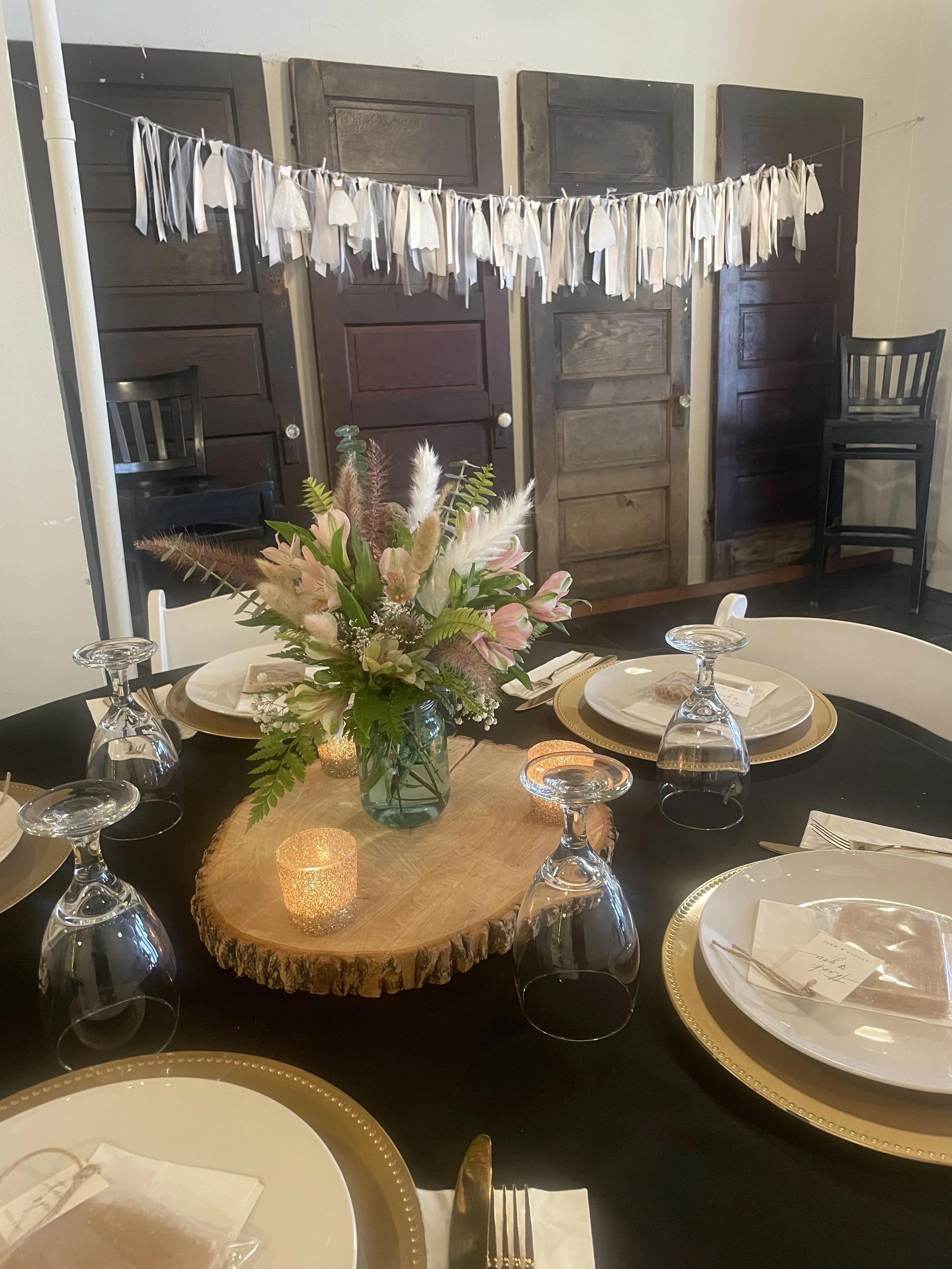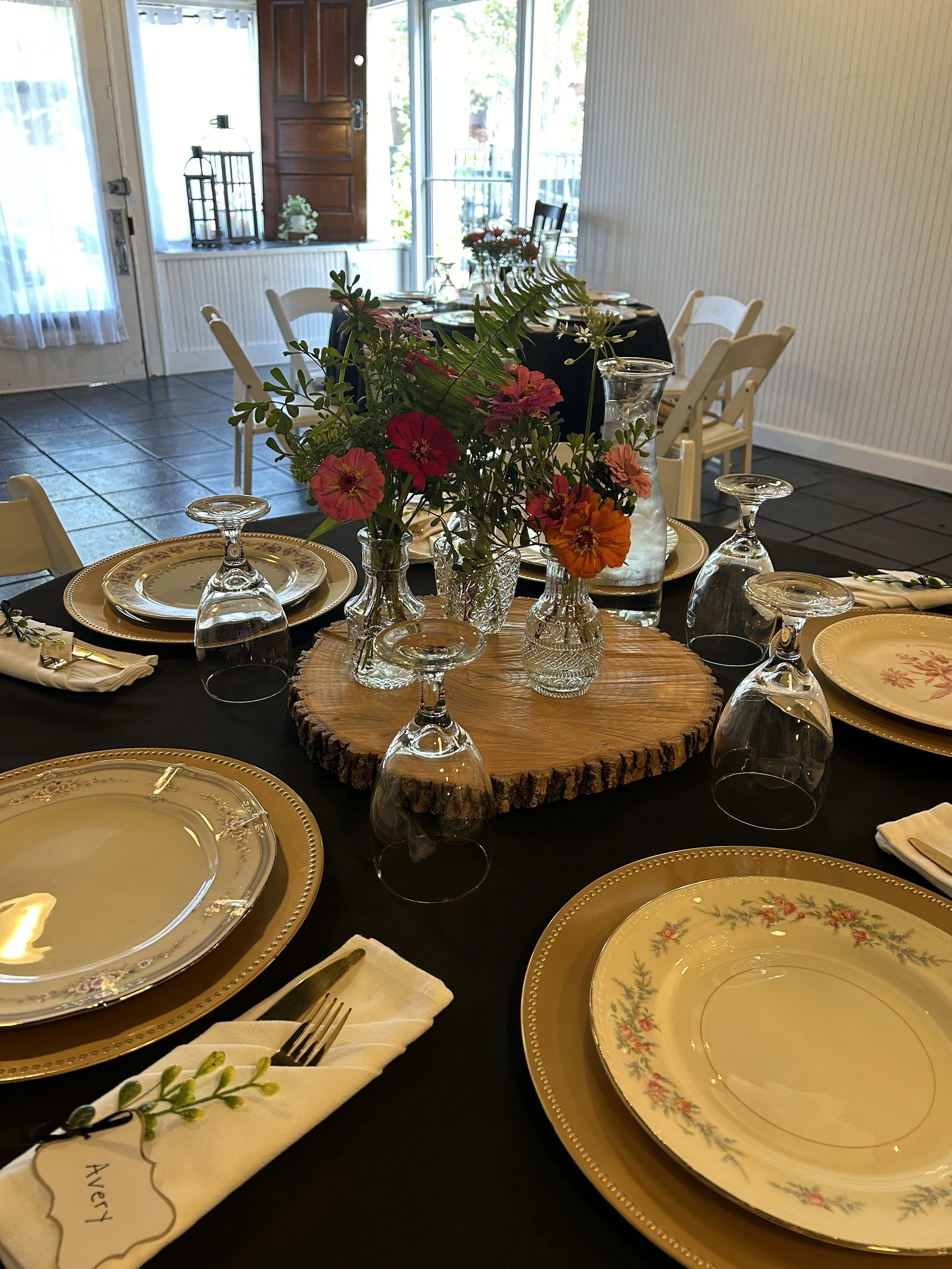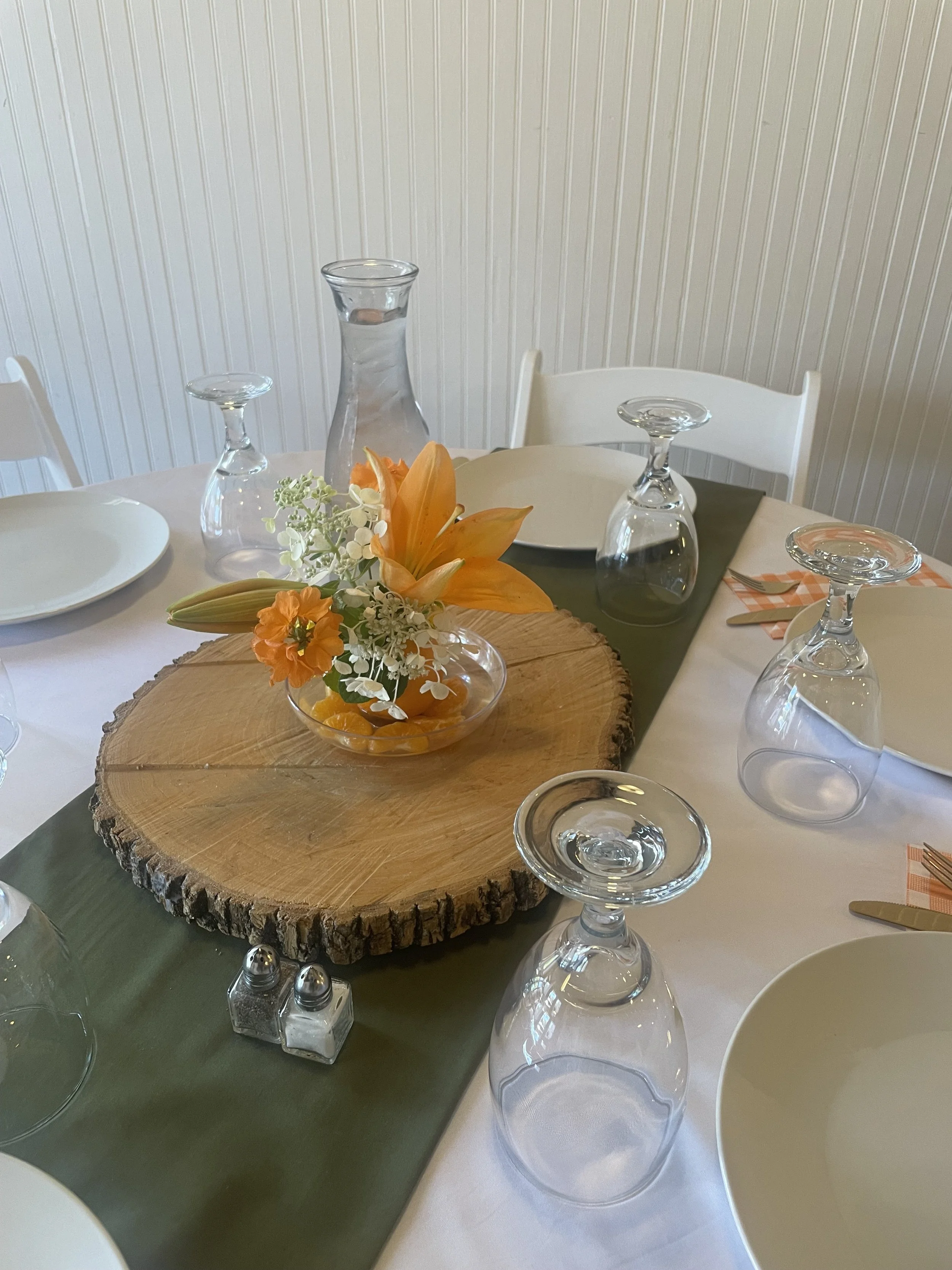 A dining table set with white plates, upside-down wine glasses, a wood slice centerpiece with orange flowers and yellow lilies, a glass vase, and a salt and pepper shaker on a green runner, in a room with white wood-paneled walls.