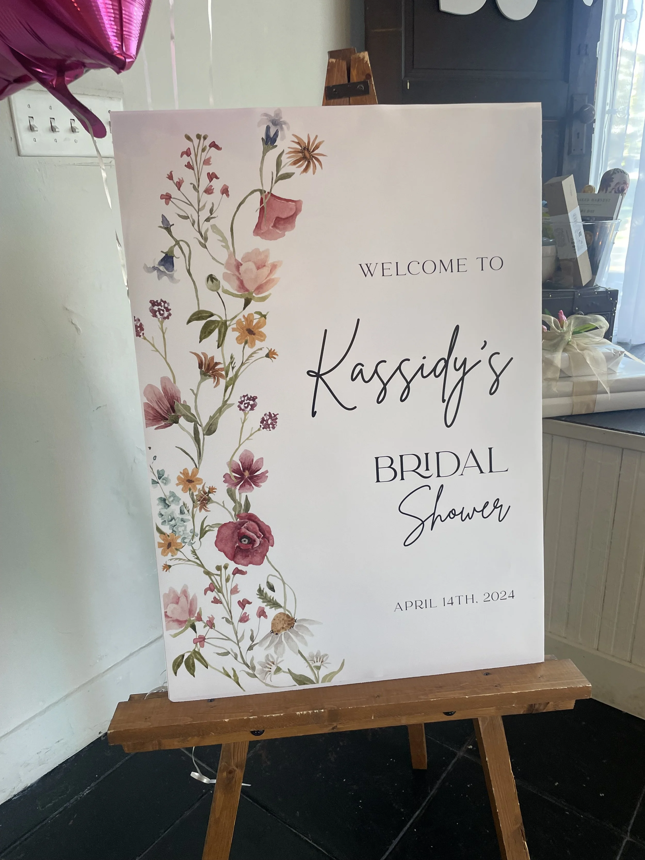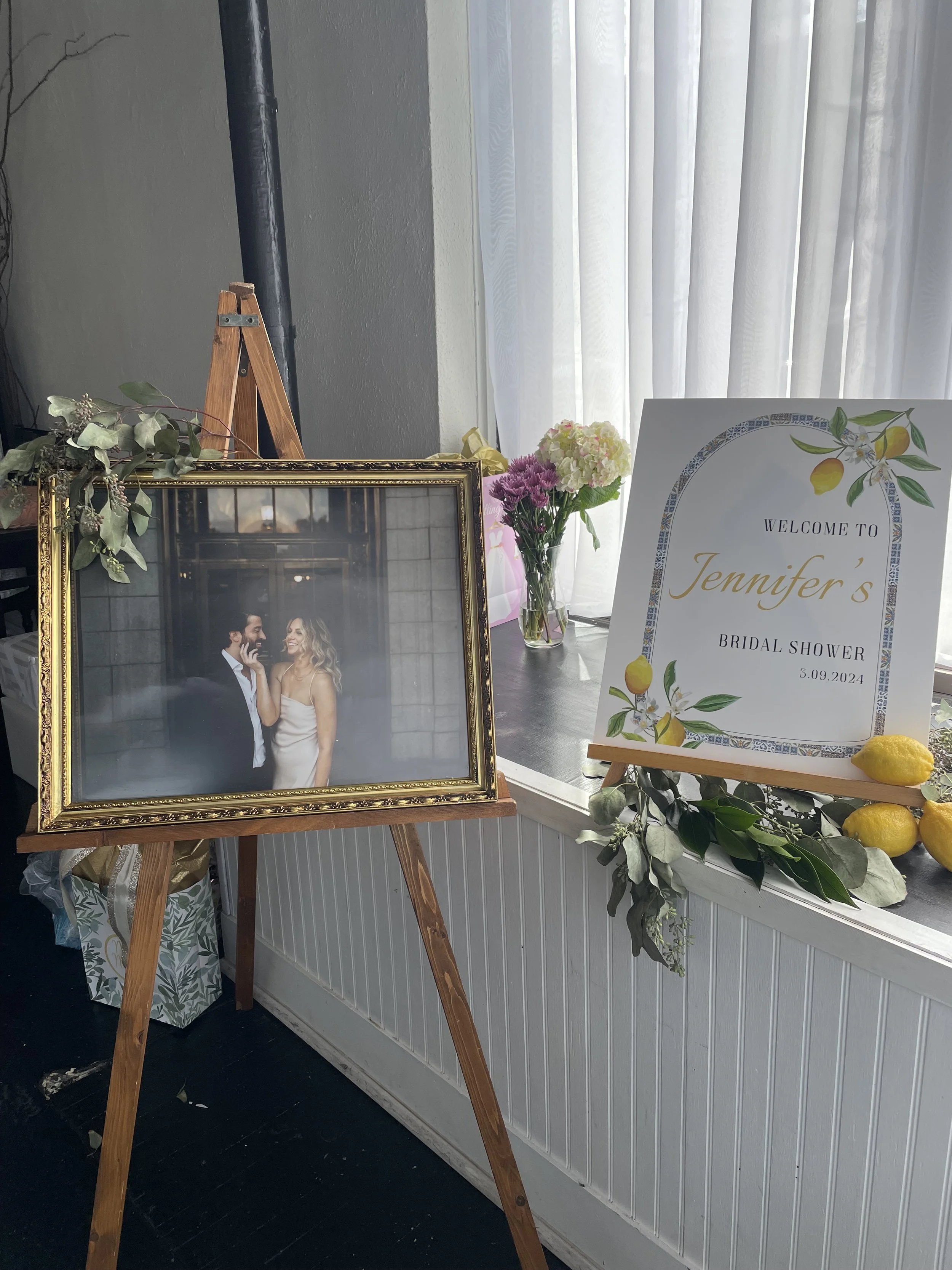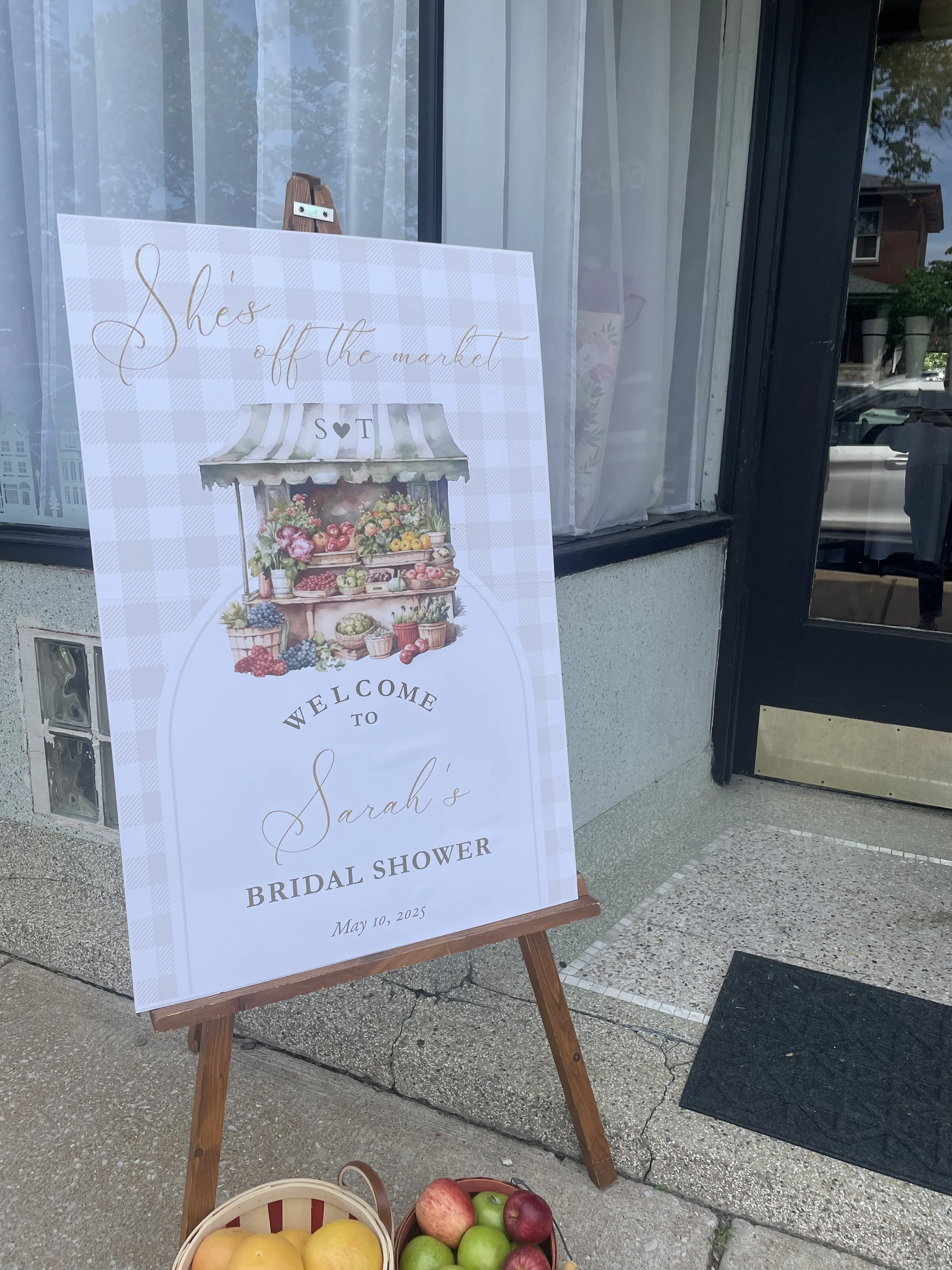 A large welcome sign on an easel outside a building with a display of apples and a basket of yellow peaches or nectarines placed on the ground in front of it. The sign reads 'She's off the market, welcoming to Sarah's bridal shower, May 10, 2025,' wi