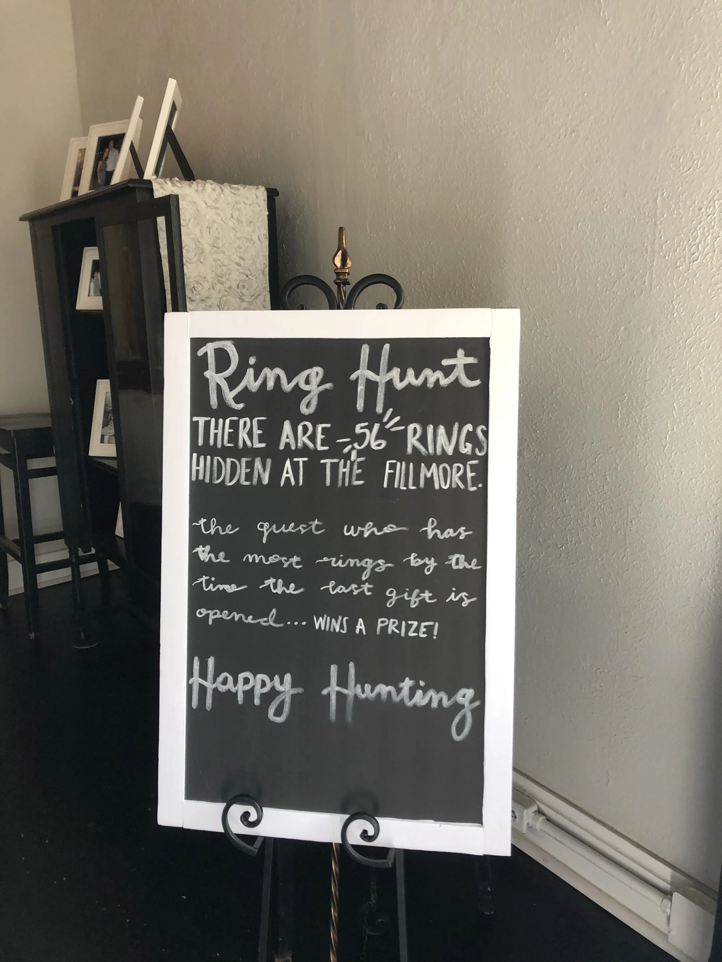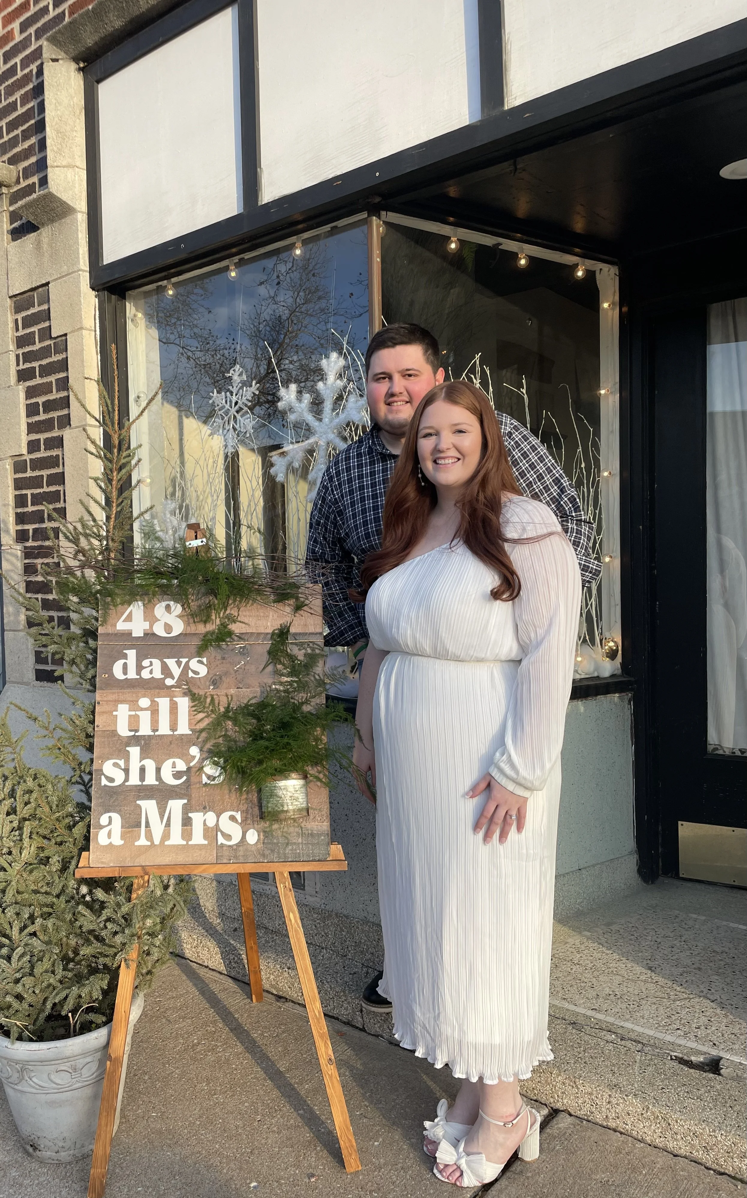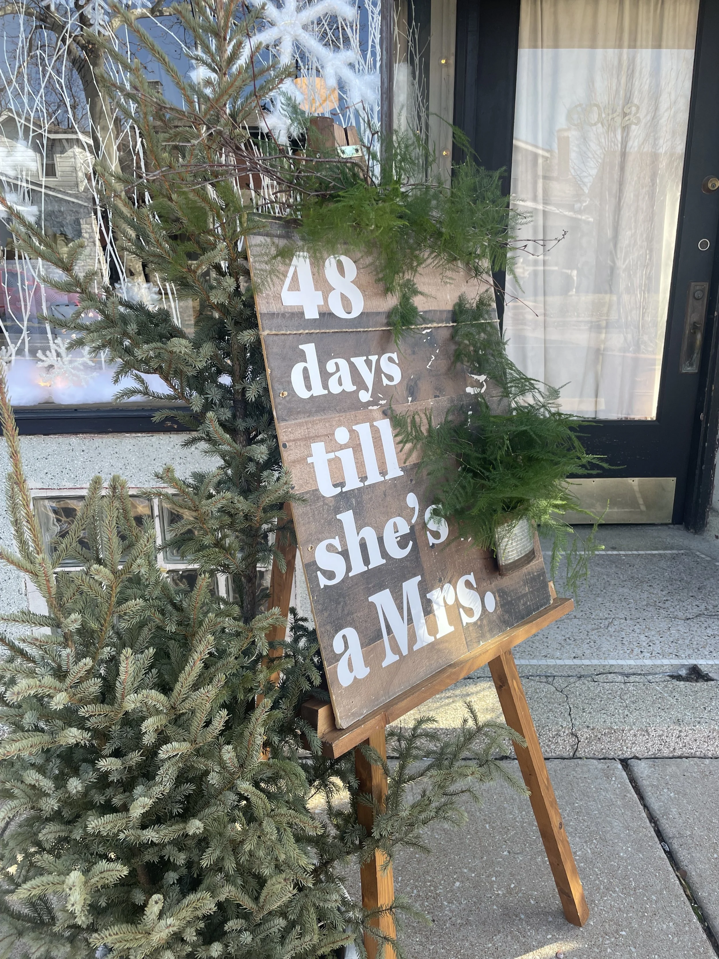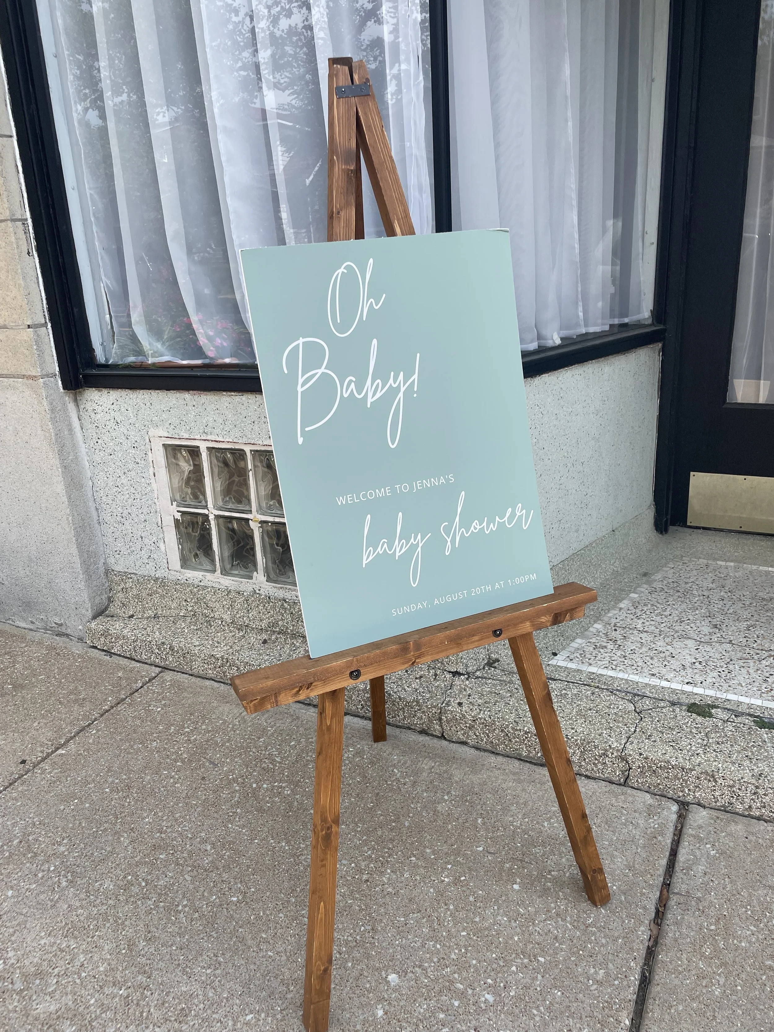 A large welcome sign on an easel outside a building with a display of apples and a basket of yellow peaches or nectarines placed on the ground in front of it. The sign reads 'She's off the market, welcoming to Sarah's bridal shower, May 10, 2025,' wi
