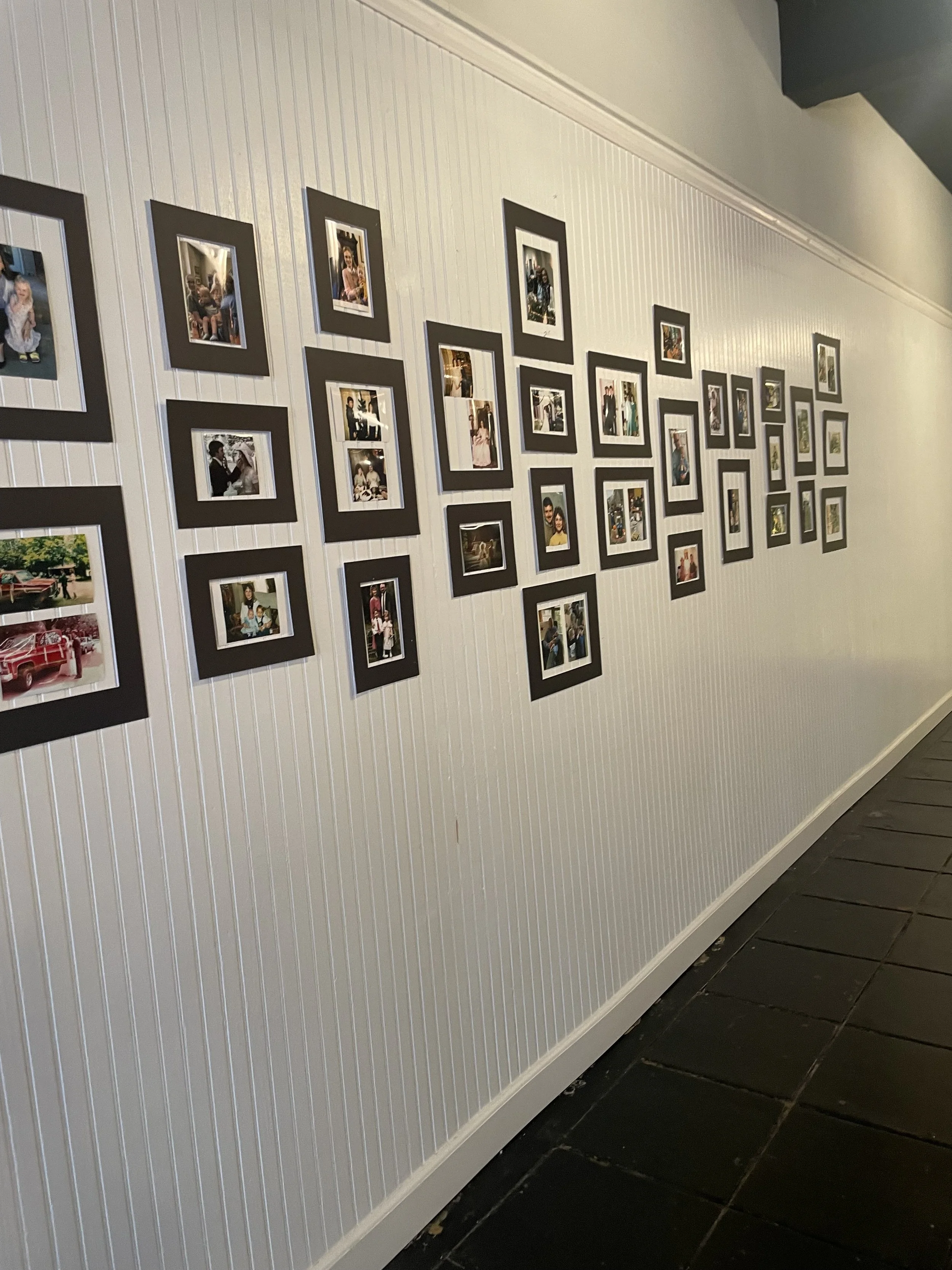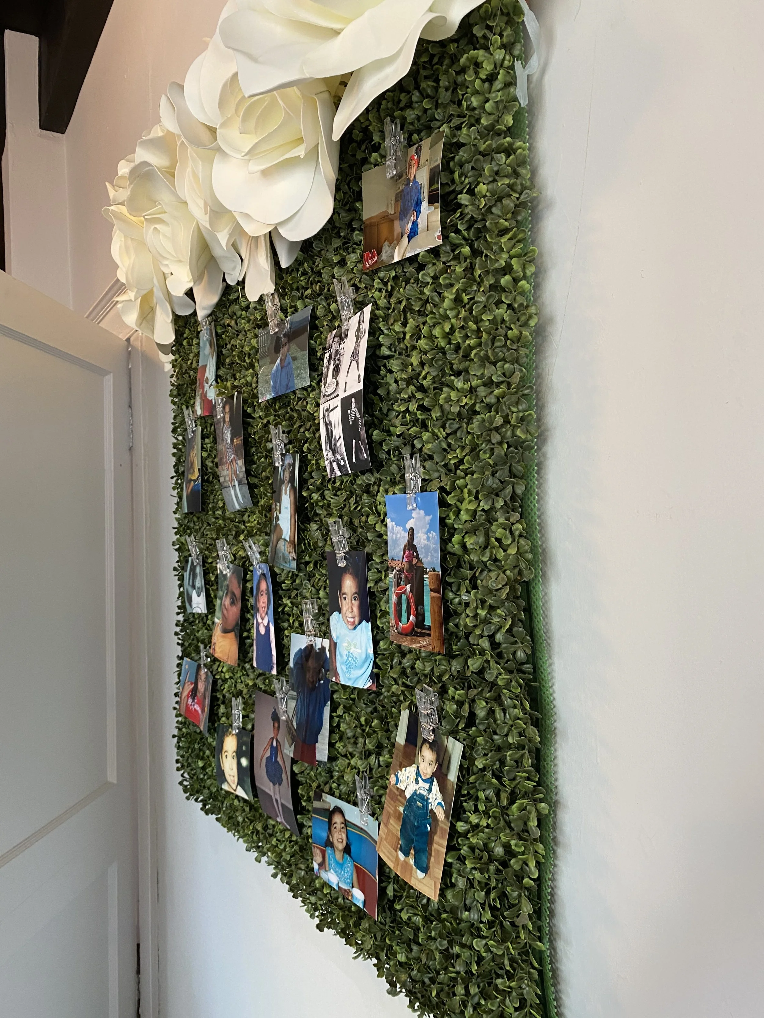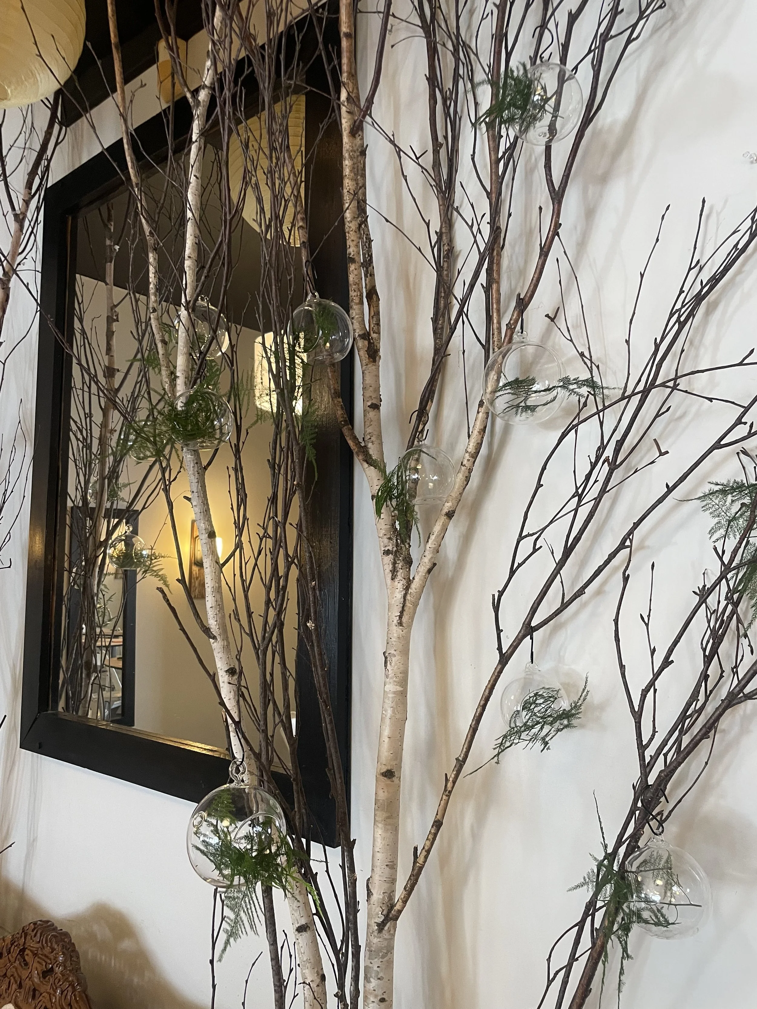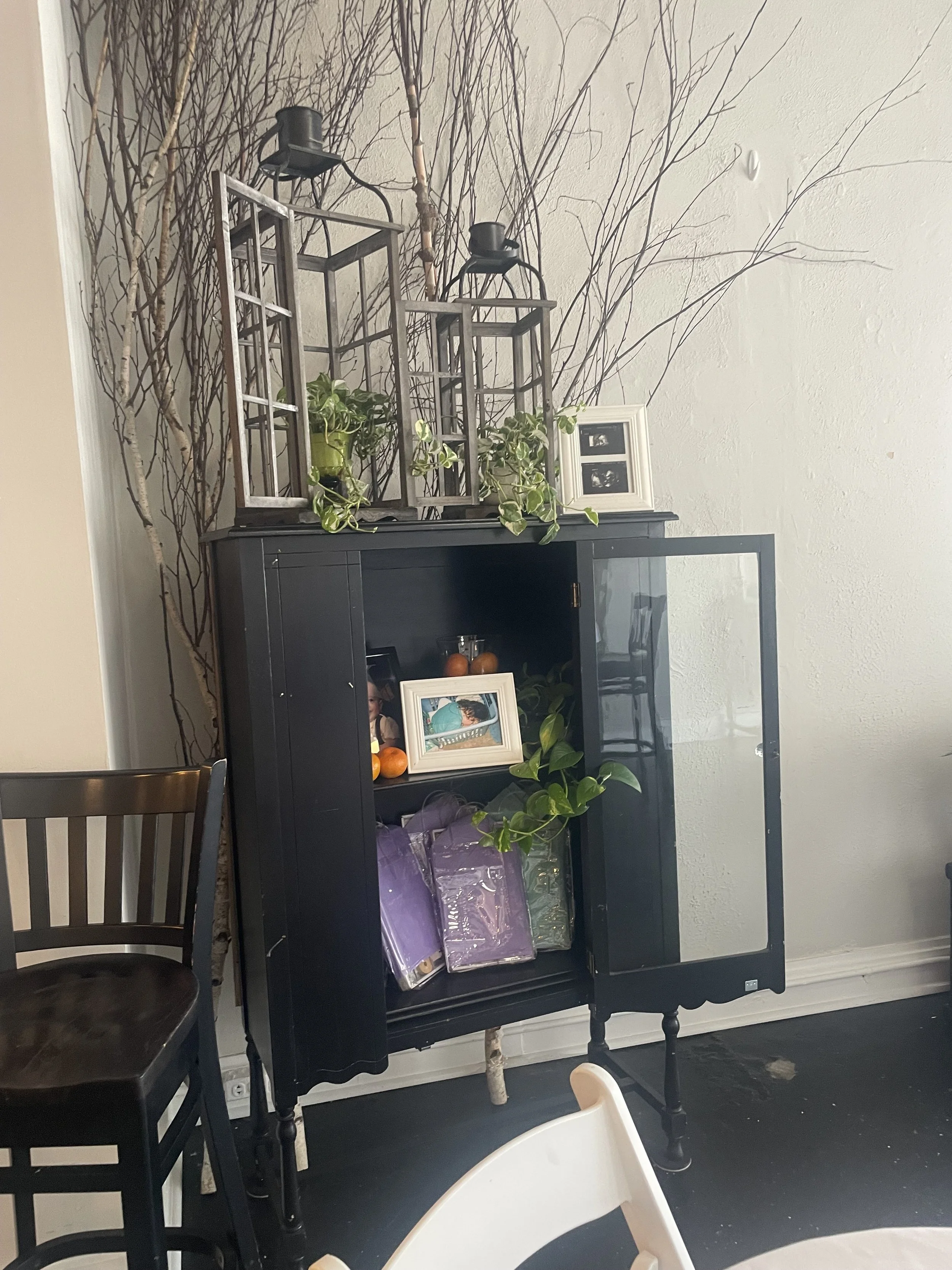 Decorative black cabinet with potted plants, framed photos, and bags of gift wrap on open shelf, against a wall with decorative branches and small framed pictures on top.