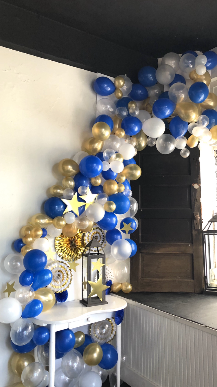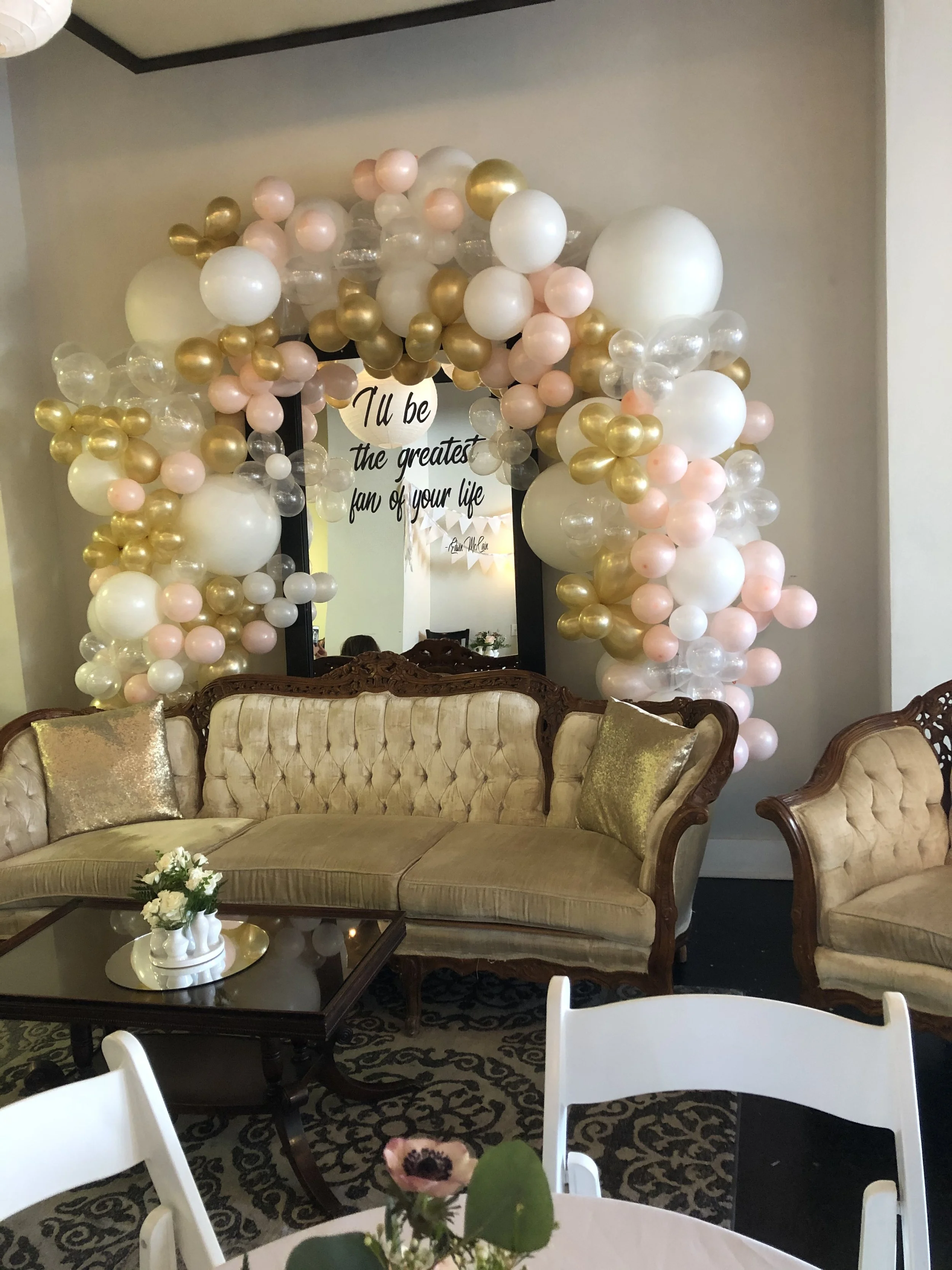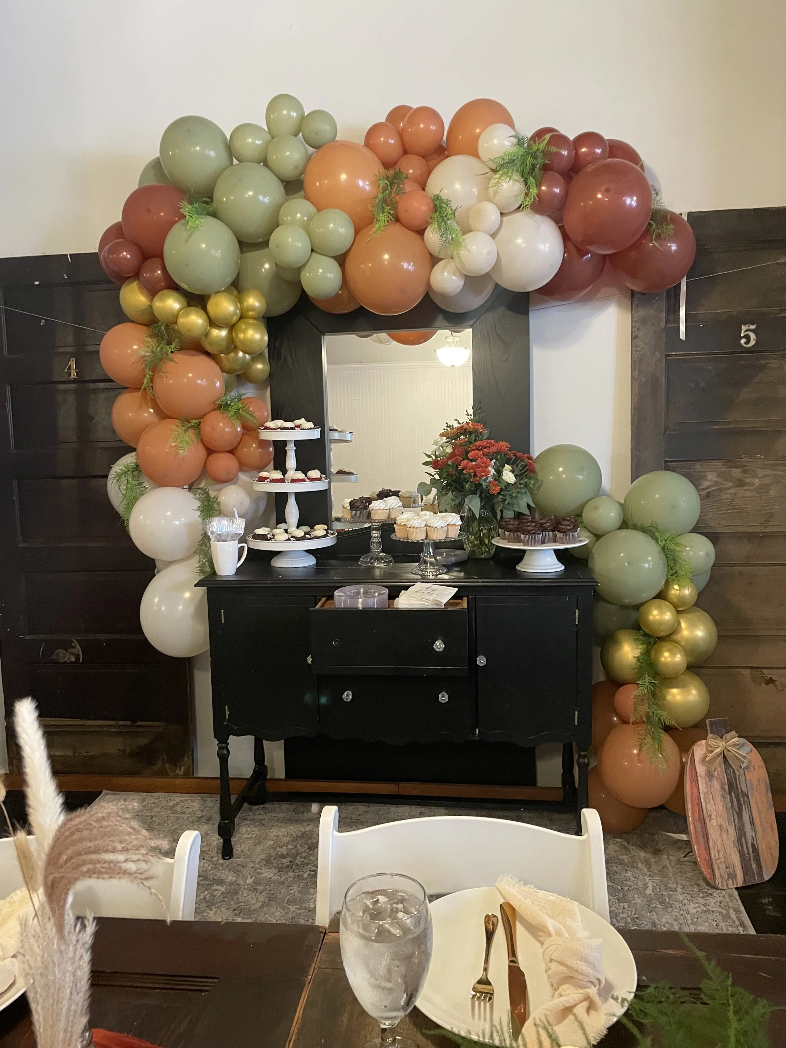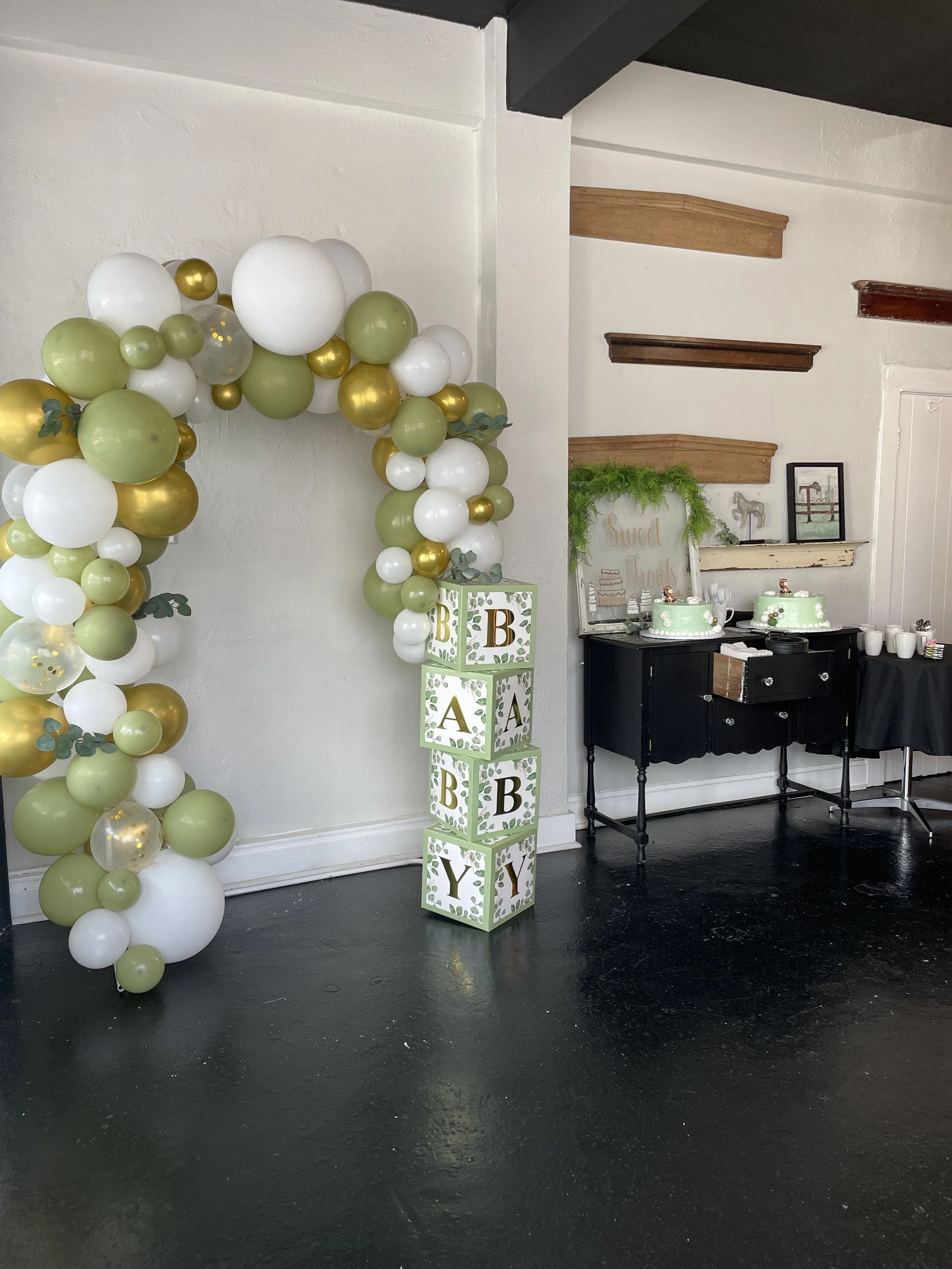 Balloon arch made of white, gold, and light green balloons near a stack of alphabet blocks with the letters A, B, and Y, in a decorated room with desserts and greenery.