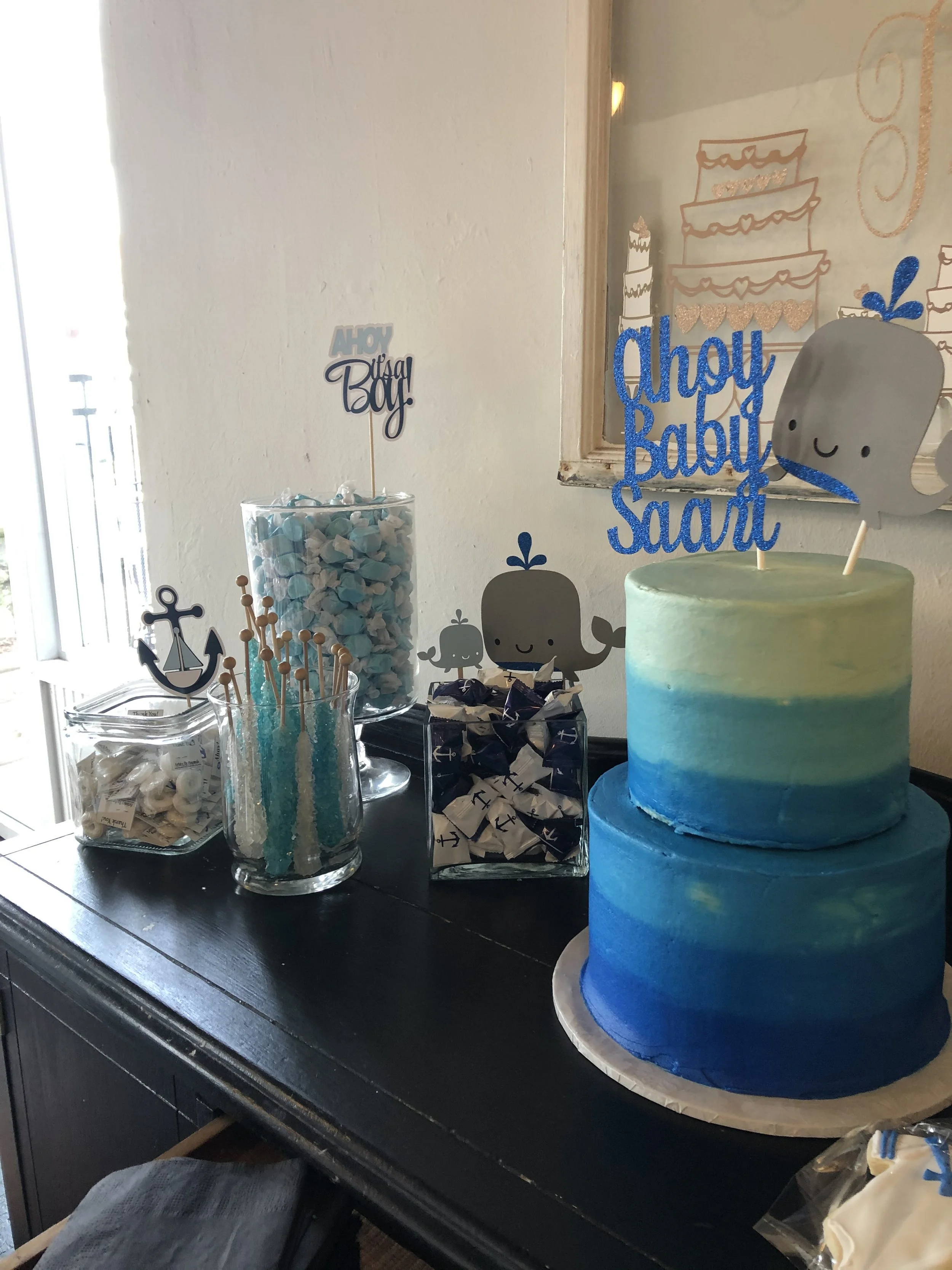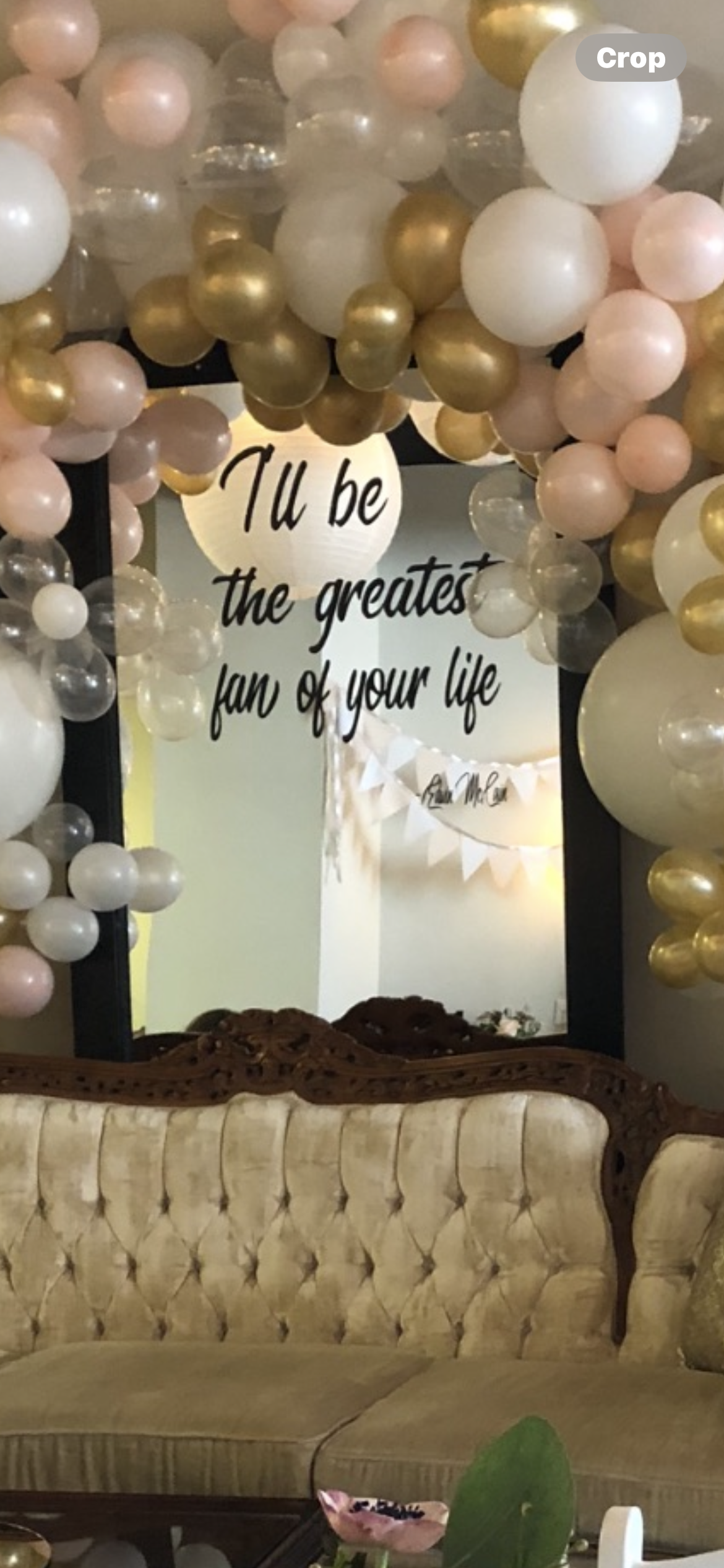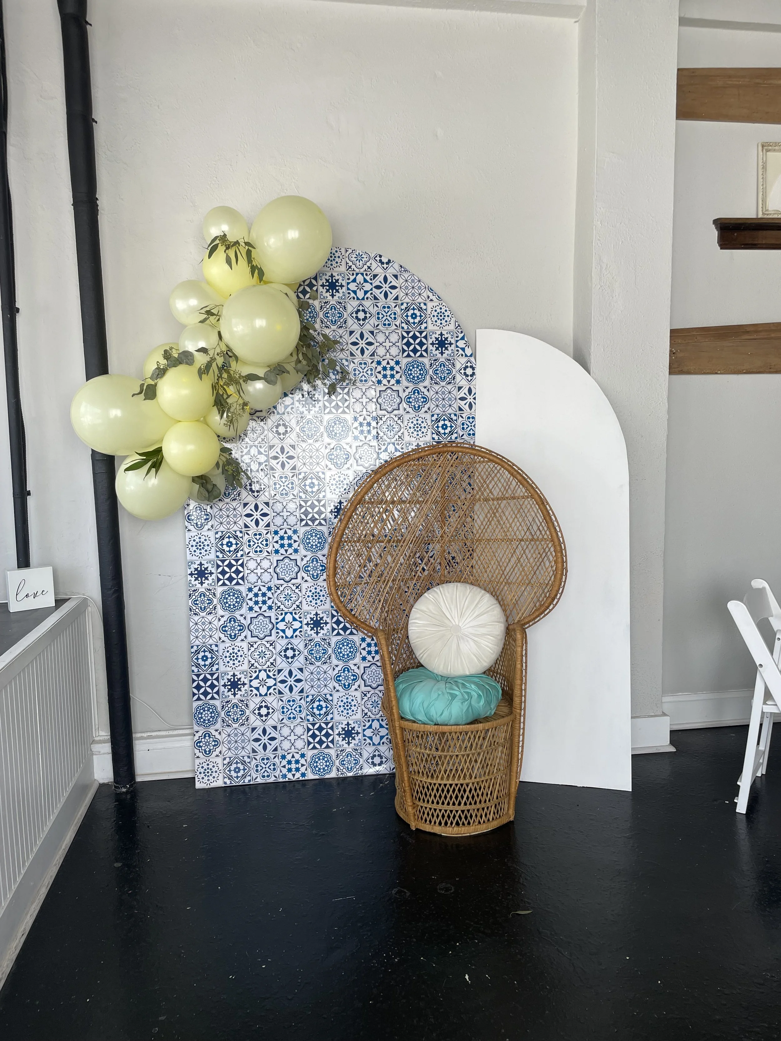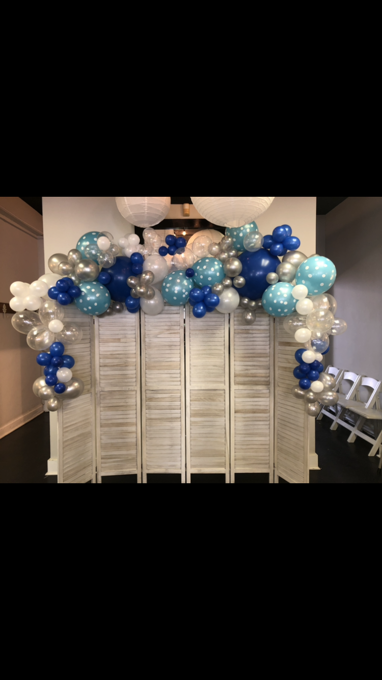 Balloon arch made of white, gold, and light green balloons near a stack of alphabet blocks with the letters A, B, and Y, in a decorated room with desserts and greenery.