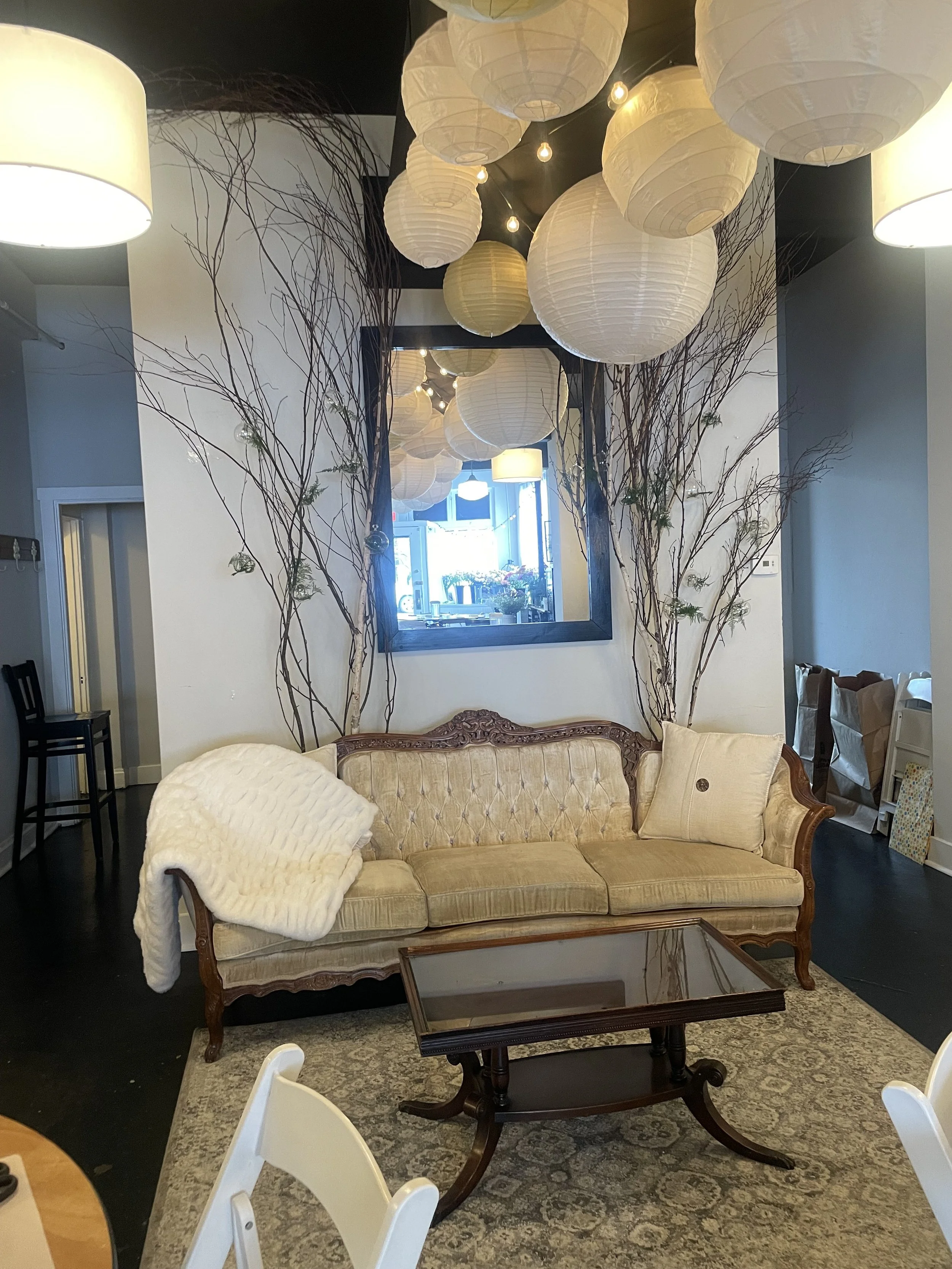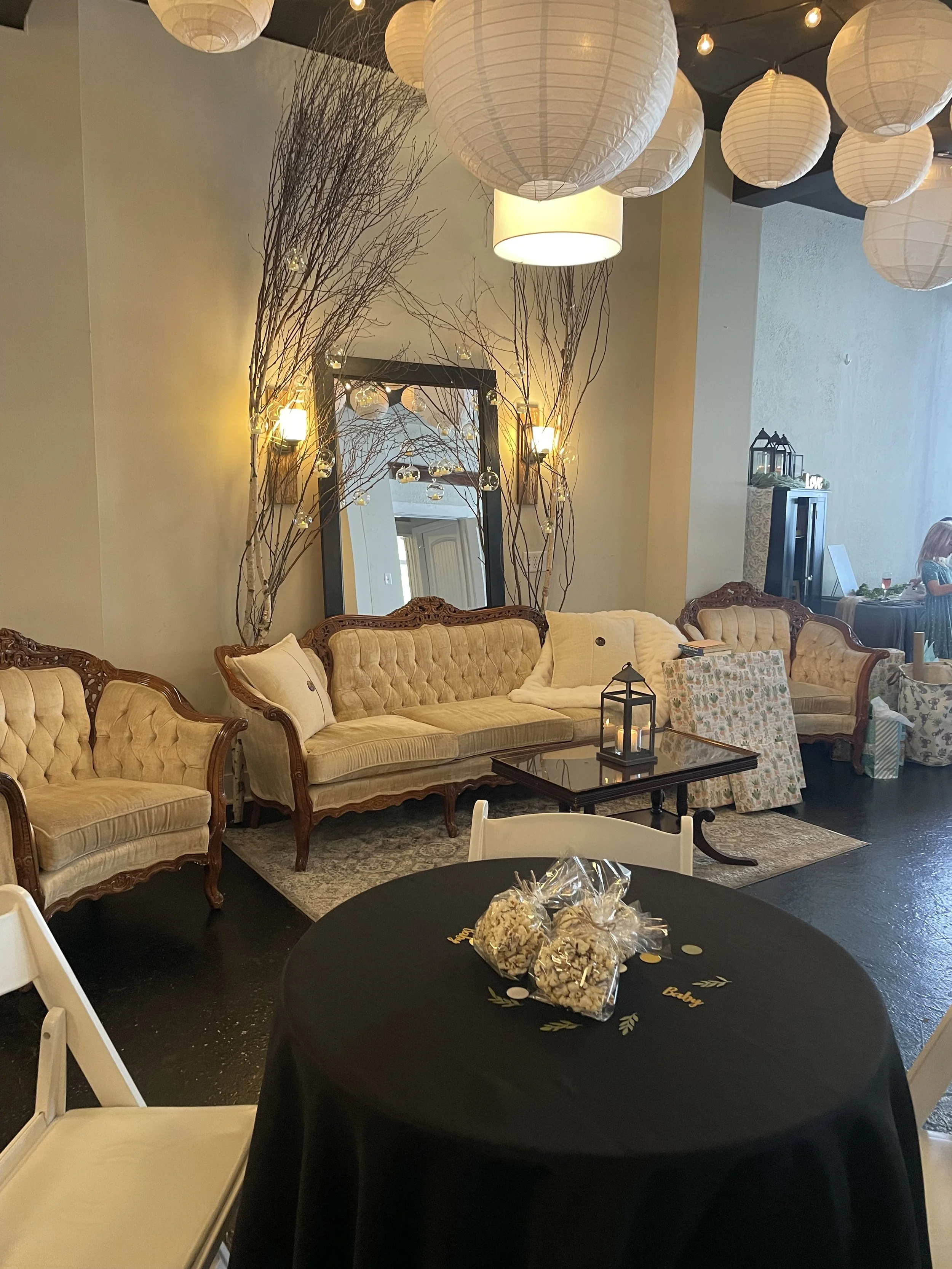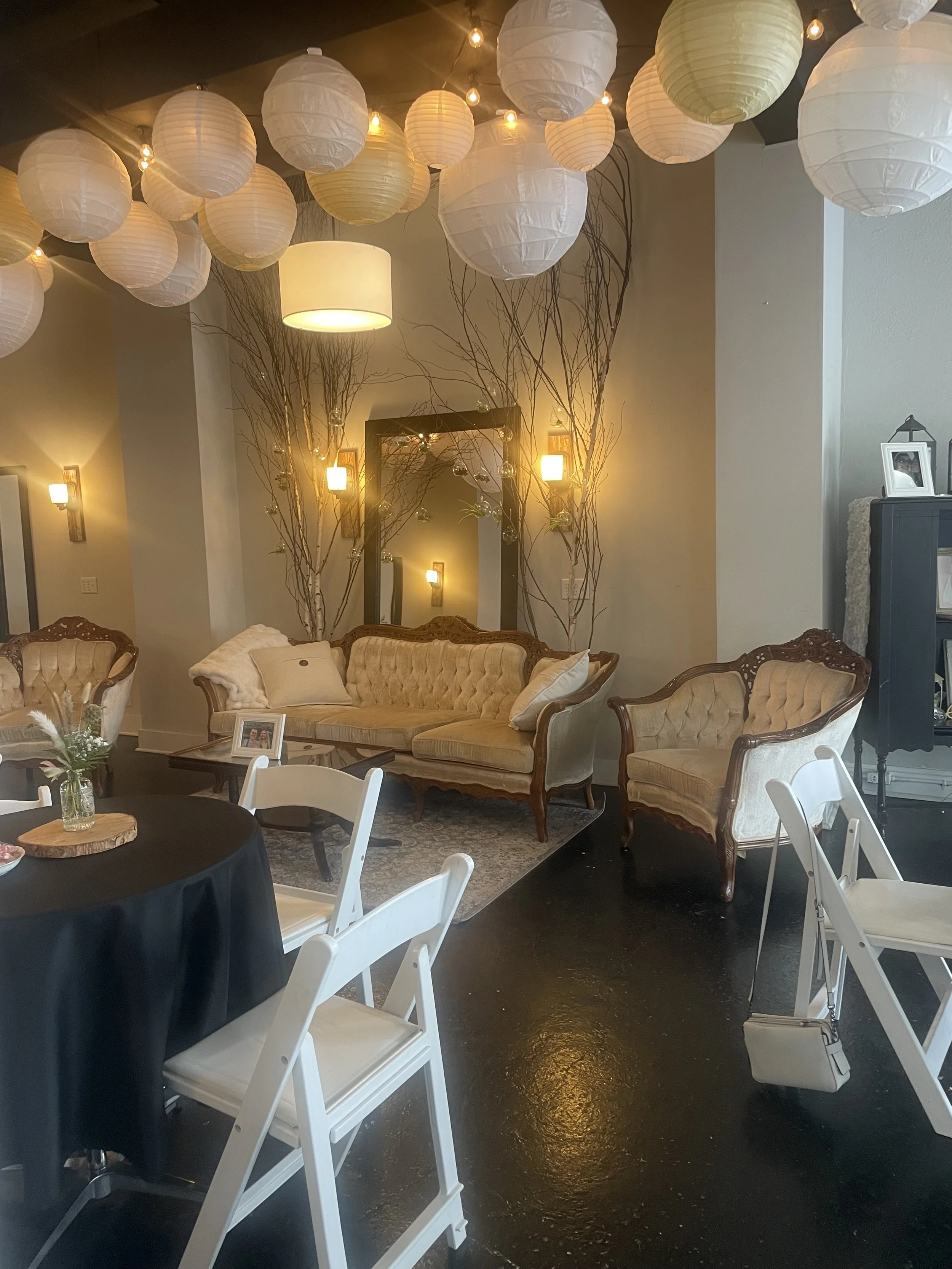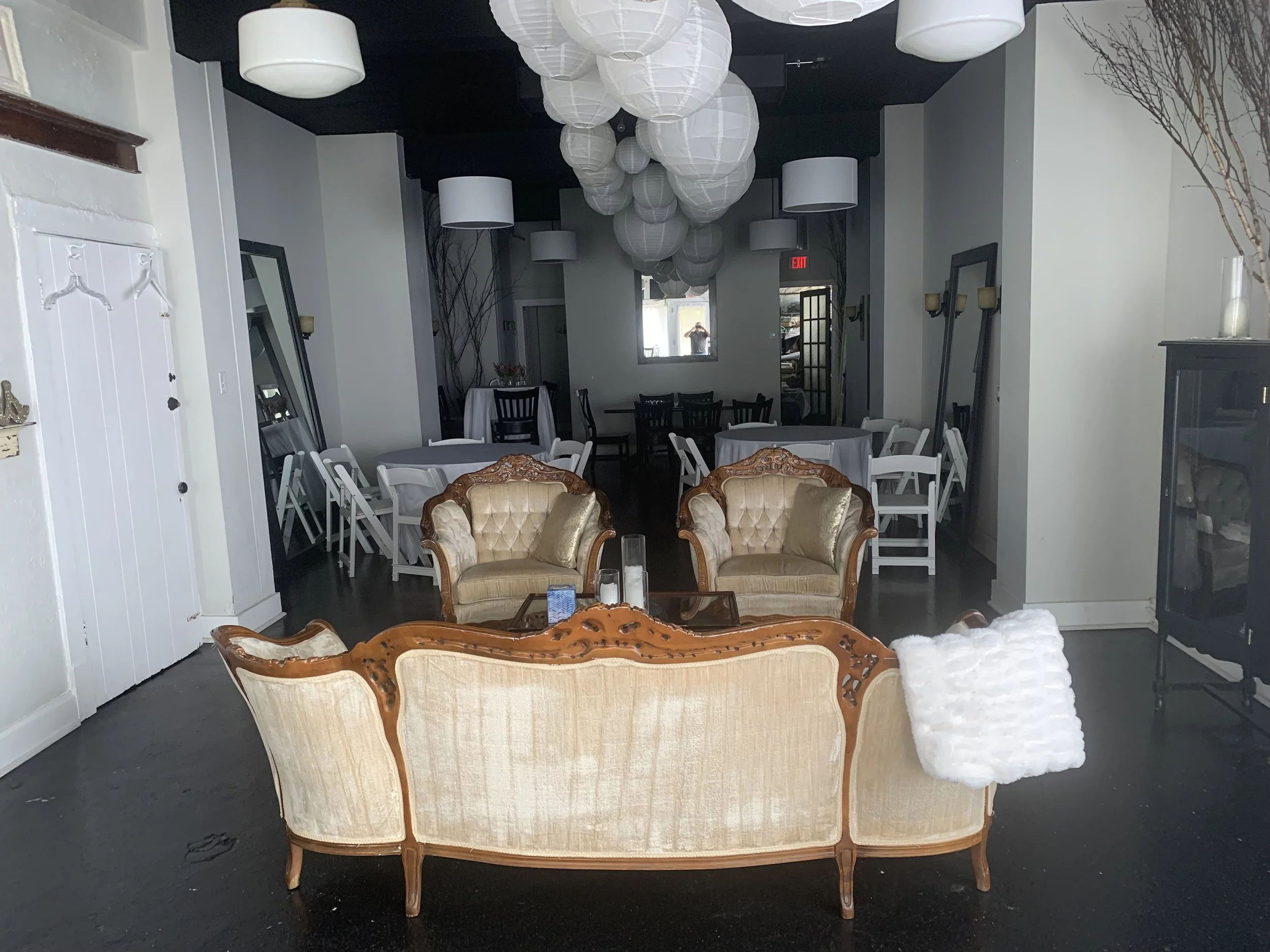 Elegant interior space with vintage-style beige and wood French Provincial style sofa set, white folding chairs around round tables with white tablecloths, black dining chairs, hanging paper lanterns, and modern lighting fixtures.