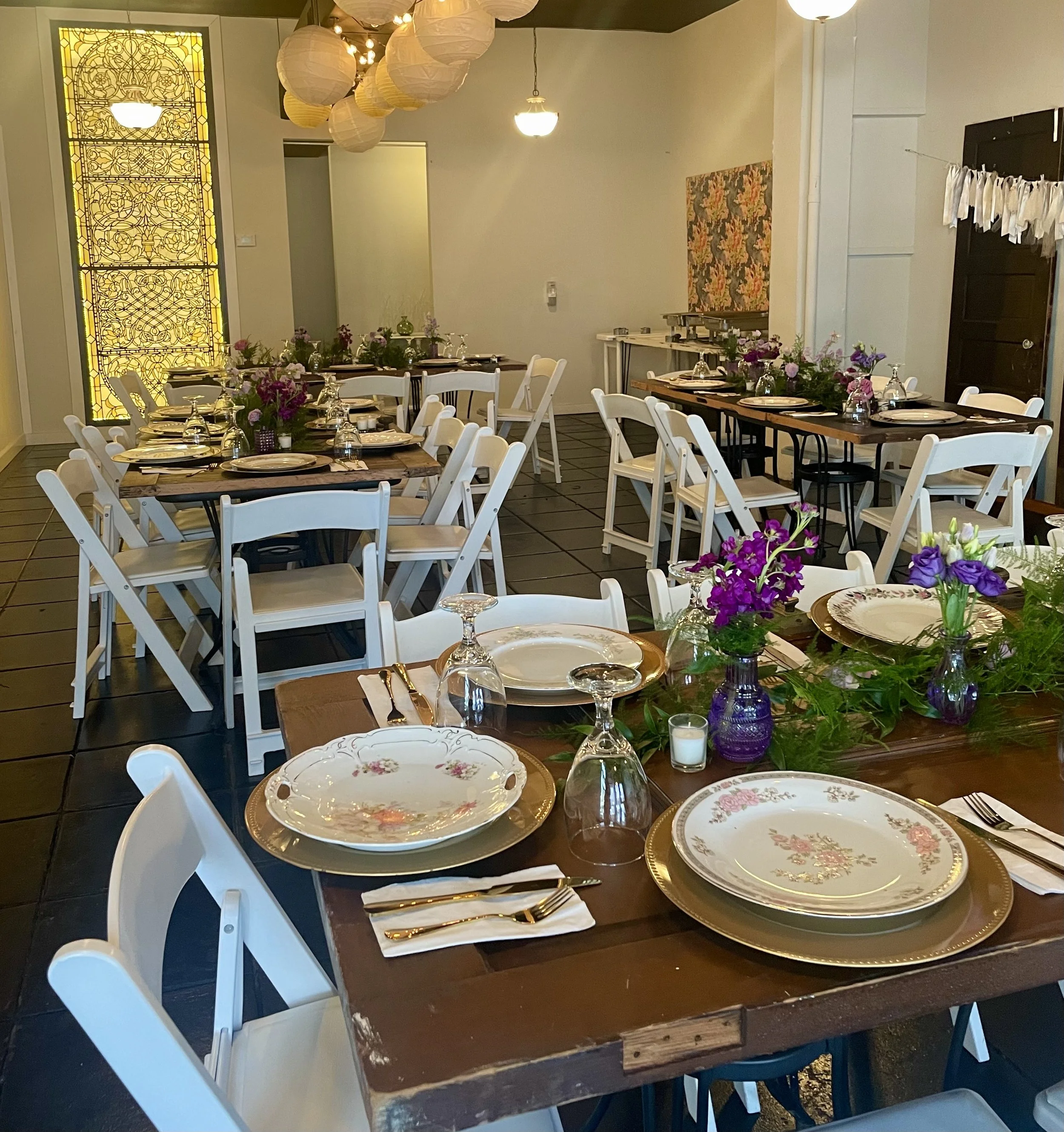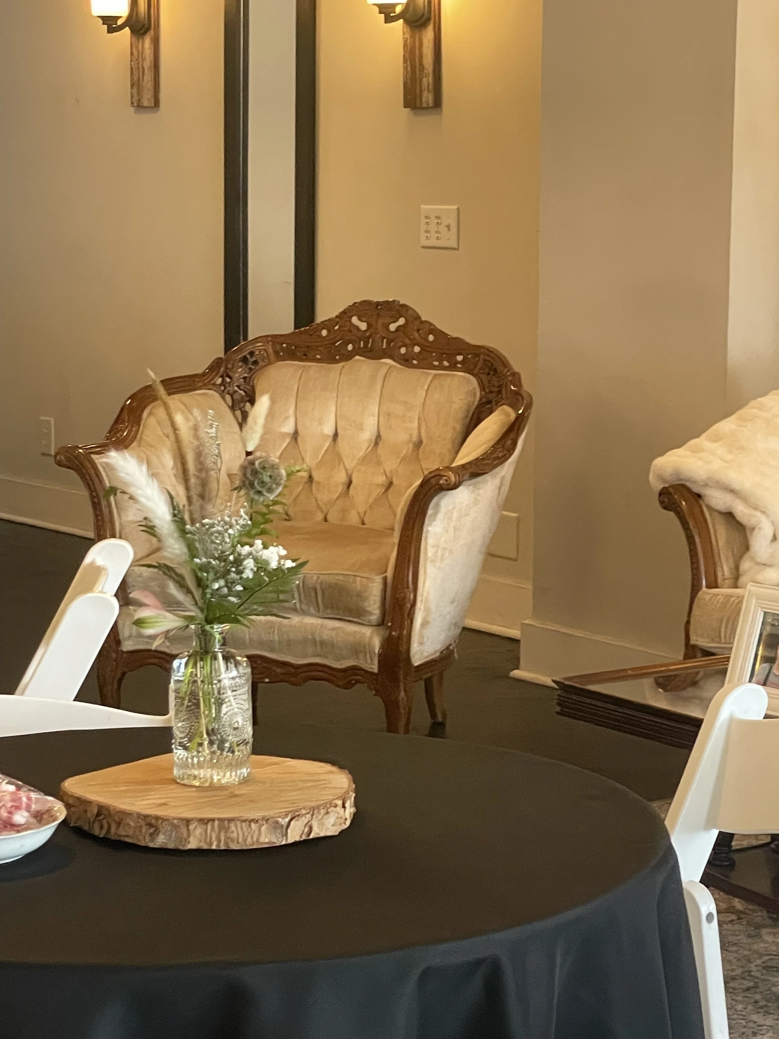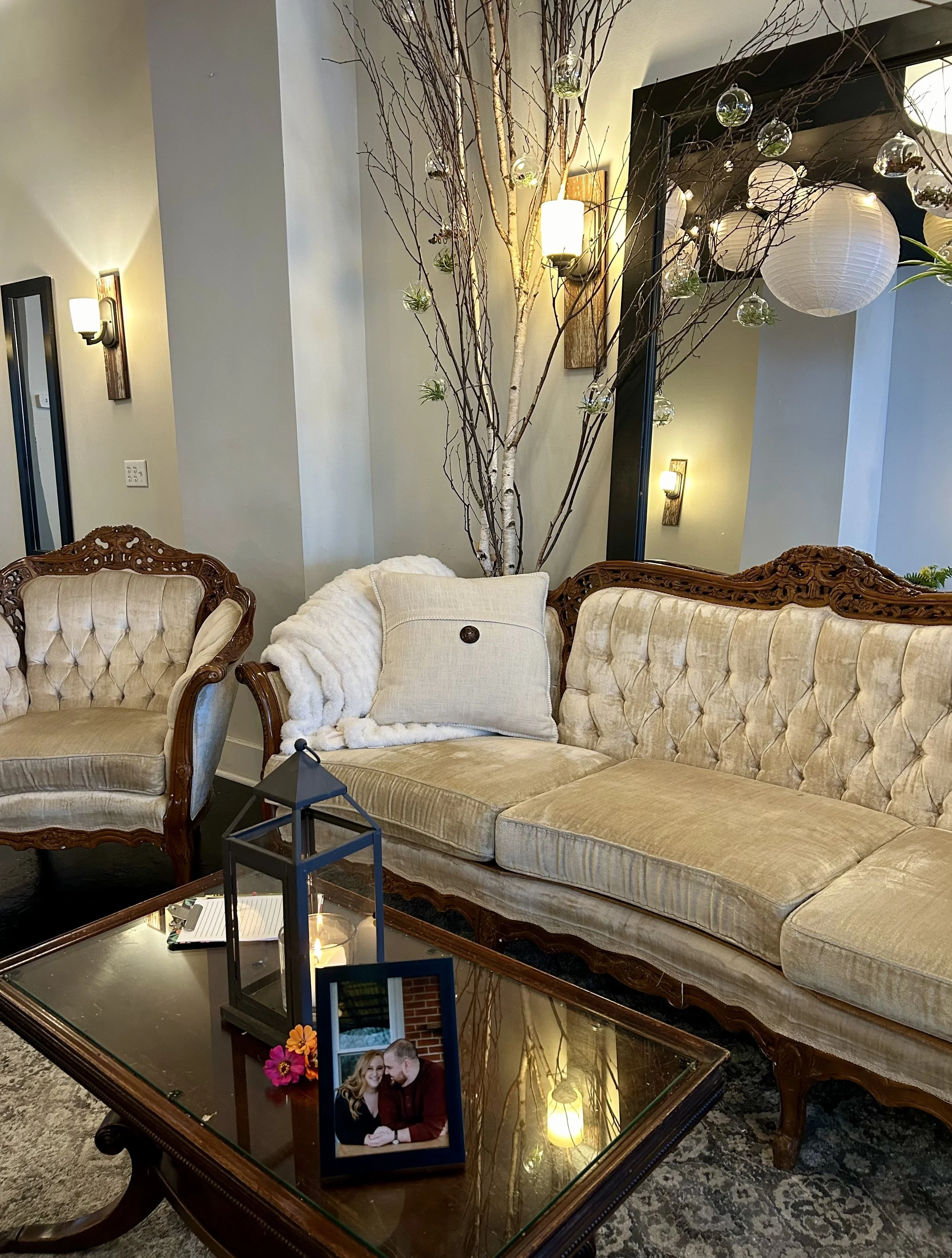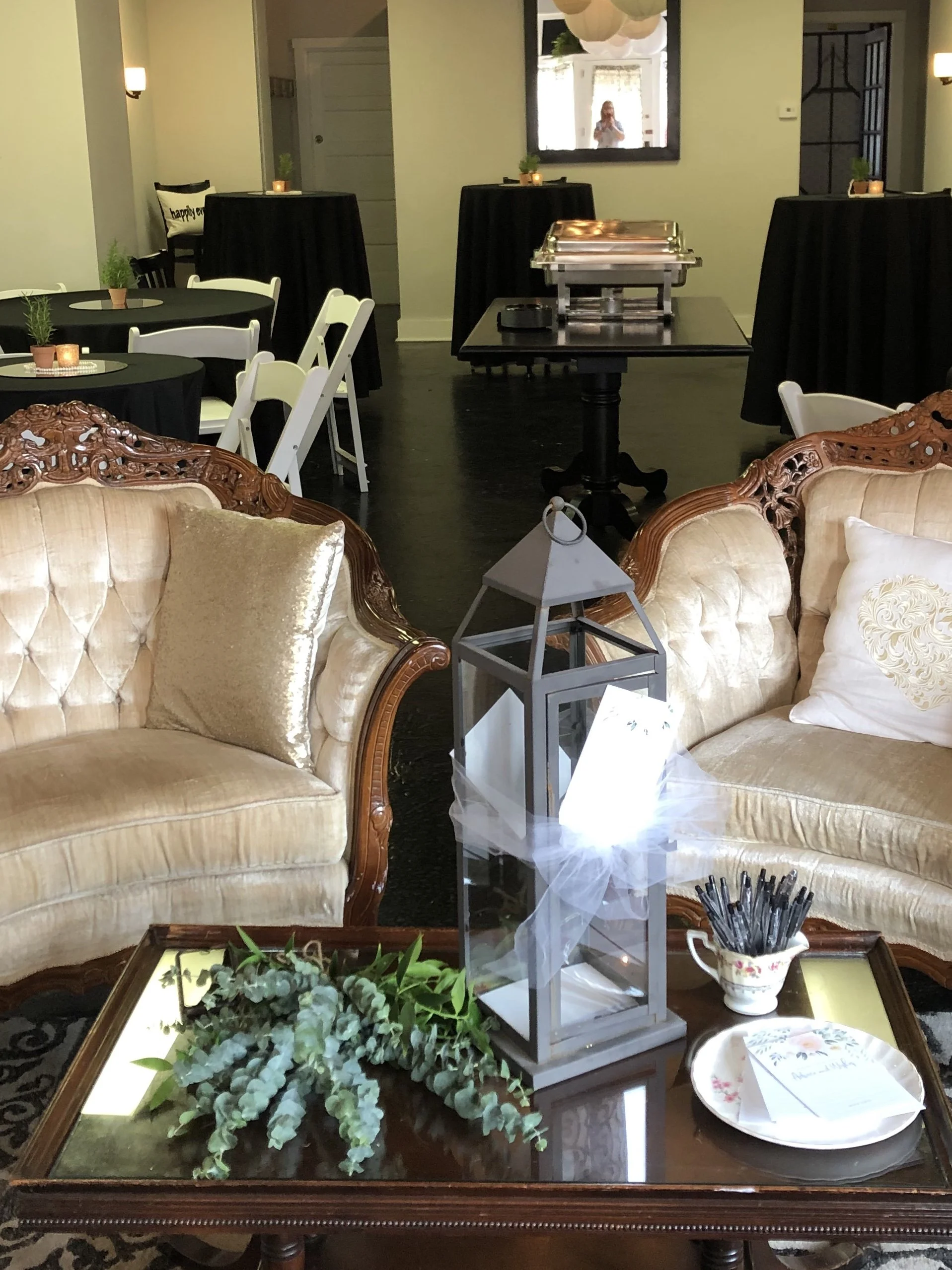 Elegant interior space with vintage-style beige and wood French Provincial style sofa set, white folding chairs around round tables with white tablecloths, black dining chairs, hanging paper lanterns, and modern lighting fixtures.