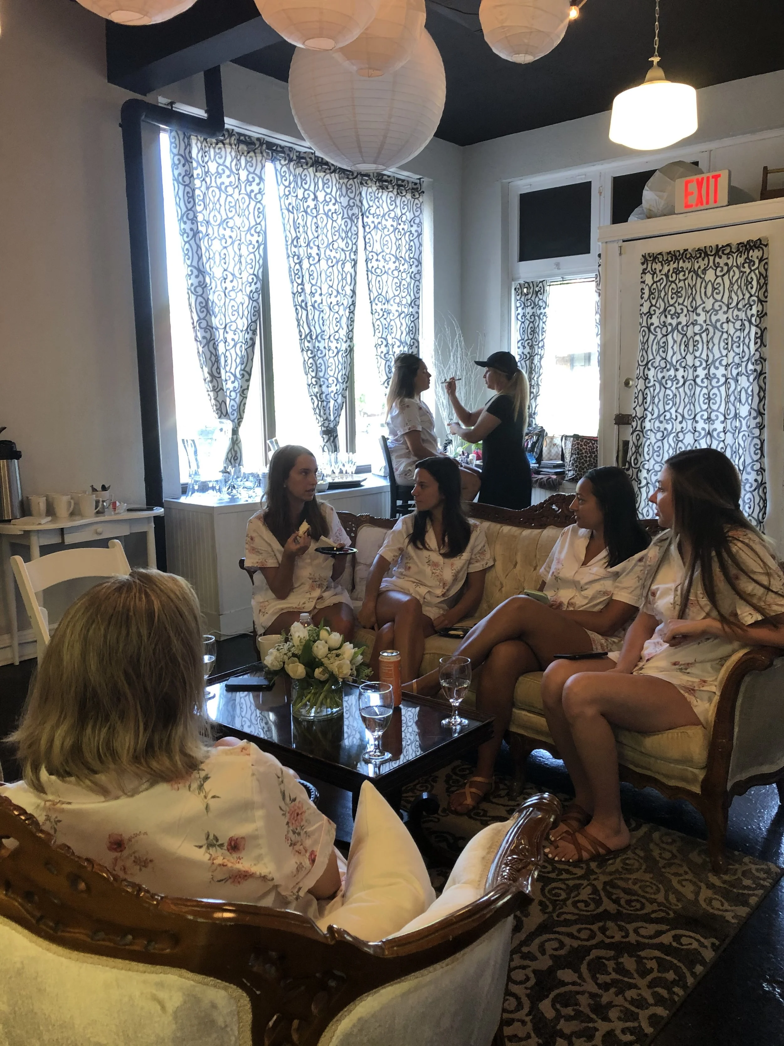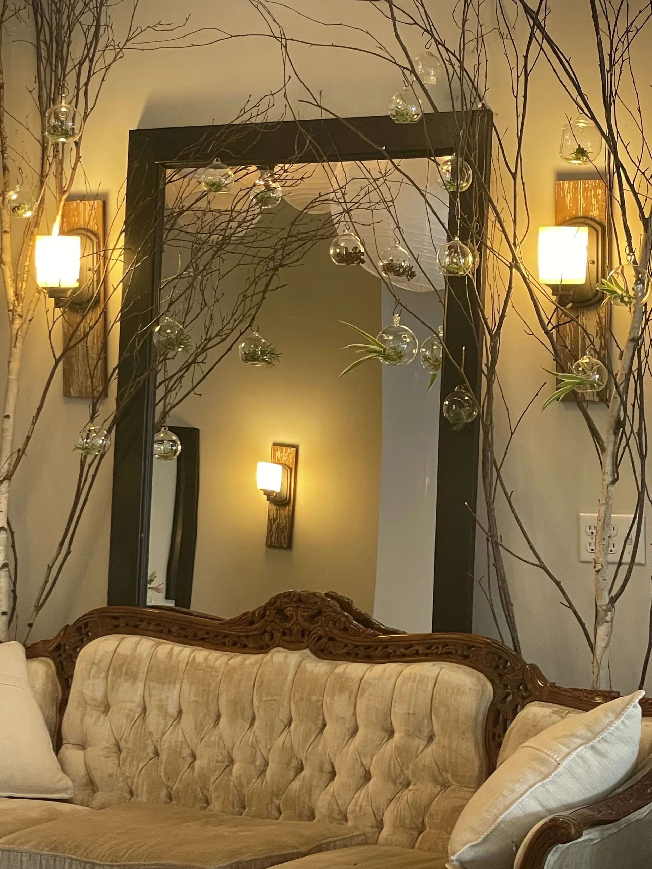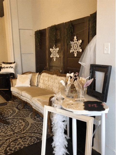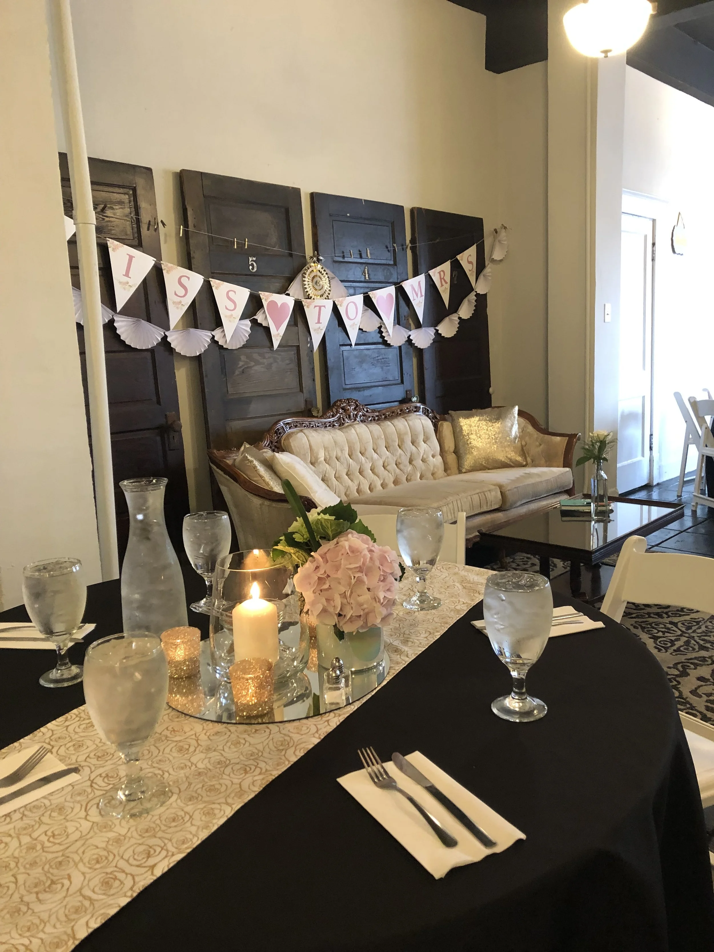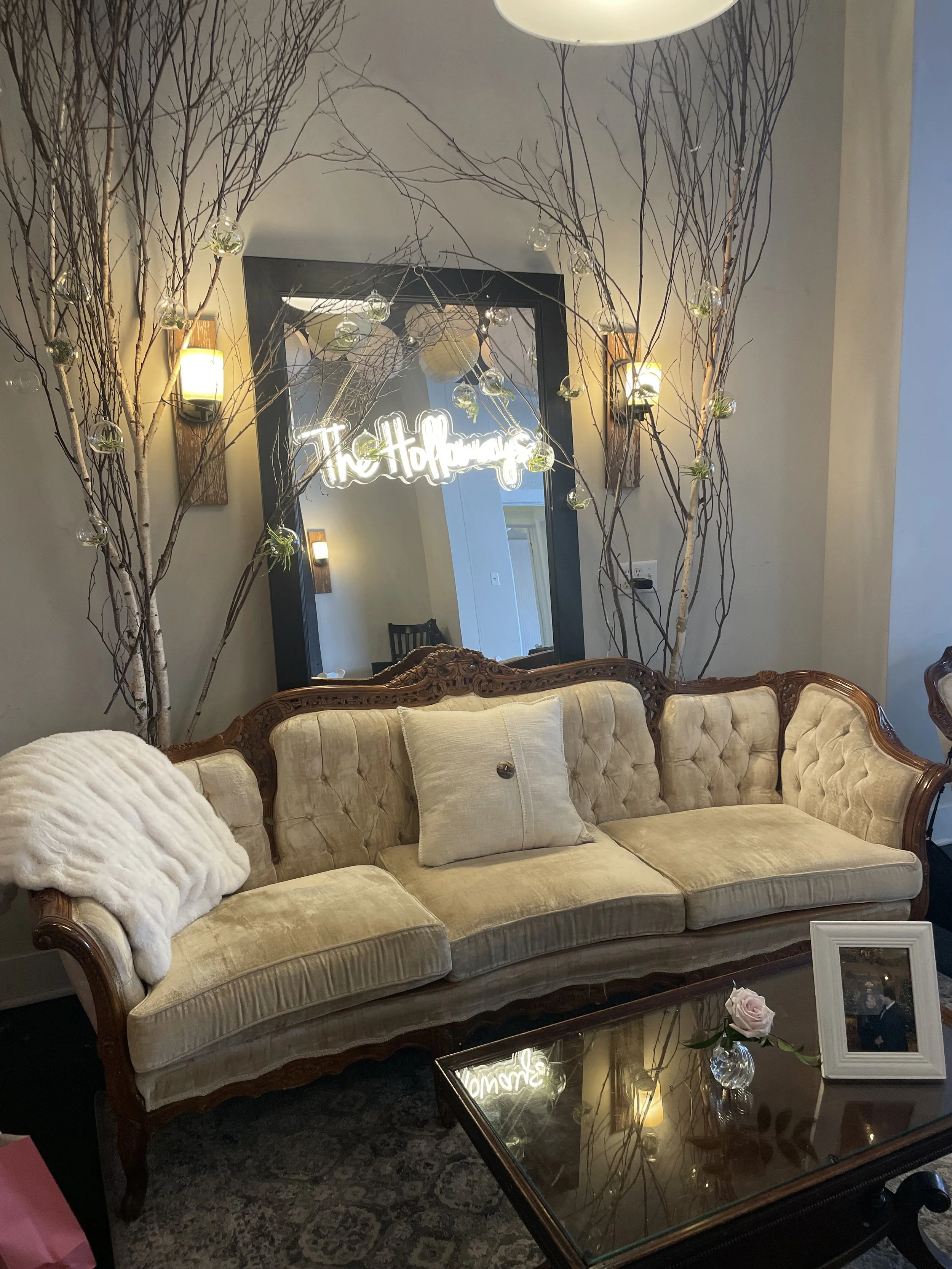 Elegant interior space with vintage-style beige and wood French Provincial style sofa set, white folding chairs around round tables with white tablecloths, black dining chairs, hanging paper lanterns, and modern lighting fixtures.