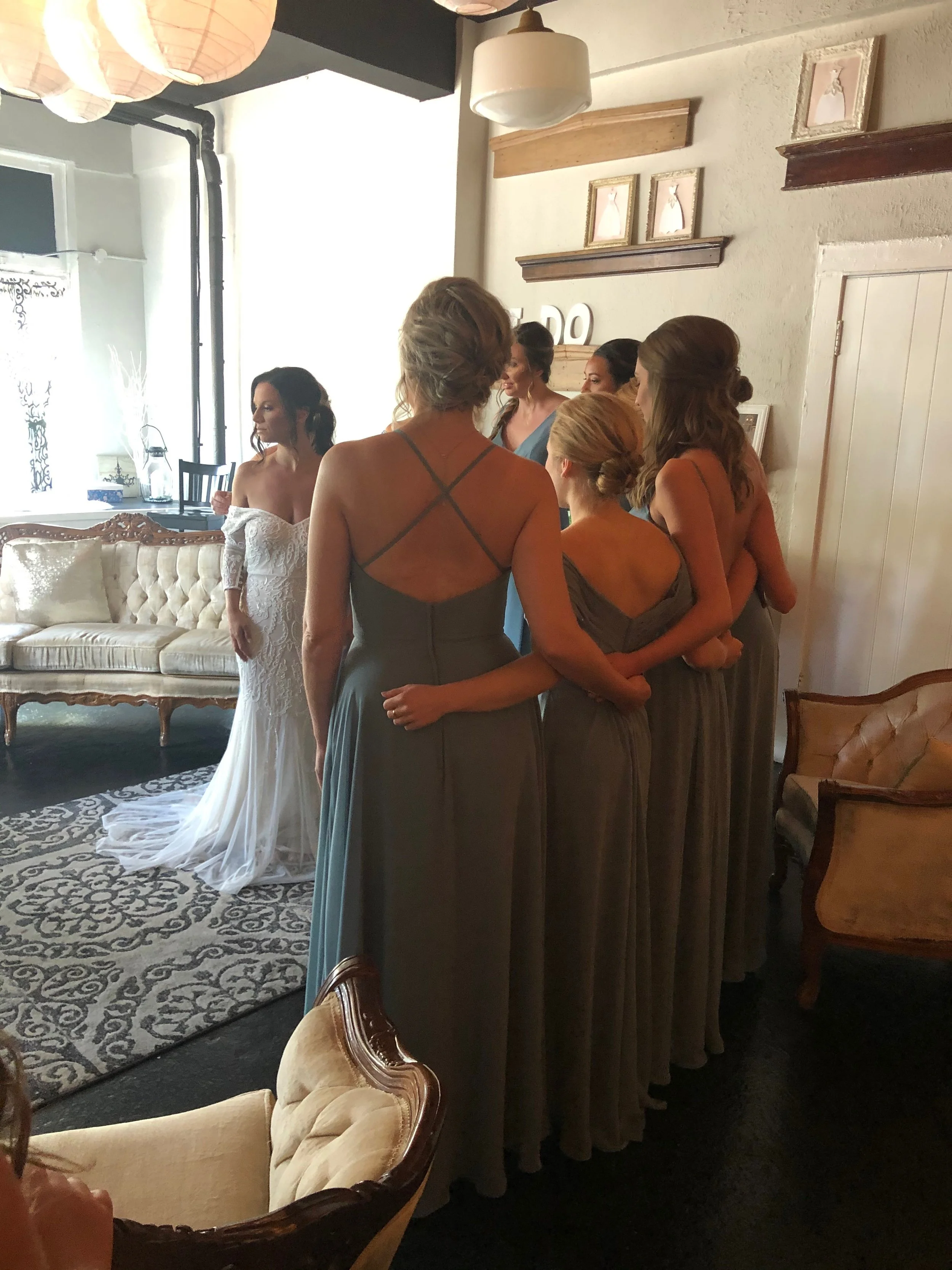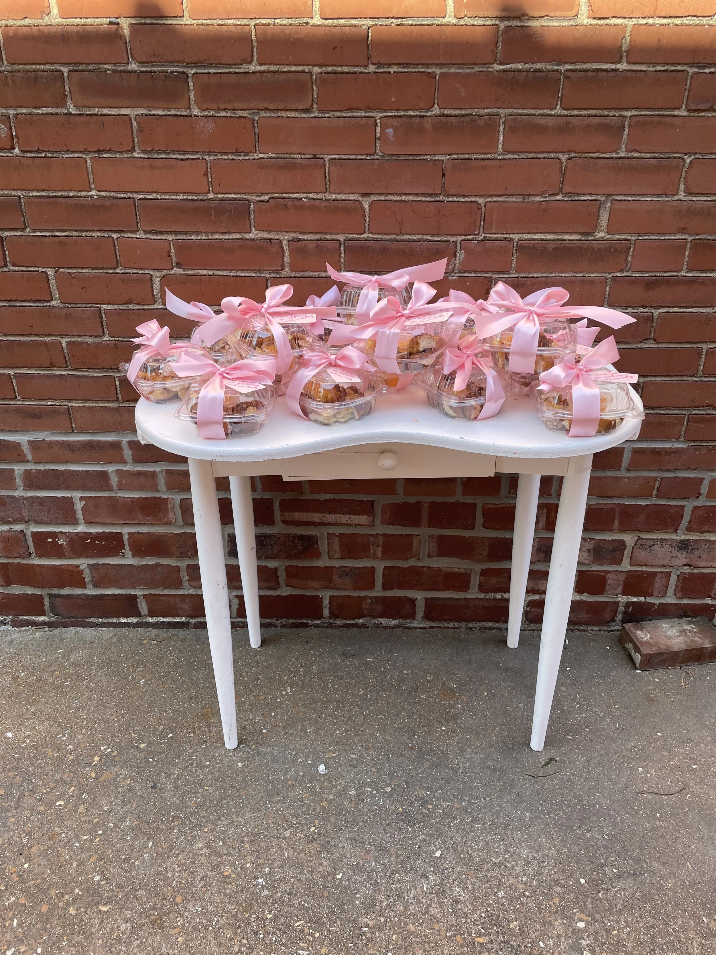 Small round treats wrapped in clear plastic containers tied with pink ribbons, arranged on a white table against a brick wall.