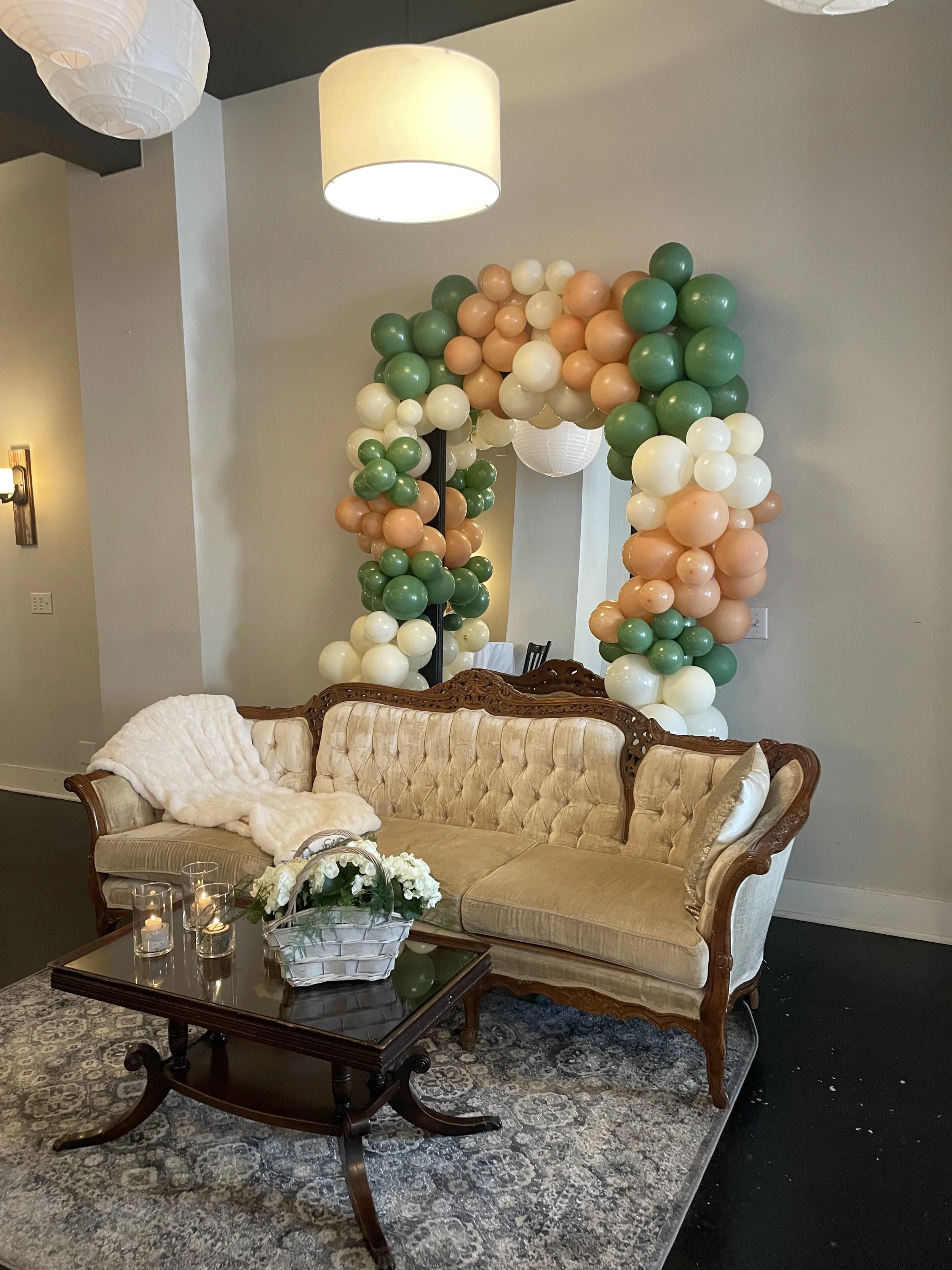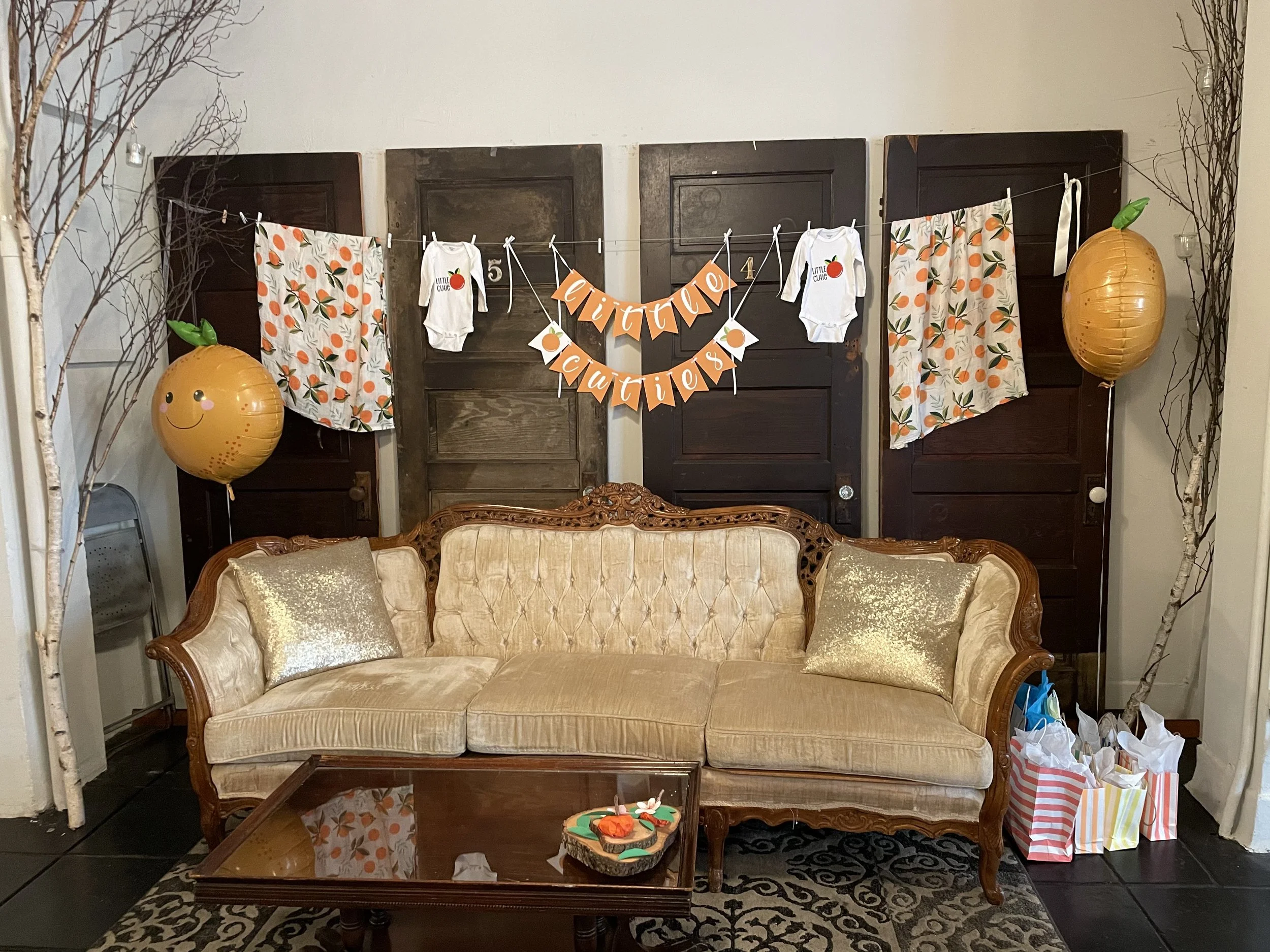 Living room decorated for a celebration with a vintage beige sofa with gold pillows, outdoor themed curtains, falling leaf garland, and balloons shaped like oranges on either side of the sofa. Items in gift bags are on the floor on the right.
