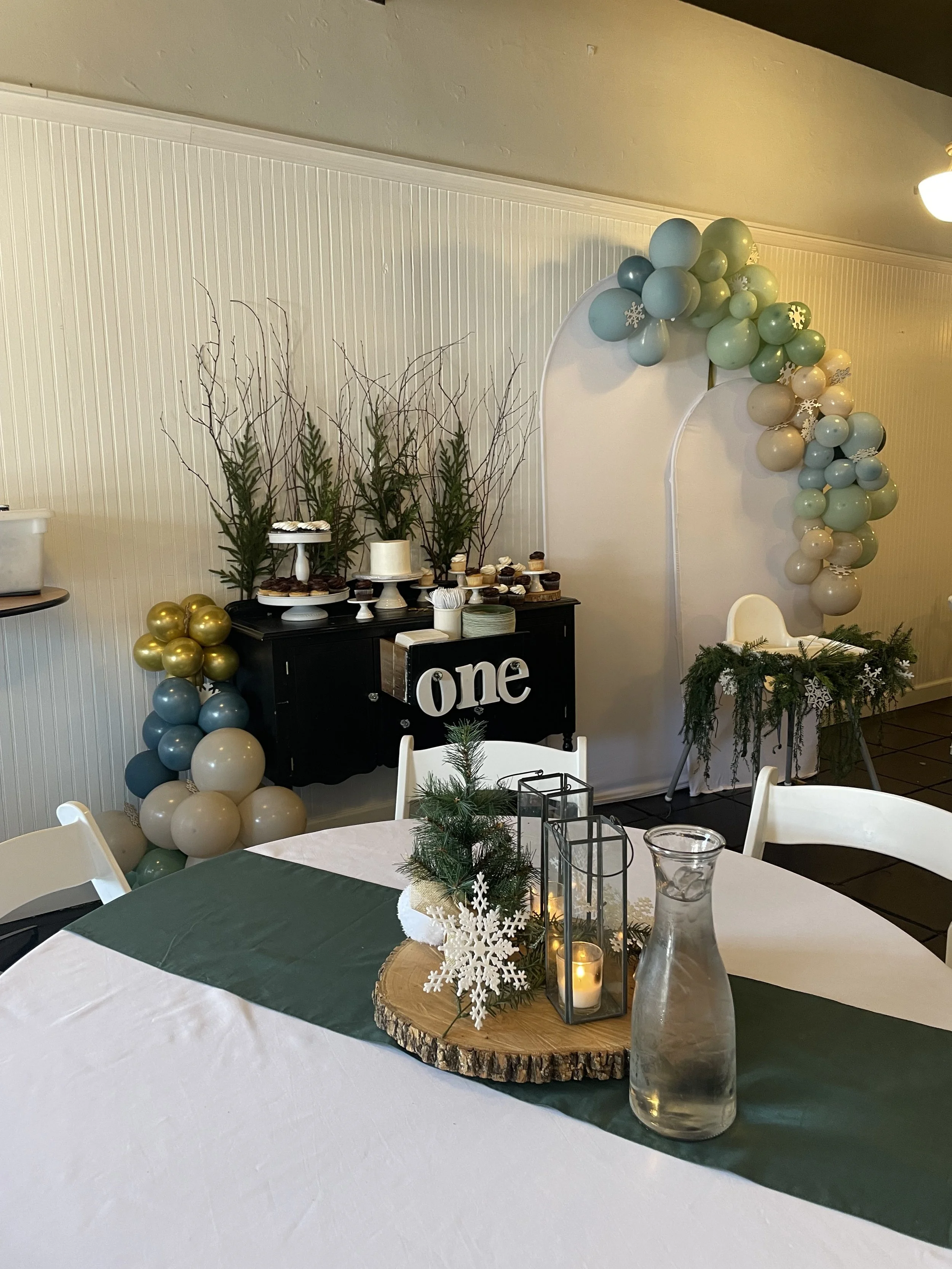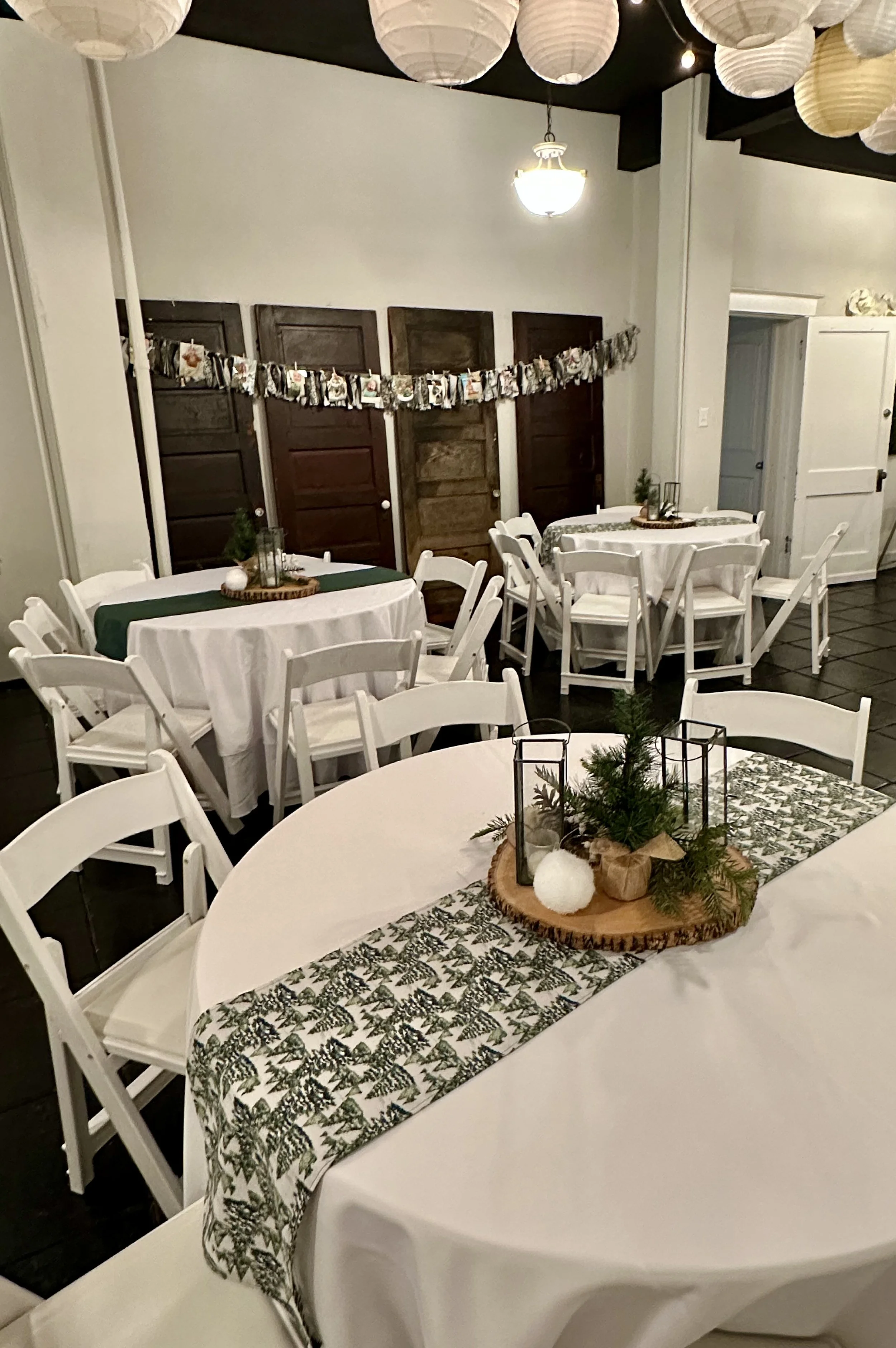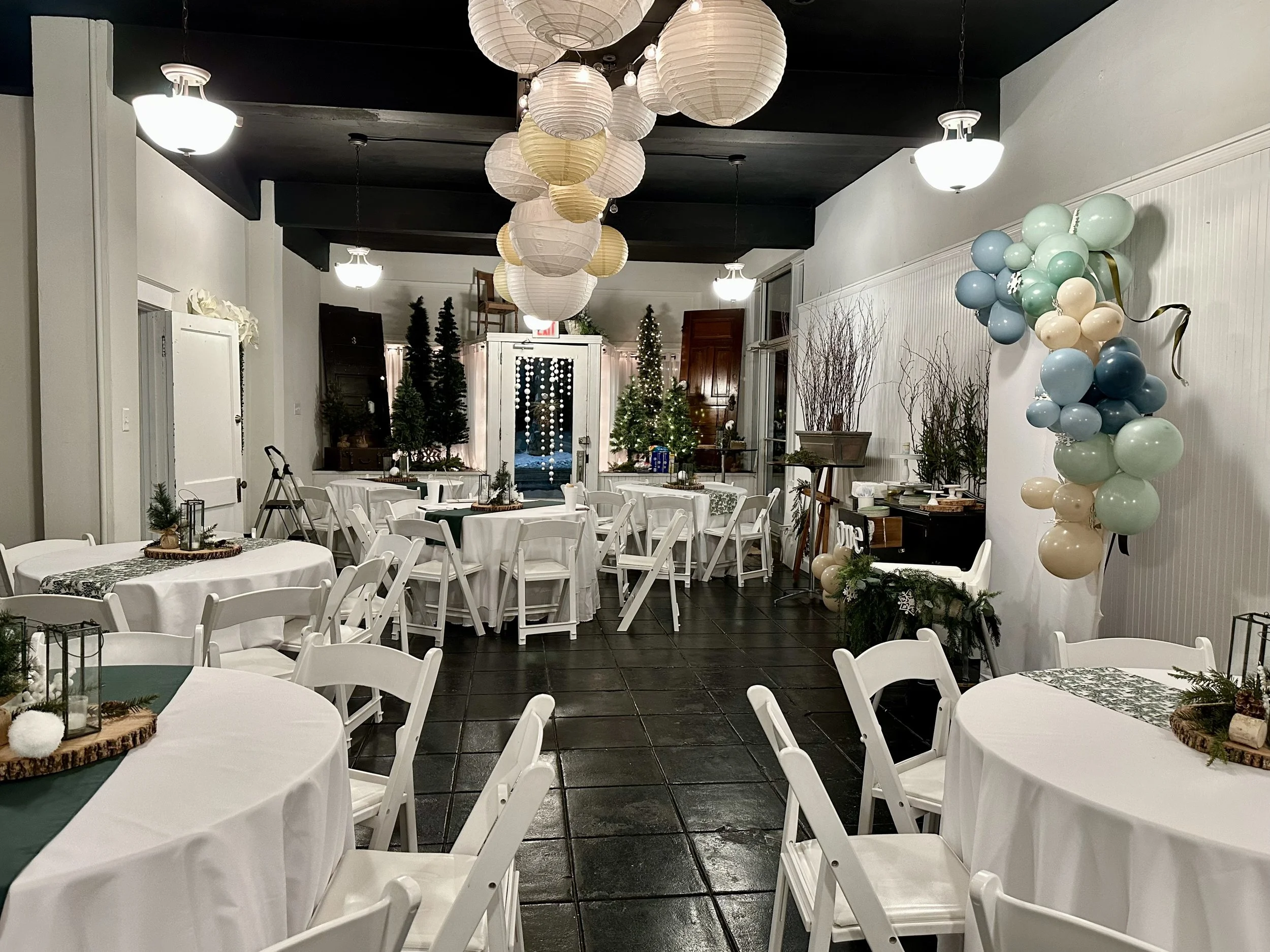 A decorated event space with white round tables covered in white tablecloths, accented with greenery and lantern centerpieces. White chairs surround the tables, and a balloon arch in pastel colors decorates one wall. In the background, there are Chri