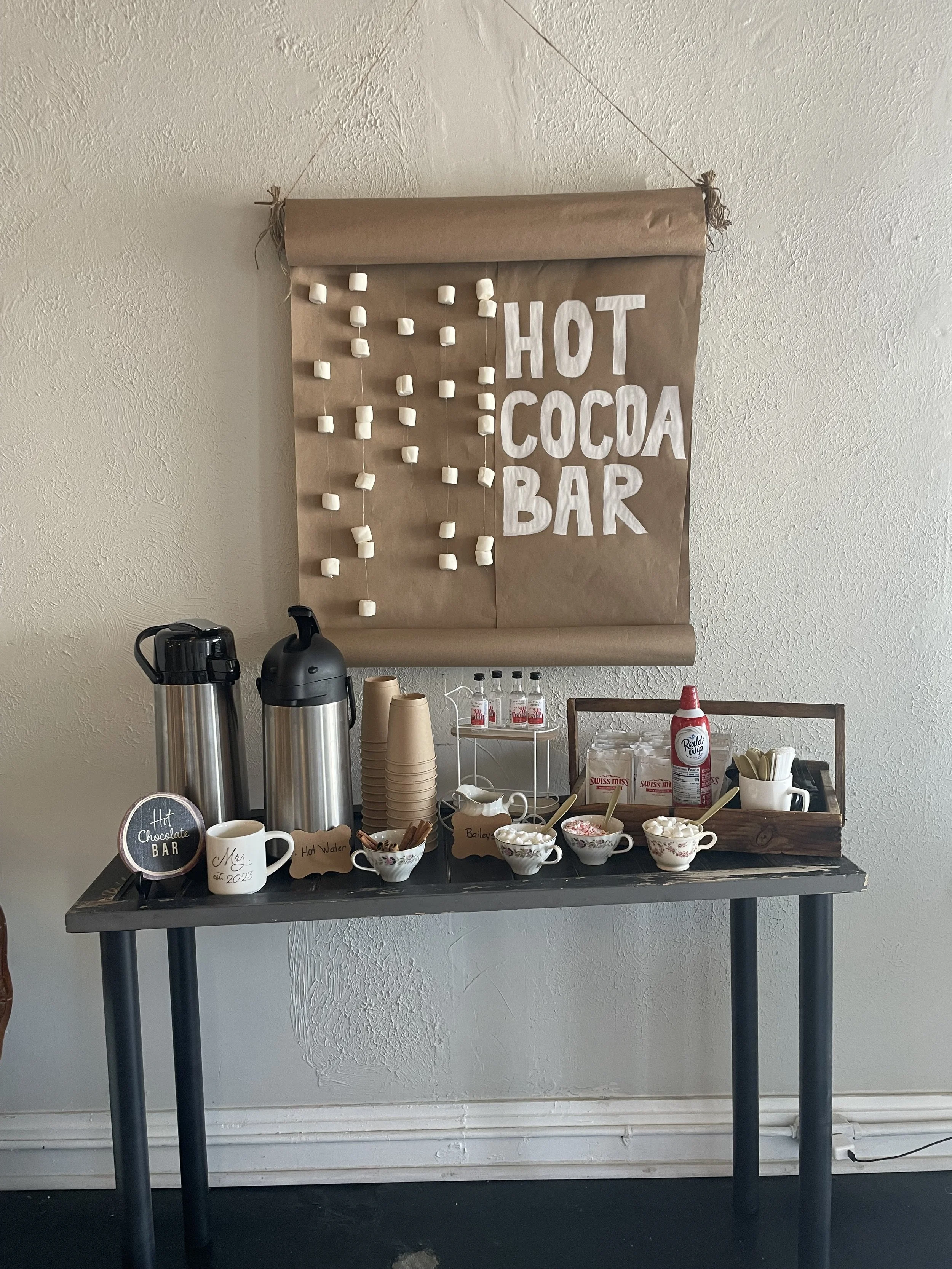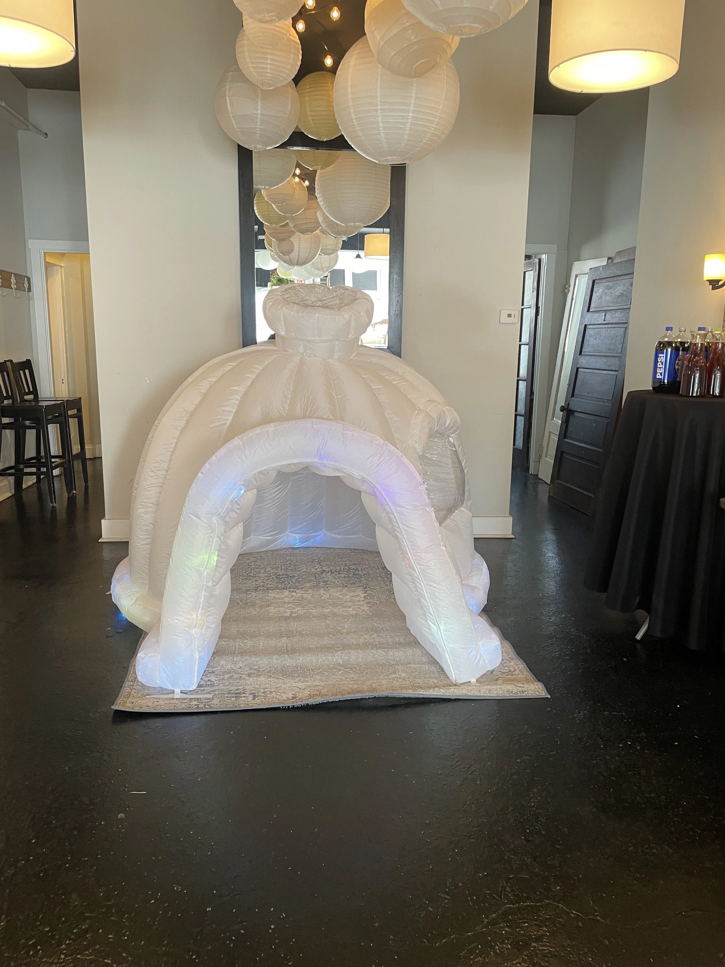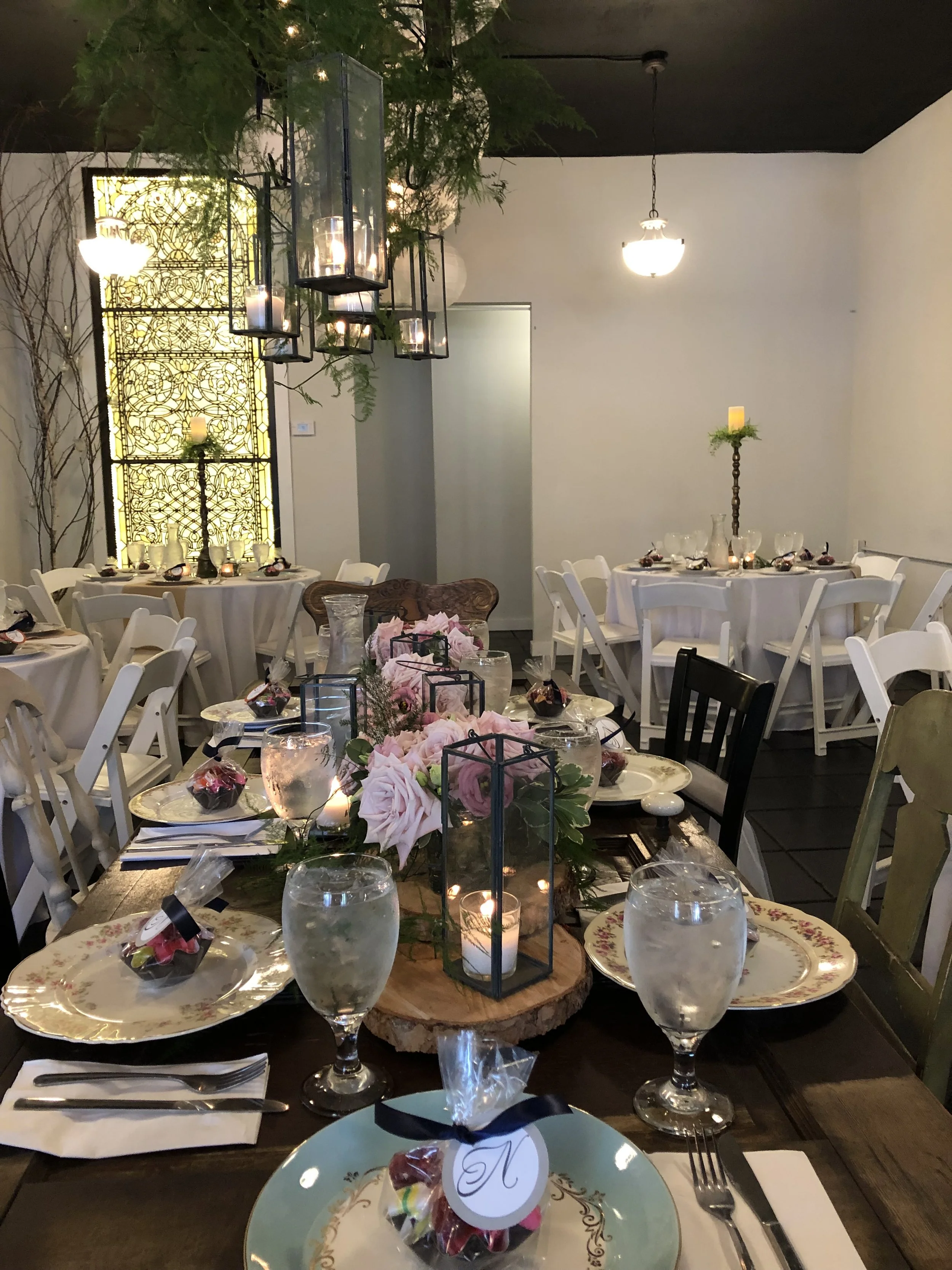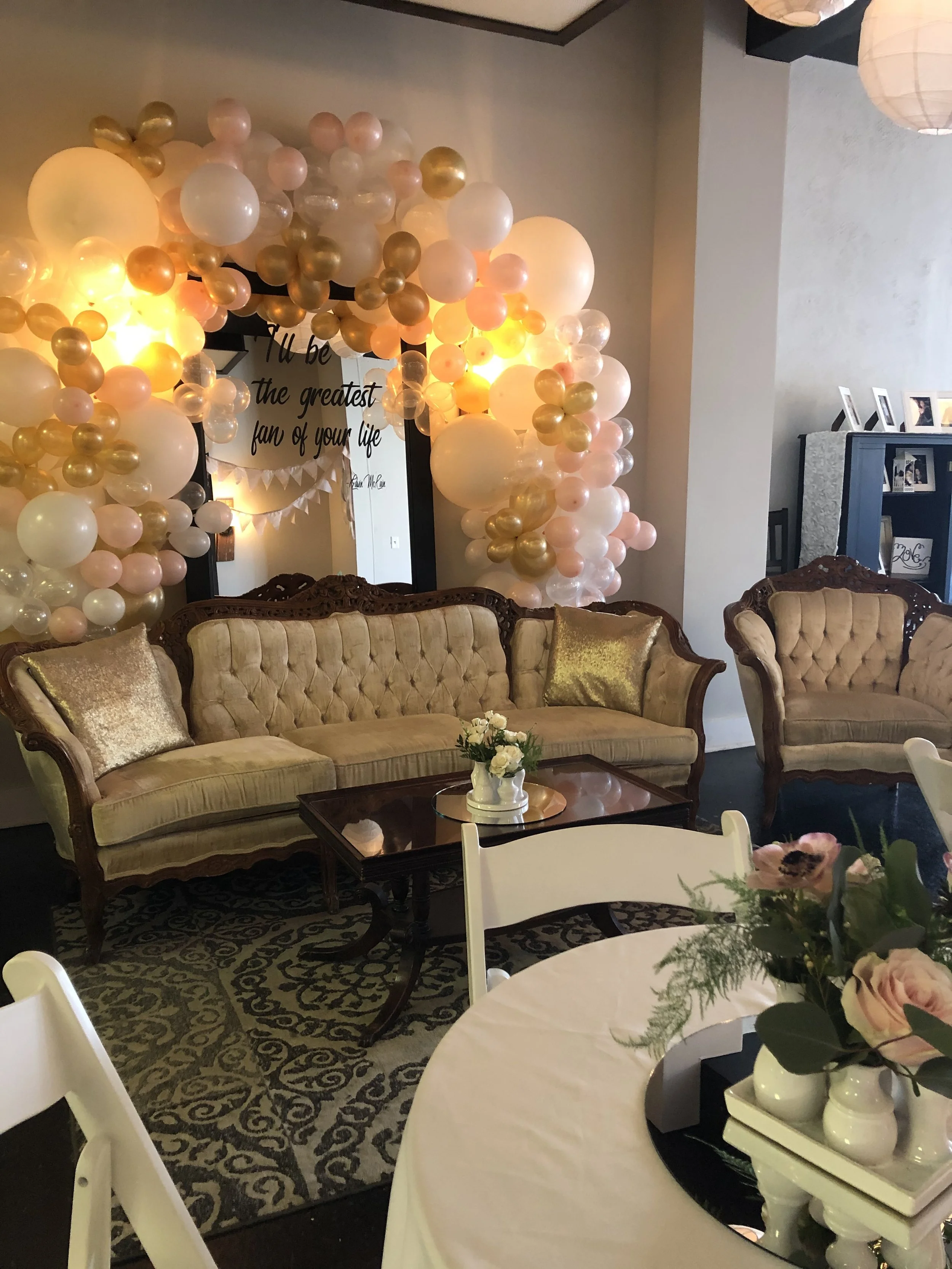 A decorated event space with white round tables covered in white tablecloths, accented with greenery and lantern centerpieces. White chairs surround the tables, and a balloon arch in pastel colors decorates one wall. In the background, there are Chri