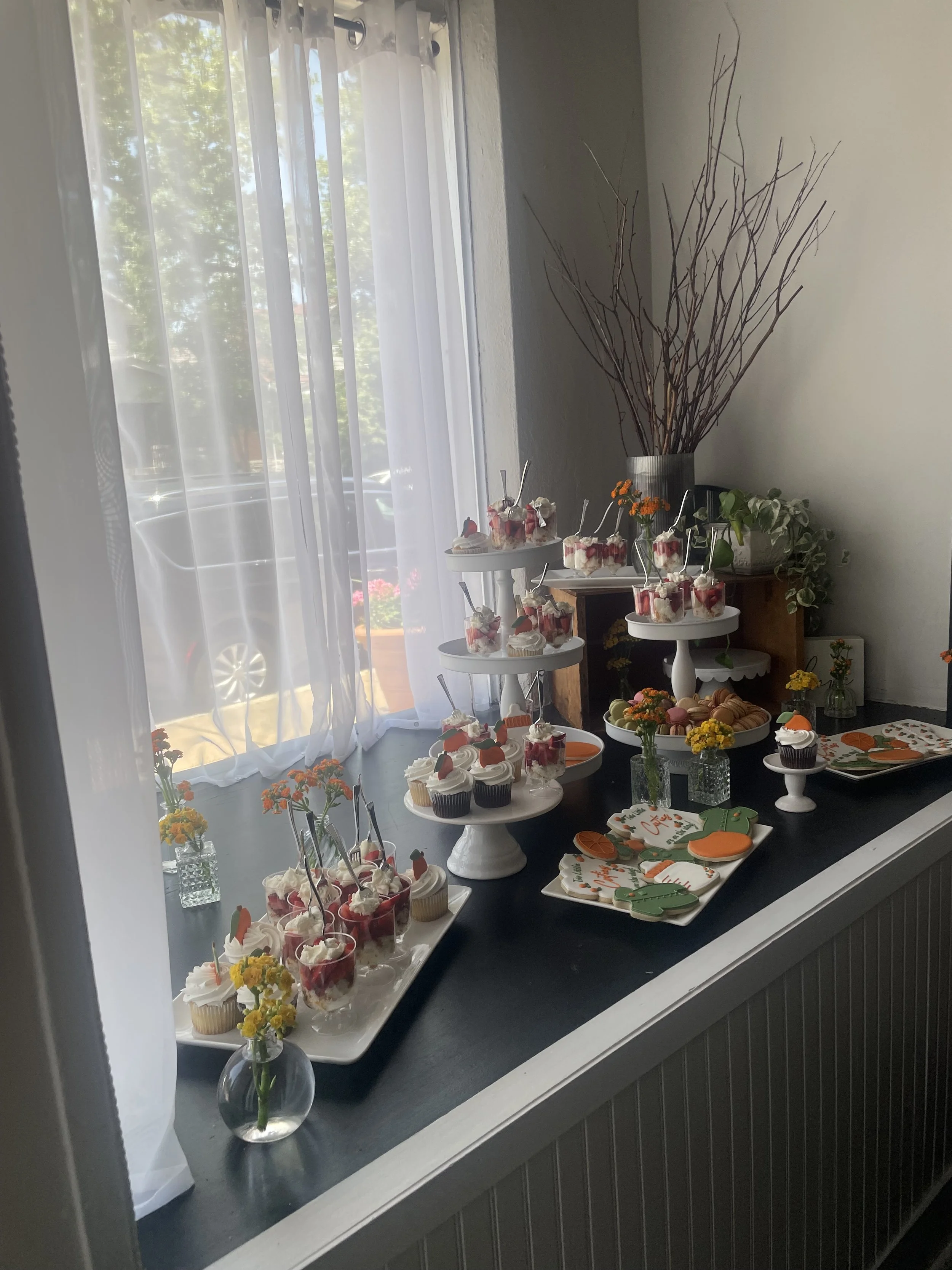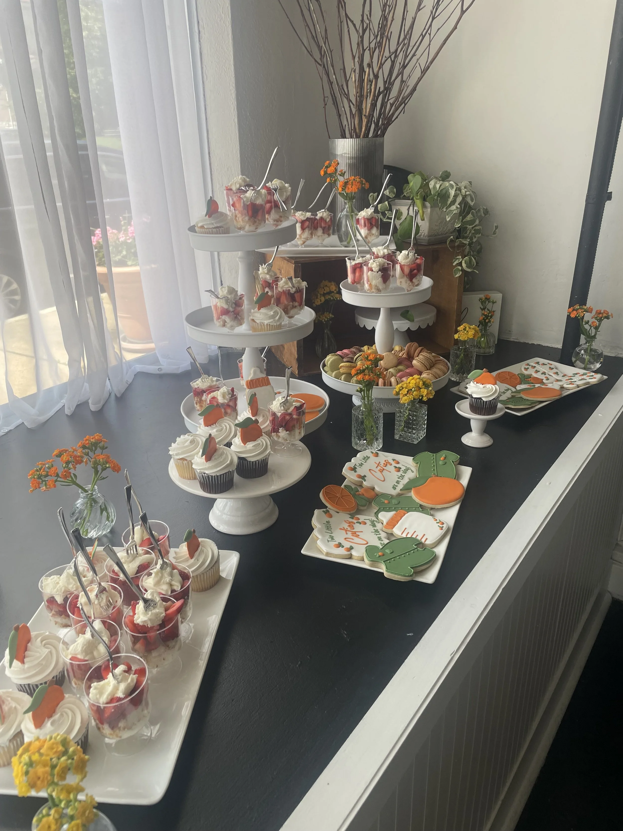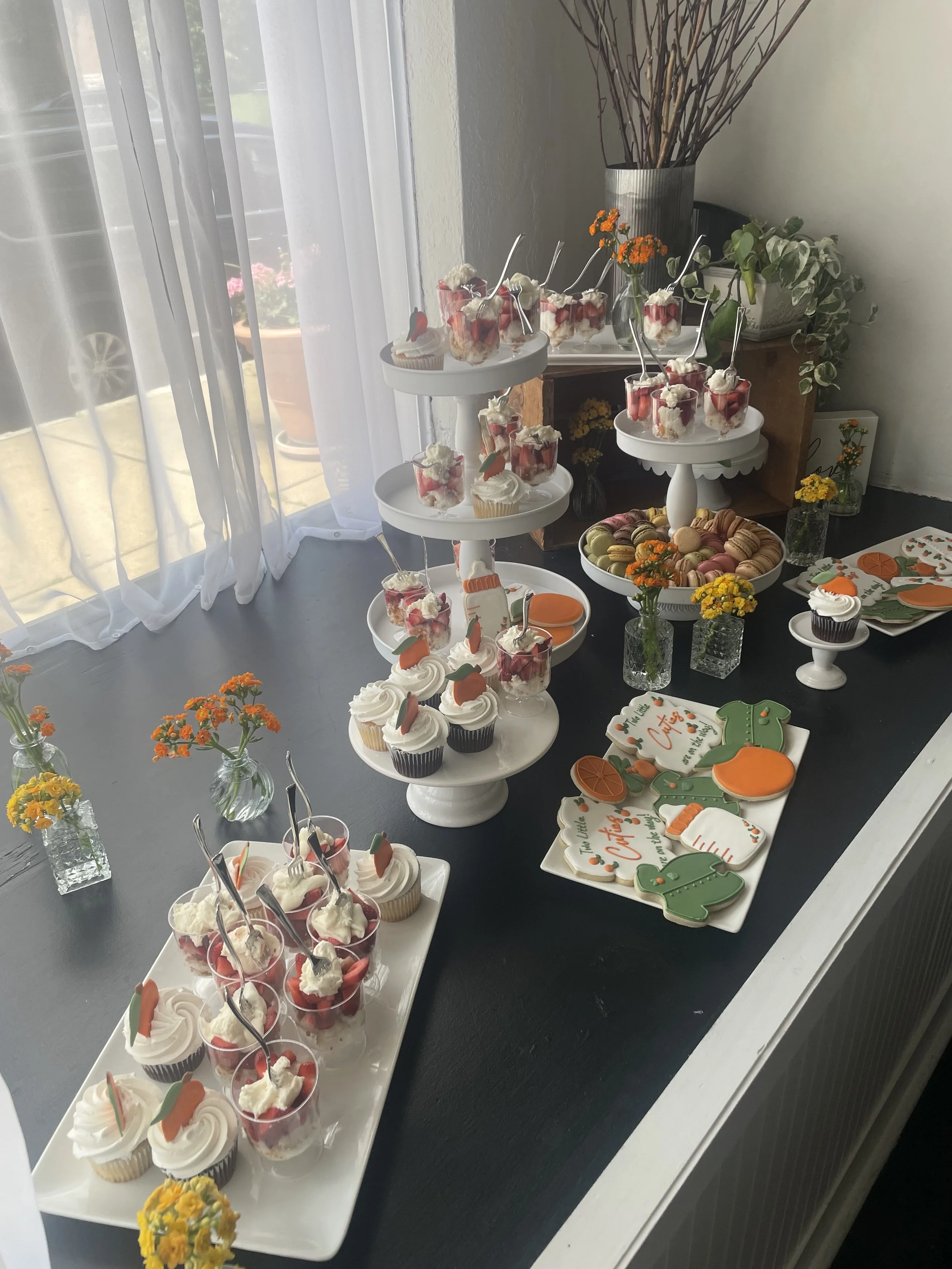 Assorted cupcakes, parfaits, and cookies decorated with carrots and oranges on a black table, with flowers in small vases and a tiered stand for a festive gathering.