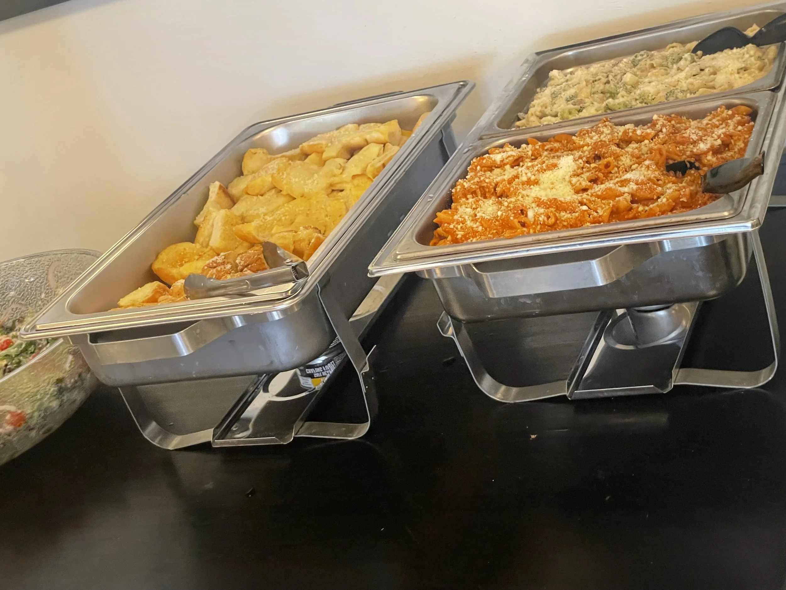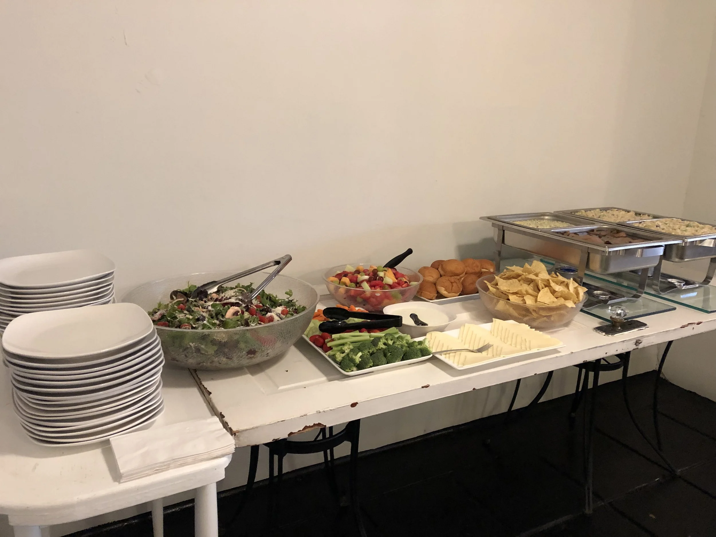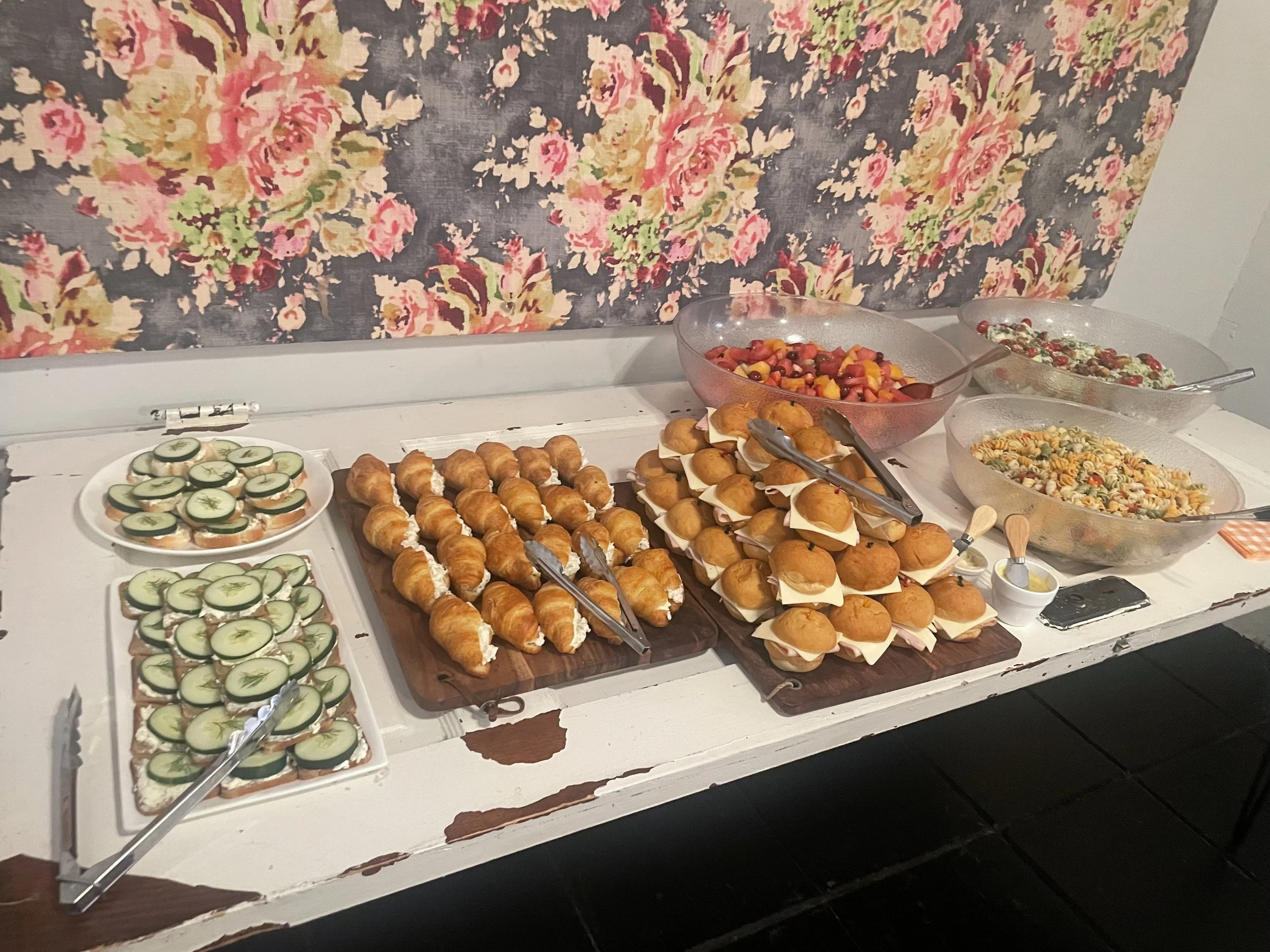 An assortment of finger foods and salads on a rustic white wooden table. There are cucumber slices on crackers, mini croissants with cream filling, sliders with cheese, and several large bowls of pasta and fruit salads, set against a floral backdrop.