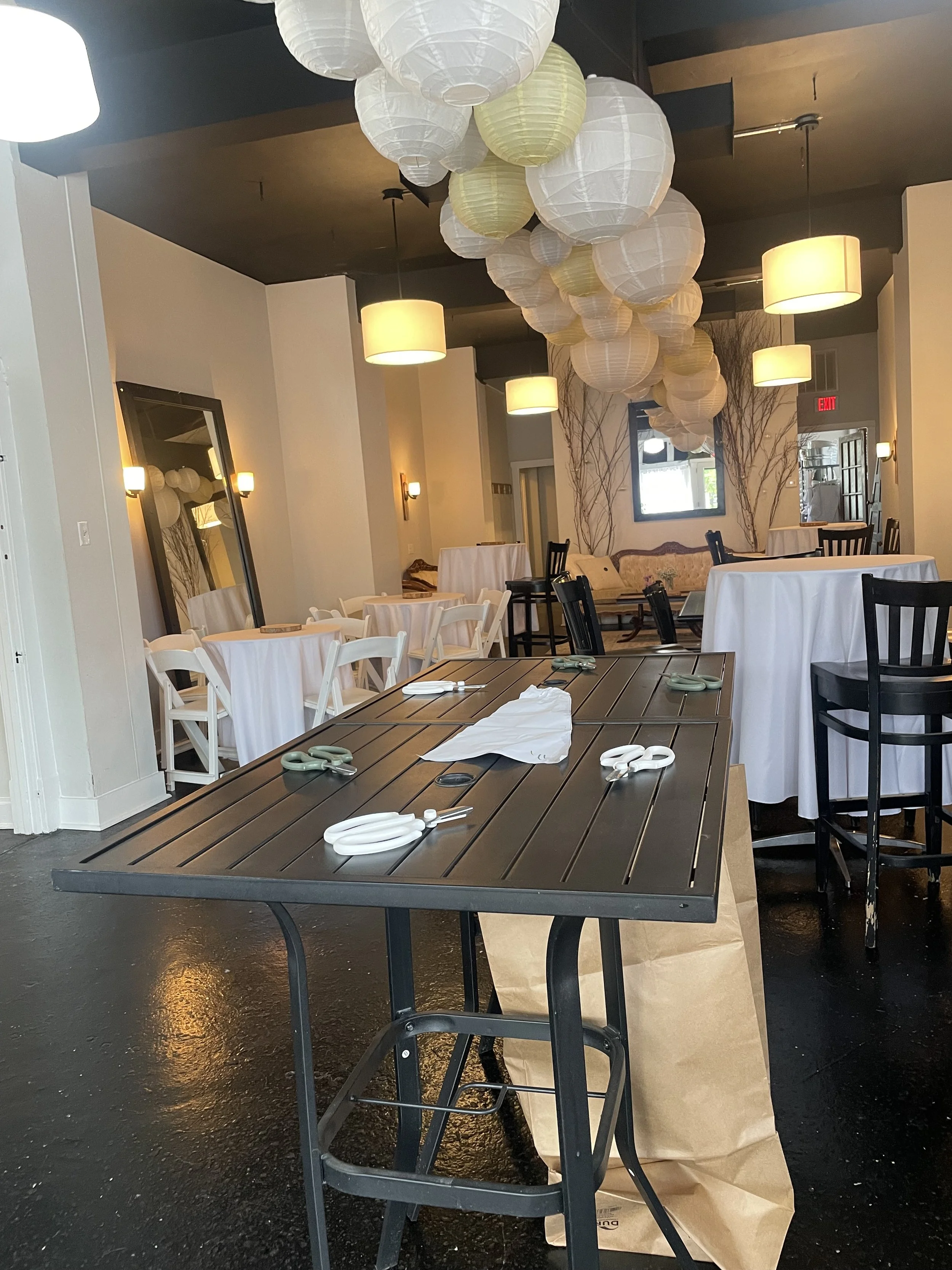 Interior of a restaurant or event space decorated with hanging paper lanterns in white and light yellow, overhead lighting fixtures, and tables set with scissors, napkins, and paper bags.
