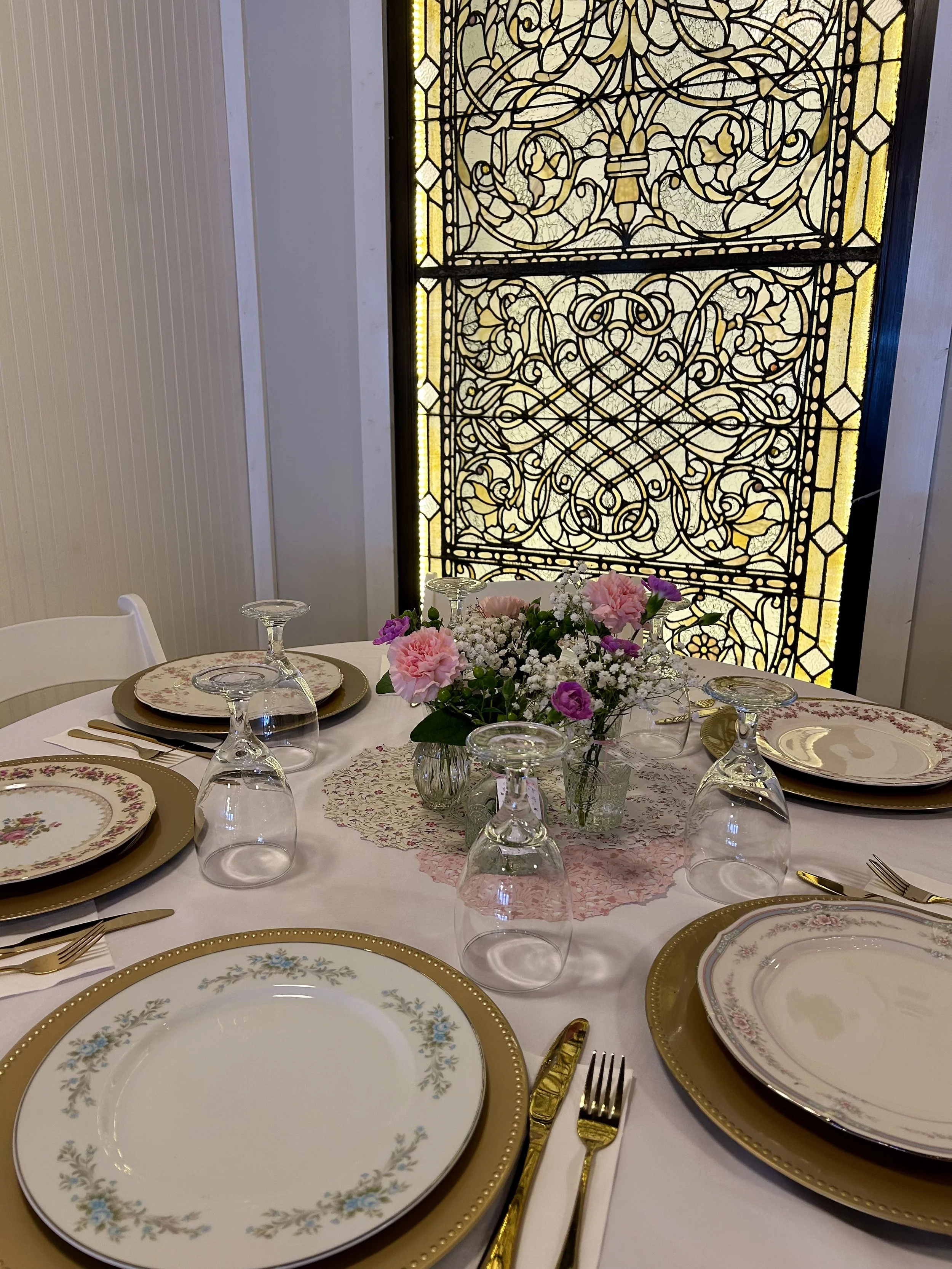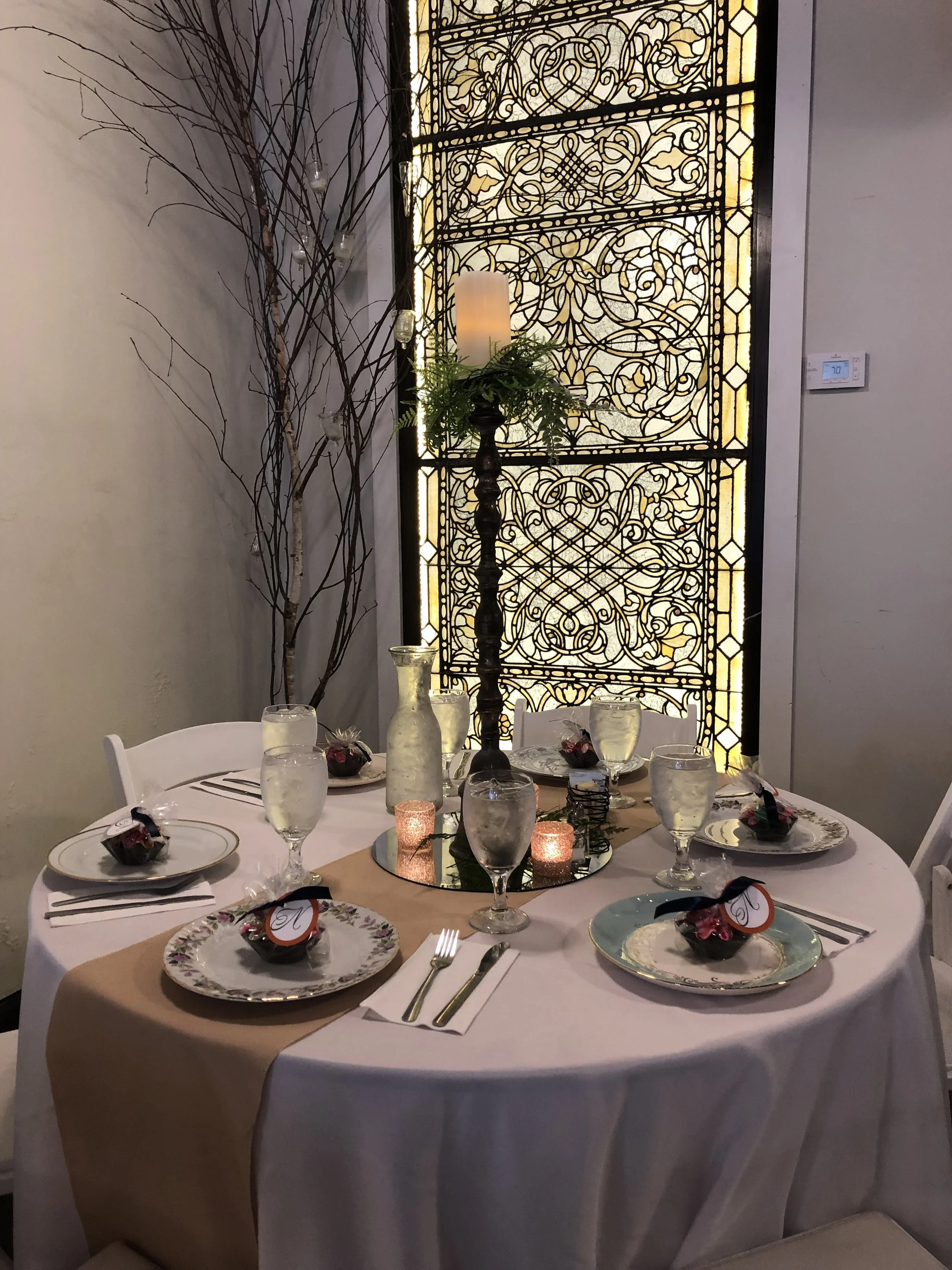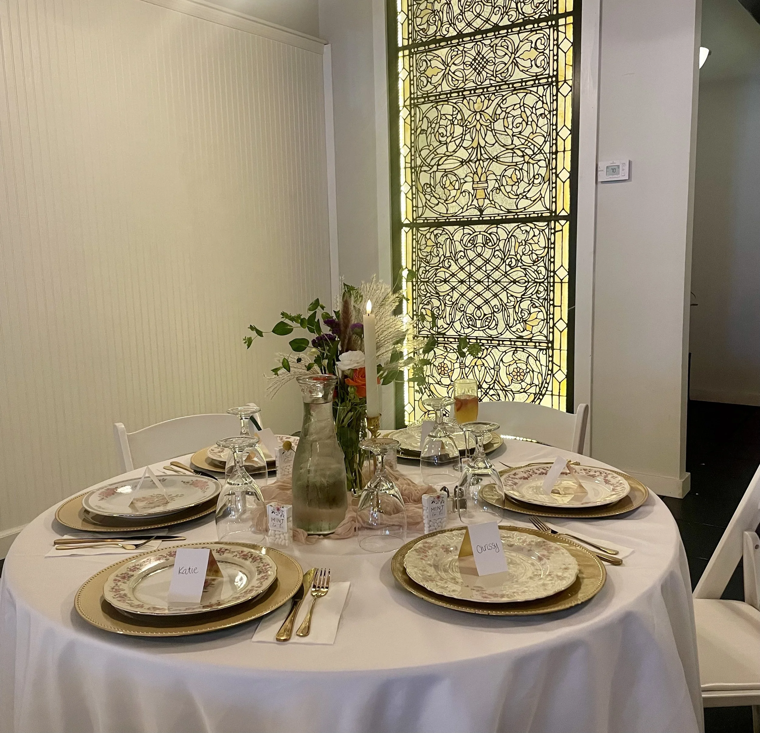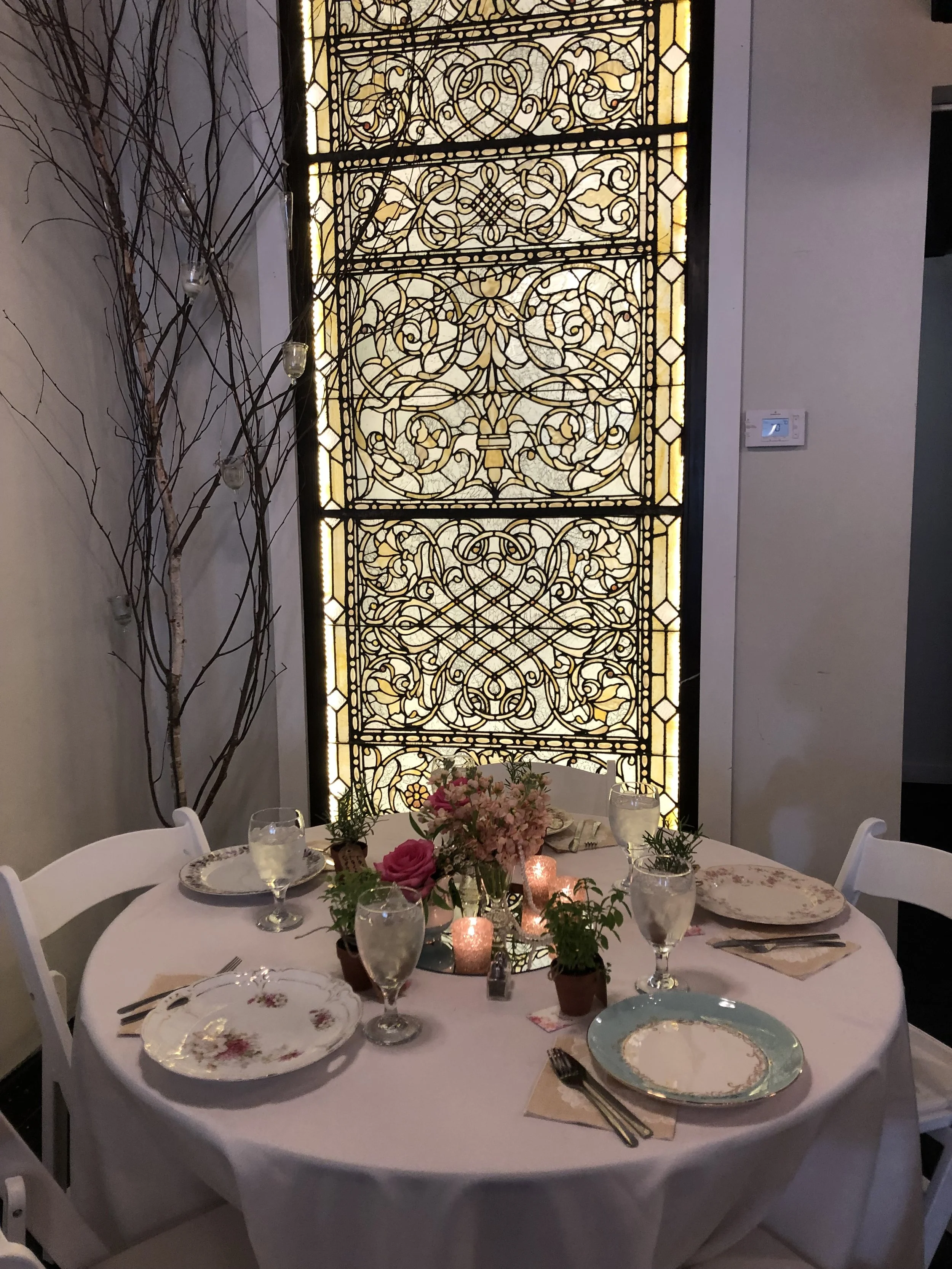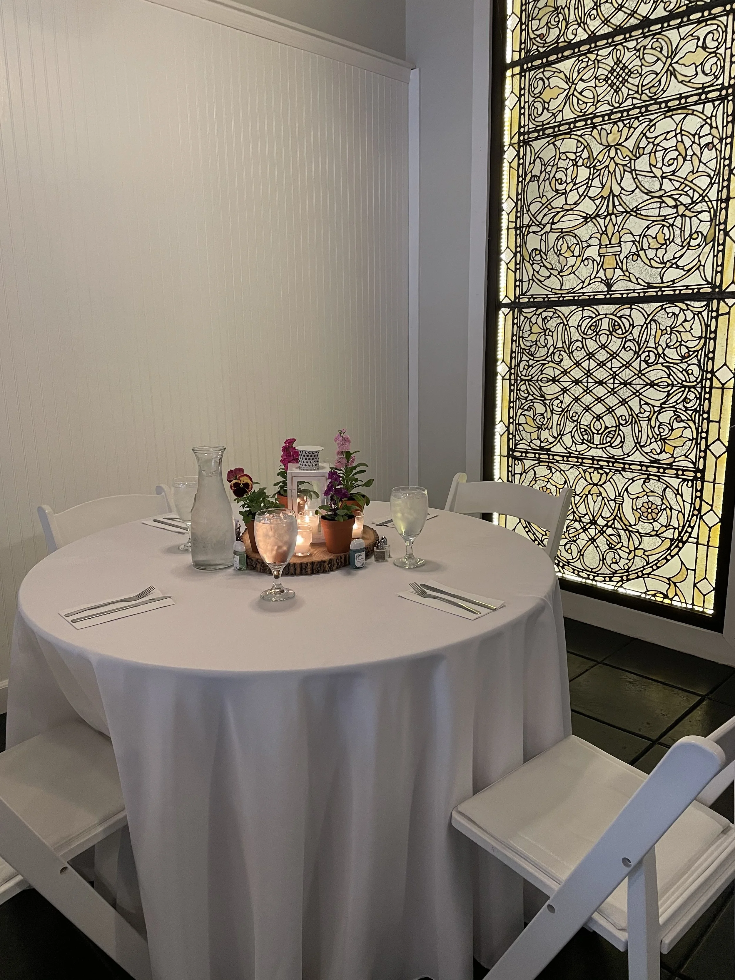 A round table with a white tablecloth, decorated with a centerpiece of flowers and candles, set with glasses, plates, and utensils, next to a large ornate stained glass window.