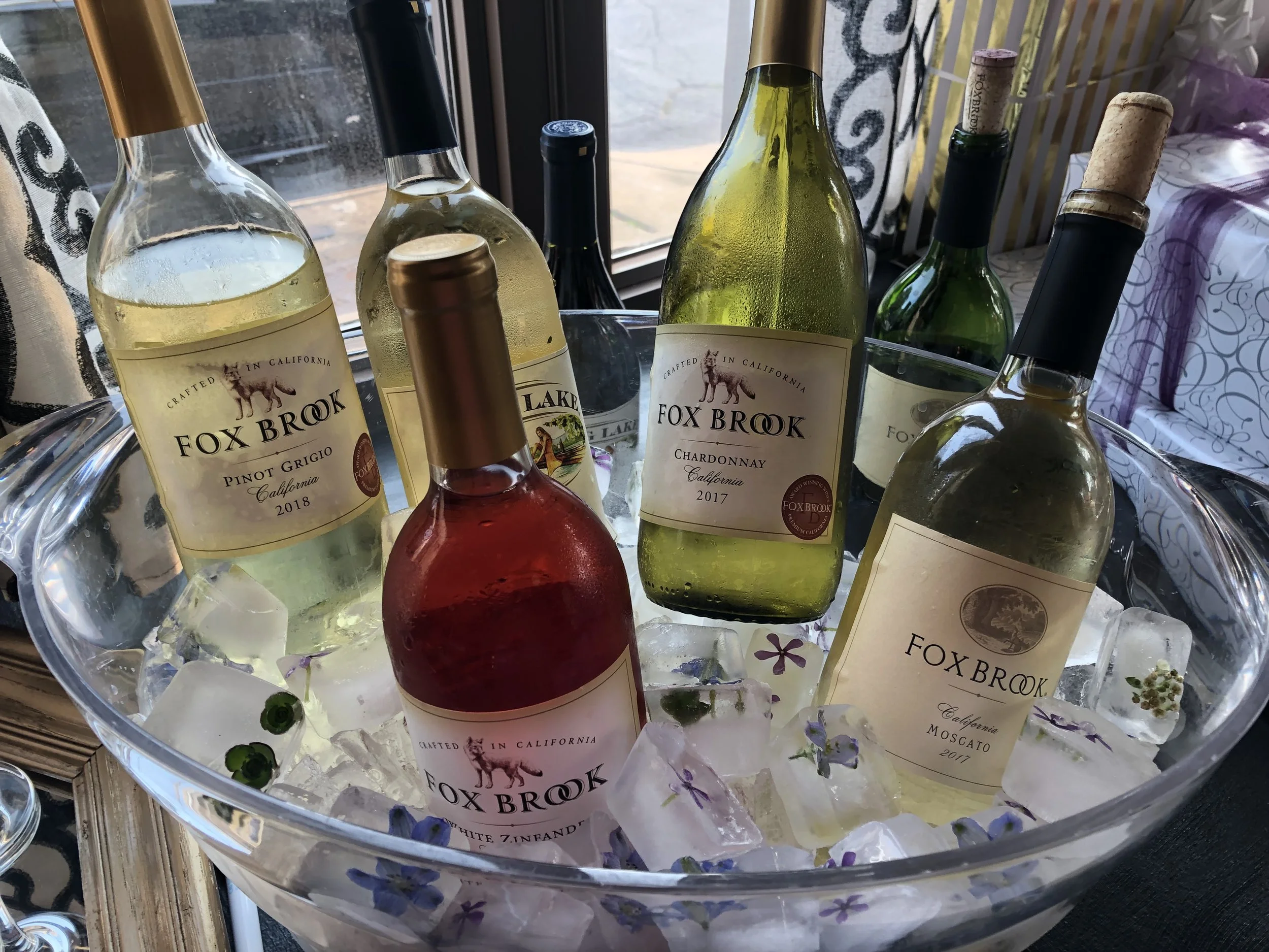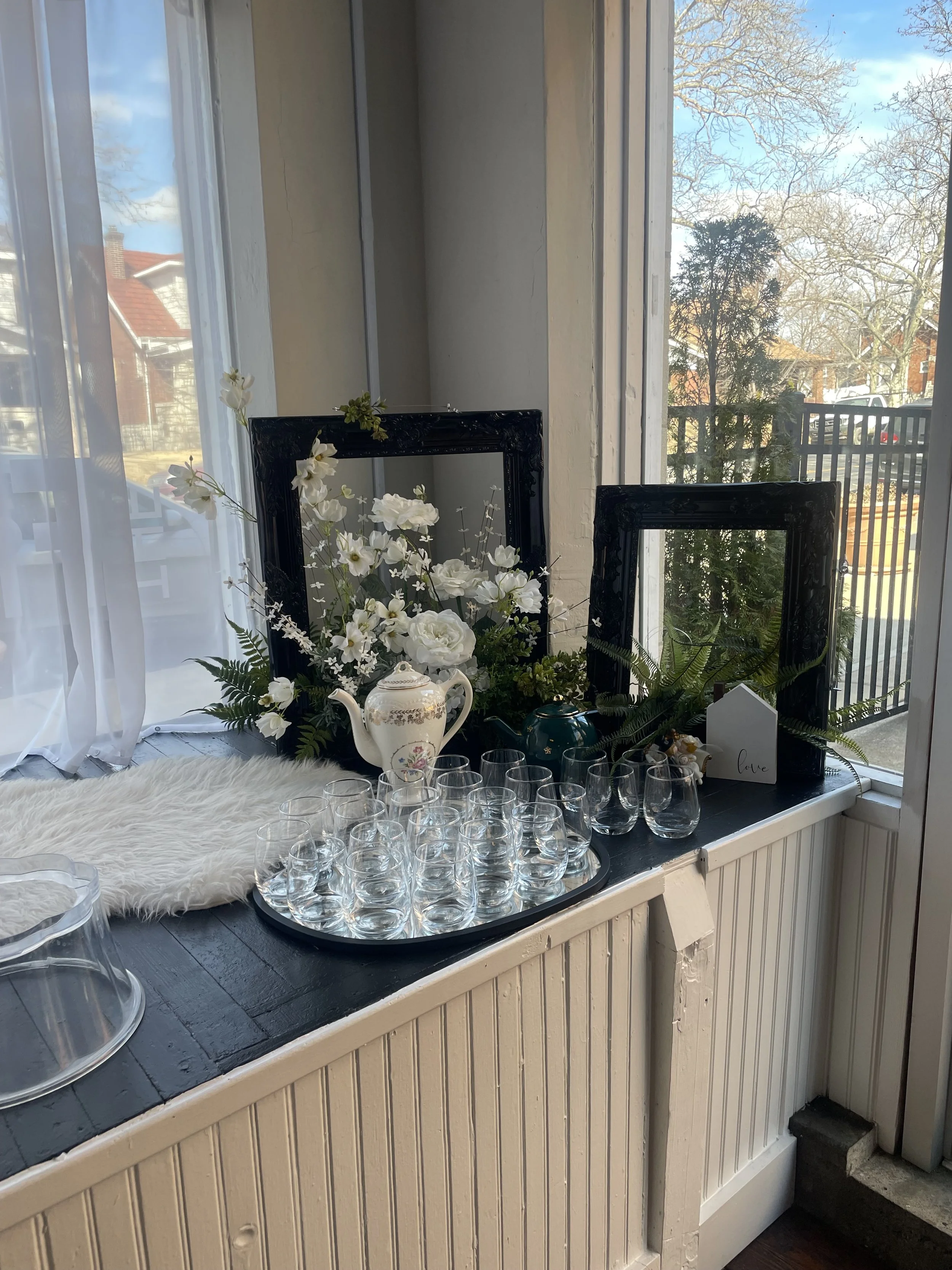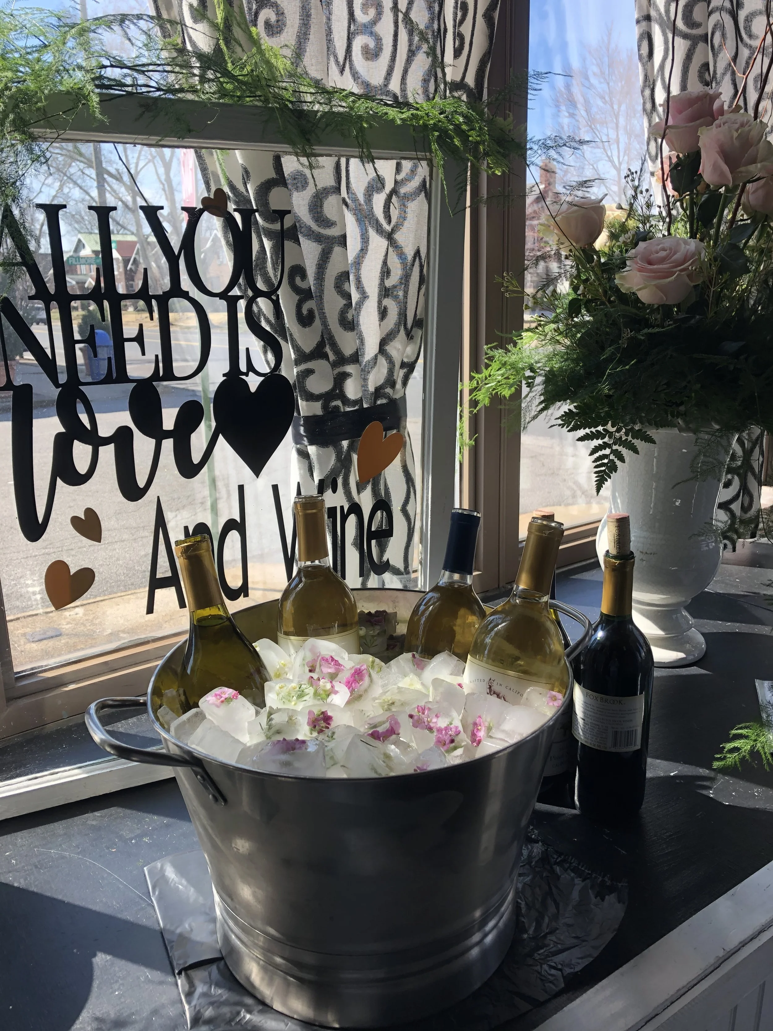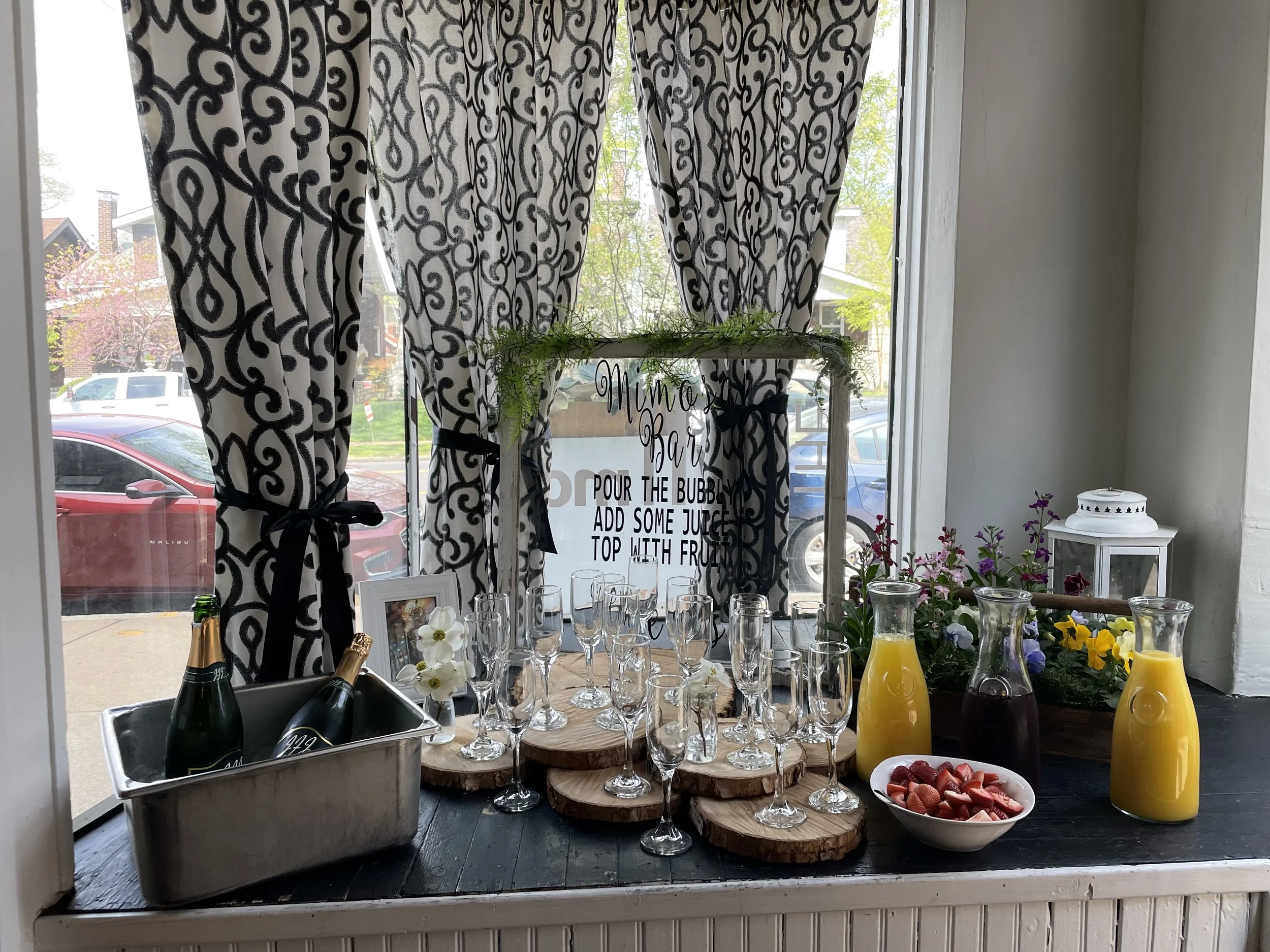 A window display with champagne bottles in an ice bucket, sliced strawberries in a bowl, four pitchers of orange and purple drinks, and several empty champagne glasses on wooden bases. Behind the display, there is a sign with drink instructions, blac